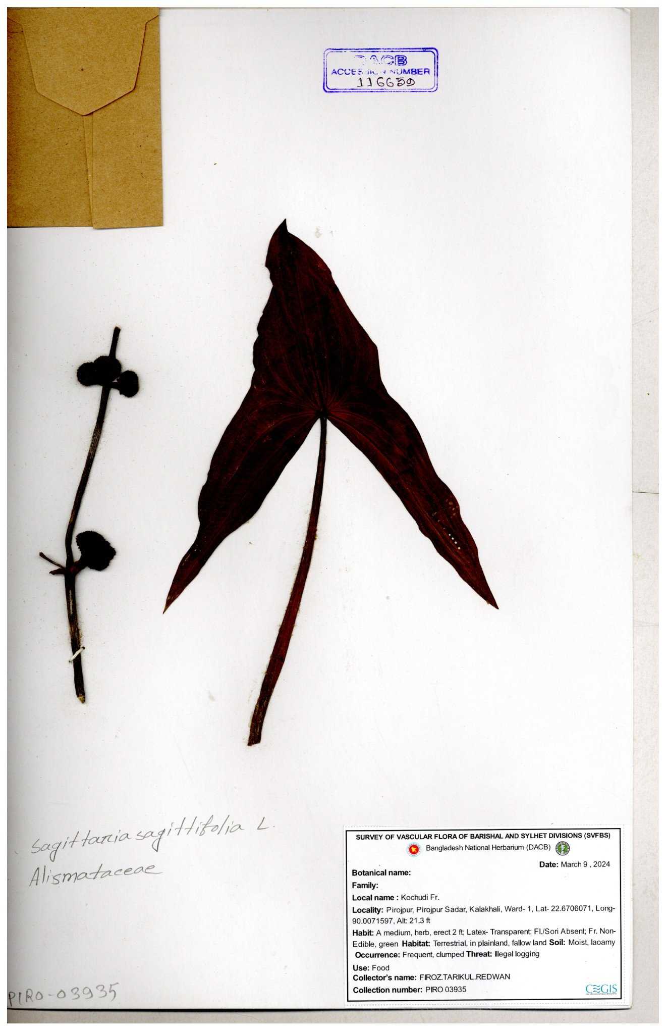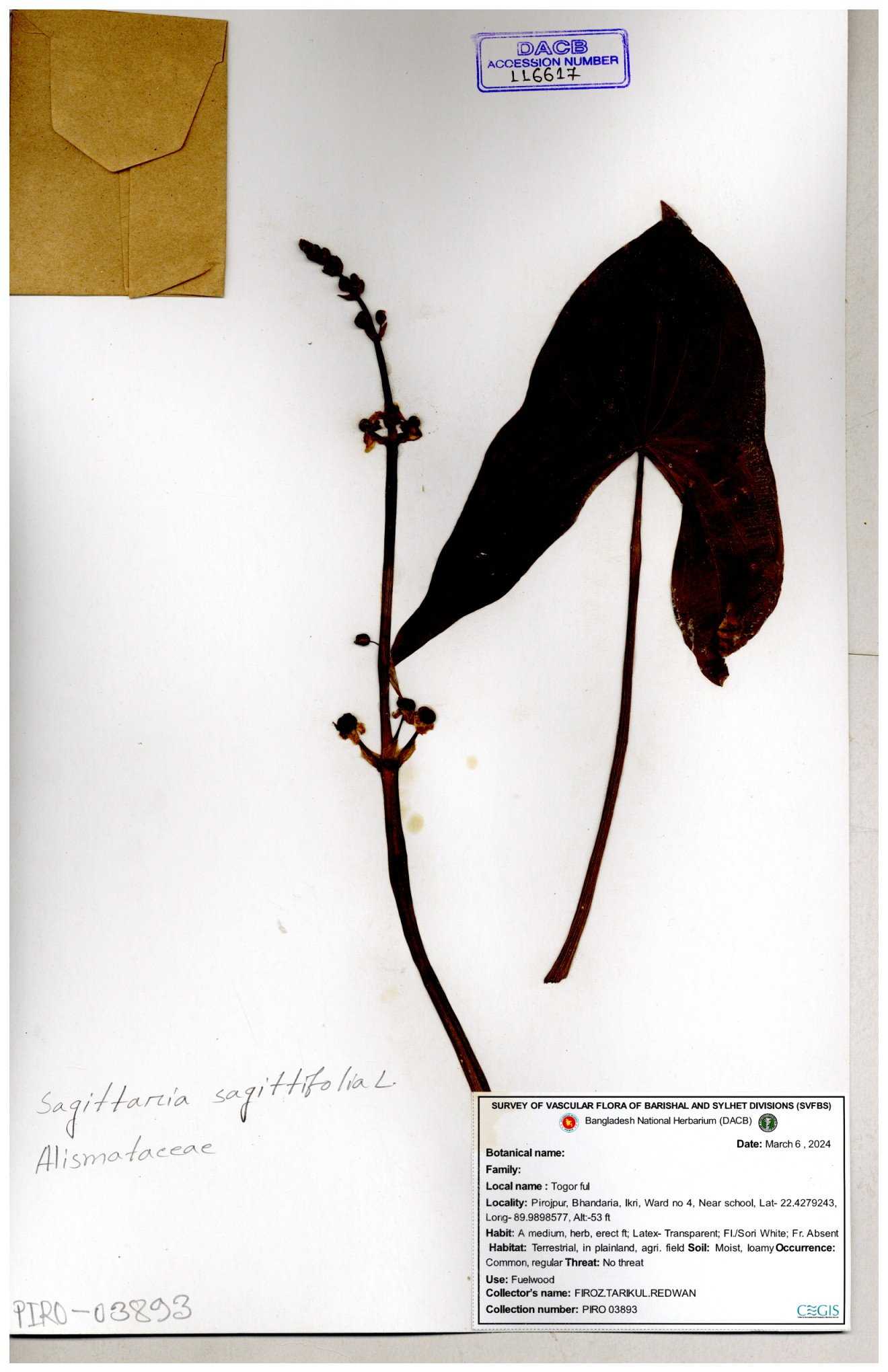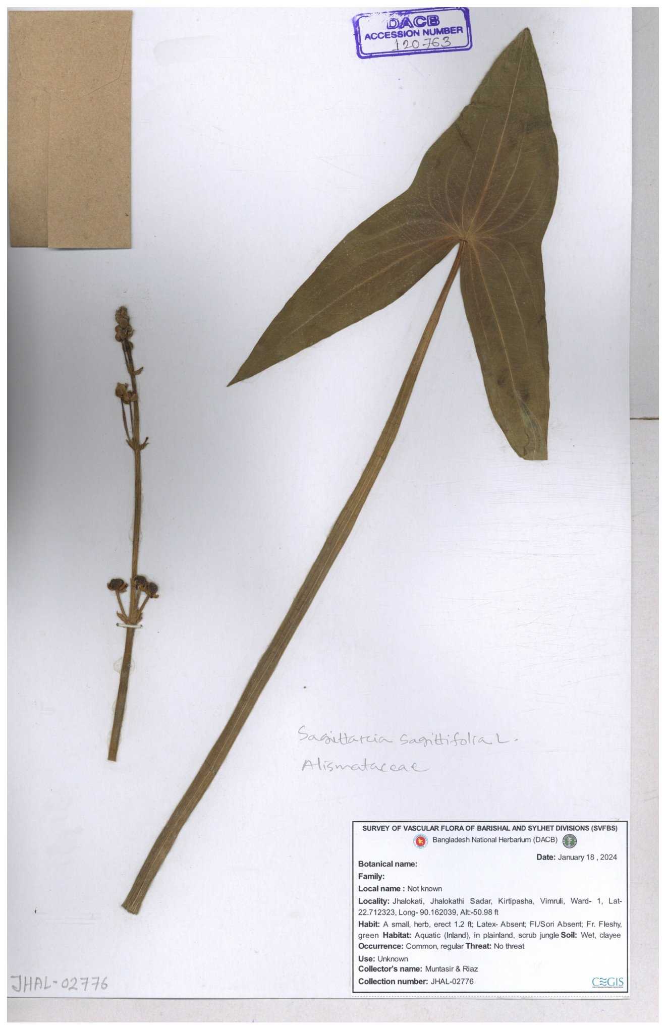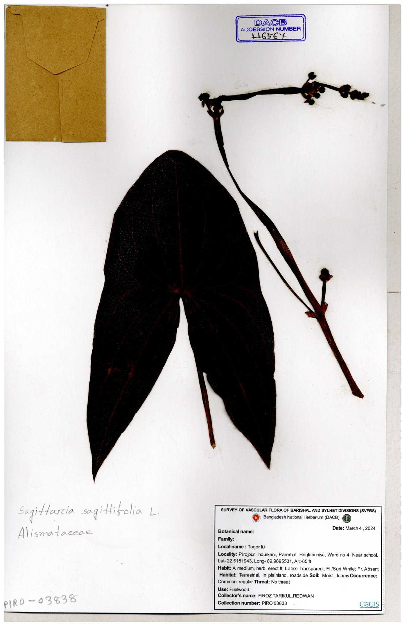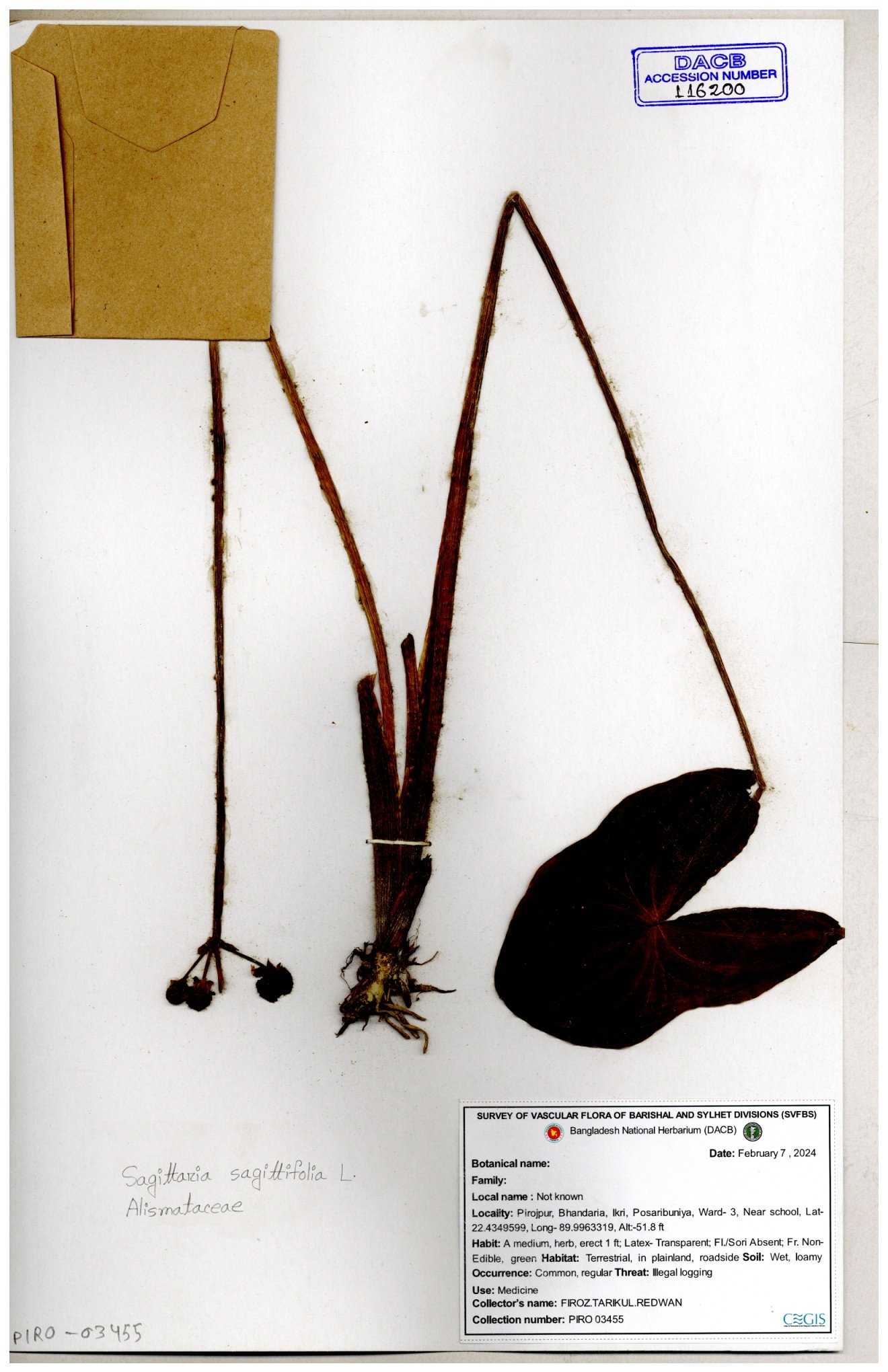 | 116851 | Alismataceae | Sagittaria sagittitolia | 30-11--0001 |