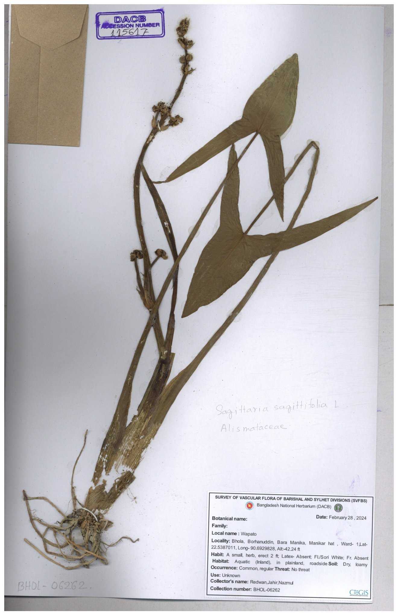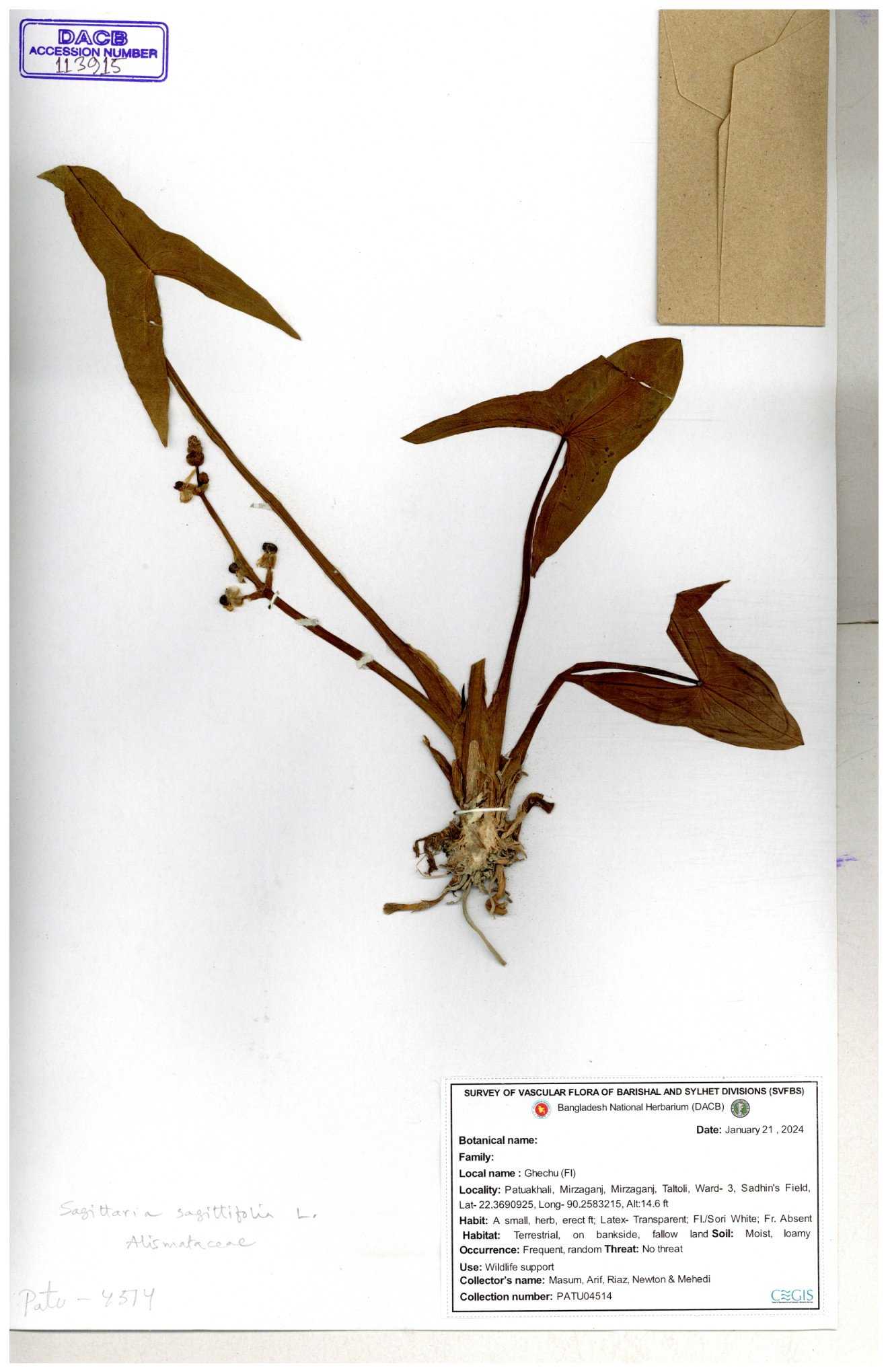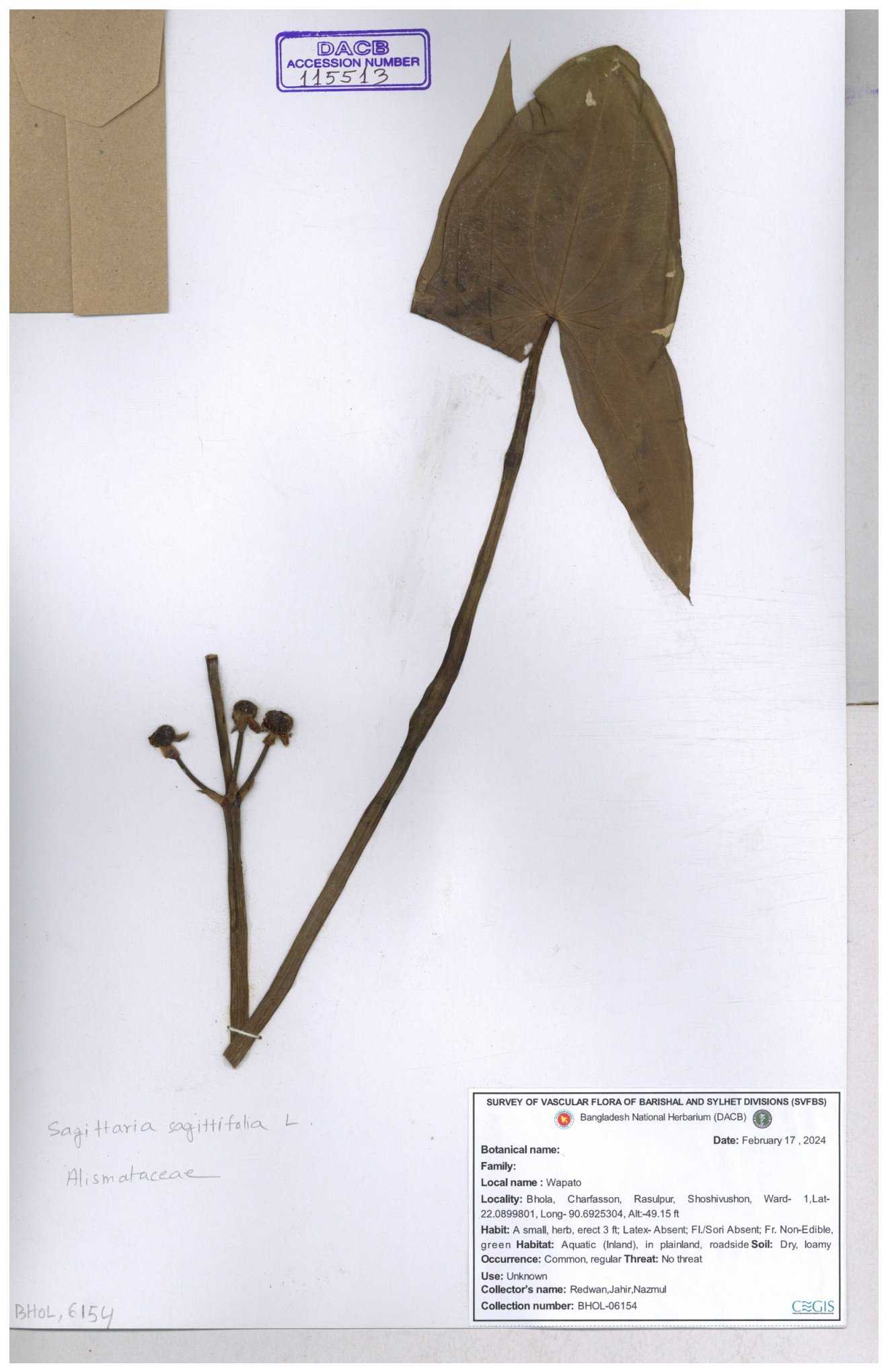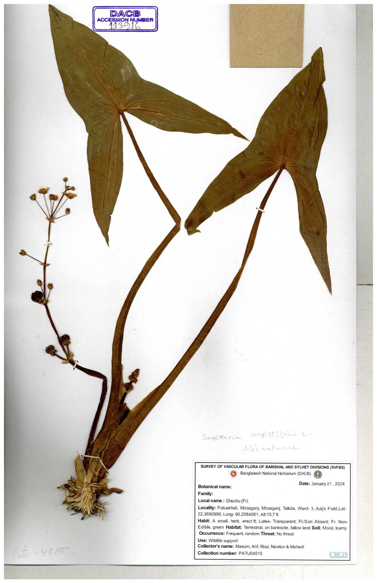 | 113915 | Alismataceae | Sagittaria sagittitolia | 30-11--0001 |