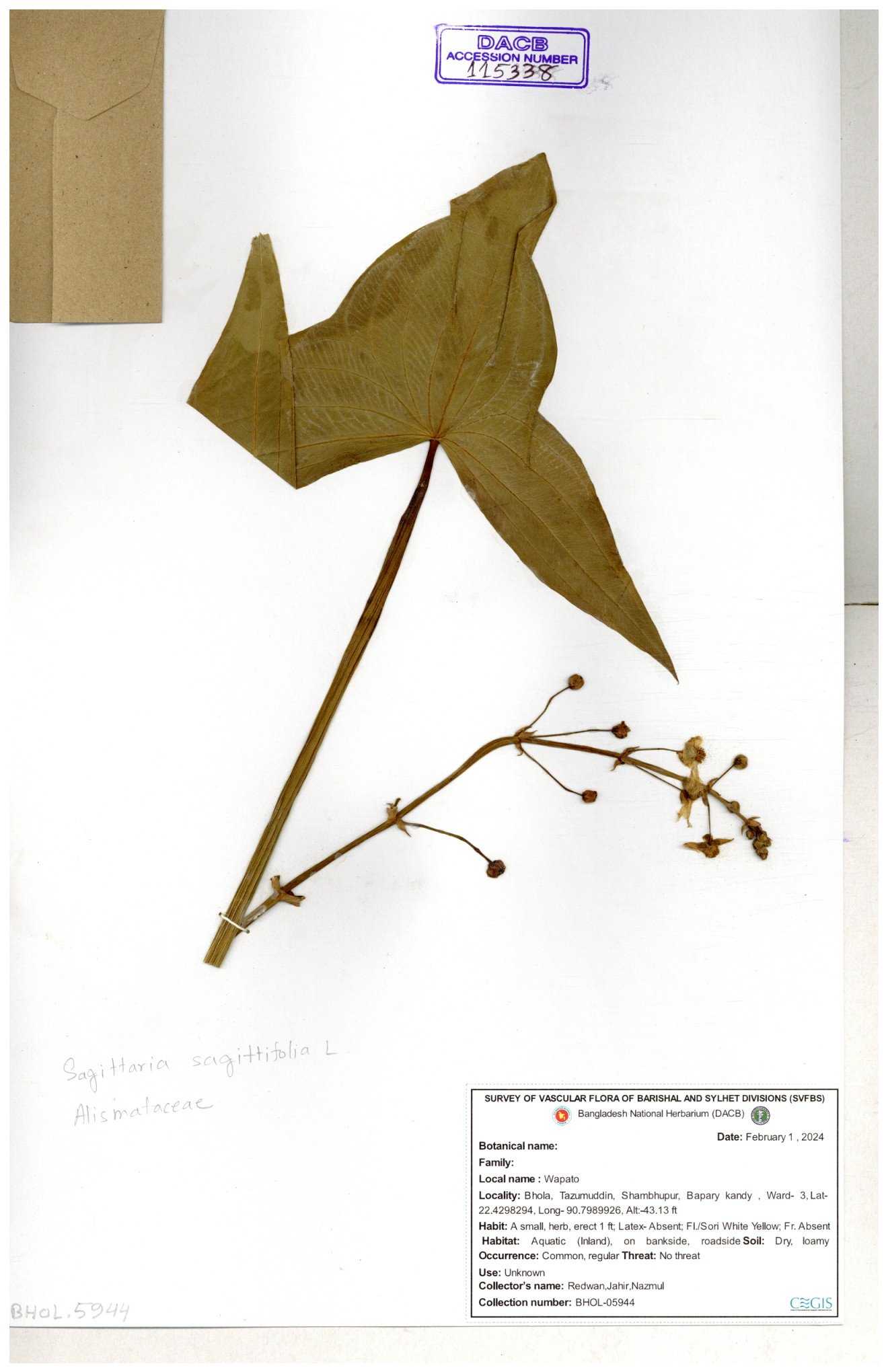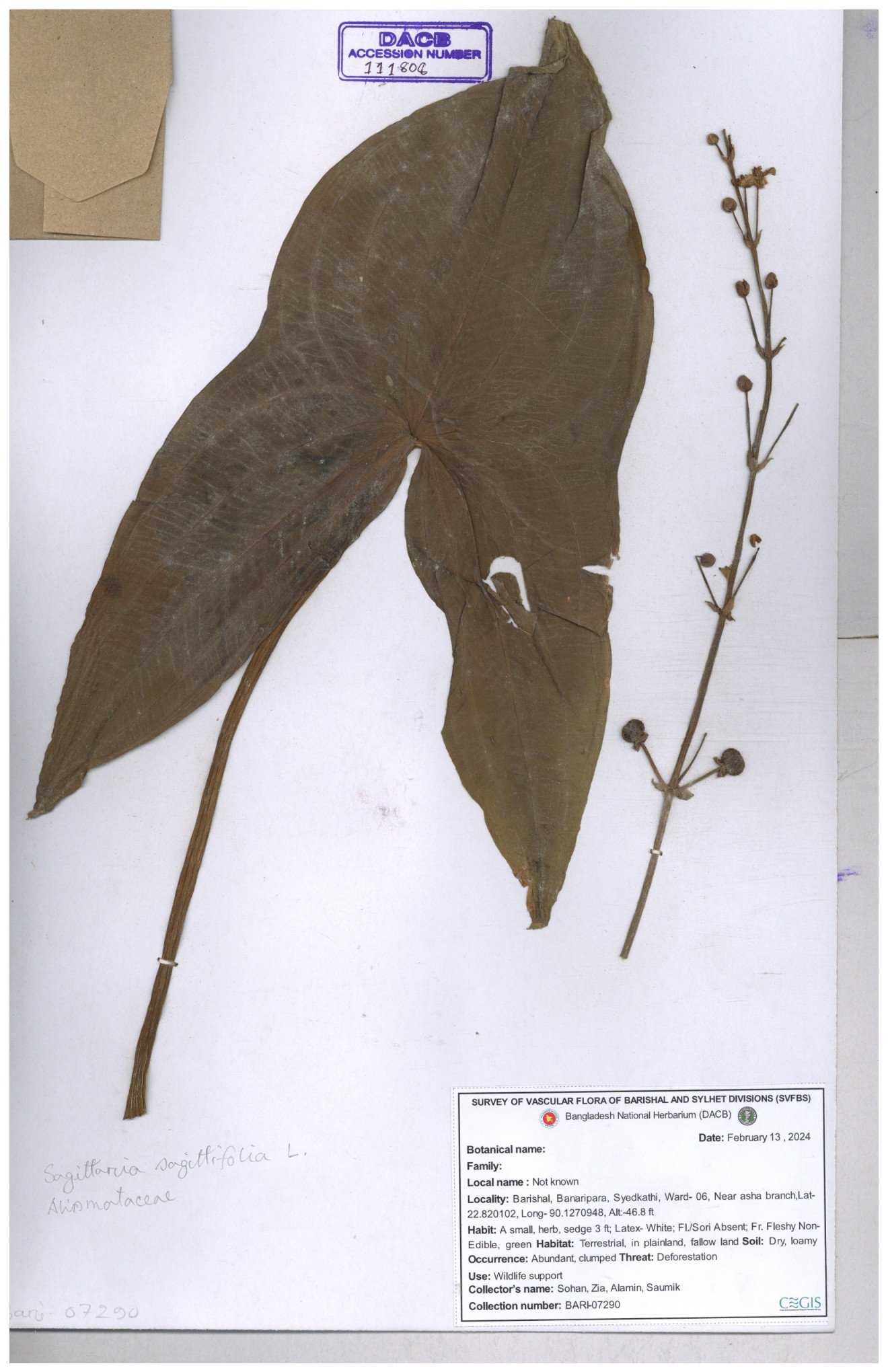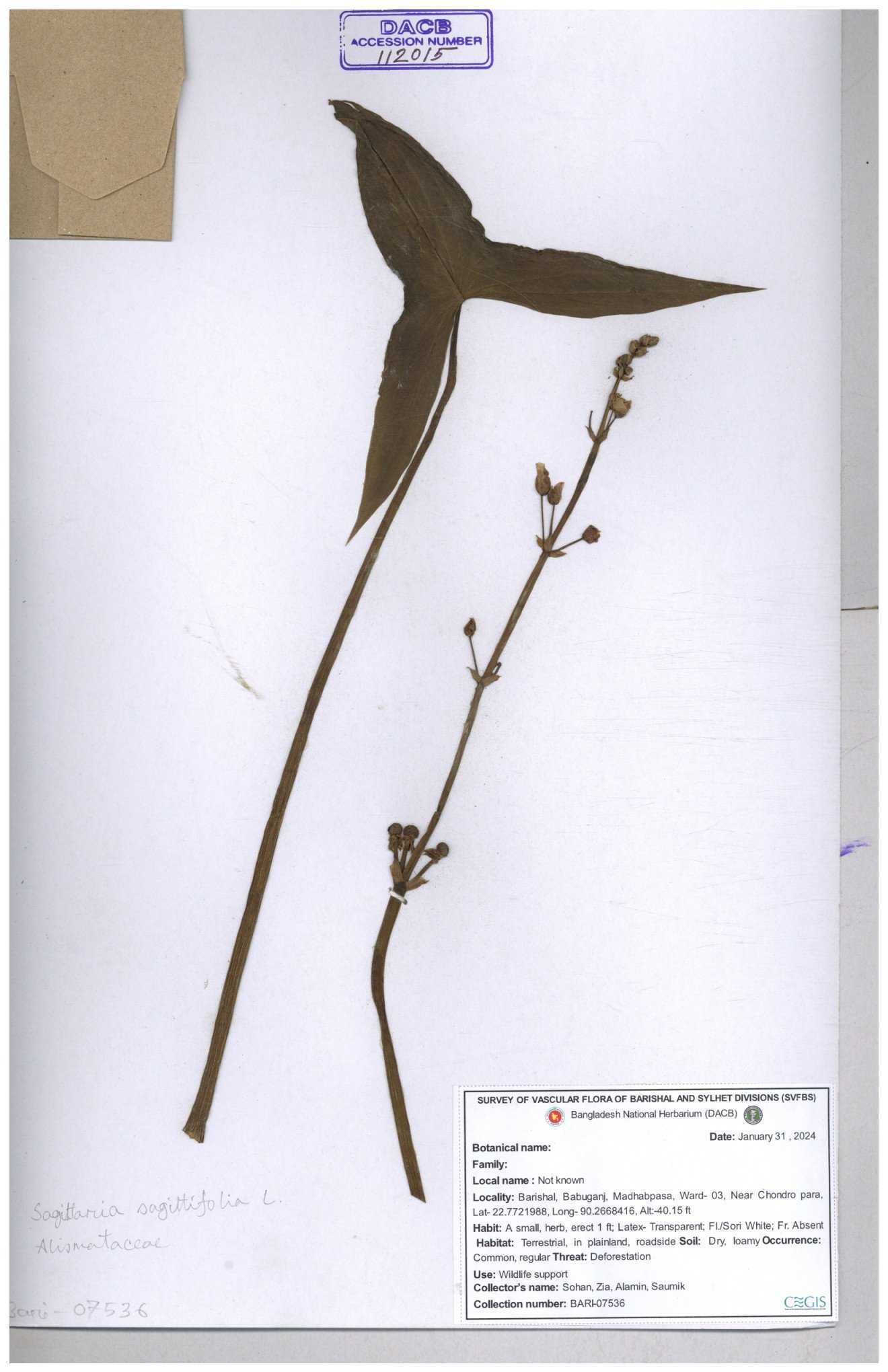 | 113915 | Alismataceae | Sagittaria sagittitolia | 30-11--0001 |