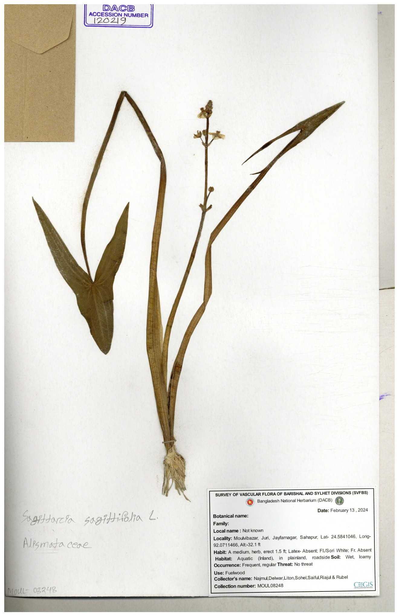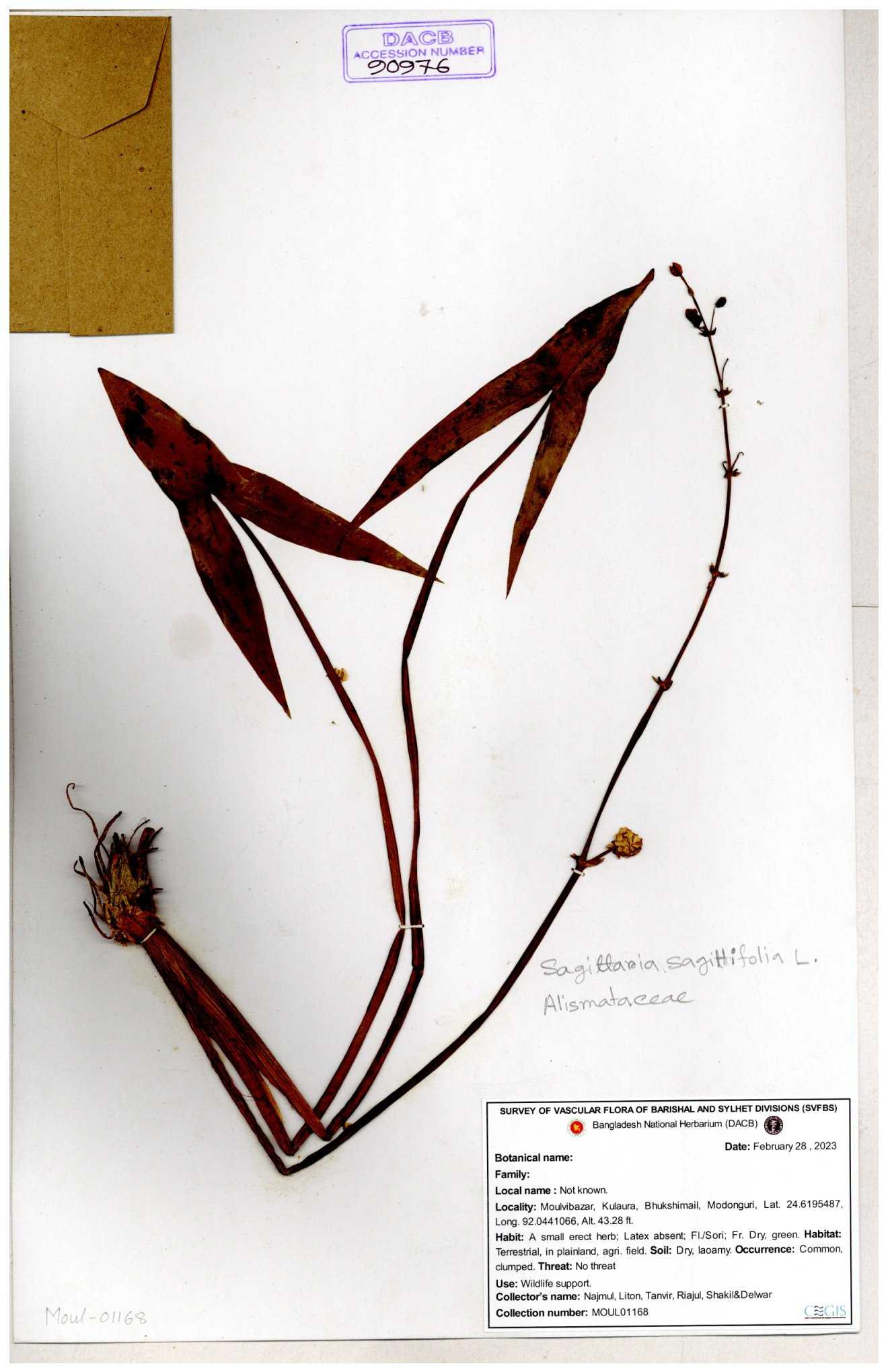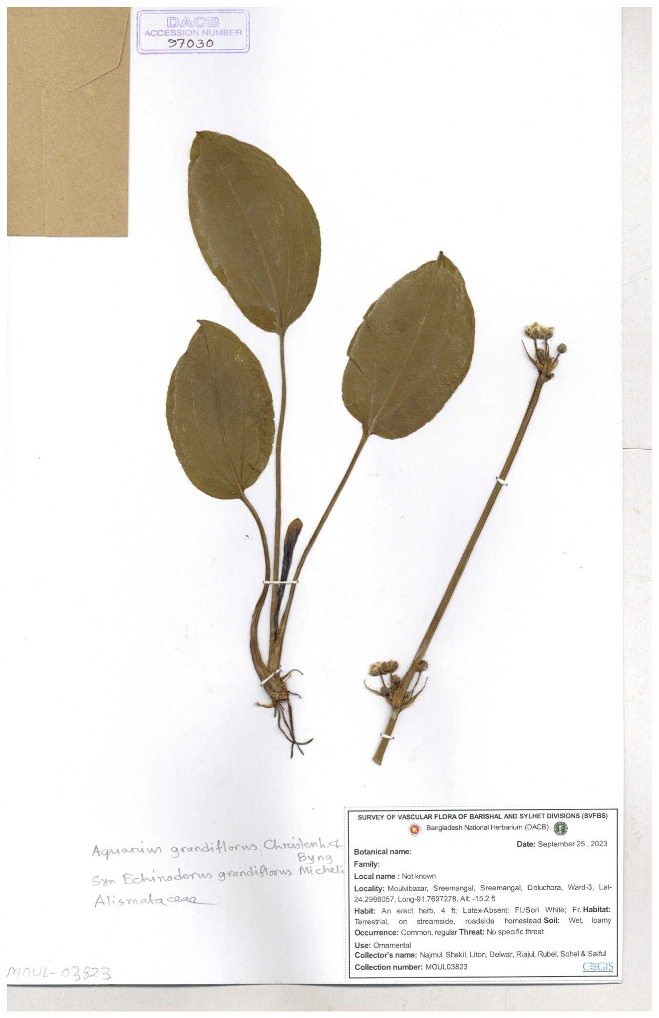 | 93032 | Alismataceae | Sagittaria guayanensis Kunth | Nazul, Liton, Delwar, Riajul, Shakil, Mahdi & Rubel | MOUL02377 07-04-2023 |