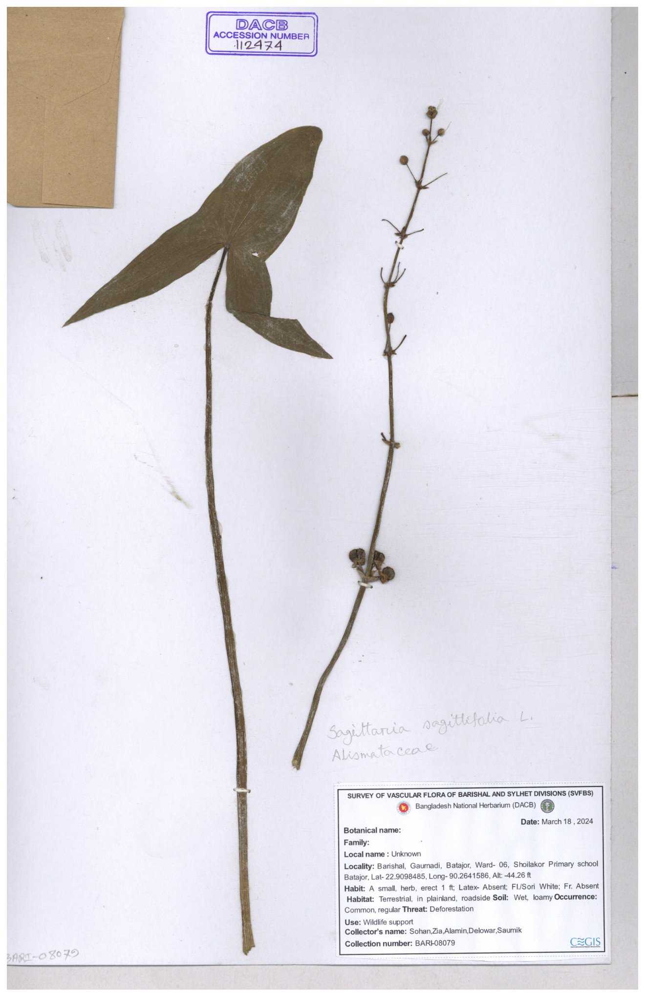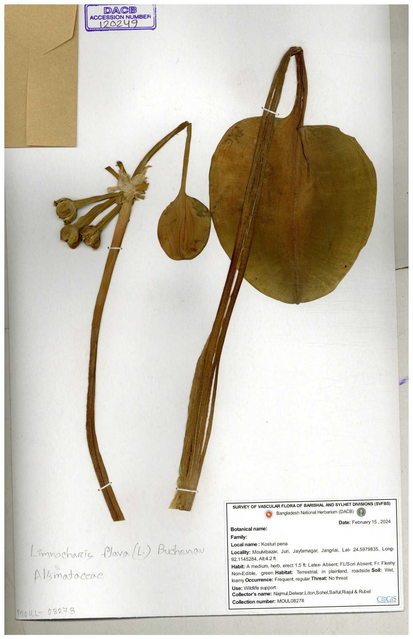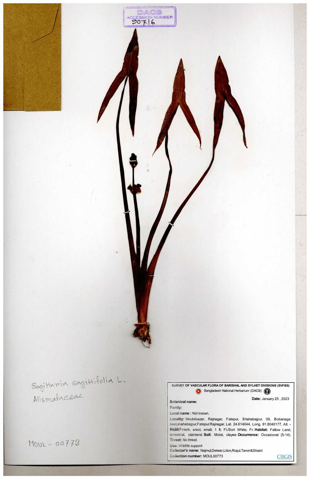 | 93032 | Alismataceae | Sagittaria guayanensis Kunth | Nazul, Liton, Delwar, Riajul, Shakil, Mahdi & Rubel | MOUL02377 07-04-2023 |