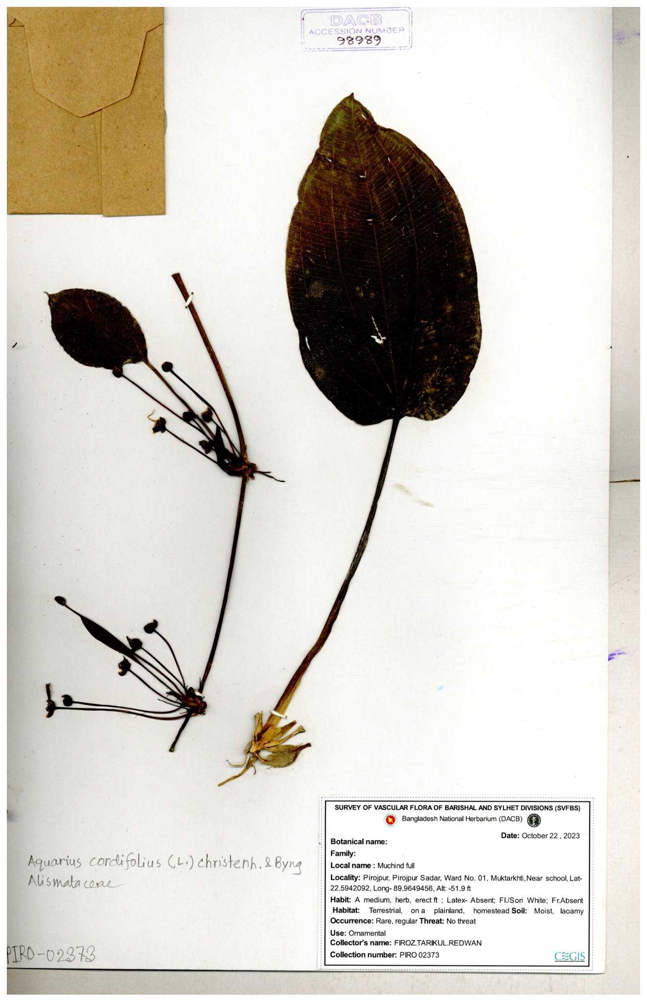 | 98989 | Alismataceae | Aquarius cordifolius | 30-11--0001 |