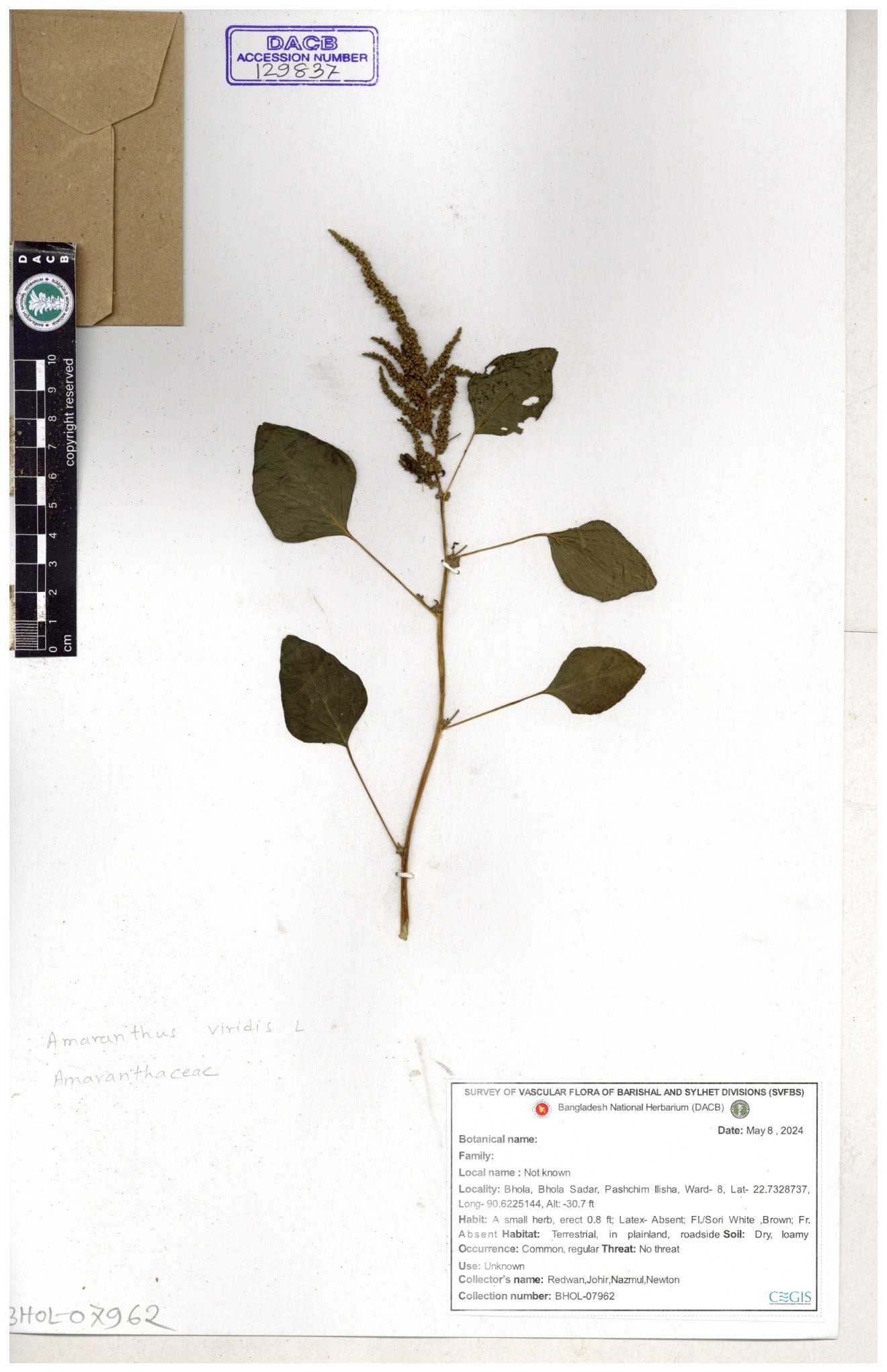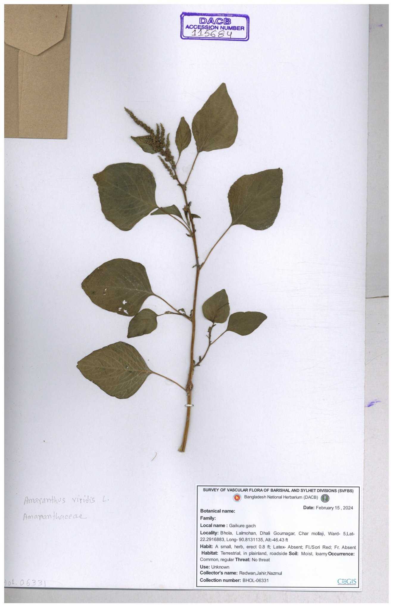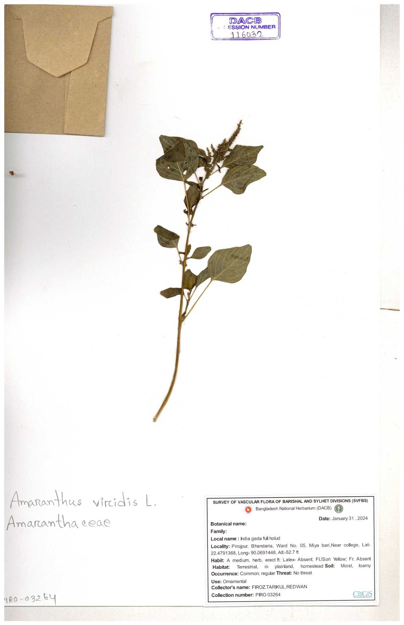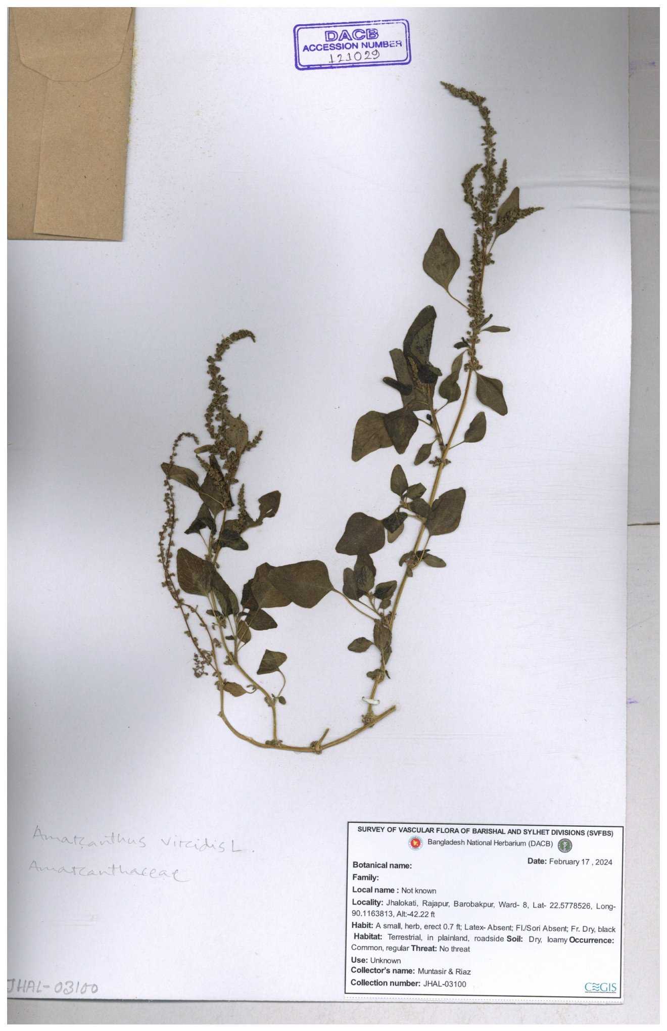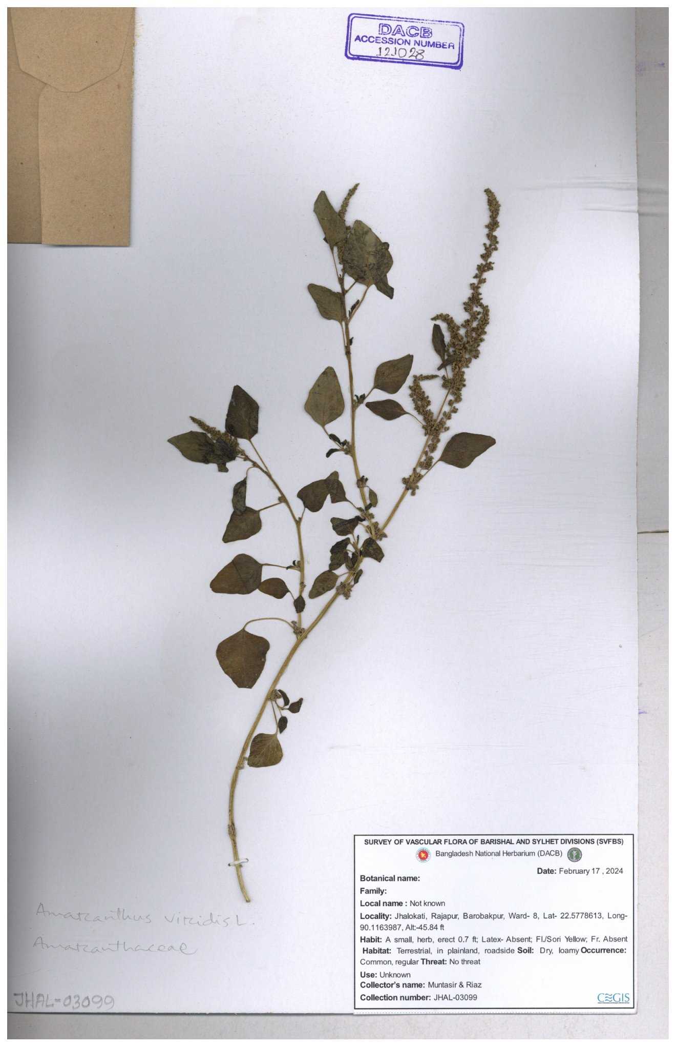 | 64345 | Amaranthaceae | Amaranthus viridis L. | Mominur Rahman, Al amin & Kamrul Islam | JCR-1489 30-11--0001 |