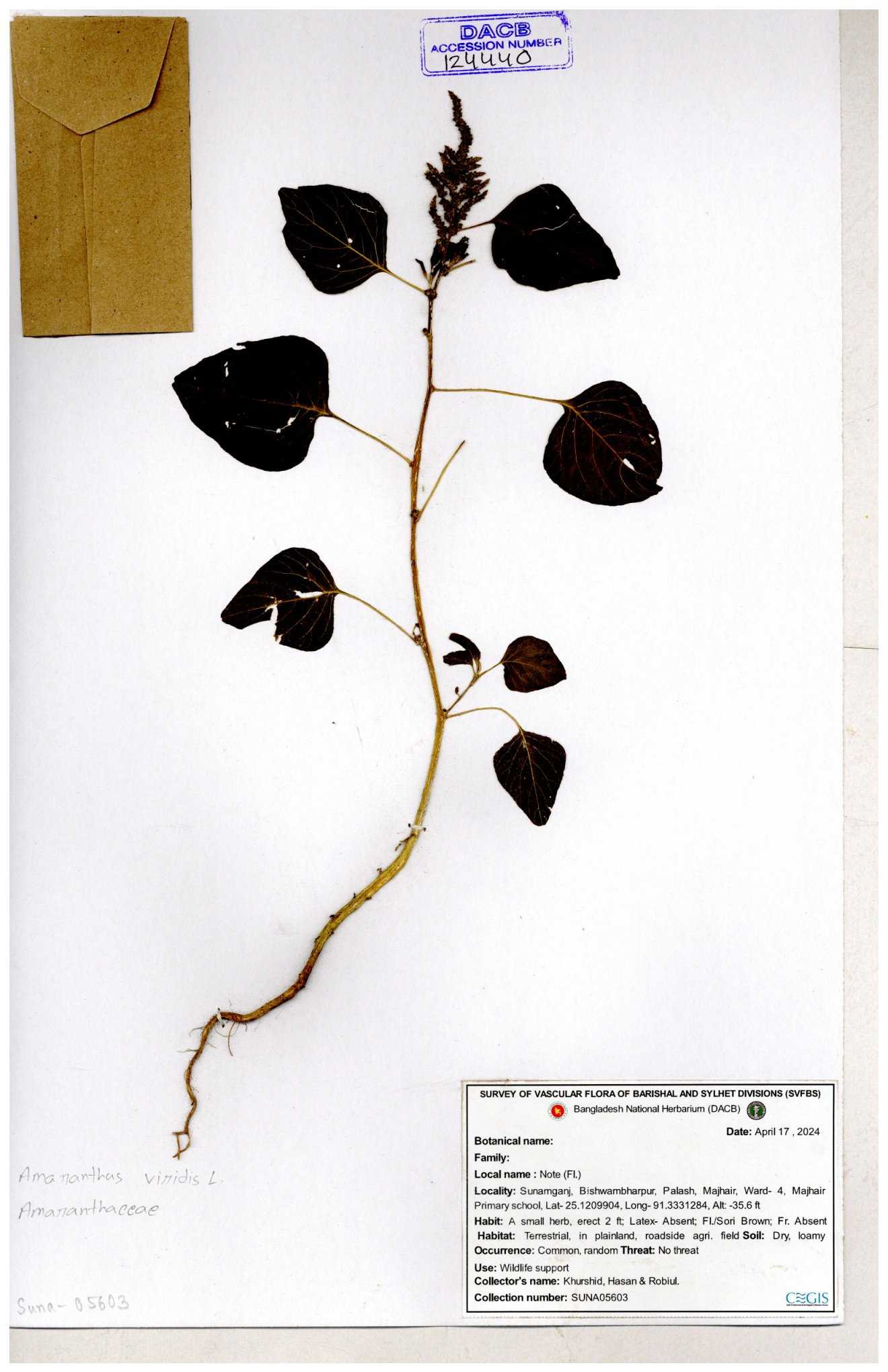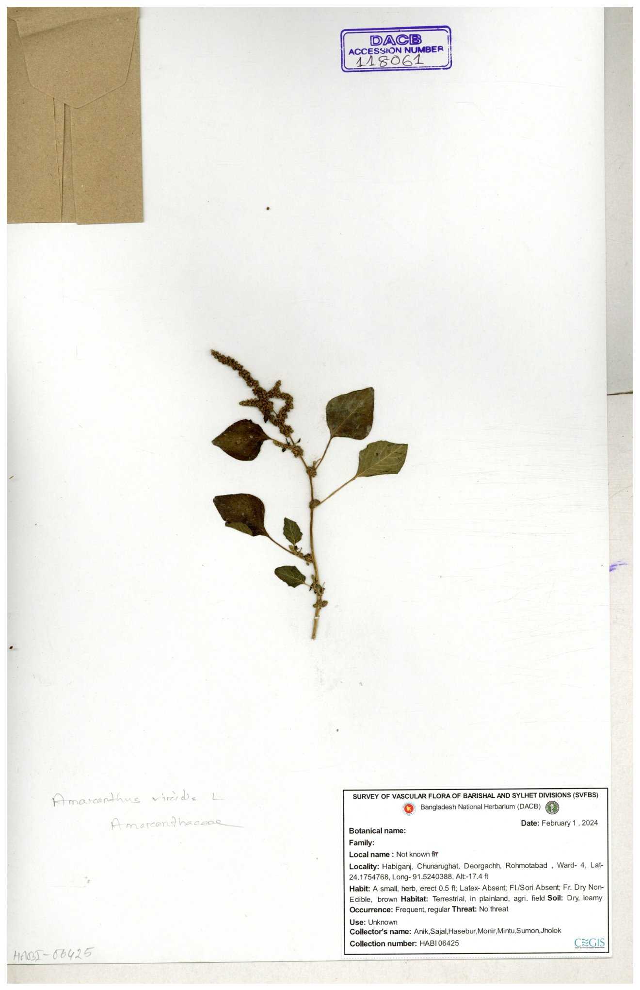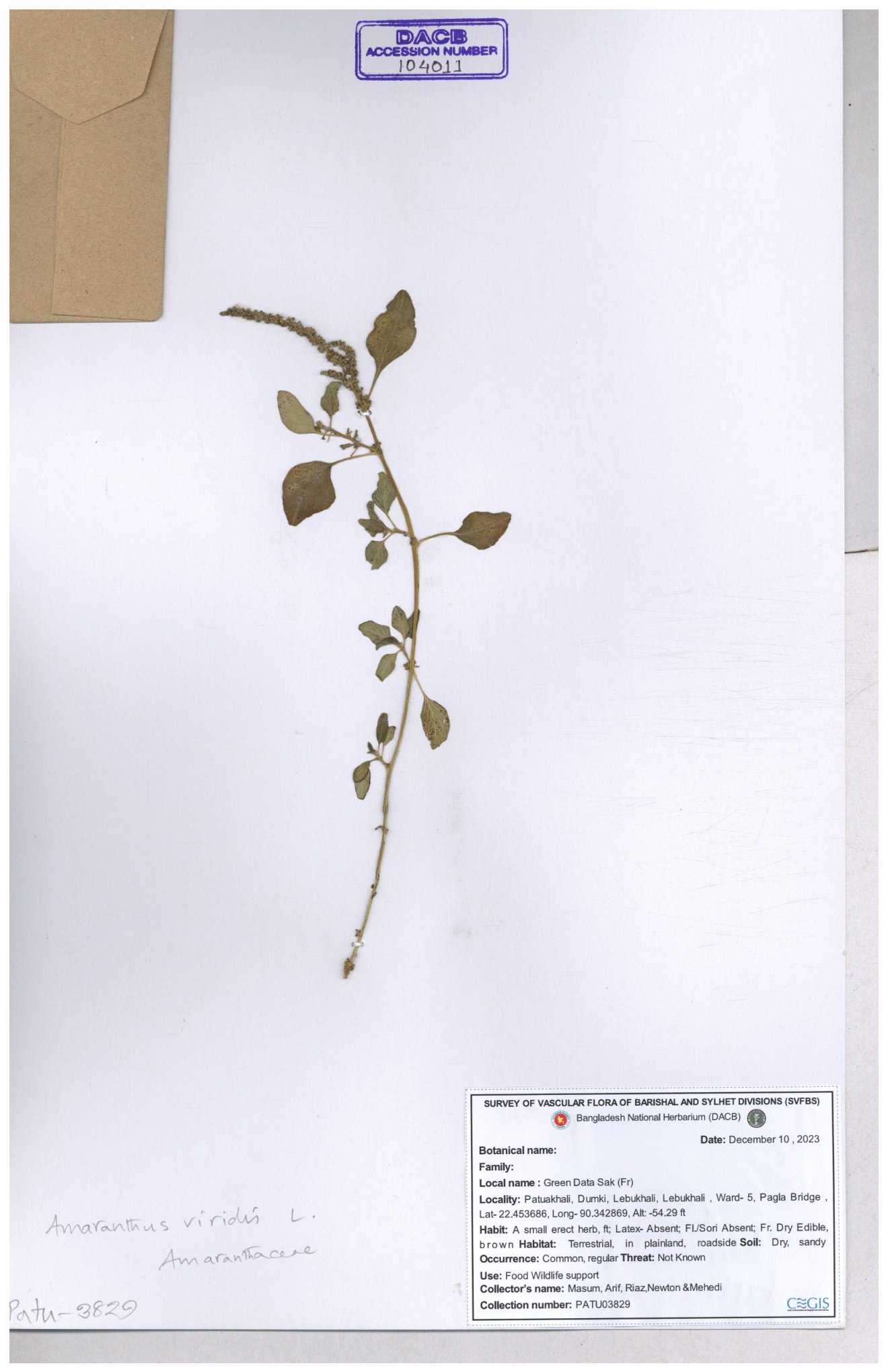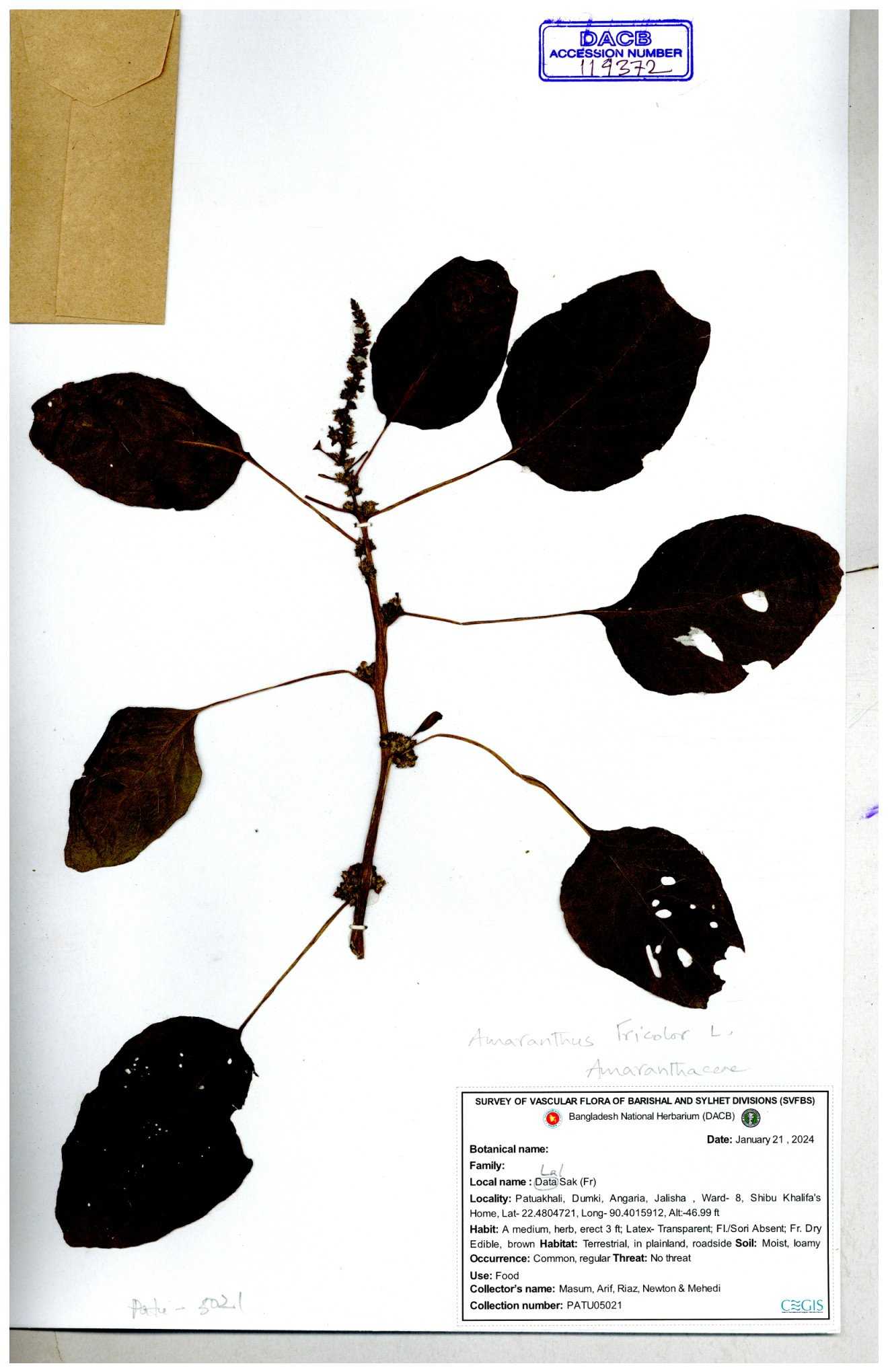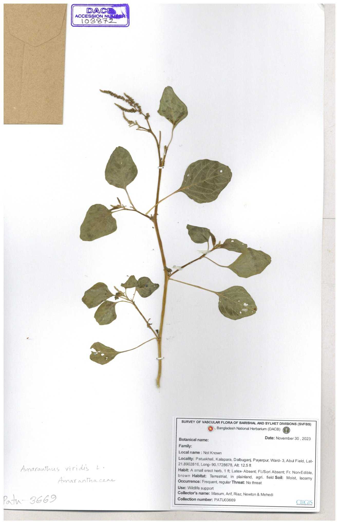 | 64345 | Amaranthaceae | Amaranthus viridis L. | Mominur Rahman, Al amin & Kamrul Islam | JCR-1489 30-11--0001 |