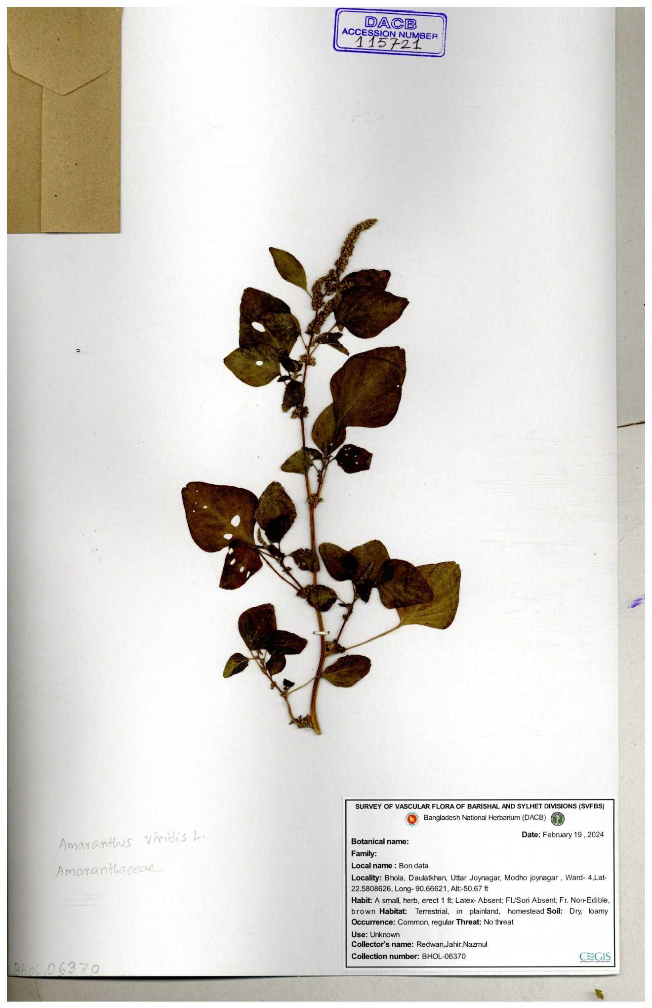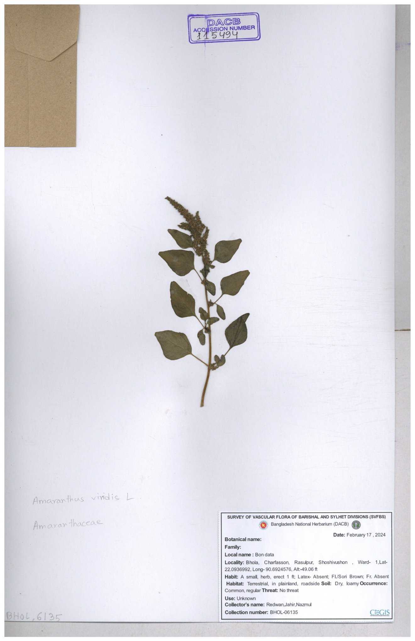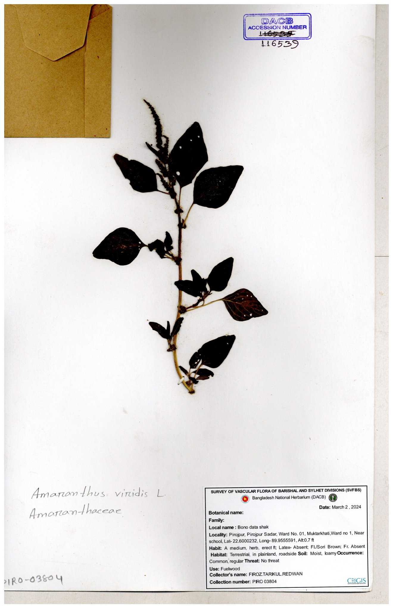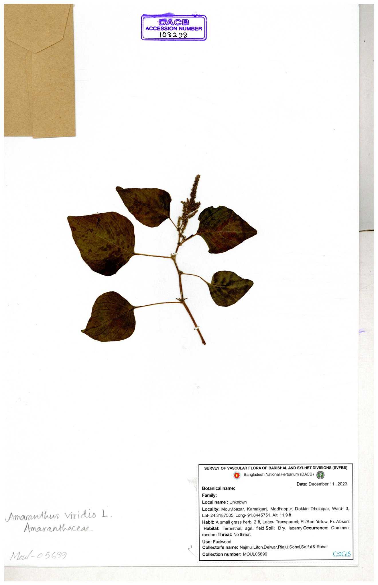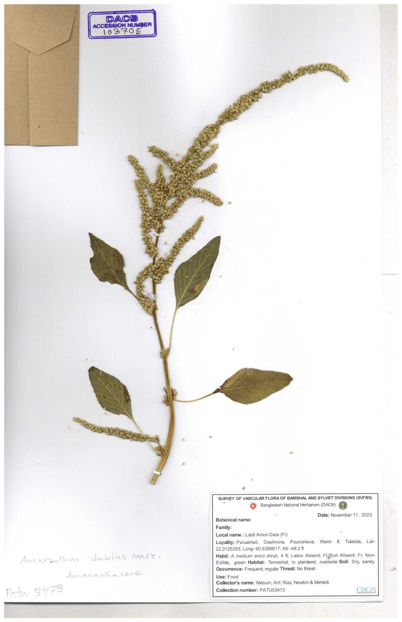 | 64345 | Amaranthaceae | Amaranthus viridis L. | Mominur Rahman, Al amin & Kamrul Islam | JCR-1489 30-11--0001 |