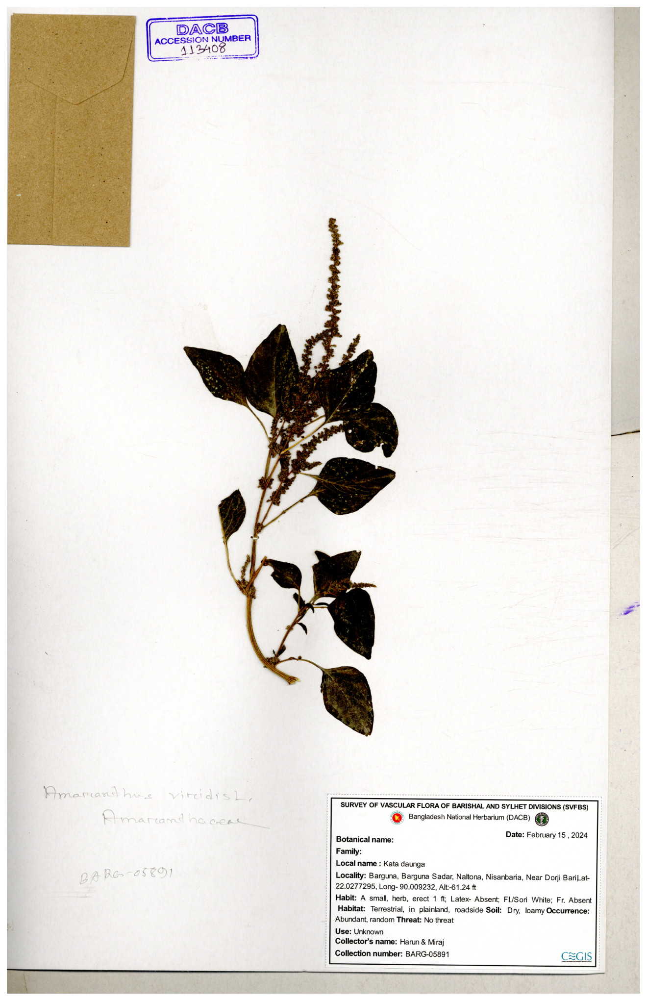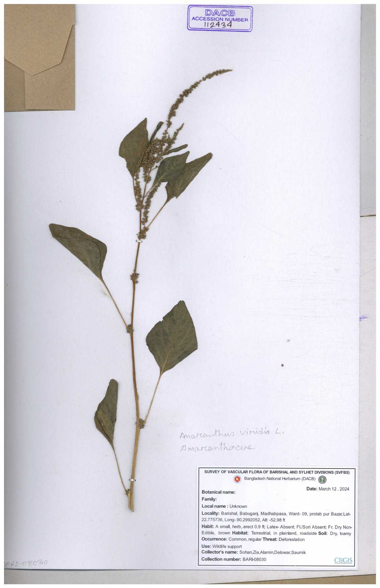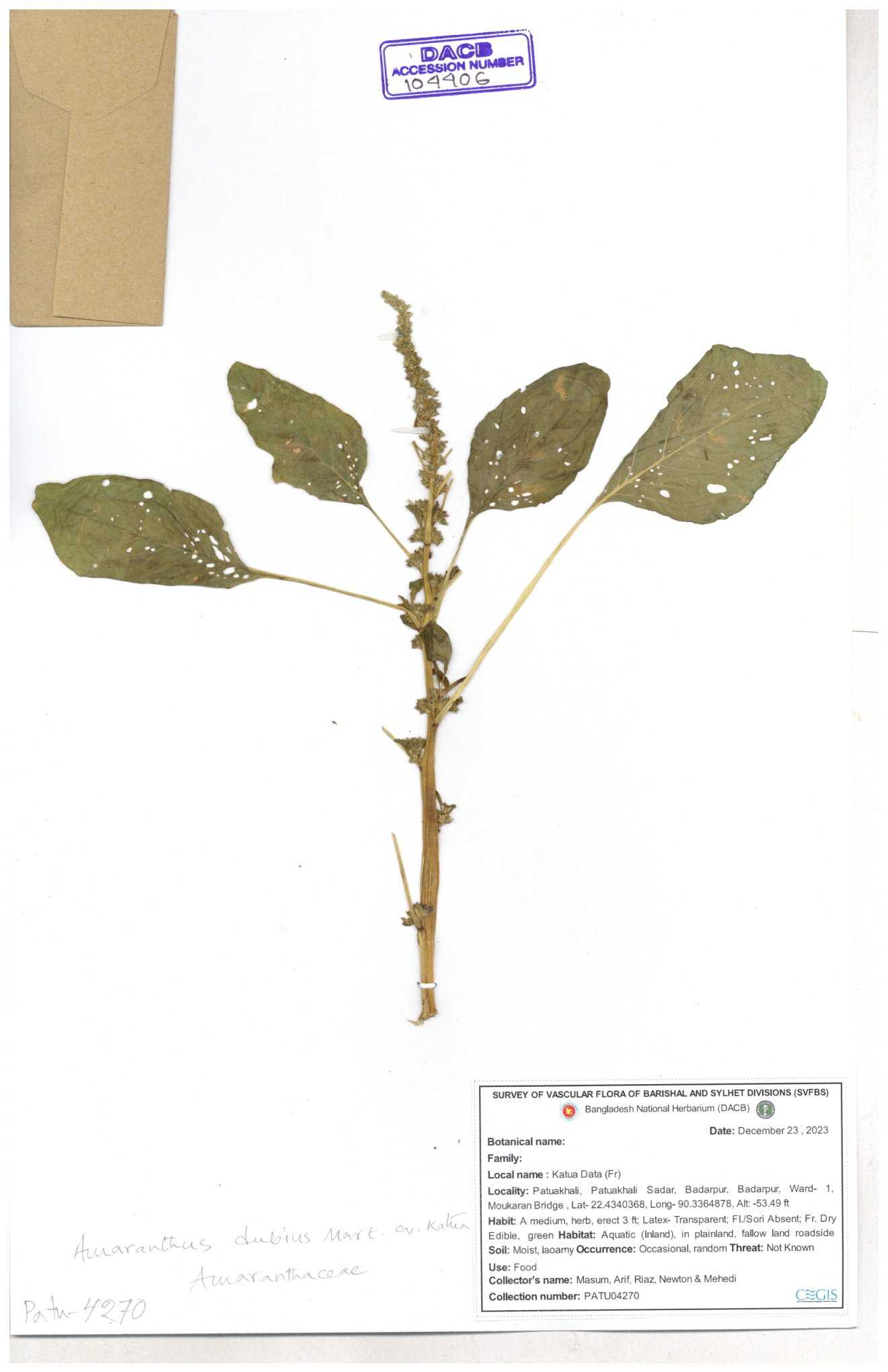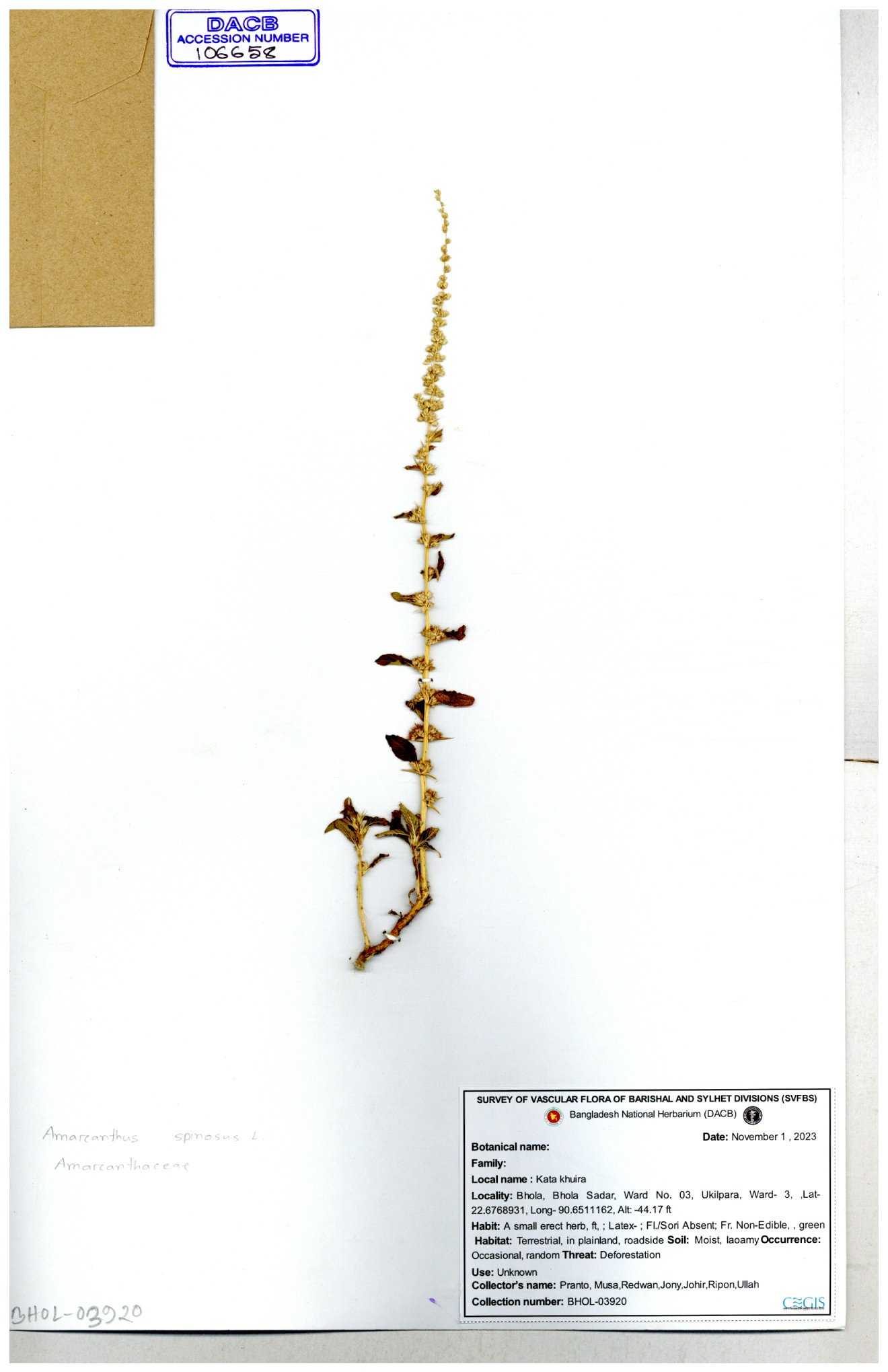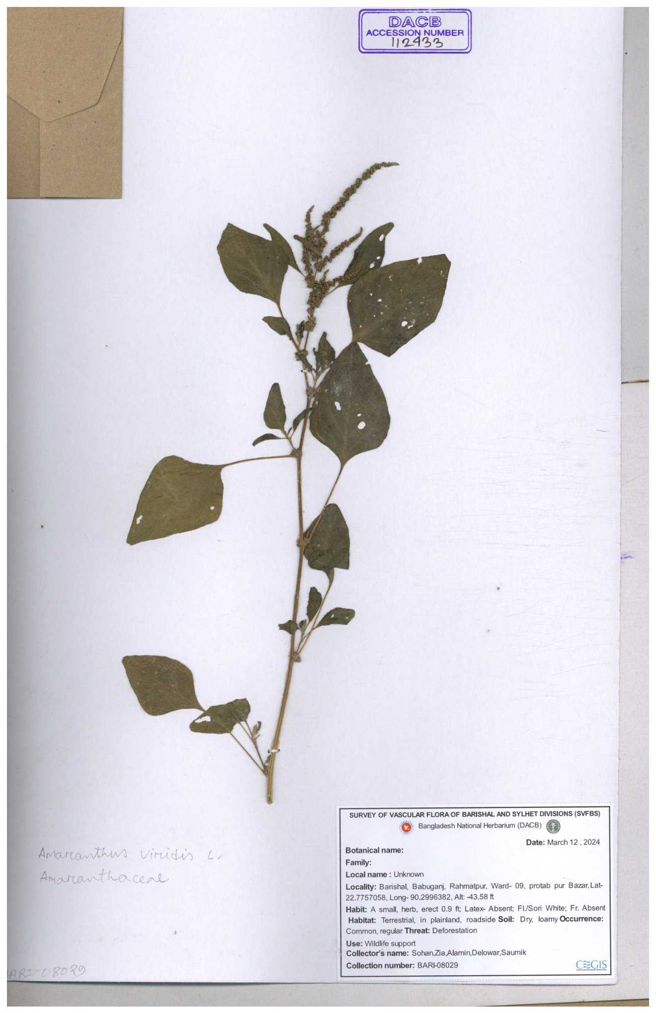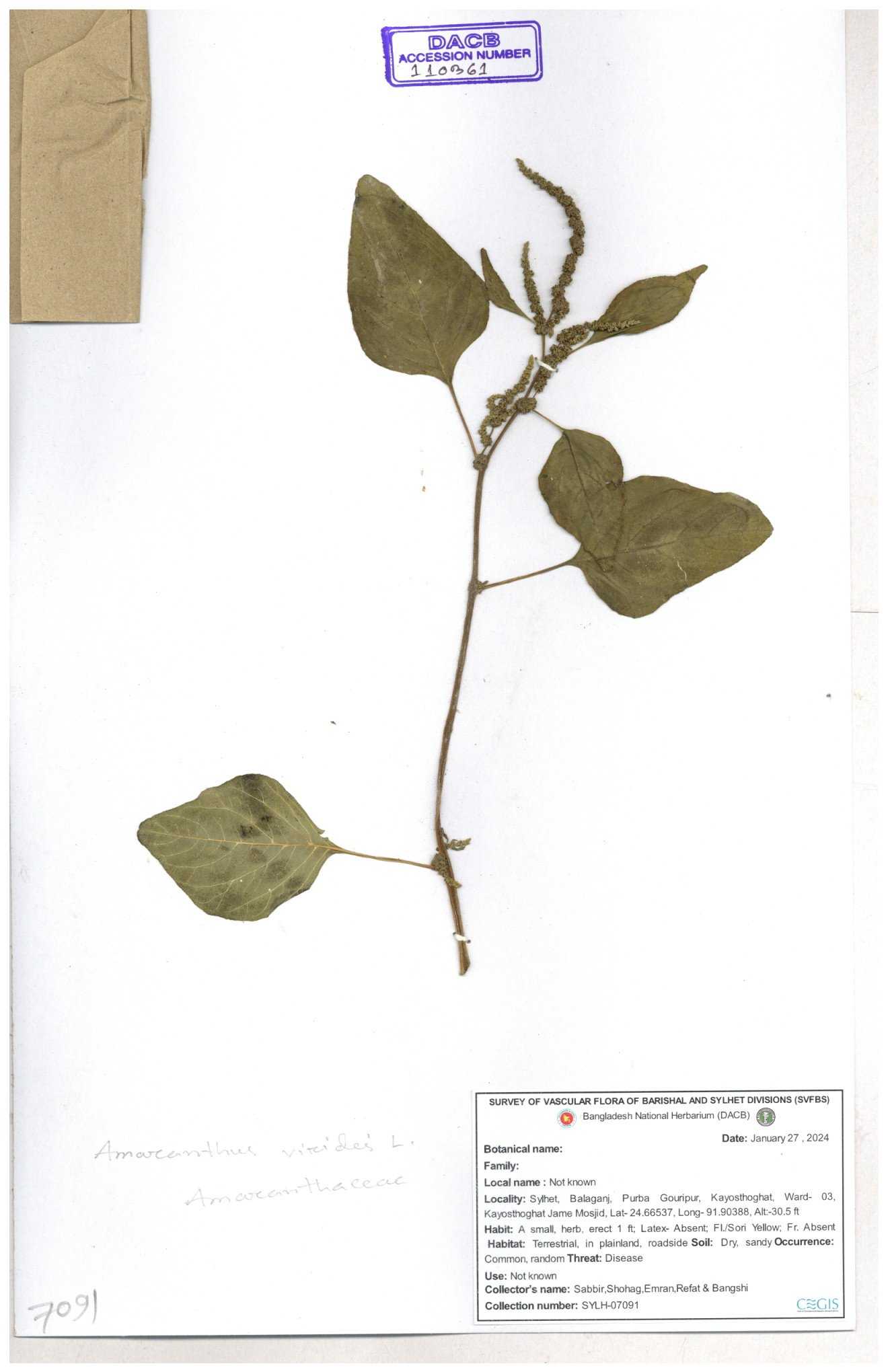 | 64345 | Amaranthaceae | Amaranthus viridis L. | Mominur Rahman, Al amin & Kamrul Islam | JCR-1489 30-11--0001 |