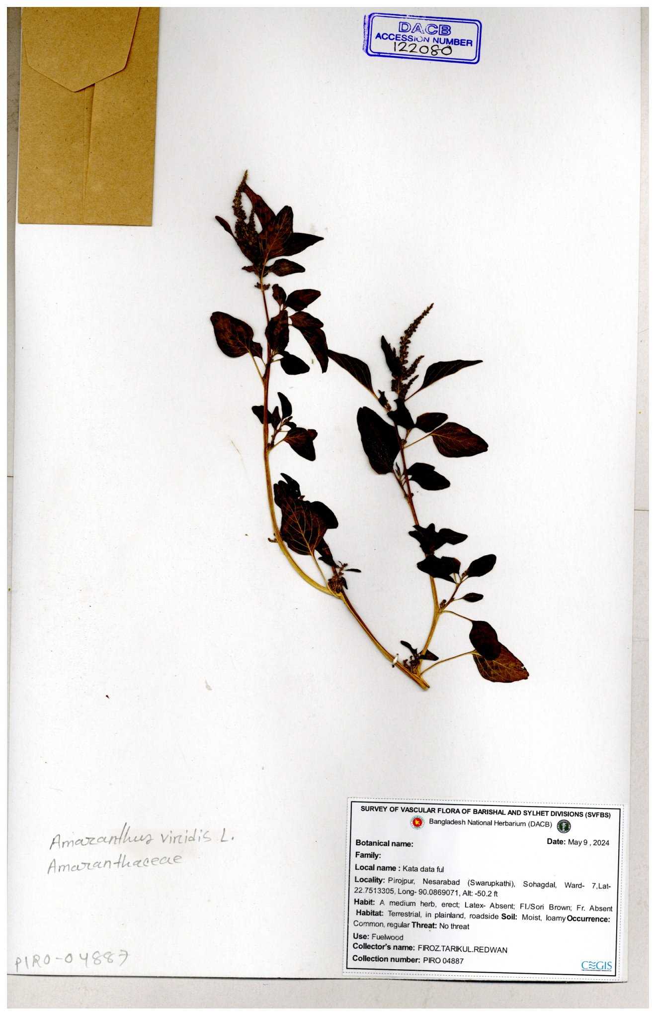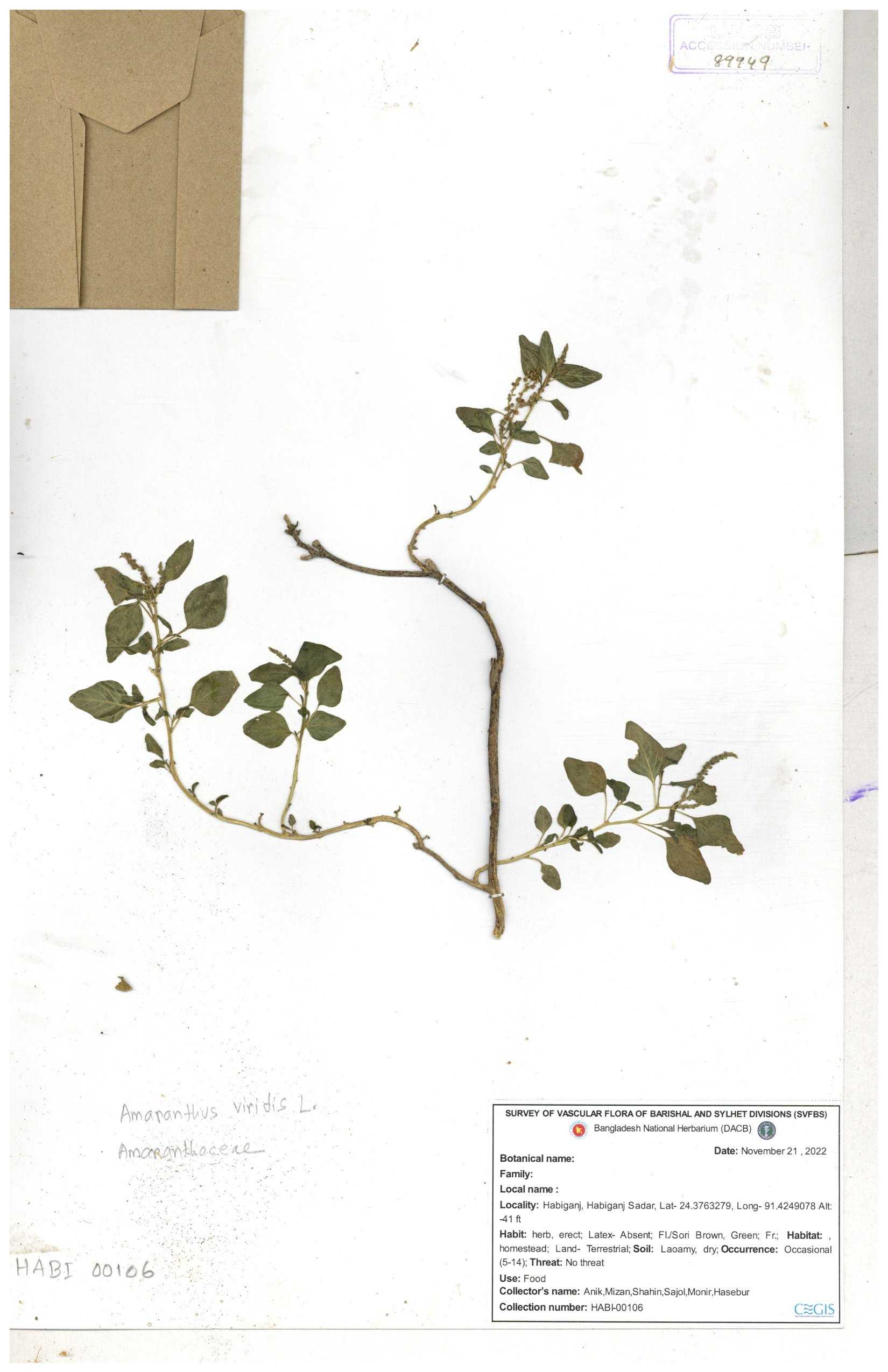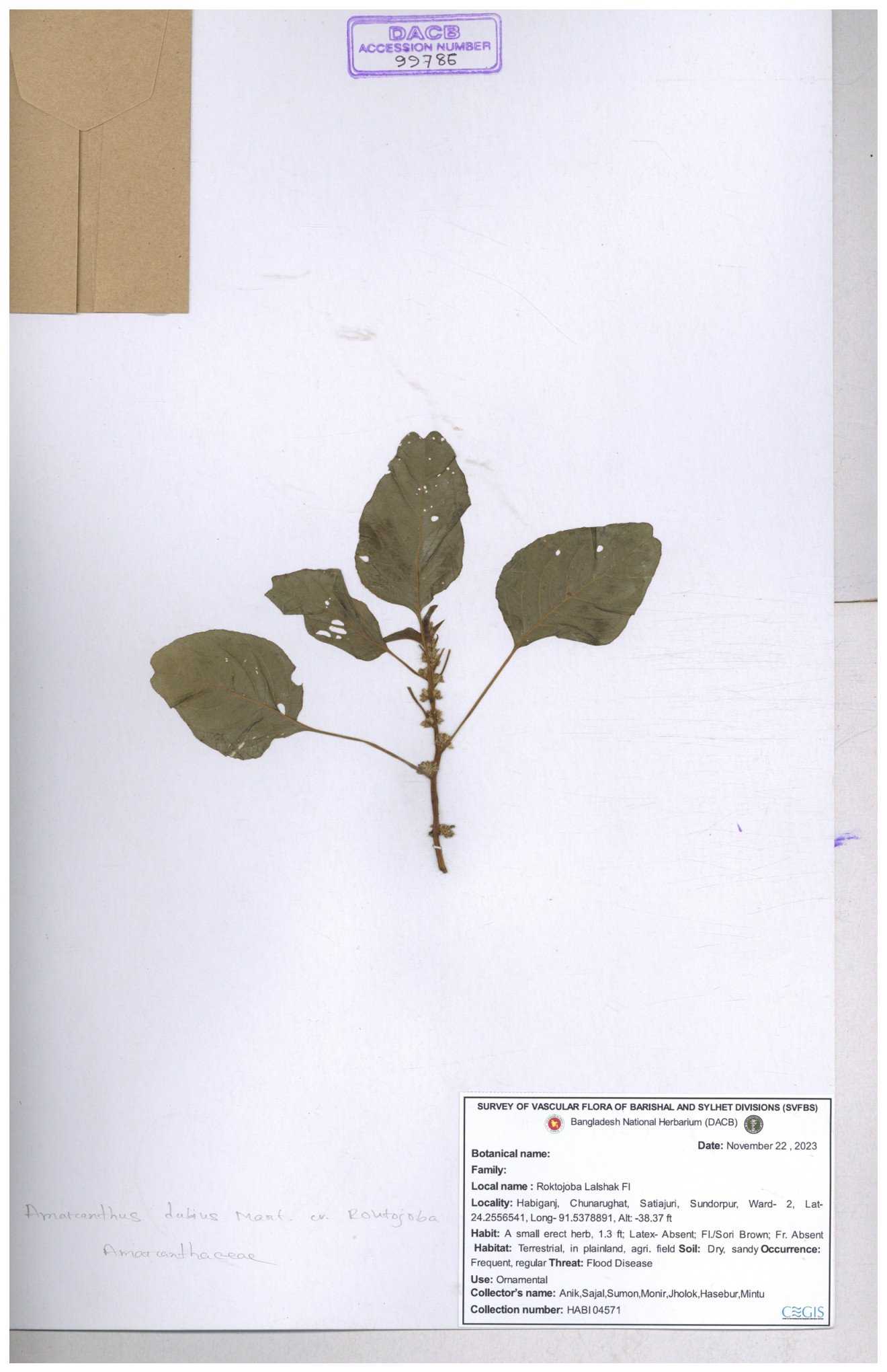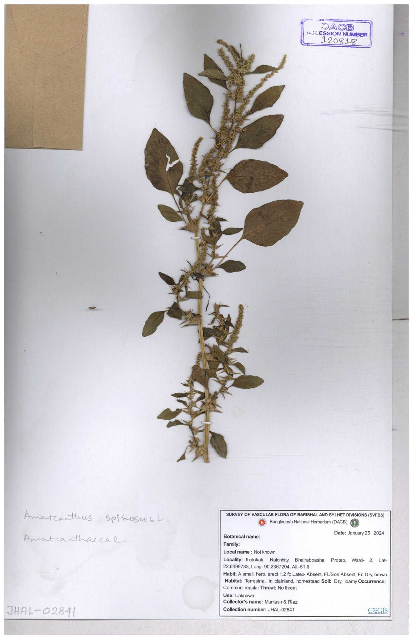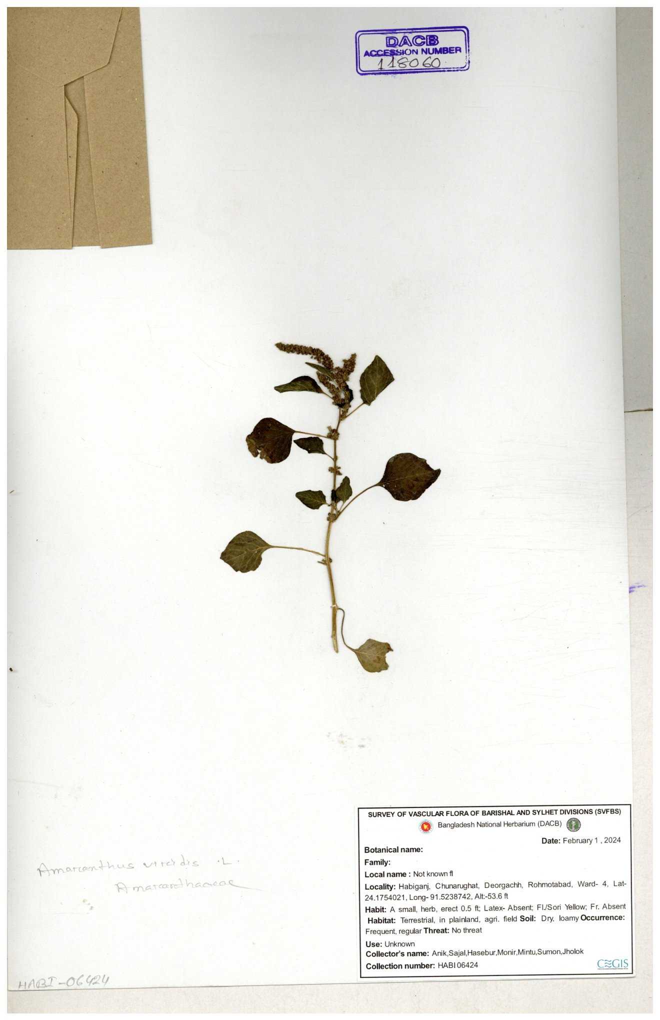 | 64345 | Amaranthaceae | Amaranthus viridis L. | Mominur Rahman, Al amin & Kamrul Islam | JCR-1489 30-11--0001 |