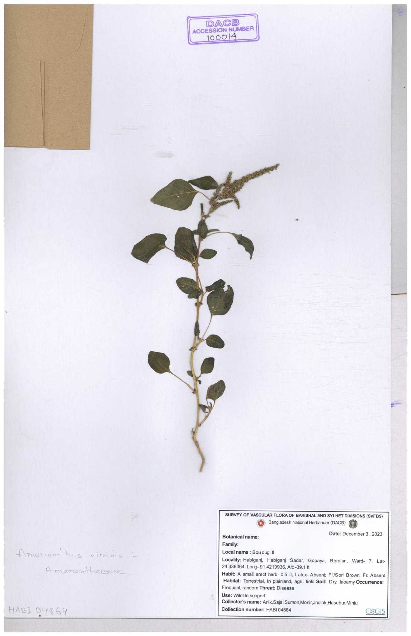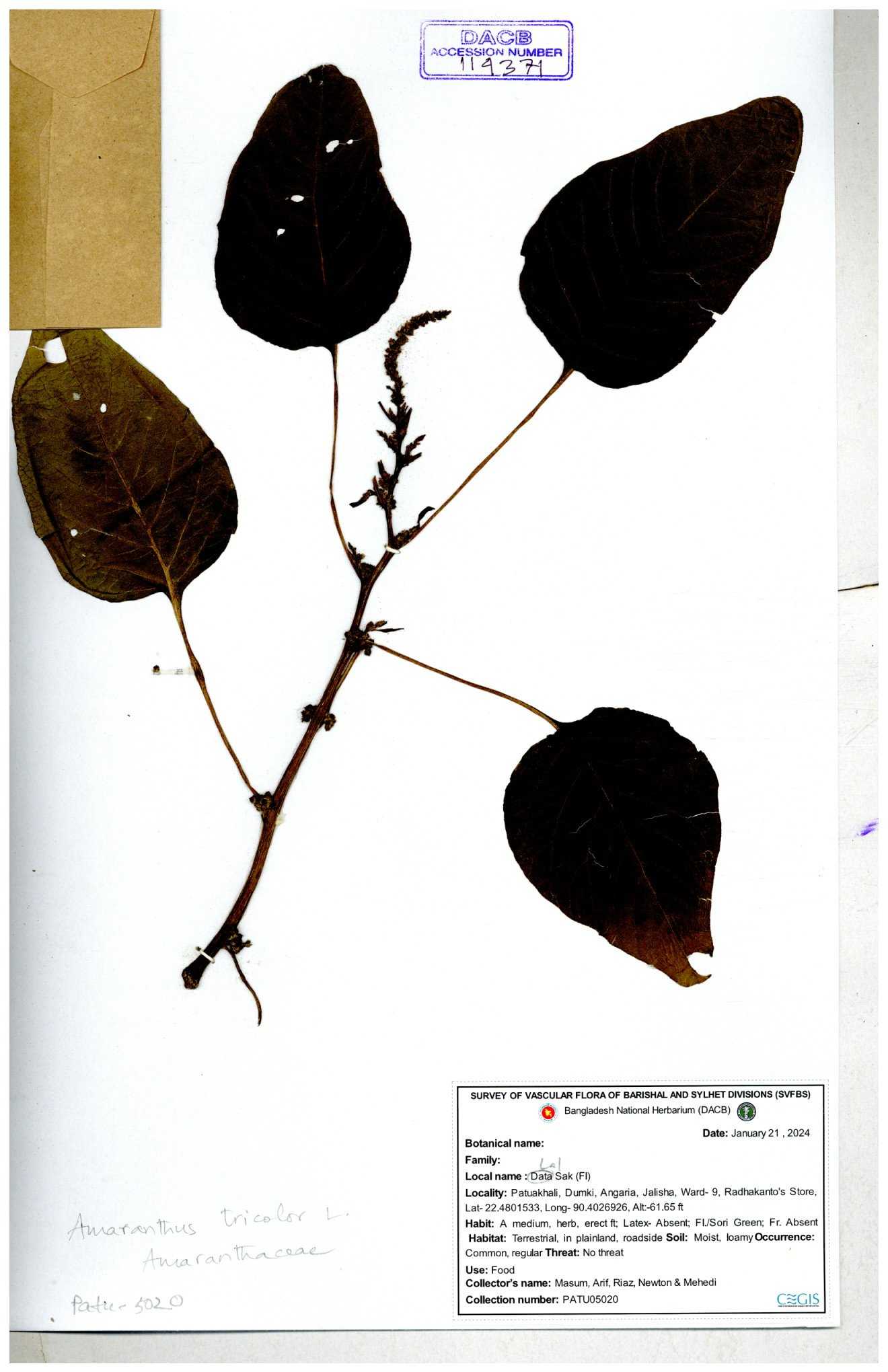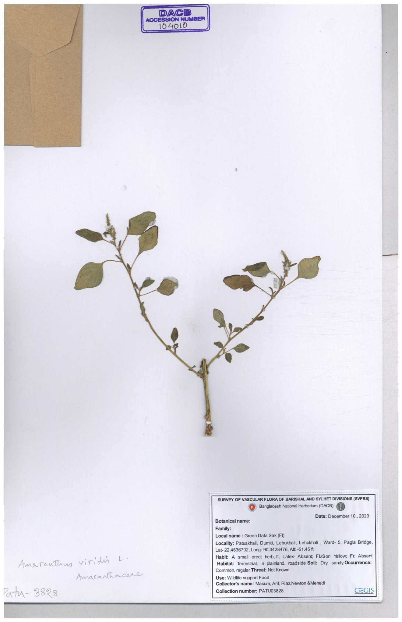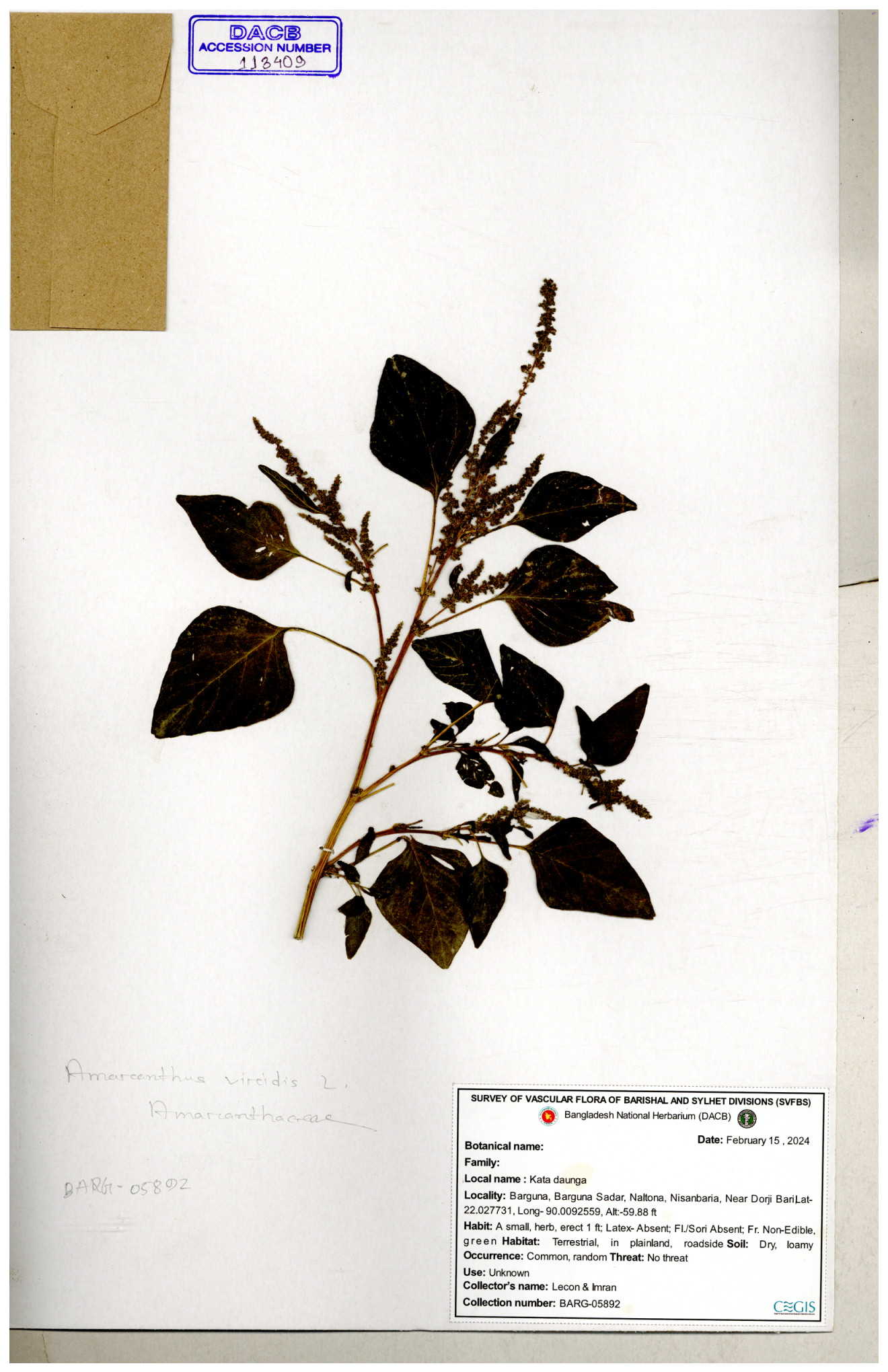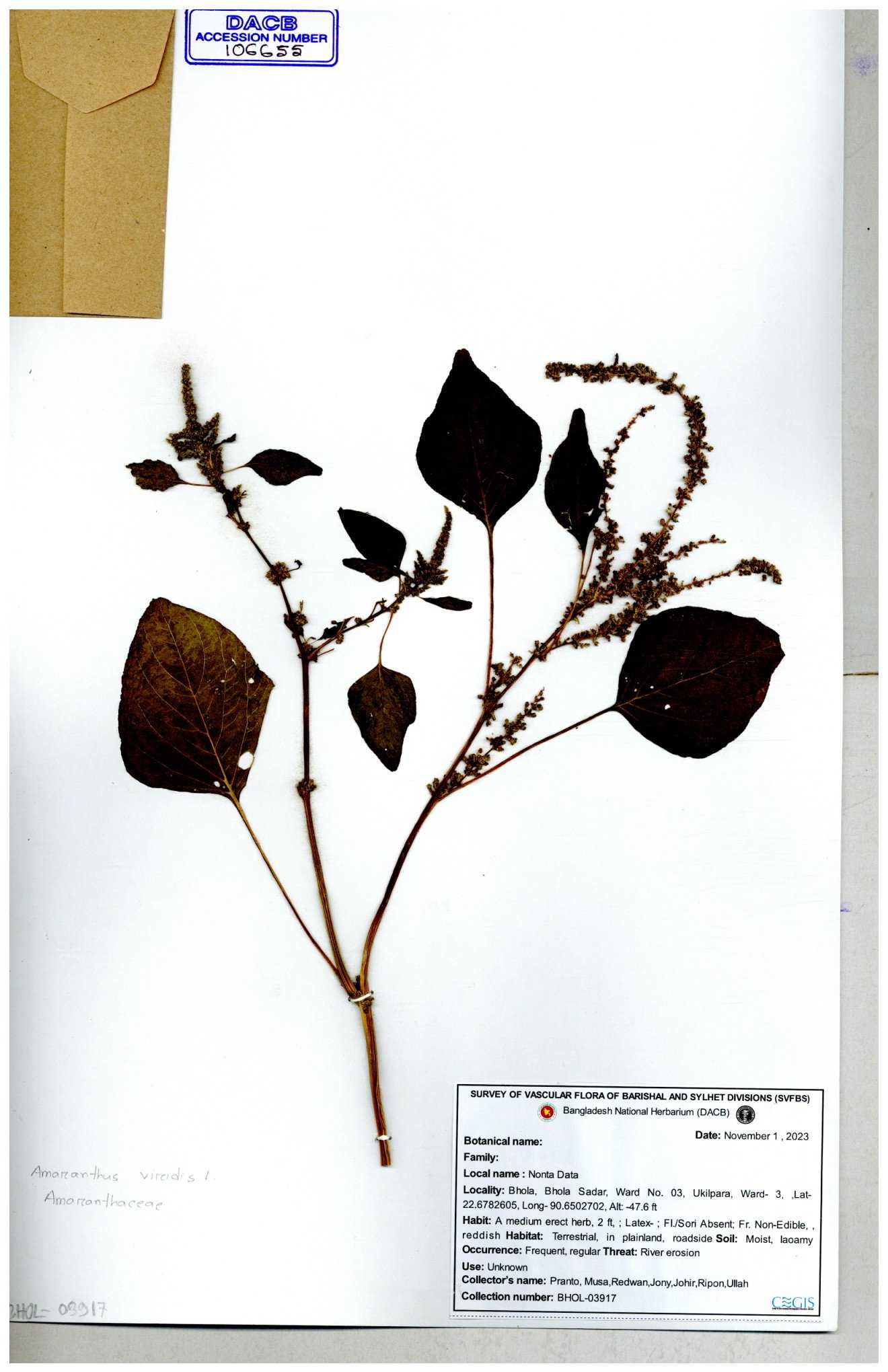 | 65981 | Amaranthaceae | Amaranthus viridis L. | Khandakar Kamrul Islam | KKI-4064 12-03-2020 |