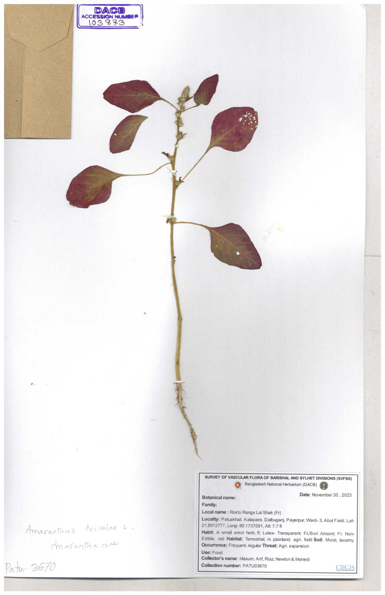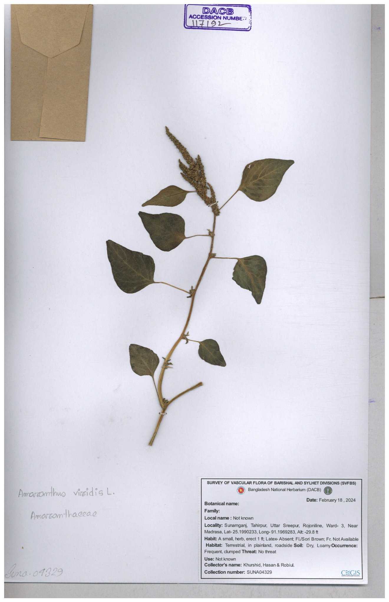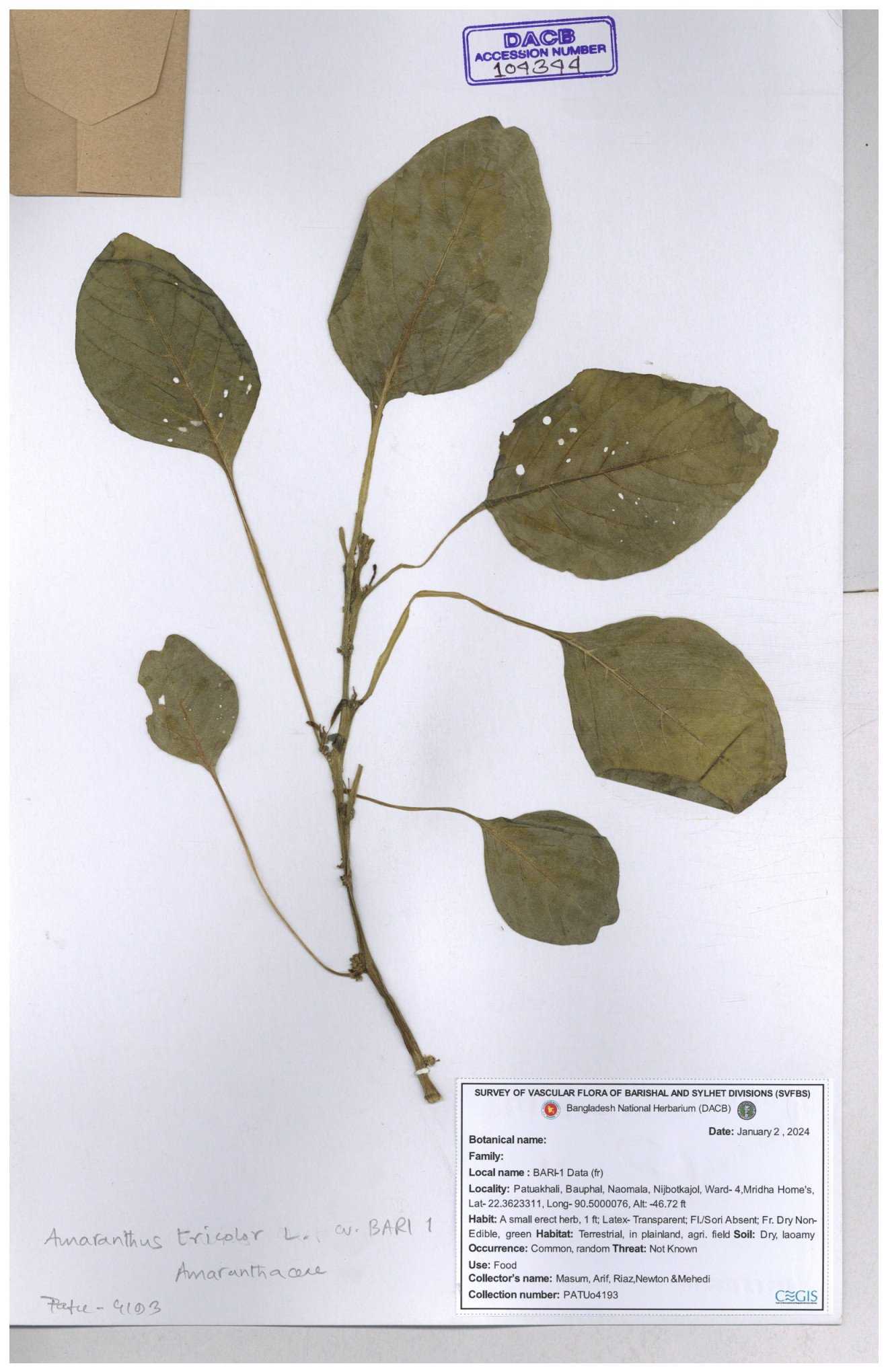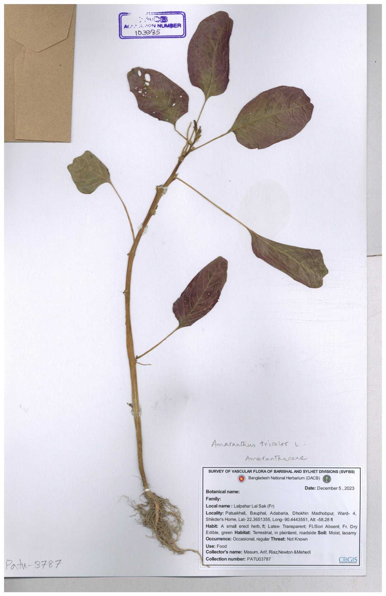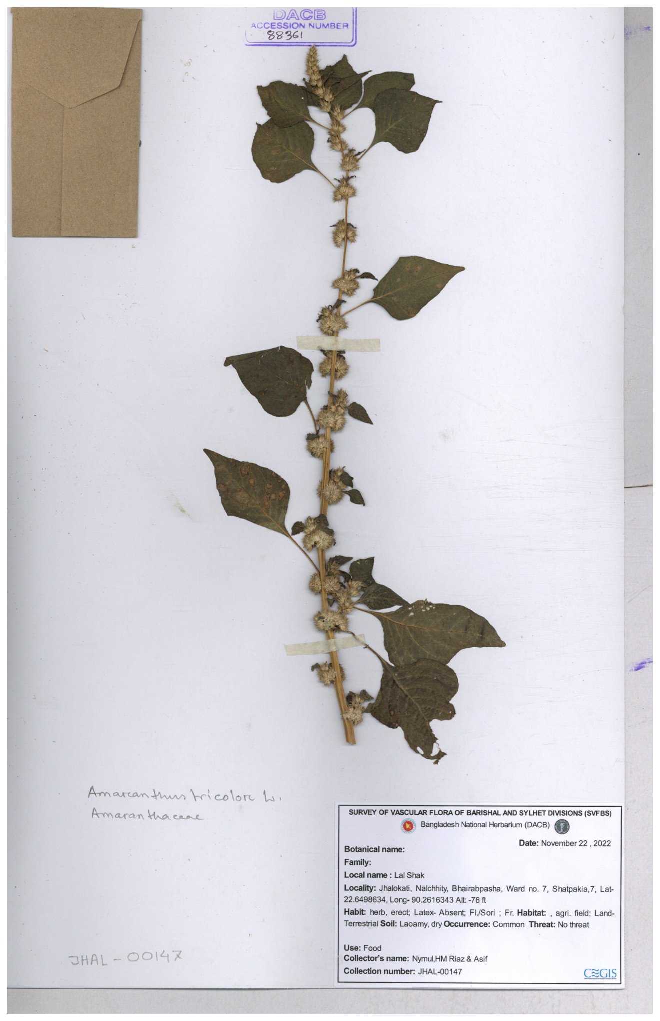 | 65981 | Amaranthaceae | Amaranthus viridis L. | Khandakar Kamrul Islam | KKI-4064 12-03-2020 |