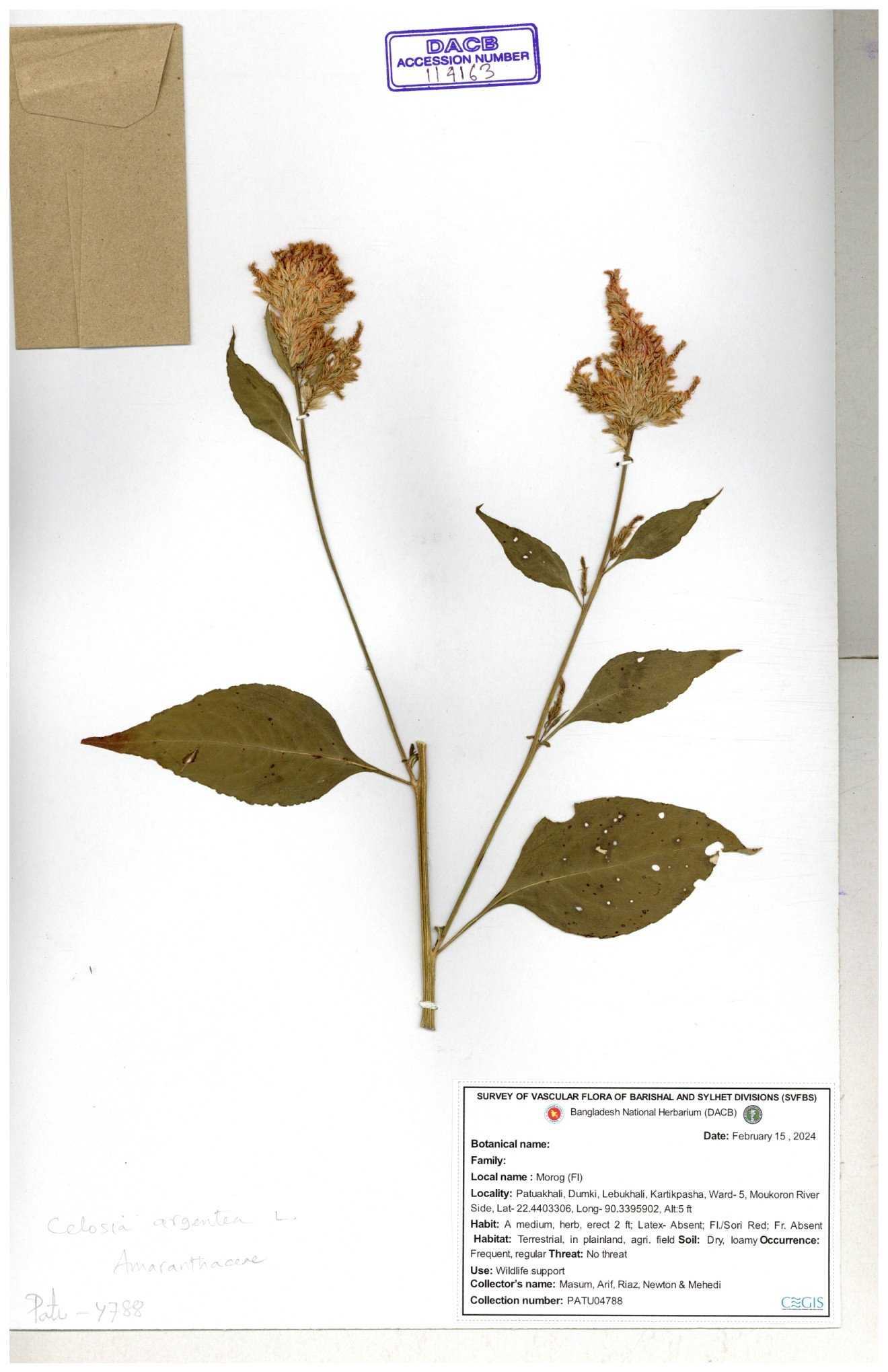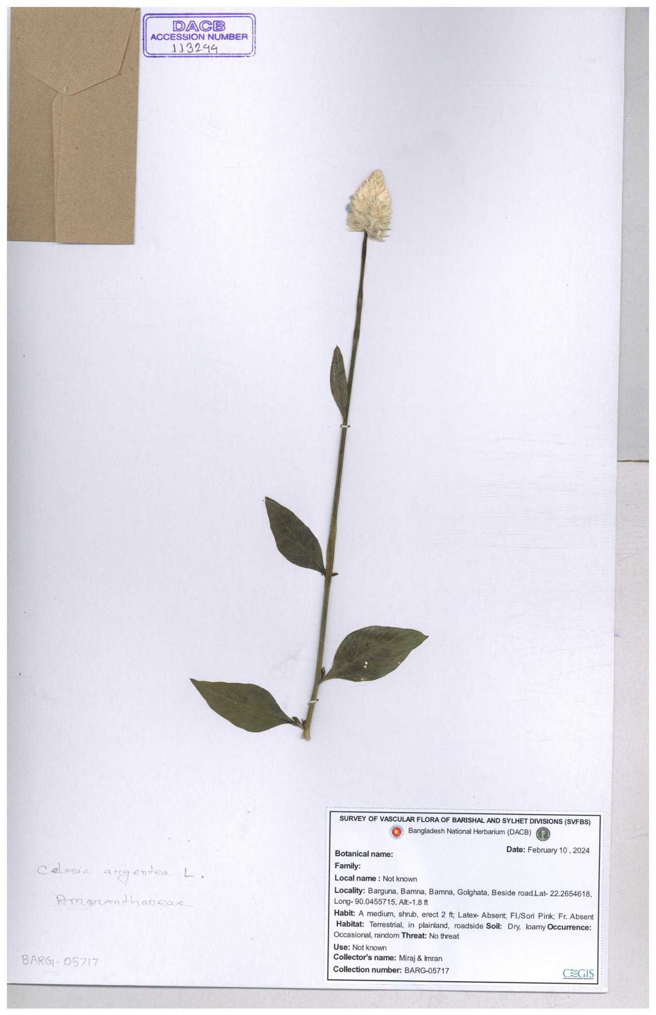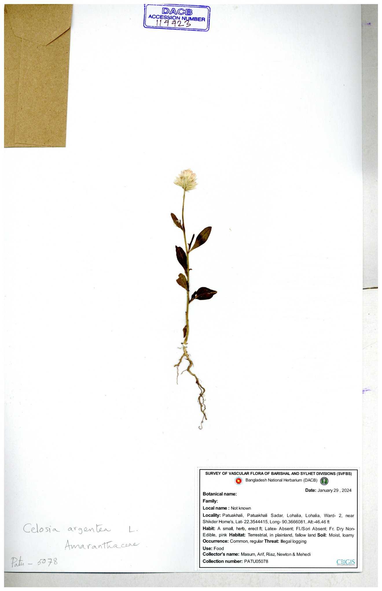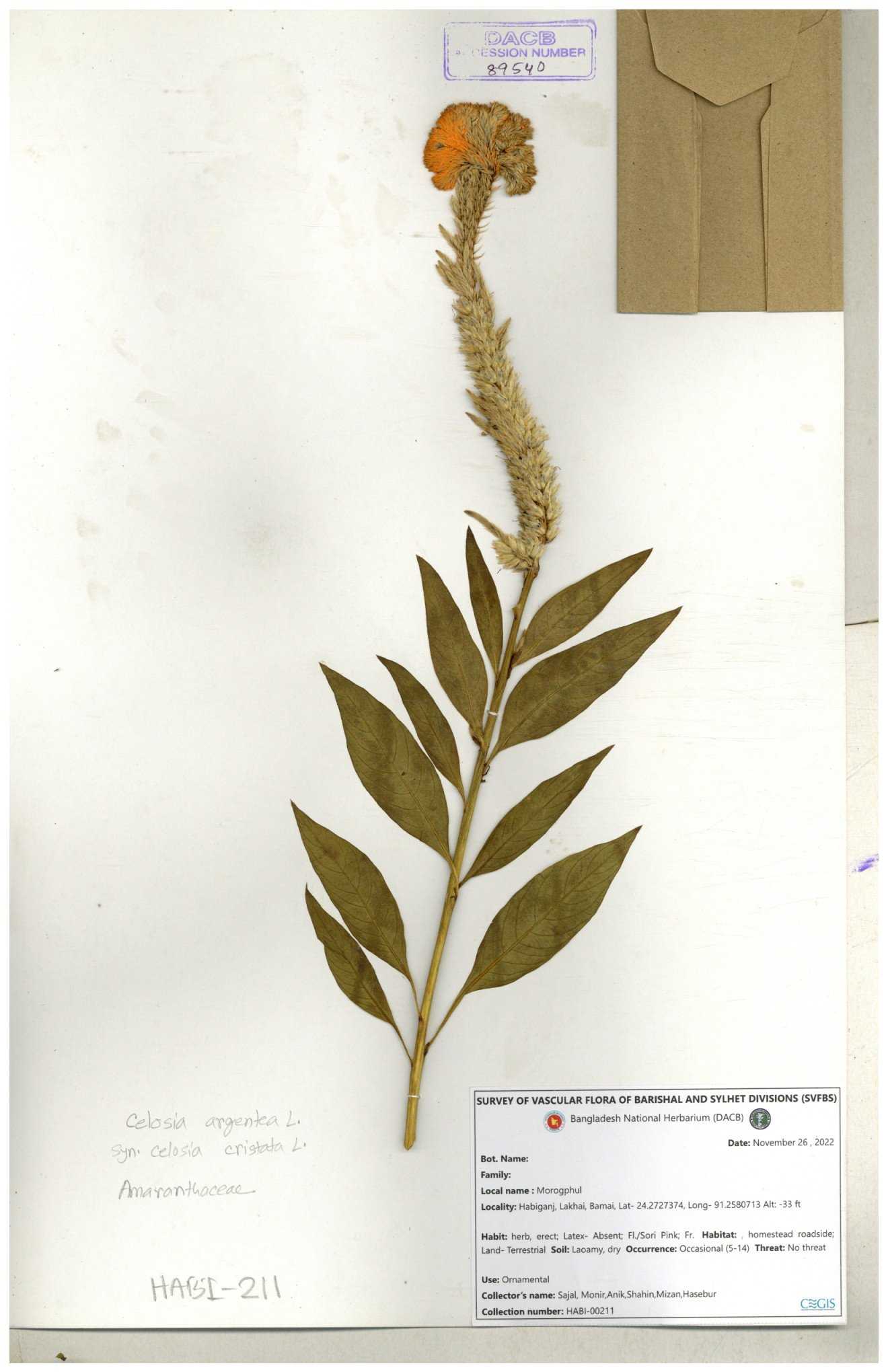 | 60544 | Amaranthaceae | Celosia cristata L. | Niyaamul Kabir, Zahid Hasan, Mchodi Hasan | NK-5143 17-10-2017 |