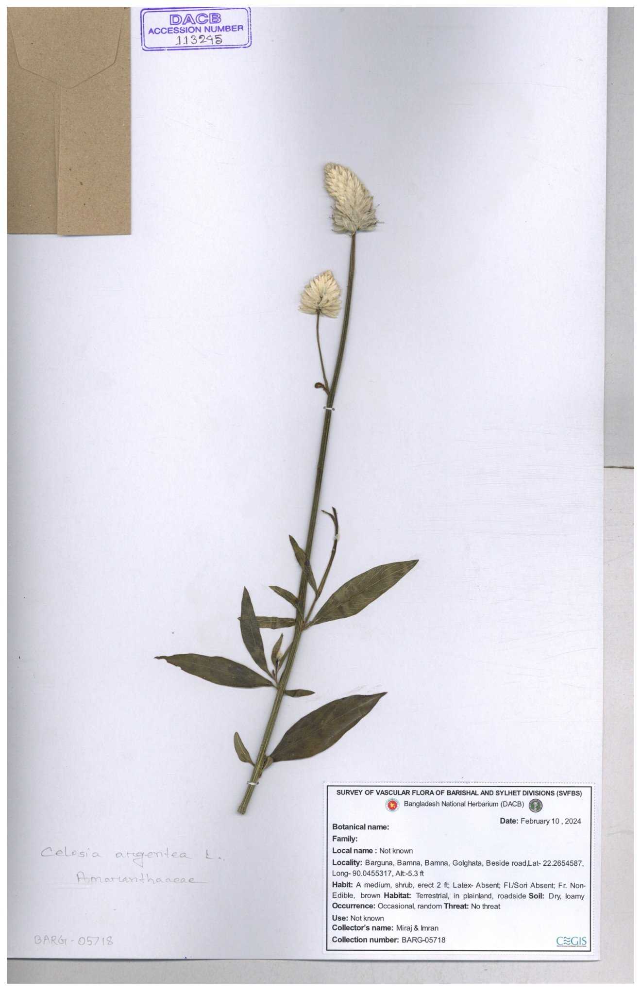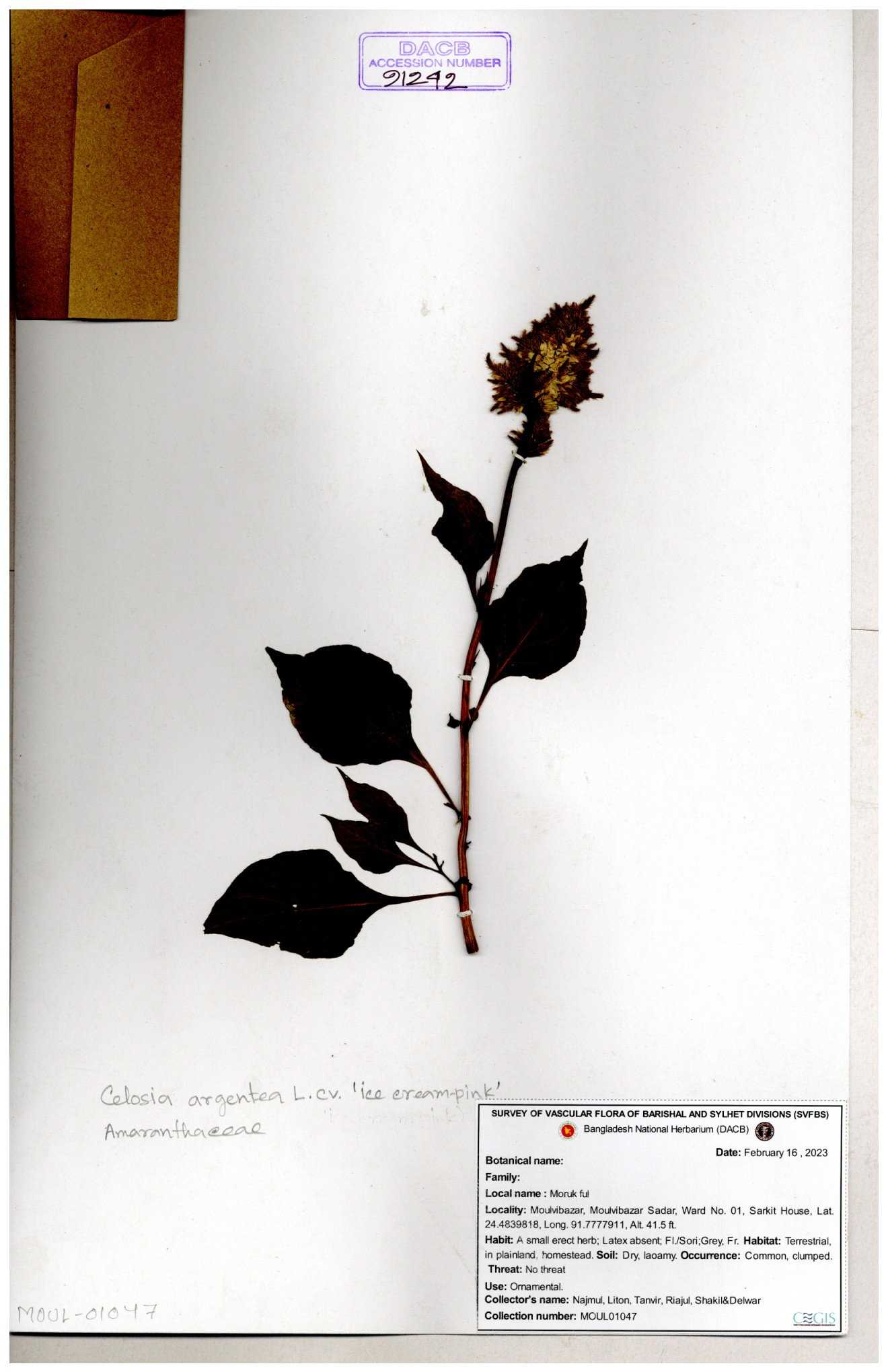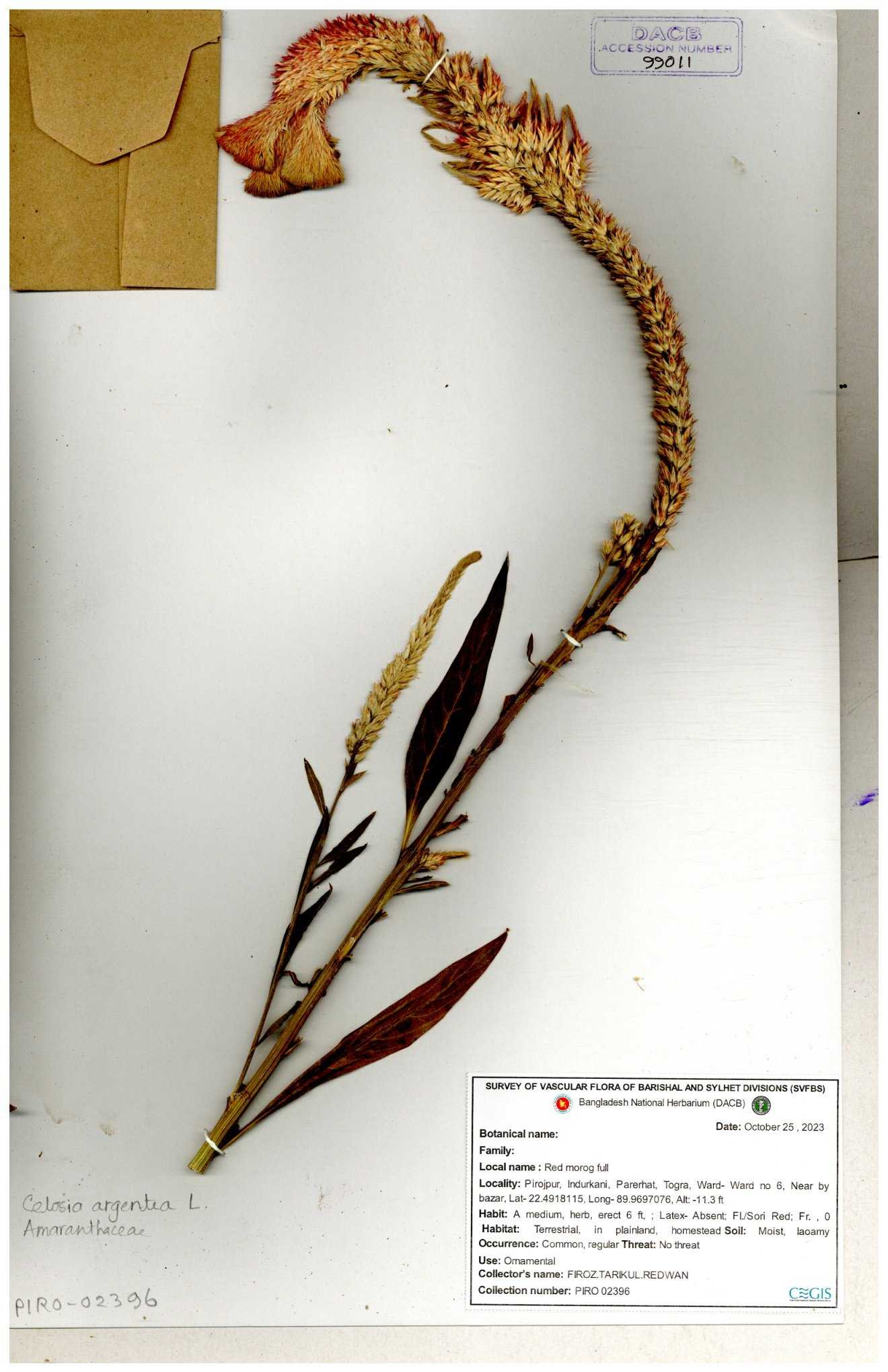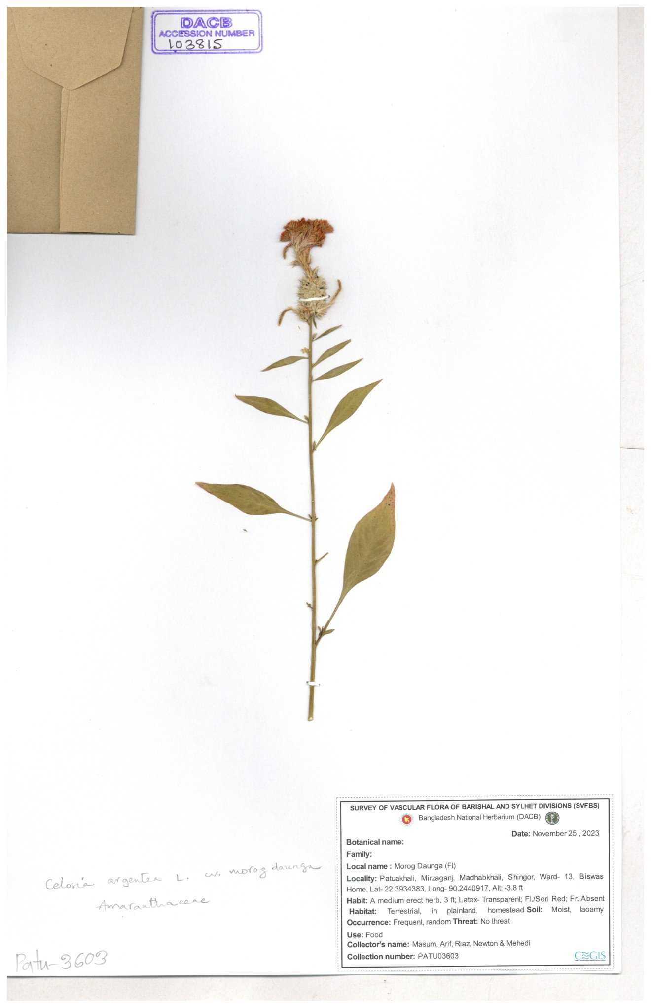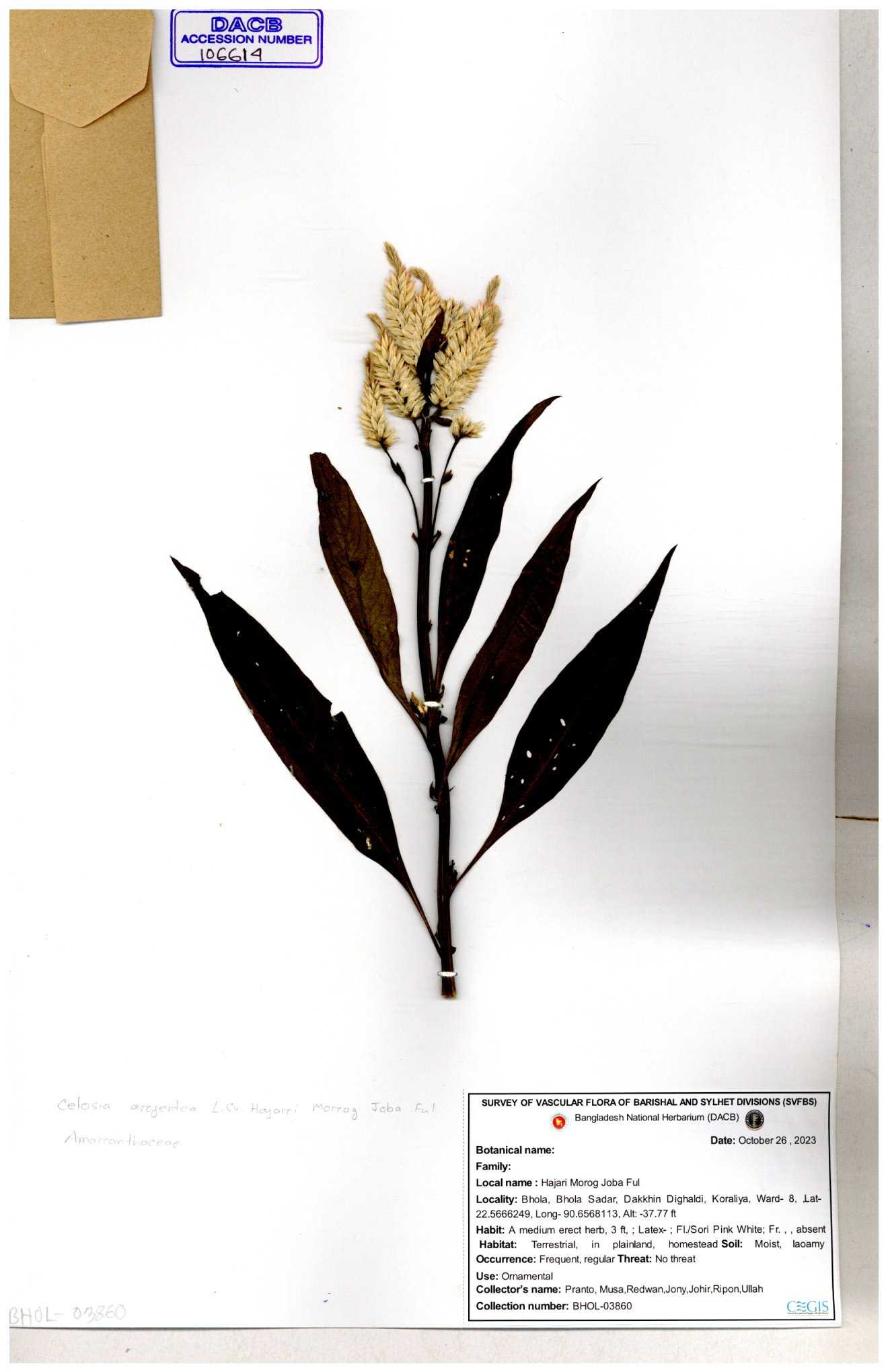 | 60544 | Amaranthaceae | Celosia cristata L. | Niyaamul Kabir, Zahid Hasan, Mchodi Hasan | NK-5143 17-10-2017 |