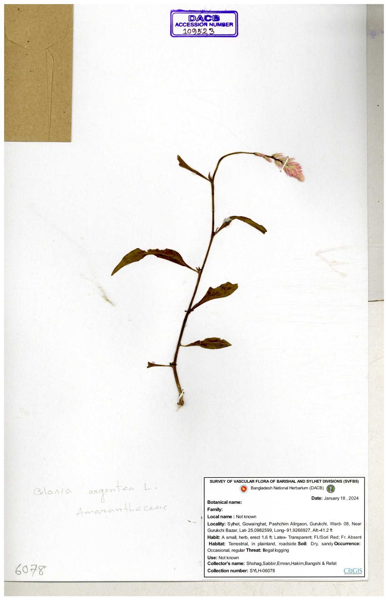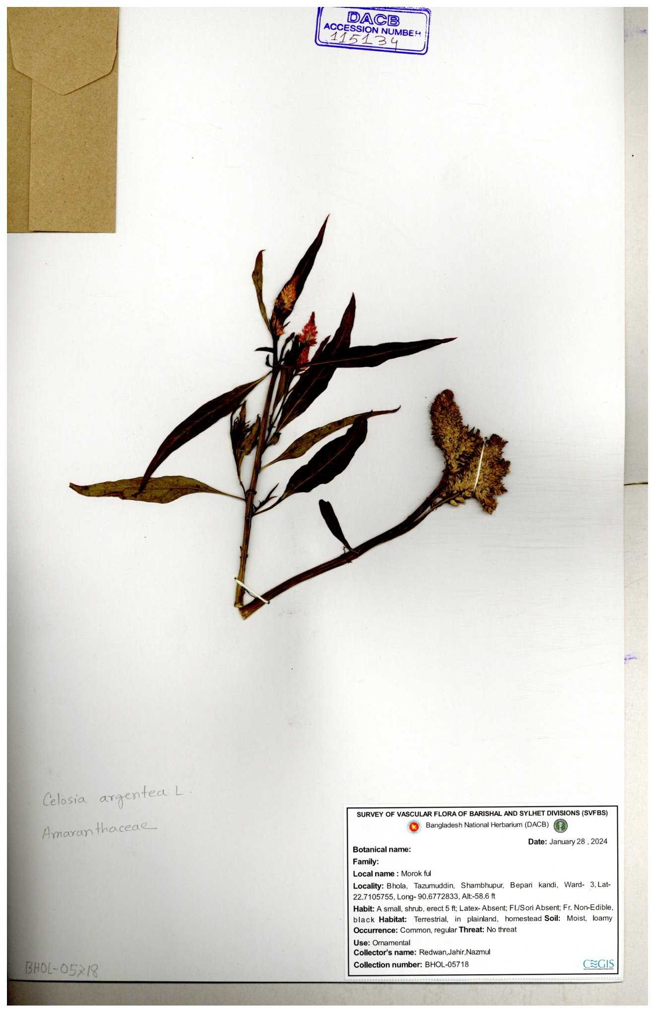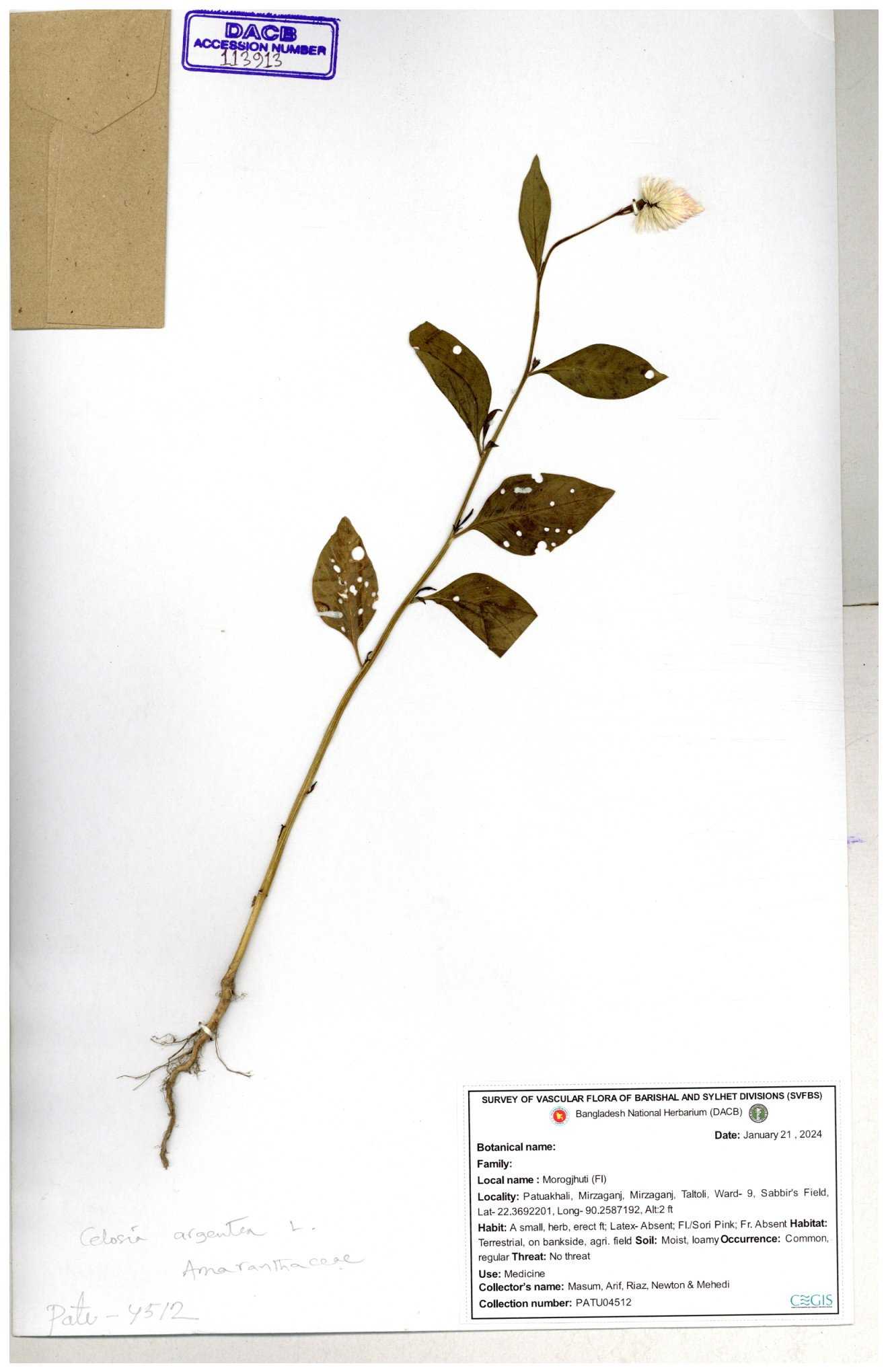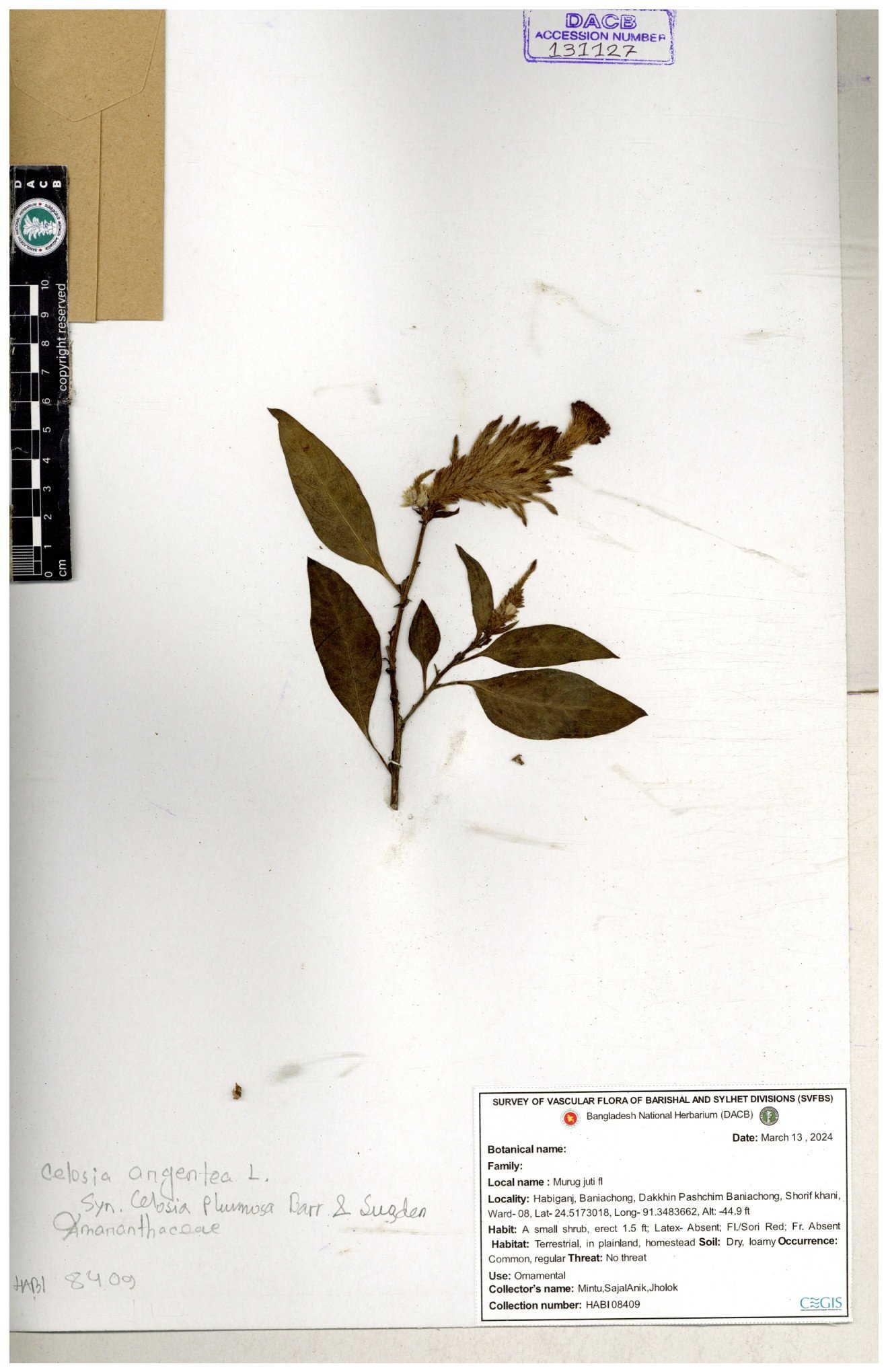 | 60544 | Amaranthaceae | Celosia cristata L. | Niyaamul Kabir, Zahid Hasan, Mchodi Hasan | NK-5143 17-10-2017 |