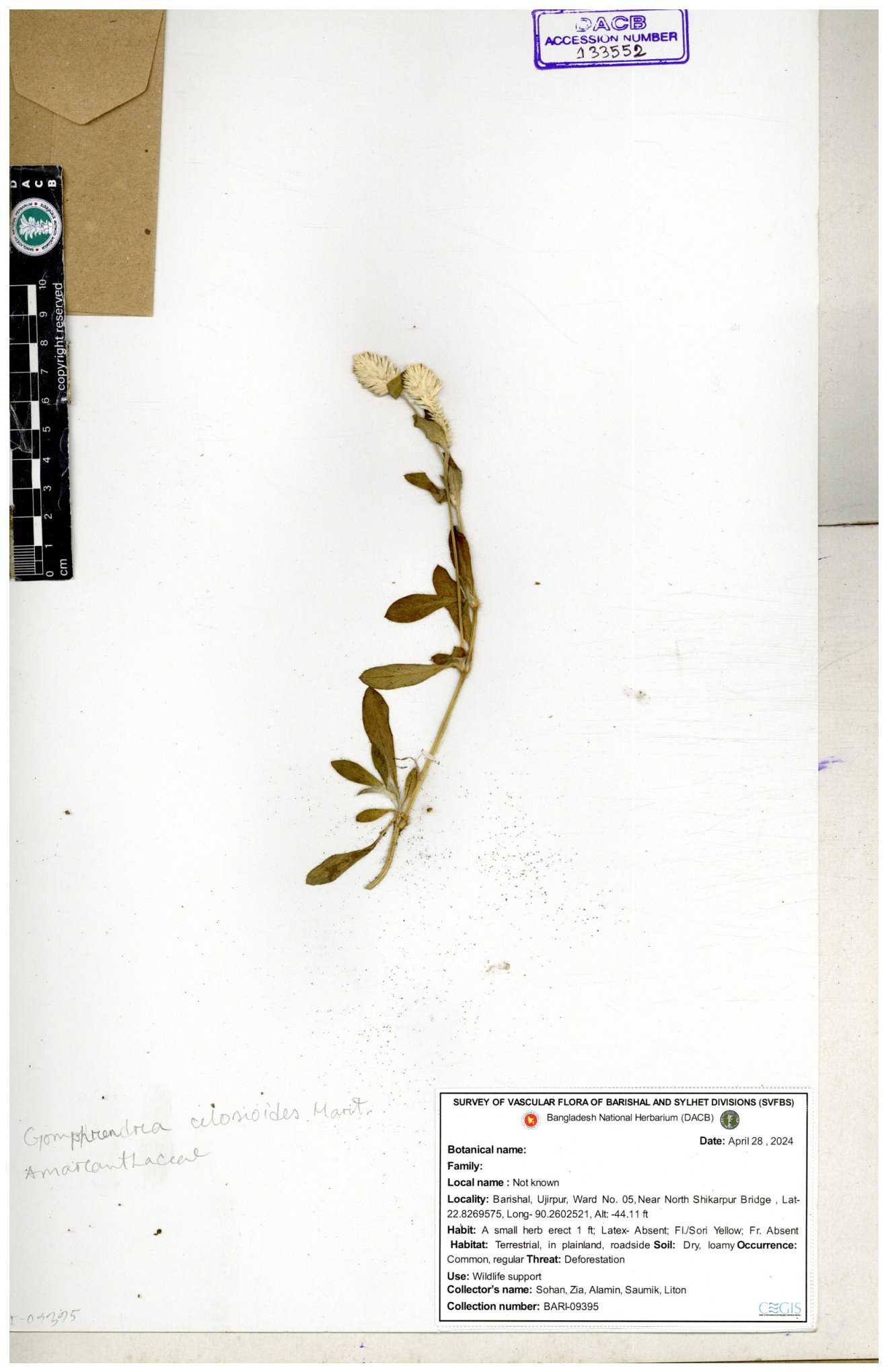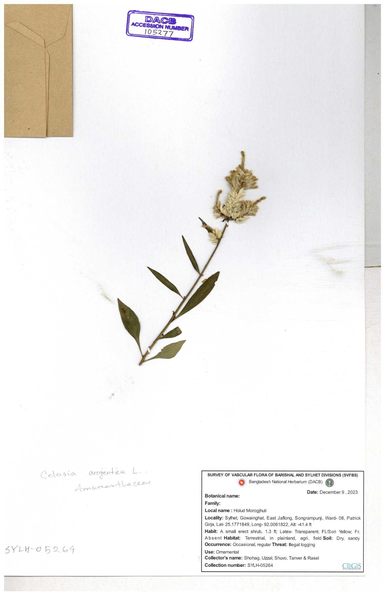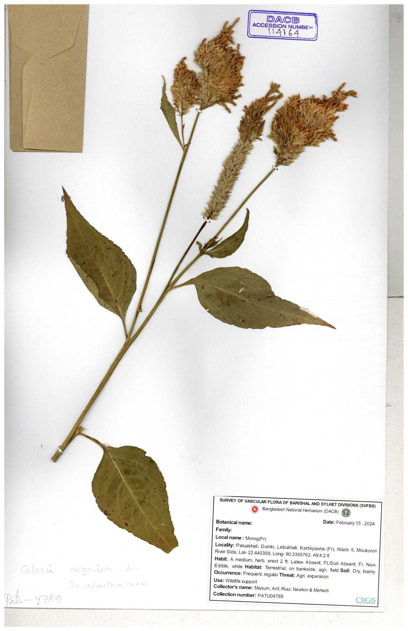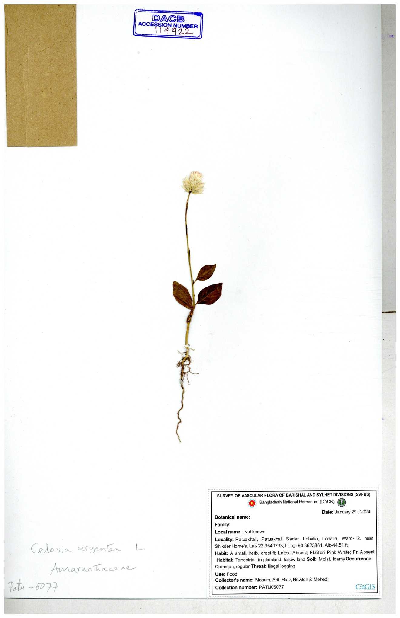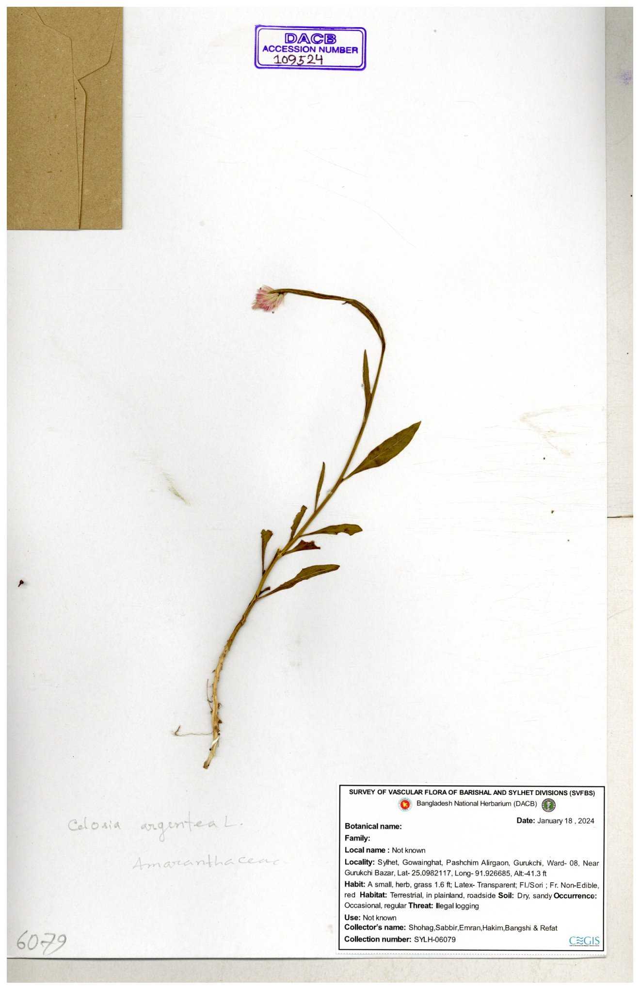 | 60544 | Amaranthaceae | Celosia cristata L. | Niyaamul Kabir, Zahid Hasan, Mchodi Hasan | NK-5143 17-10-2017 |