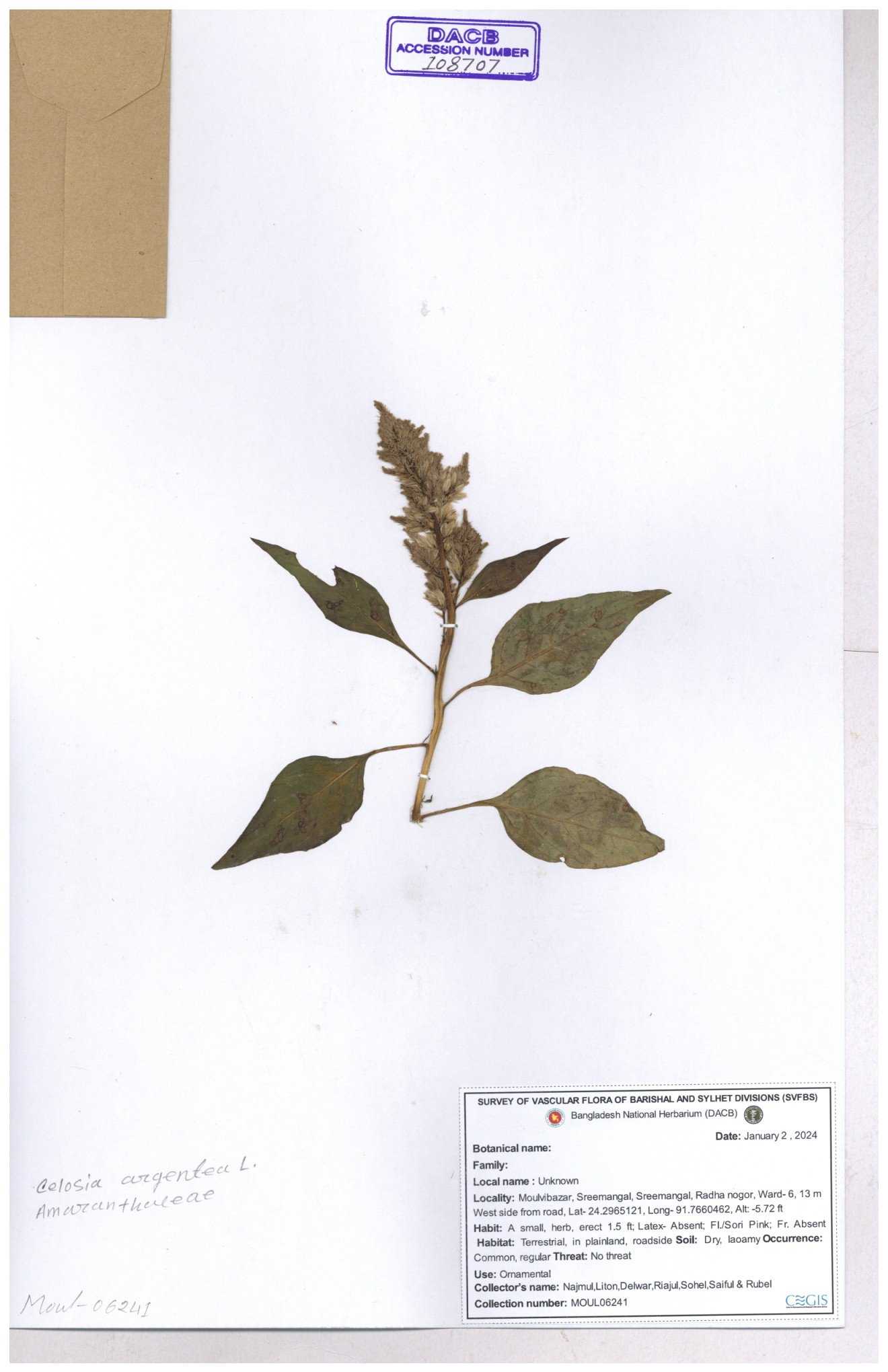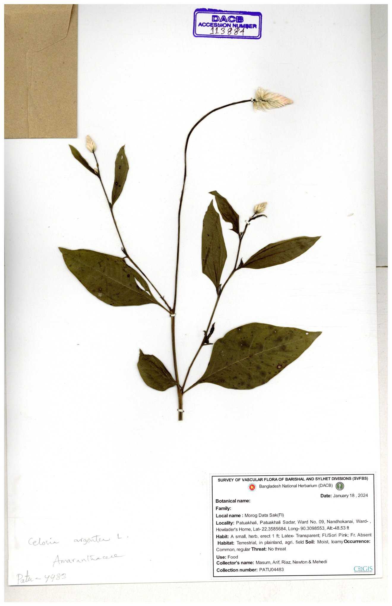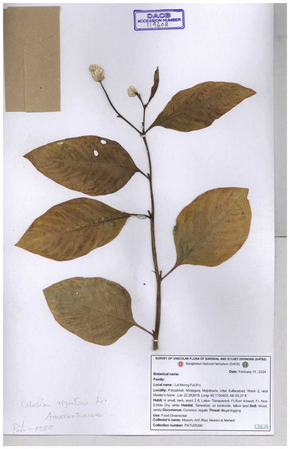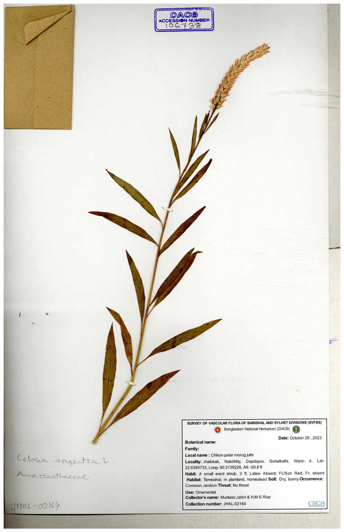 | 66421 | Amaranthaceae | Celosia argentea L. | Mominur Rahman, Al amin & Kamrul Islam | JCR-915 09-10-2016 |