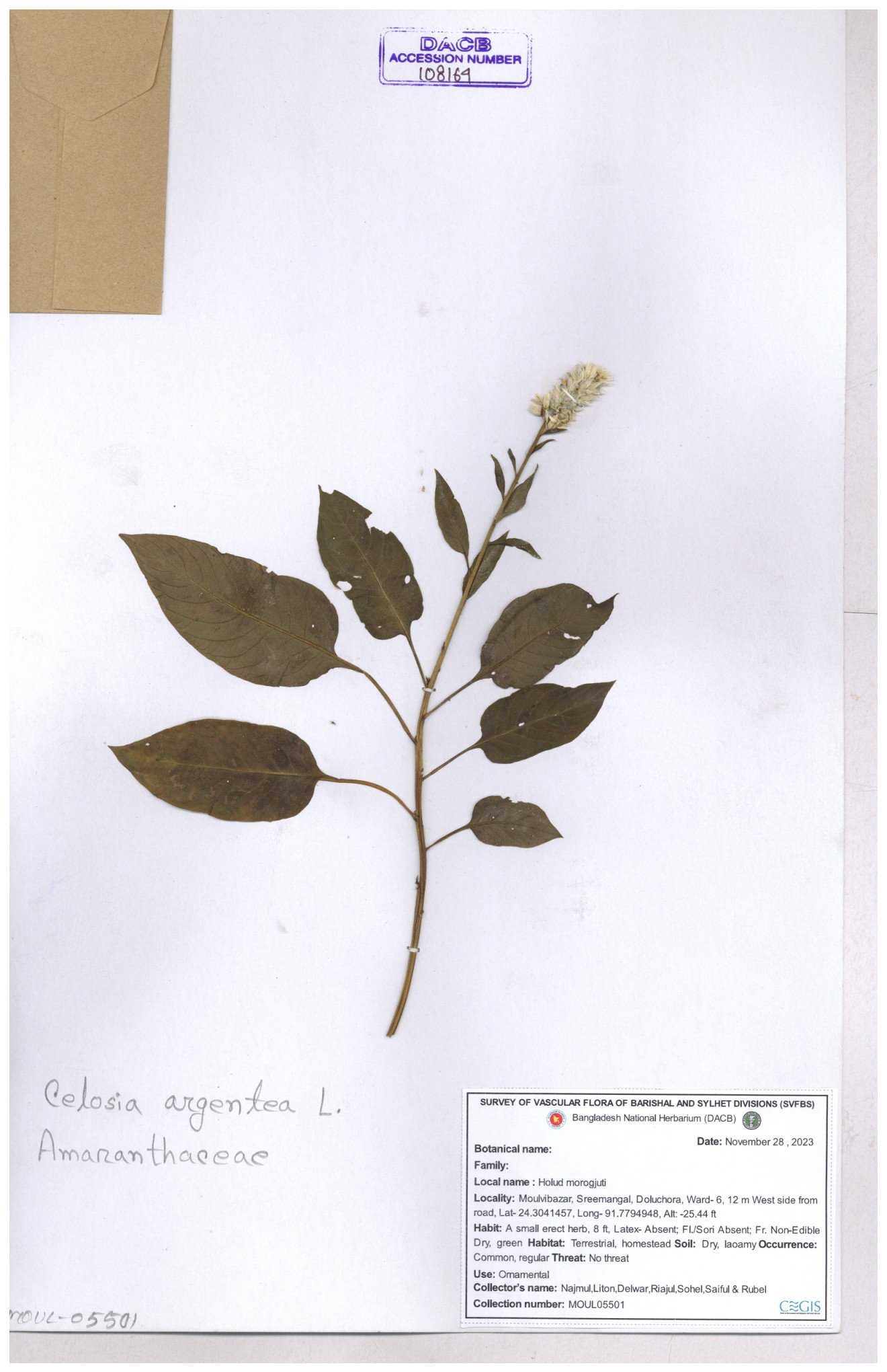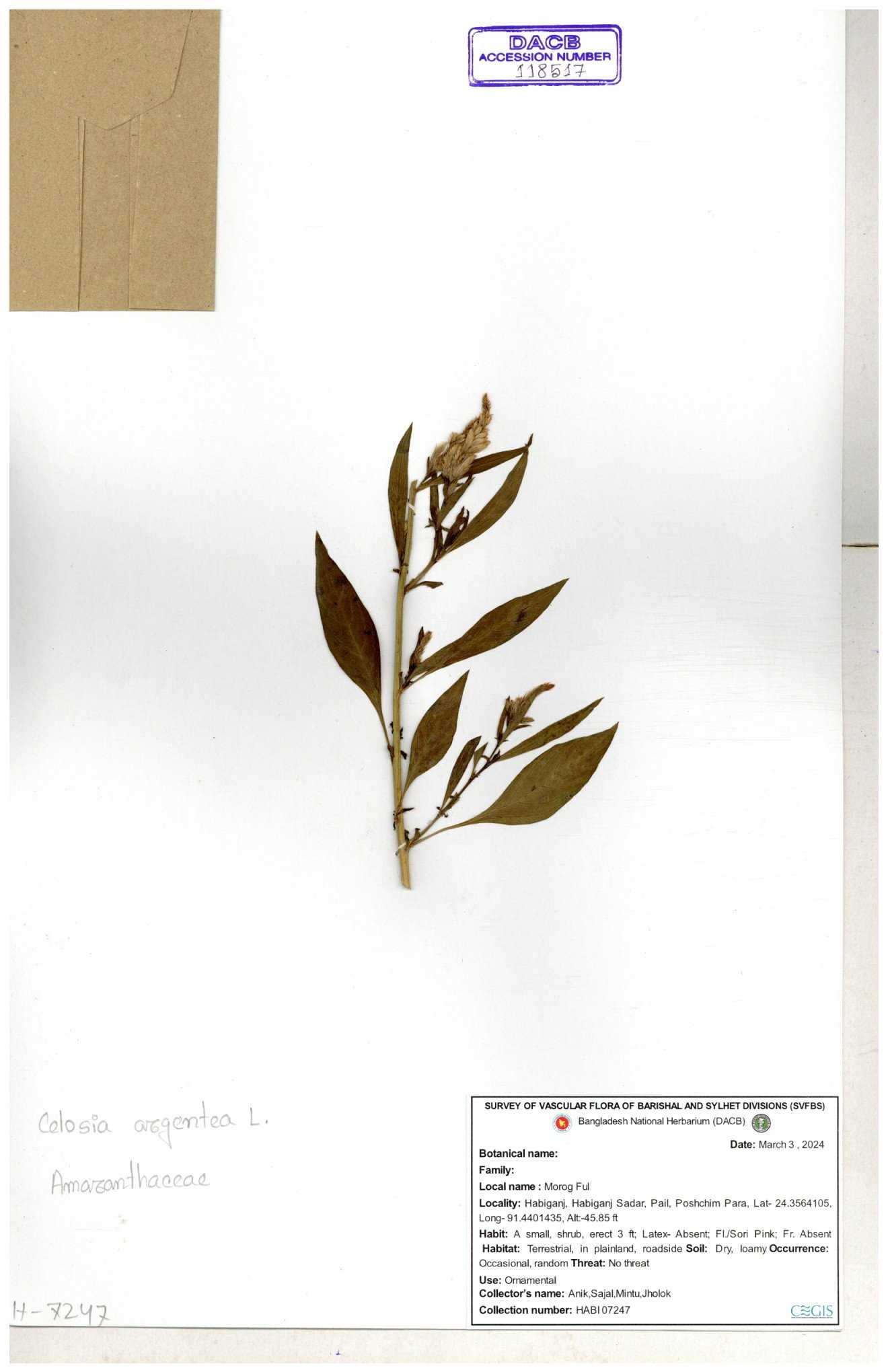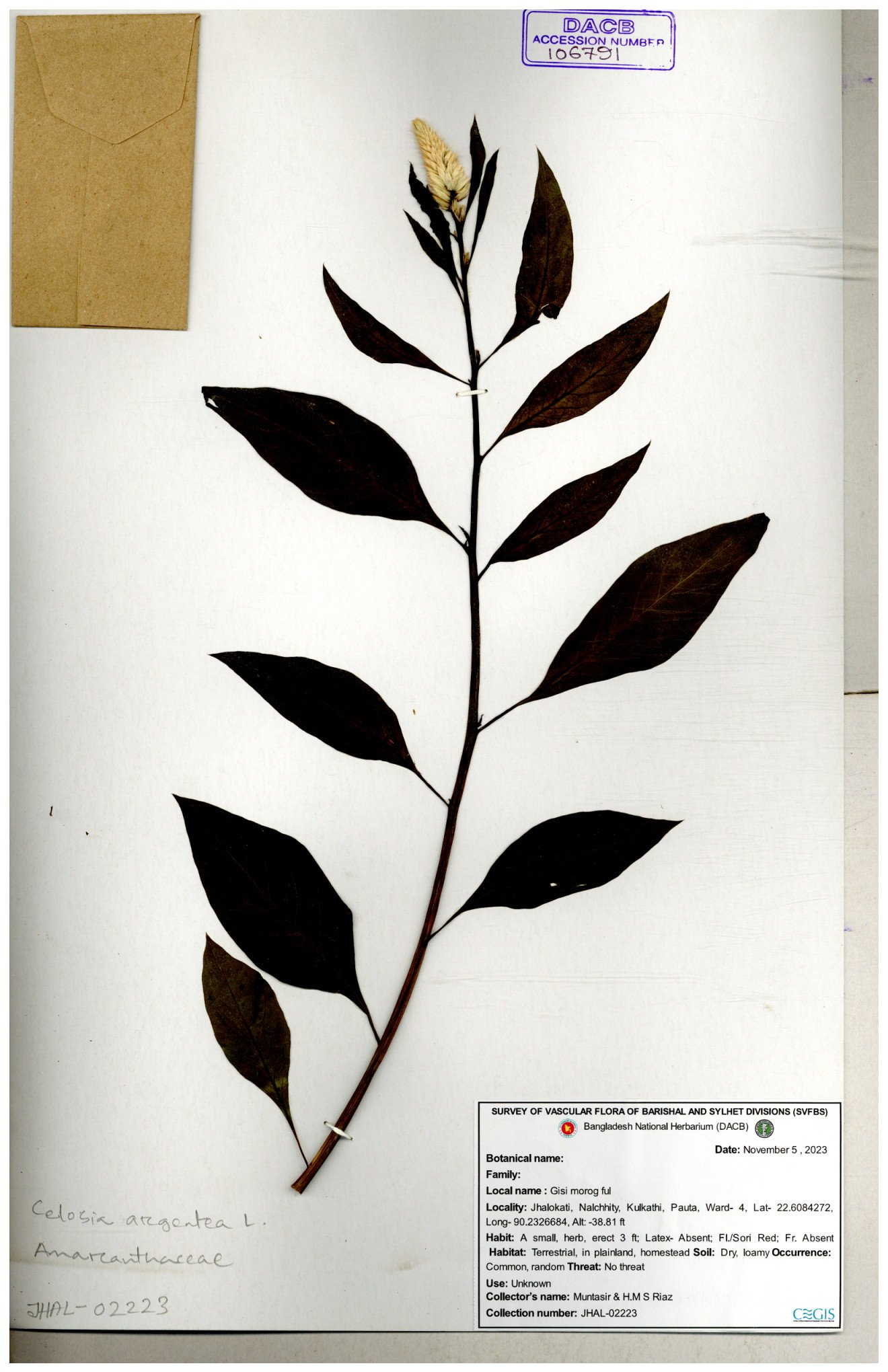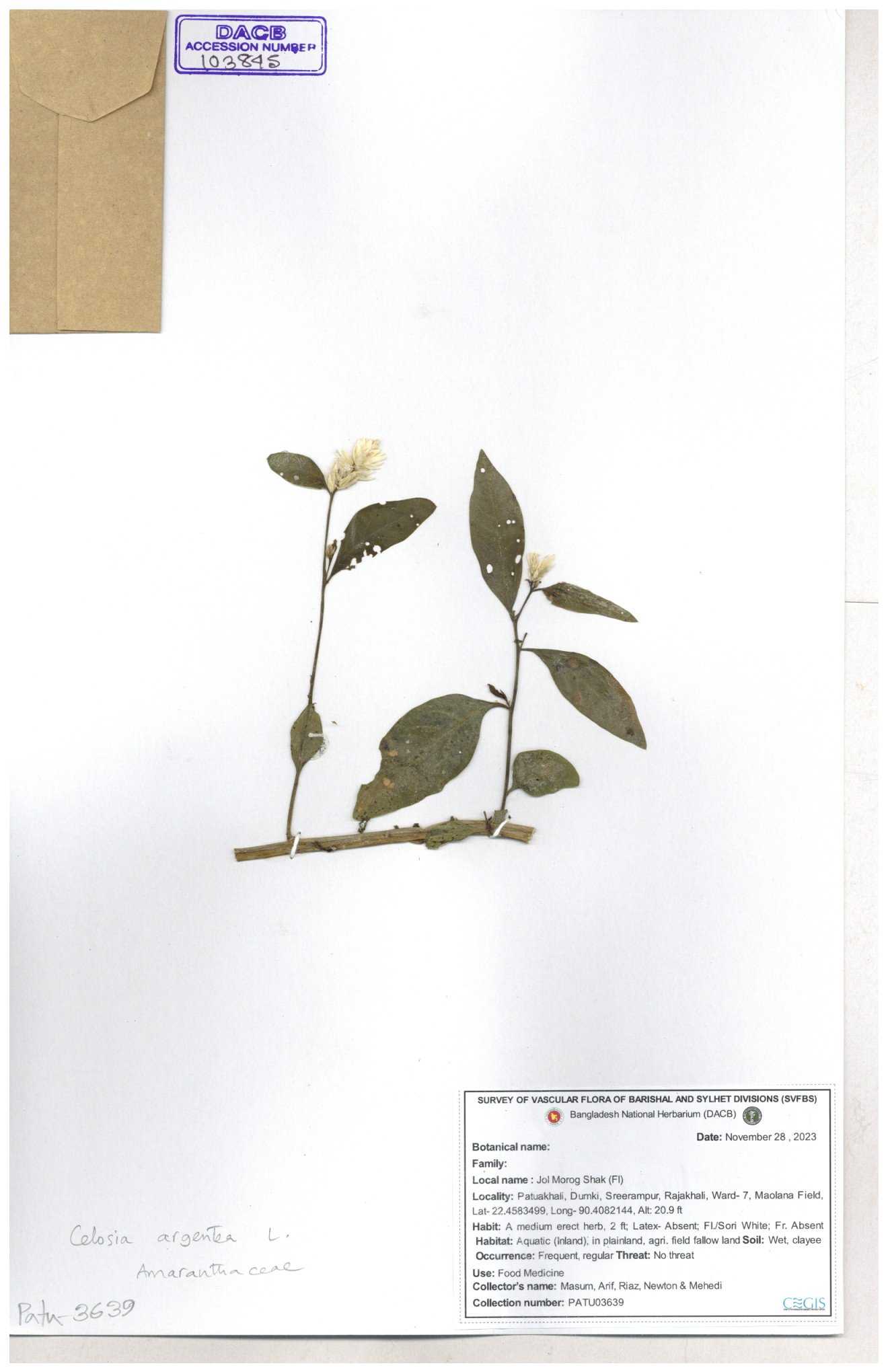 | 66421 | Amaranthaceae | Celosia argentea L. | Mominur Rahman, Al amin & Kamrul Islam | JCR-915 09-10-2016 |