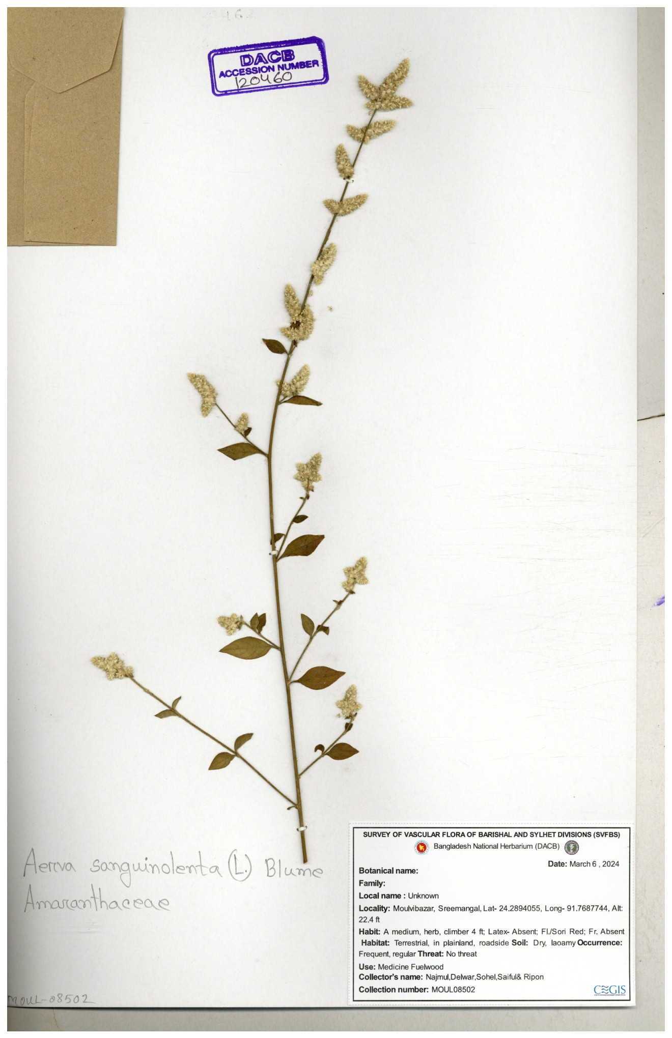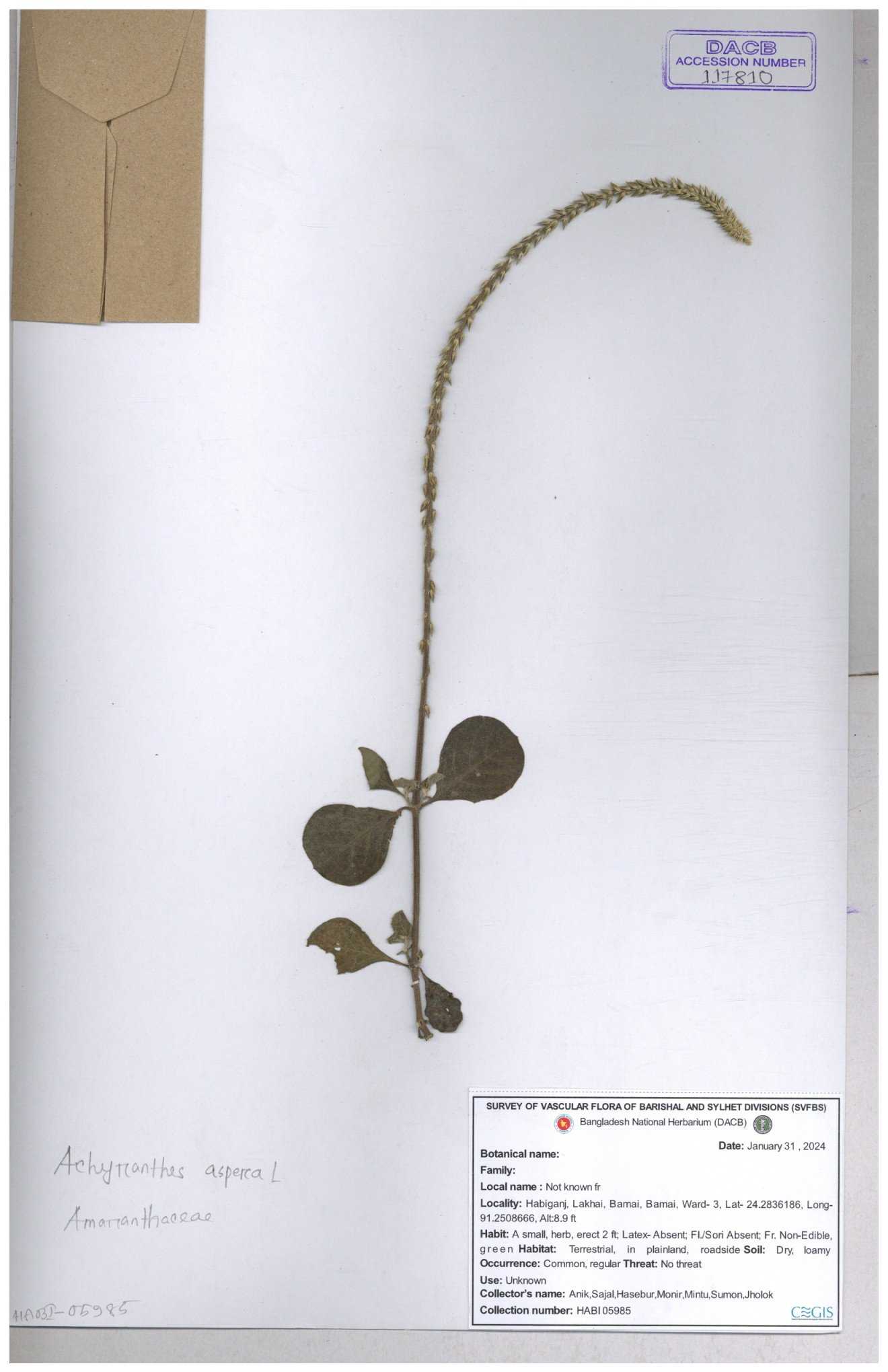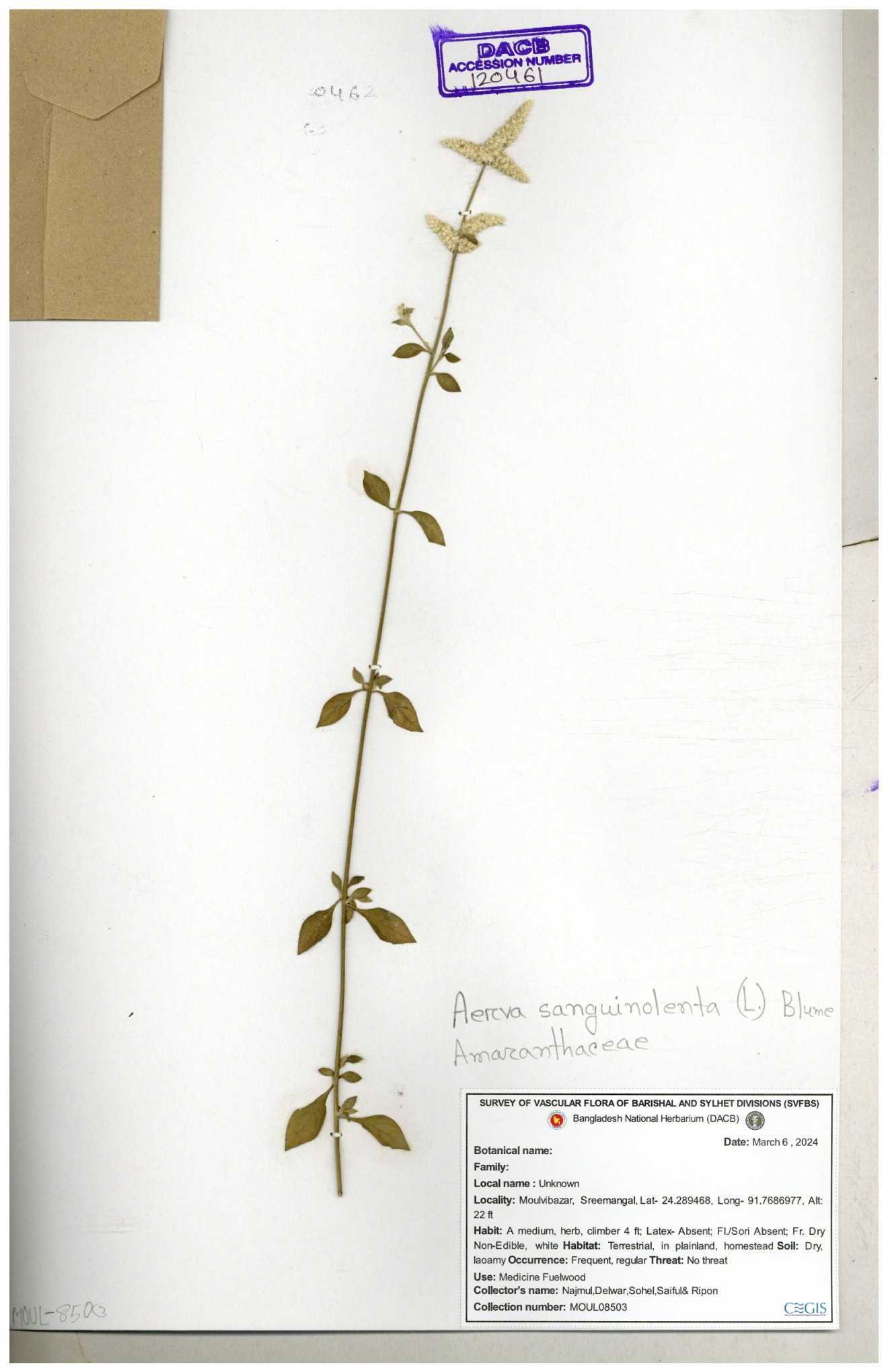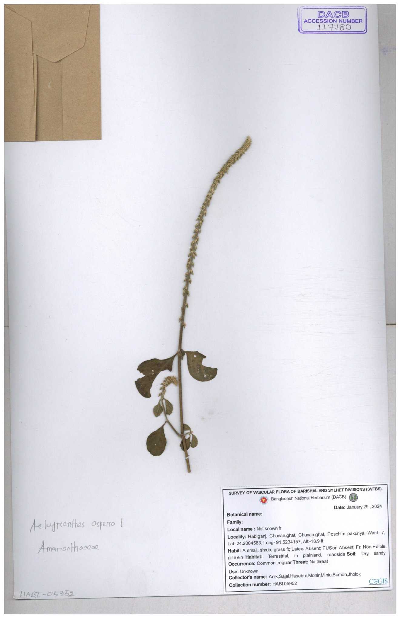 | 65829 | Amaranthaceae | Amaranthus viridis L. | Unknown | Naimur Rahman | NR-1439 02-12-2020 |