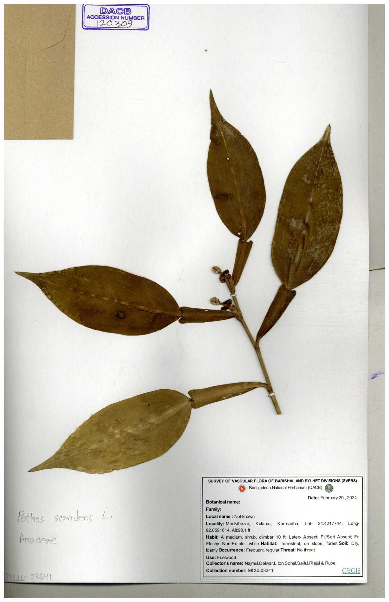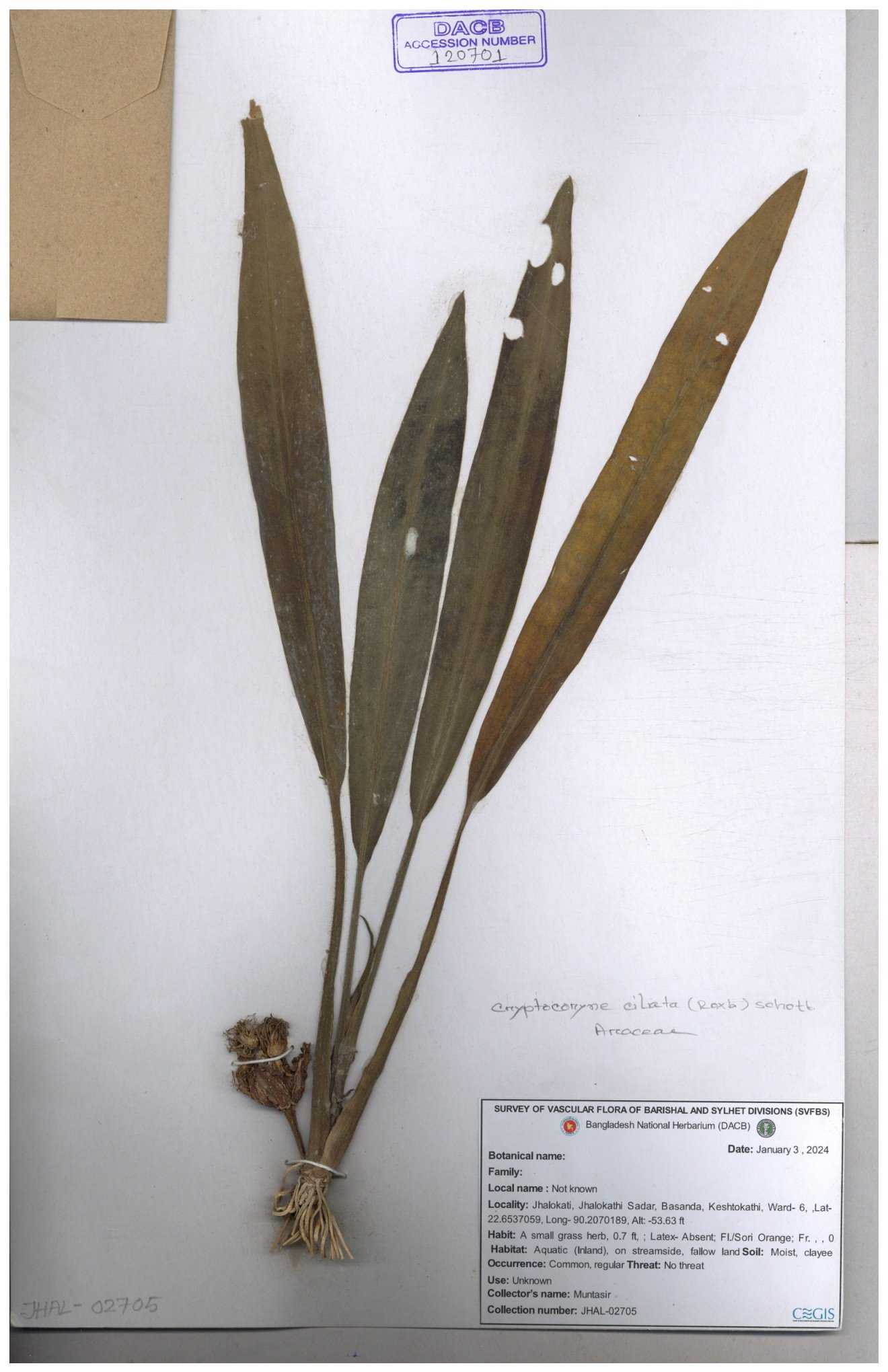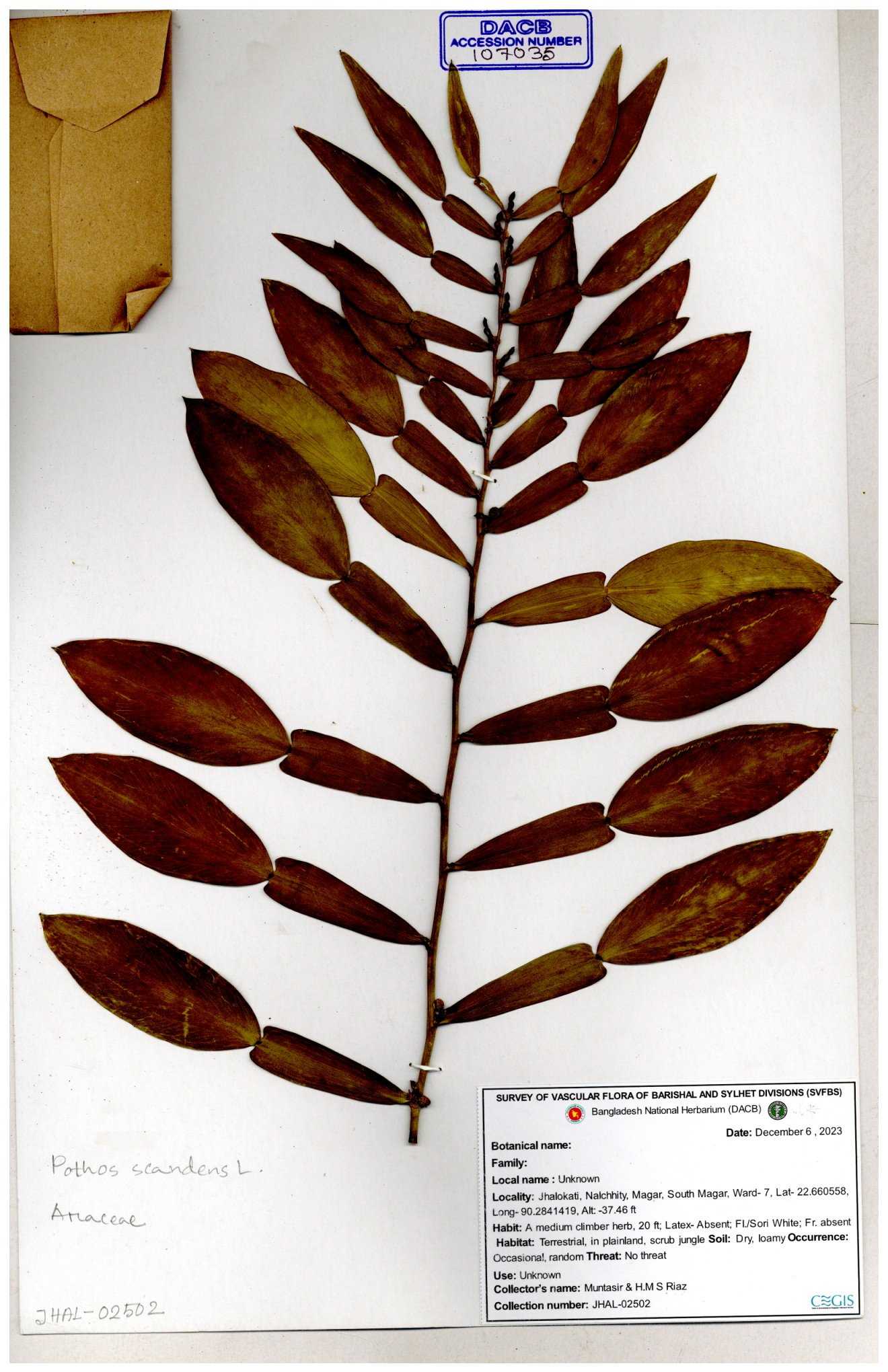 | 4328 | Araceae | Alocasia acuminata Schott | Huq & Rahman | H. 3752 17-01-1978 |