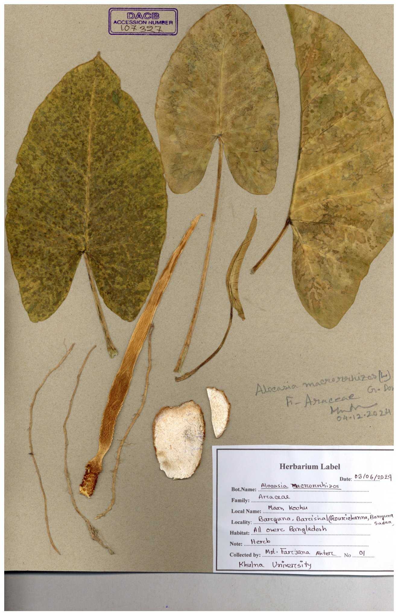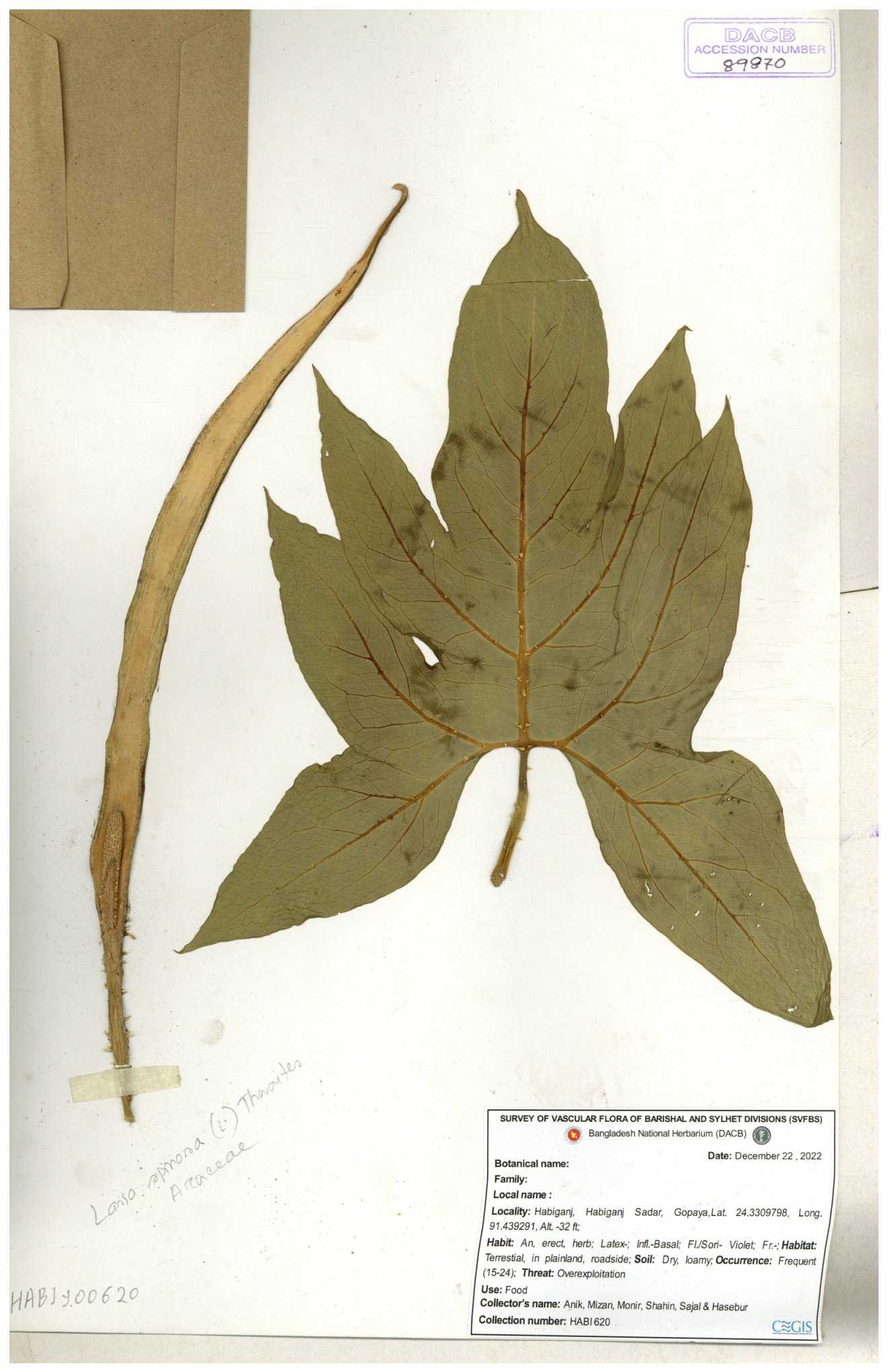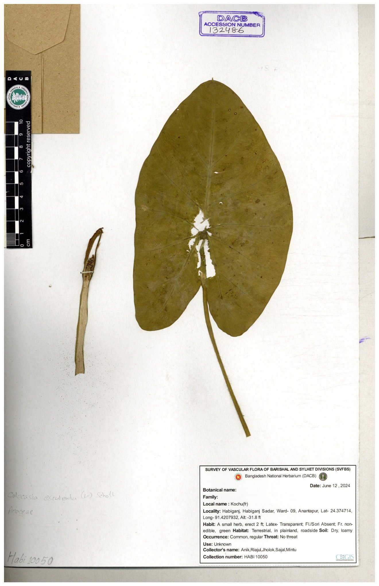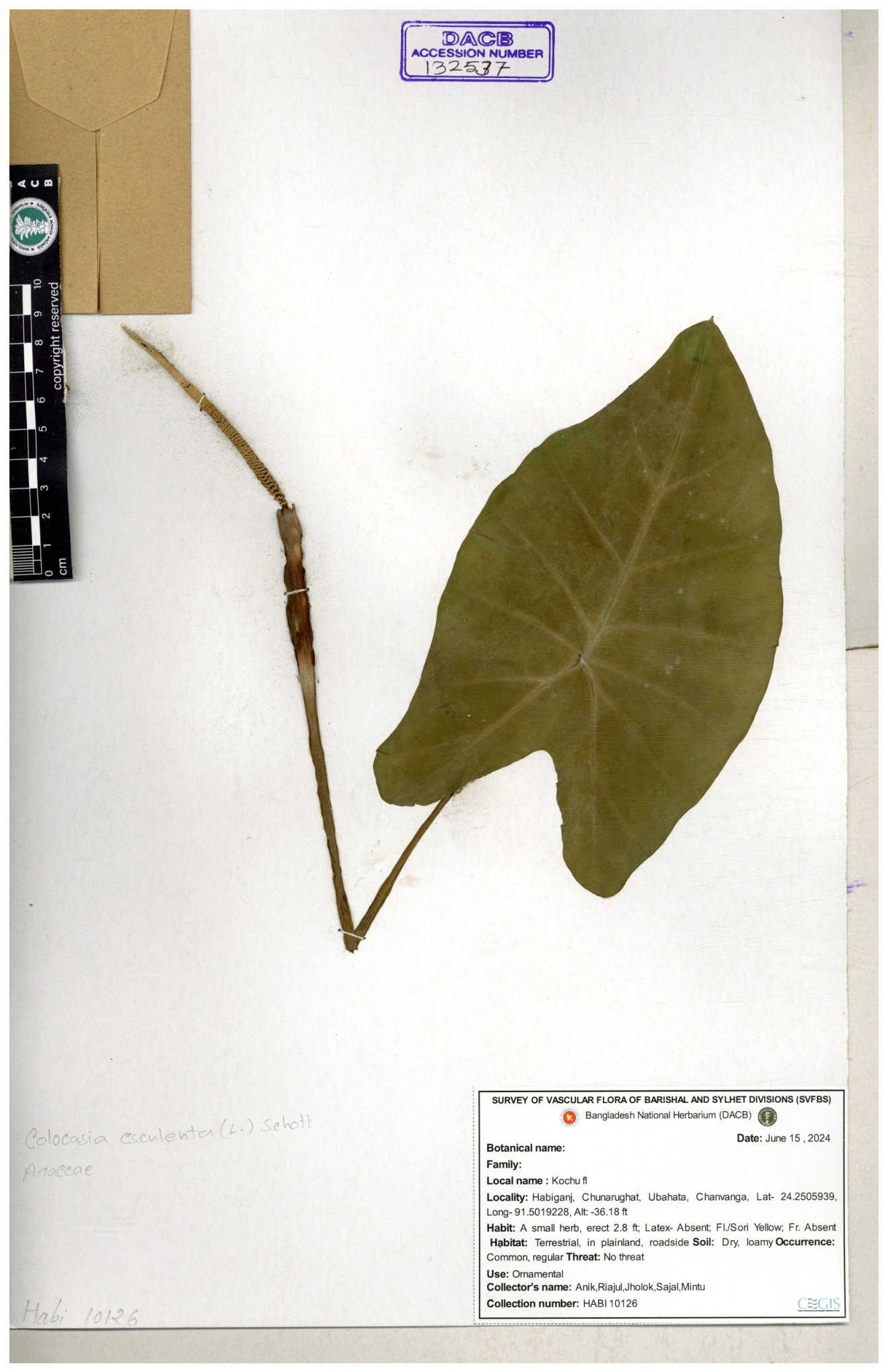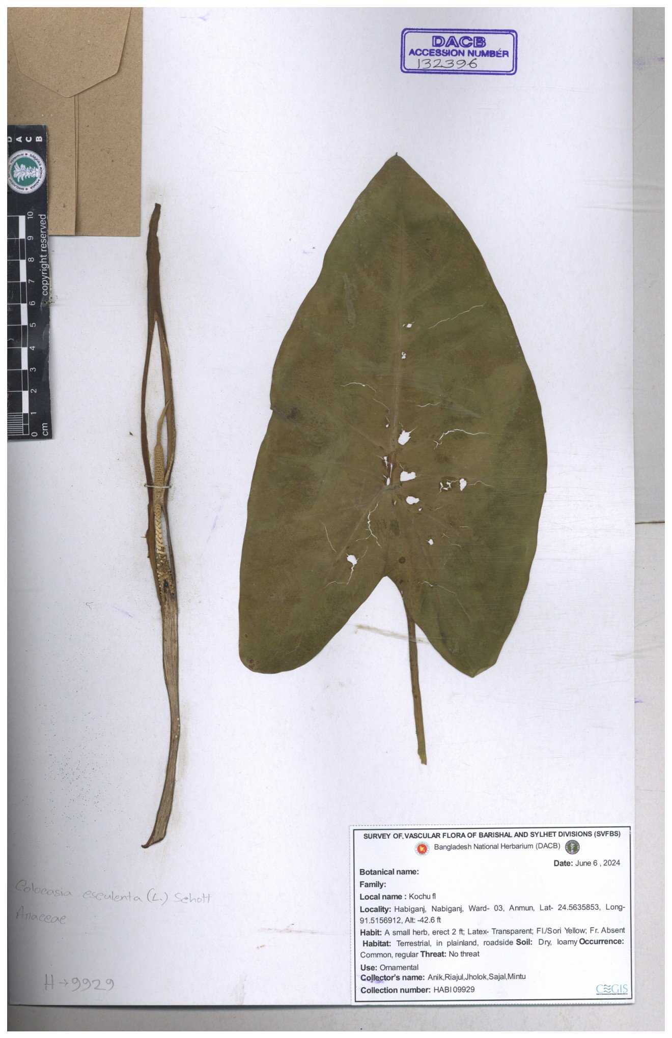 | 4351 | Araceae | Alocasia acuminata Schott | Huq, Rahman & Mia | H. 2033 06-11-1976 |