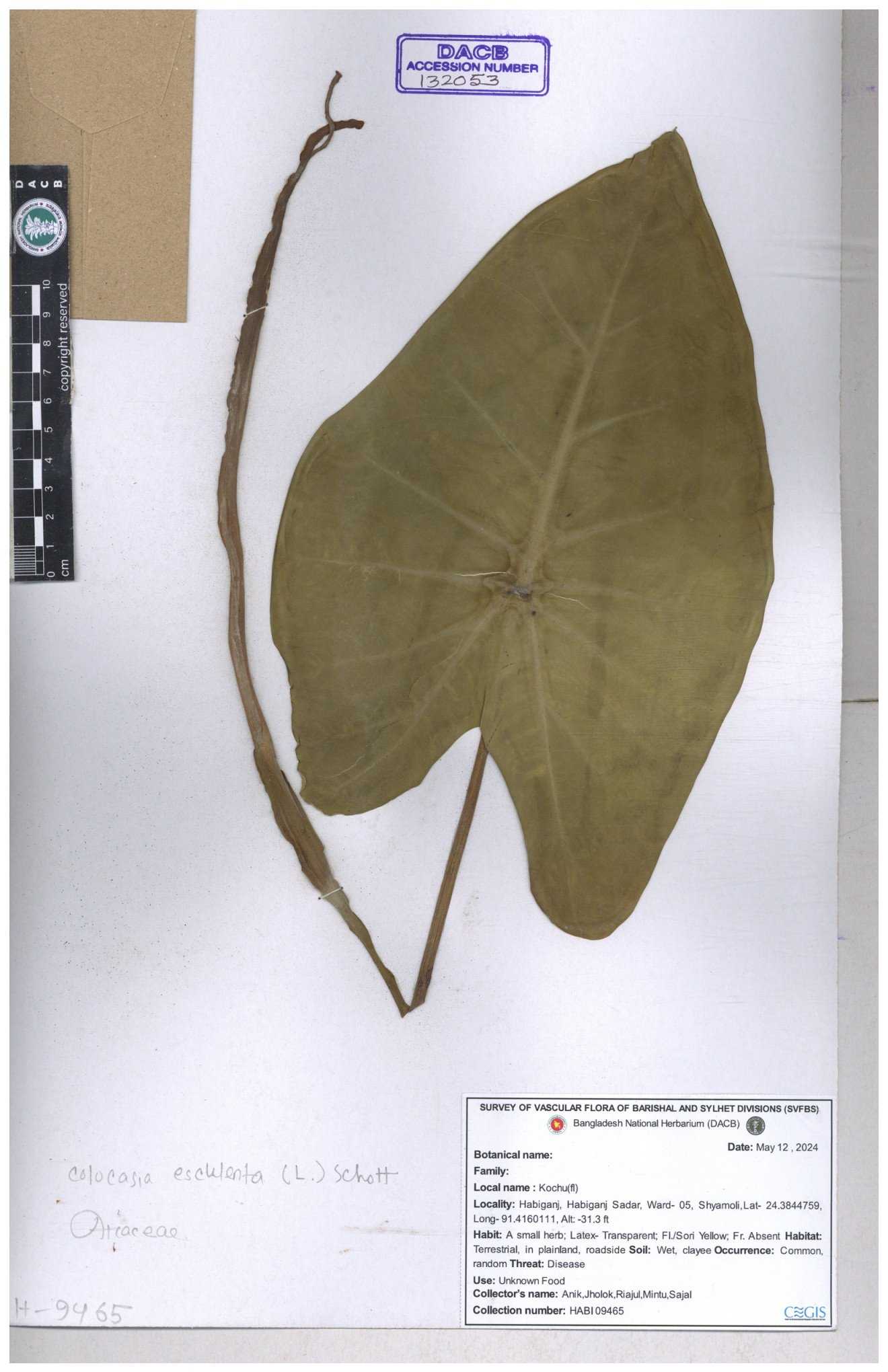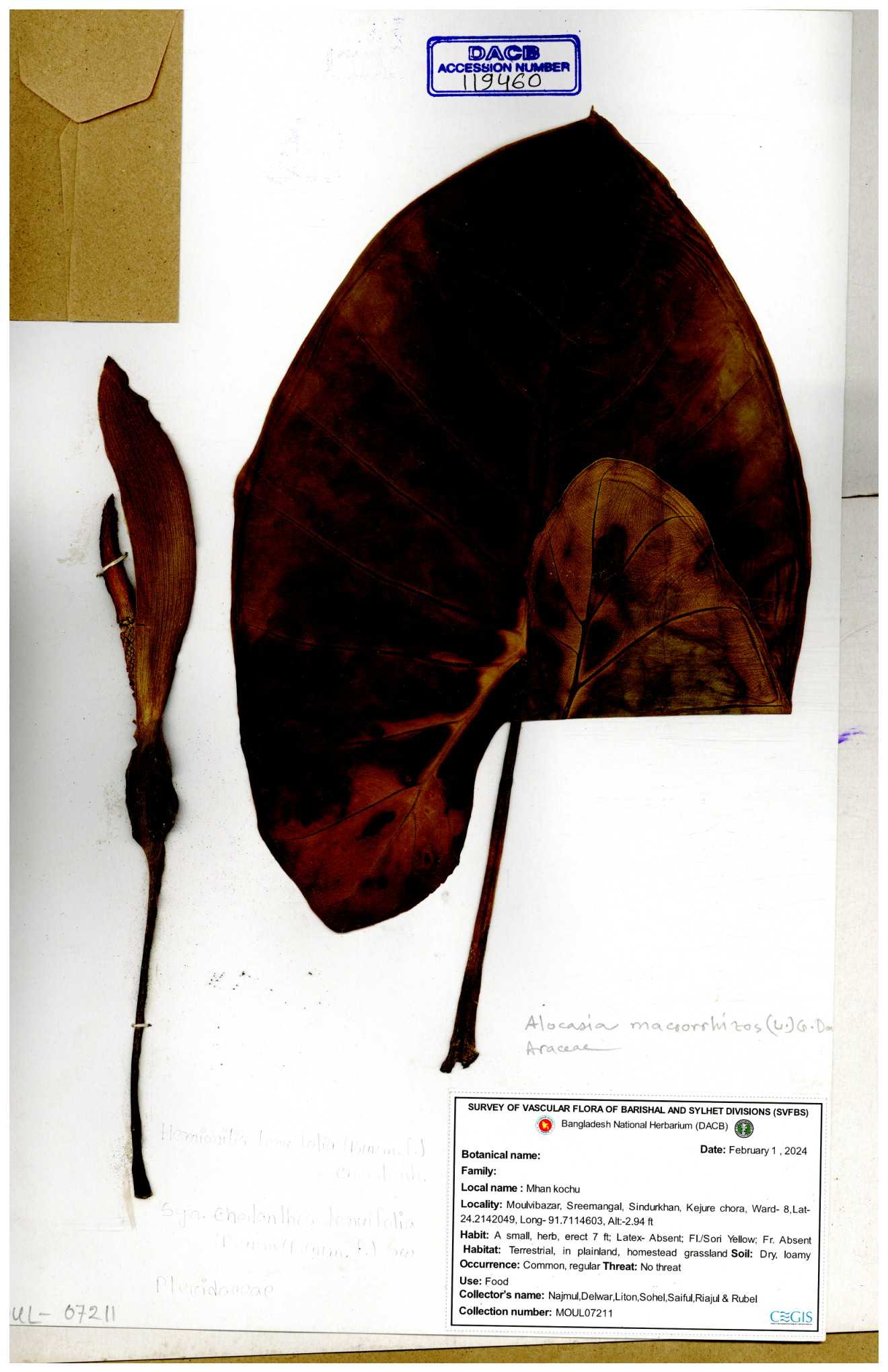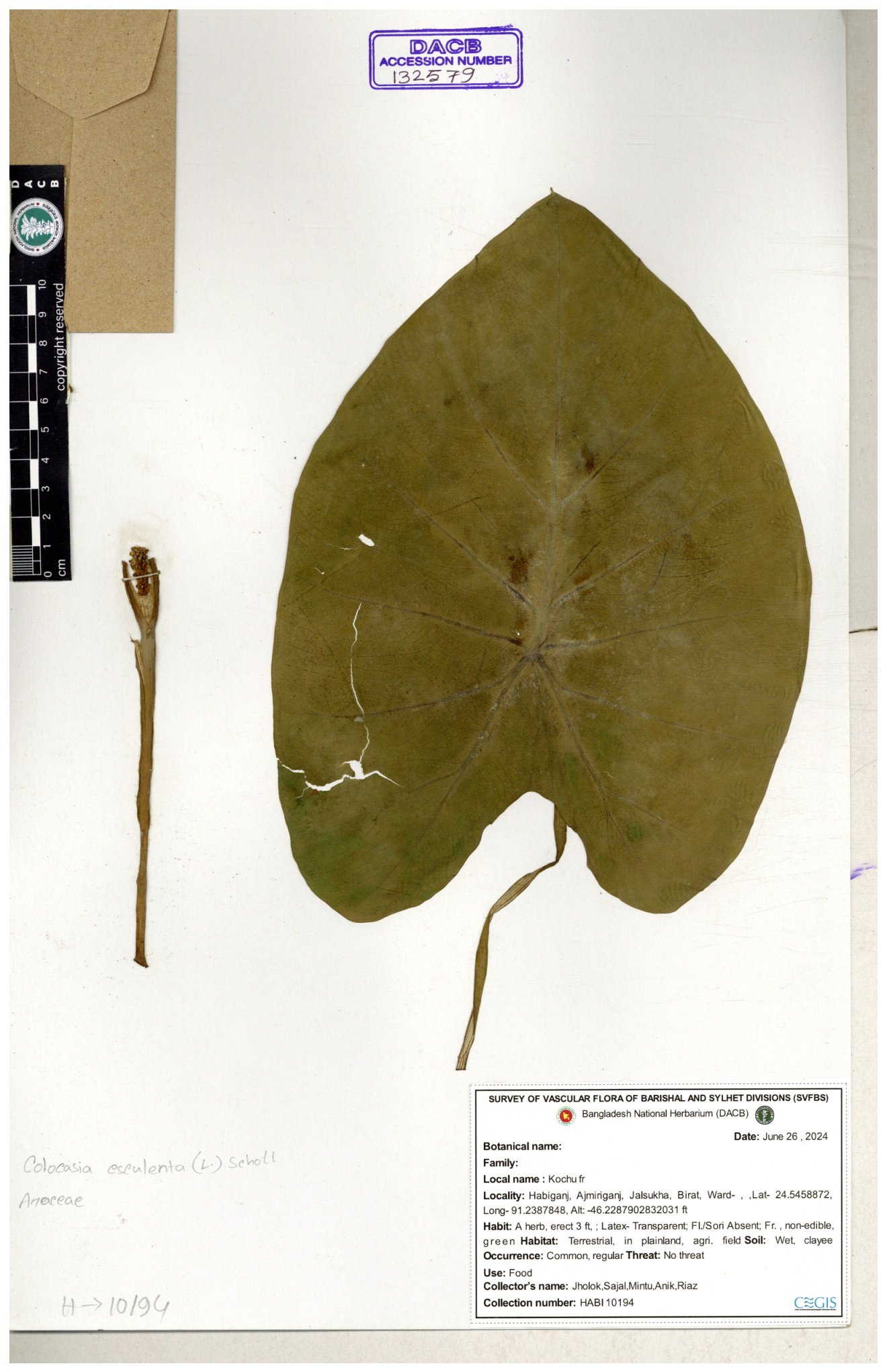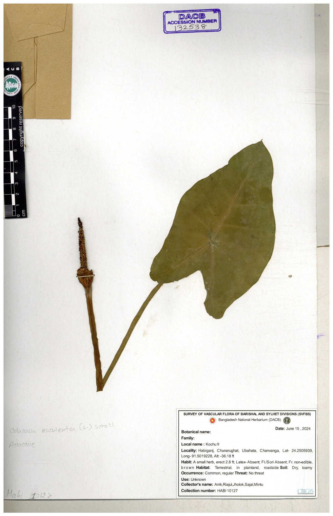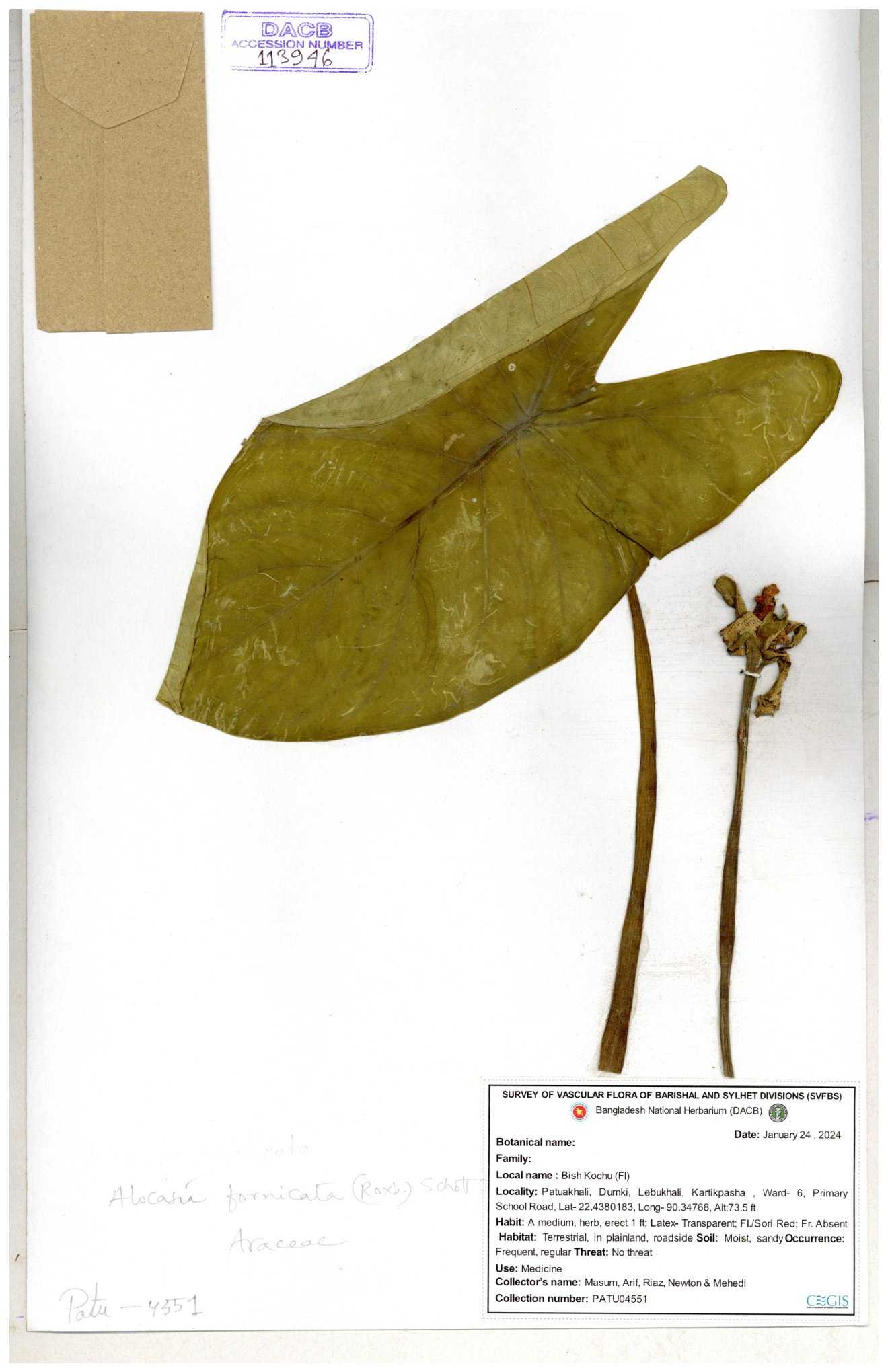 | 4351 | Araceae | Alocasia acuminata Schott | Huq, Rahman & Mia | H. 2033 06-11-1976 |