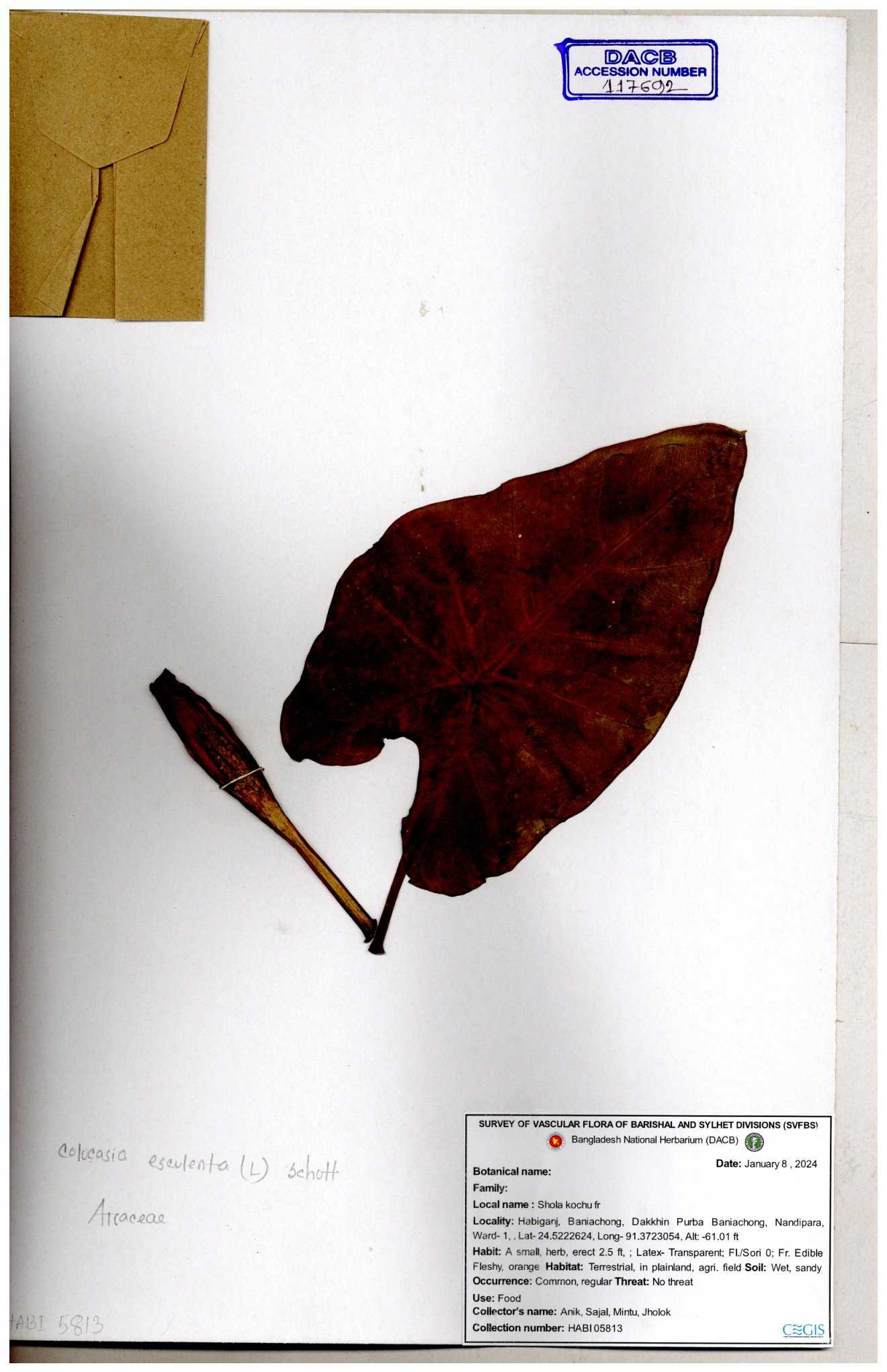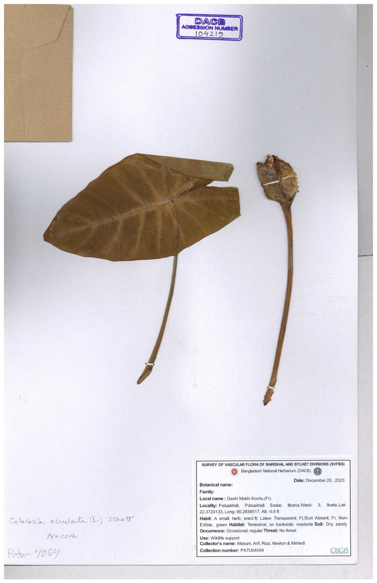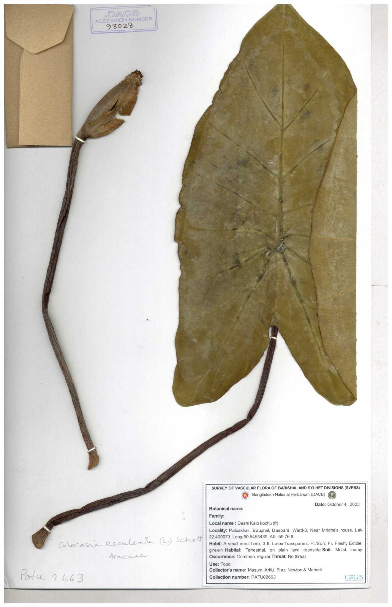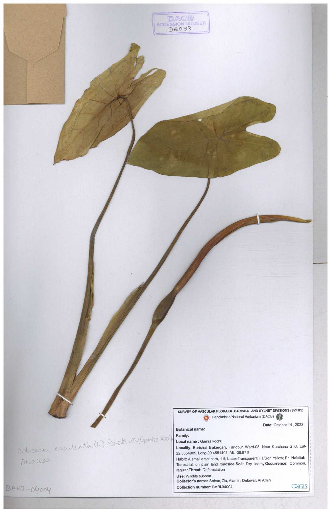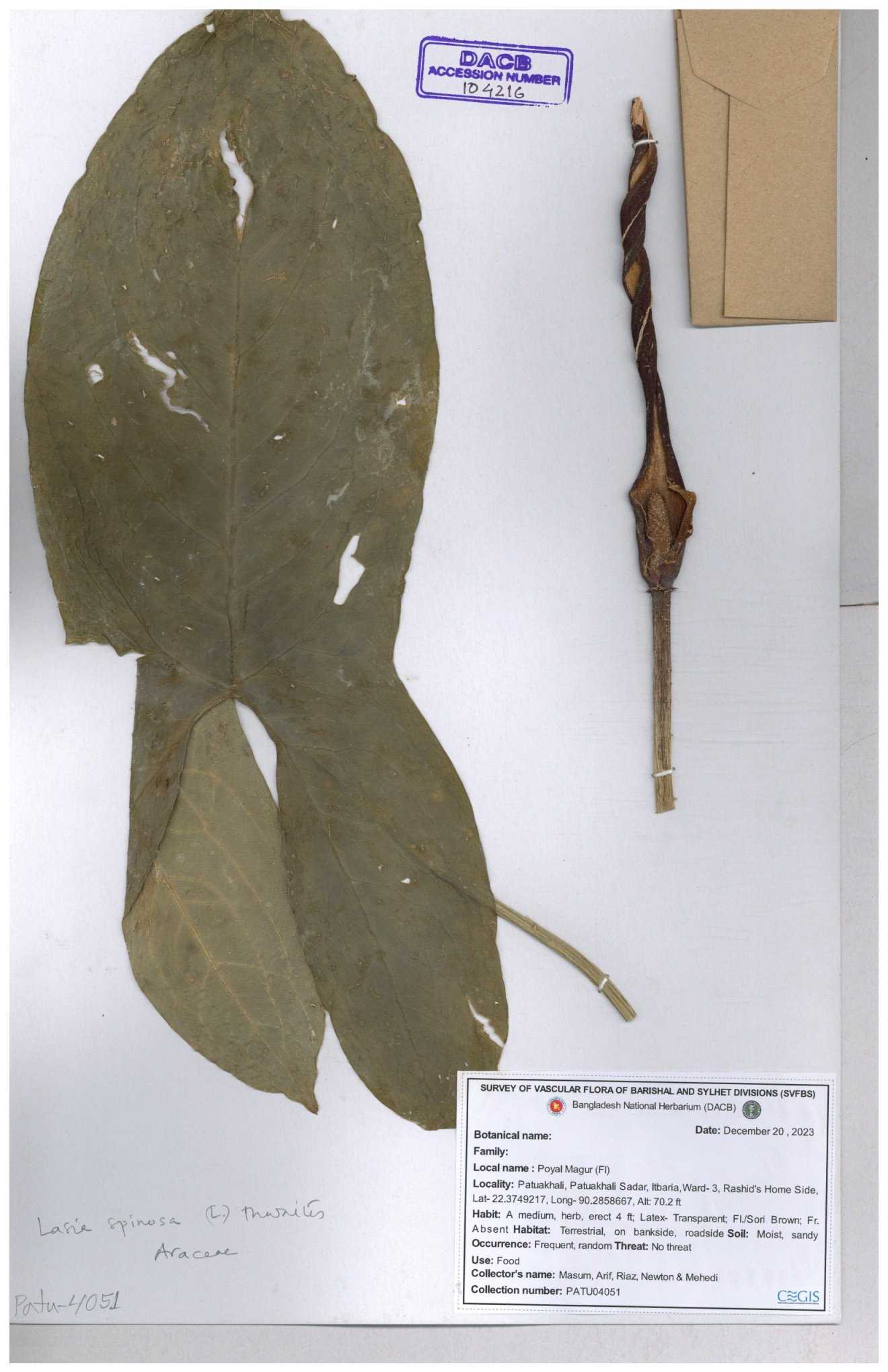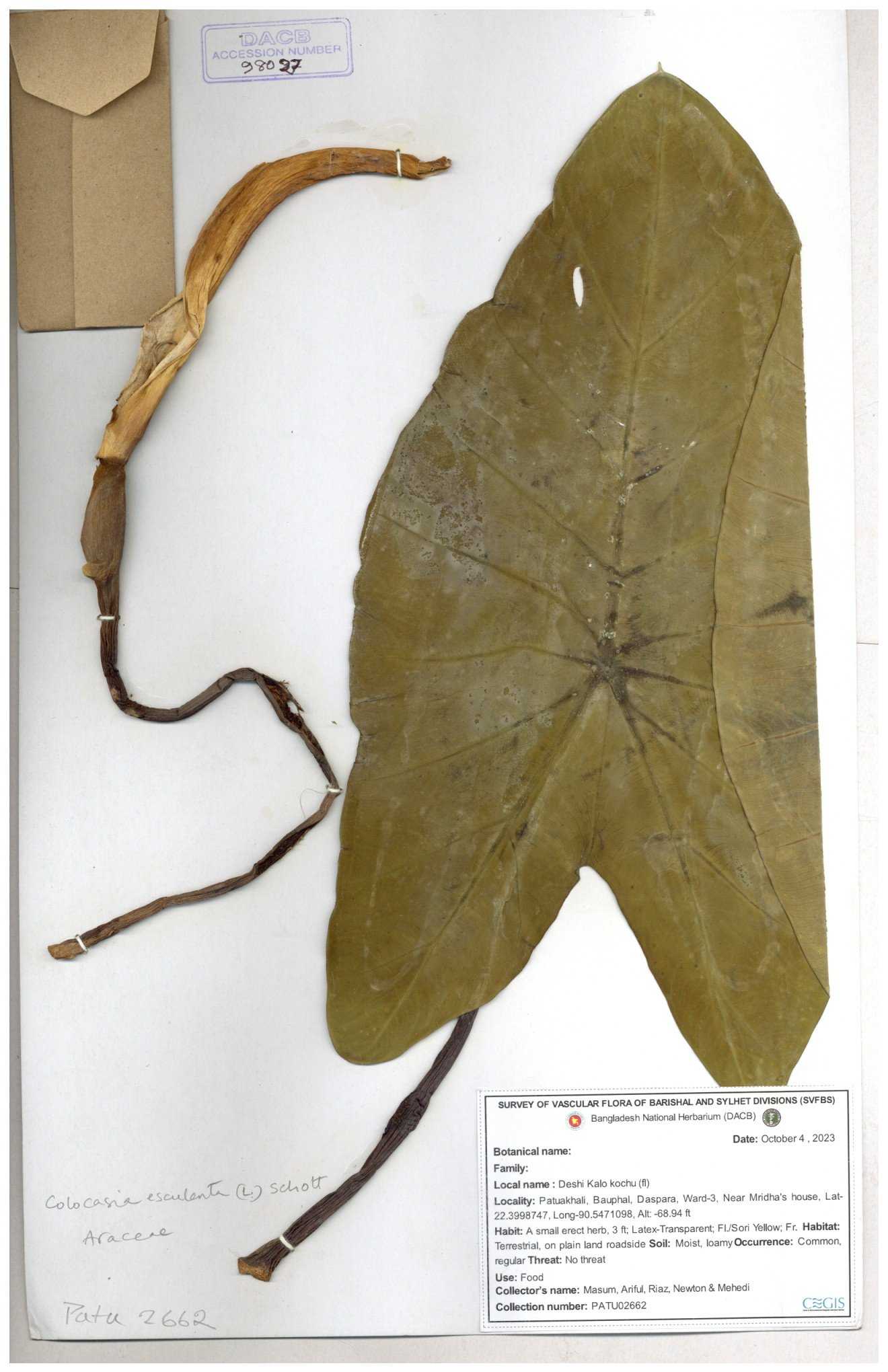 | 4351 | Araceae | Alocasia acuminata Schott | Huq, Rahman & Mia | H. 2033 06-11-1976 |
