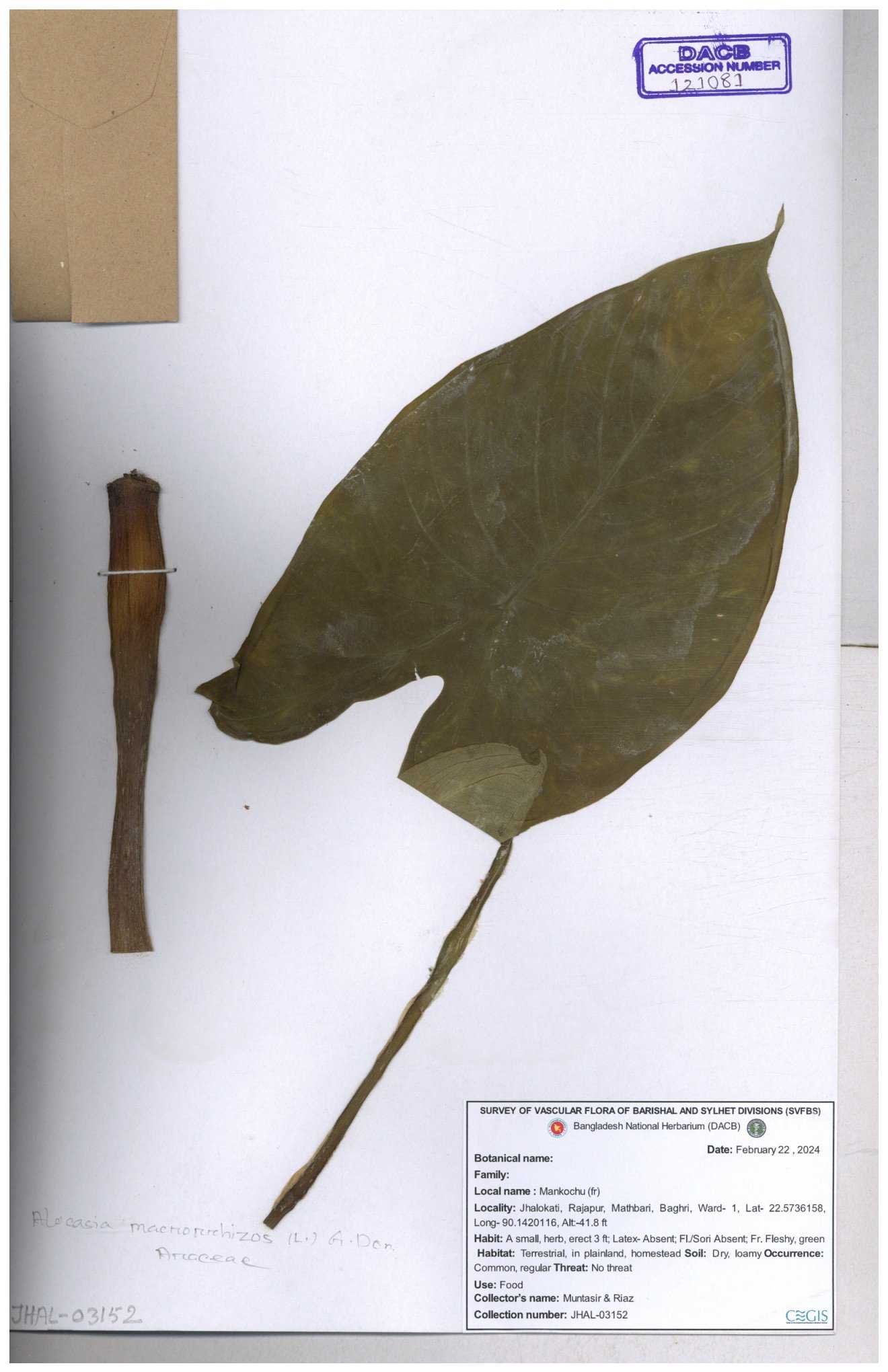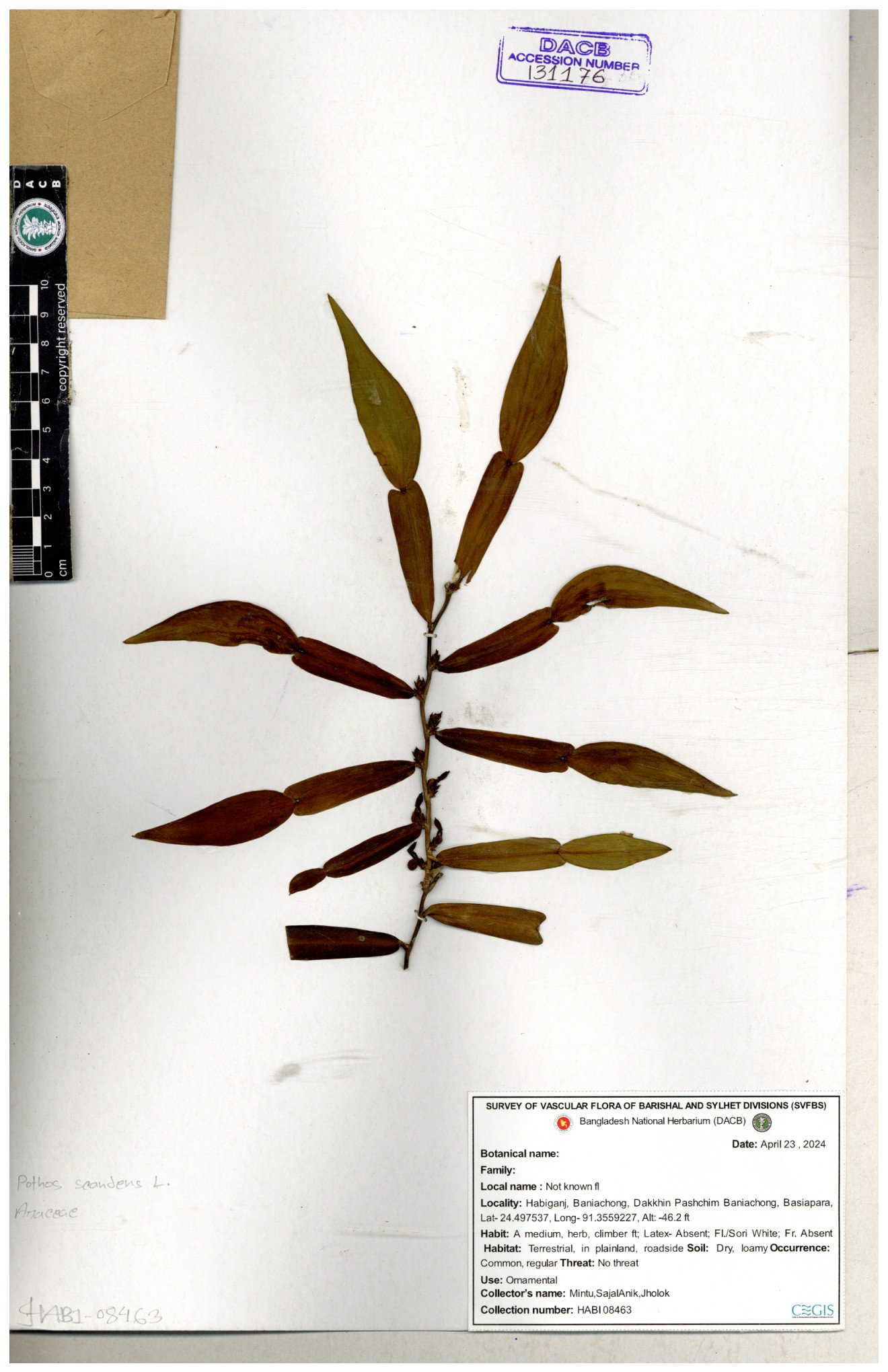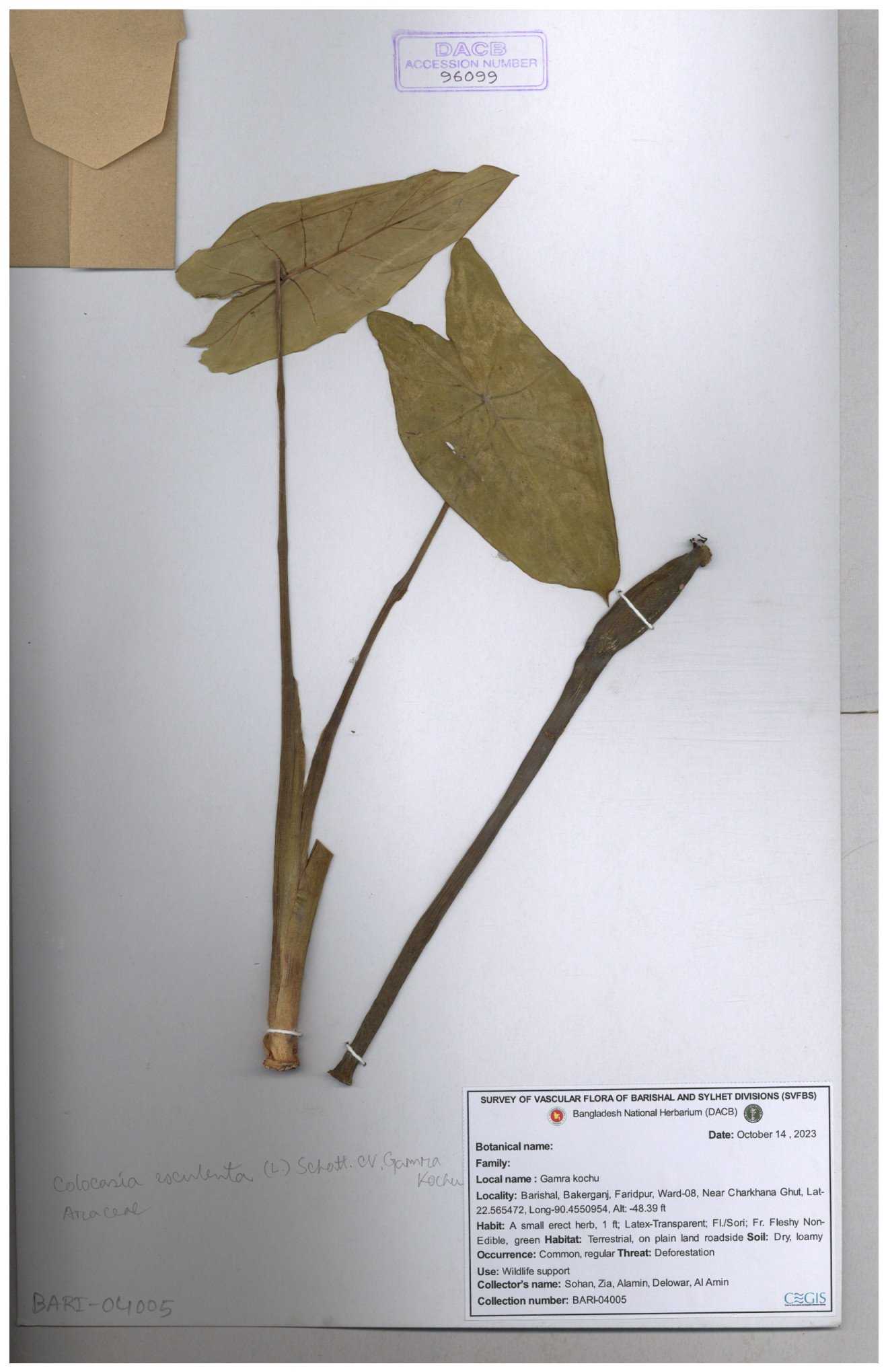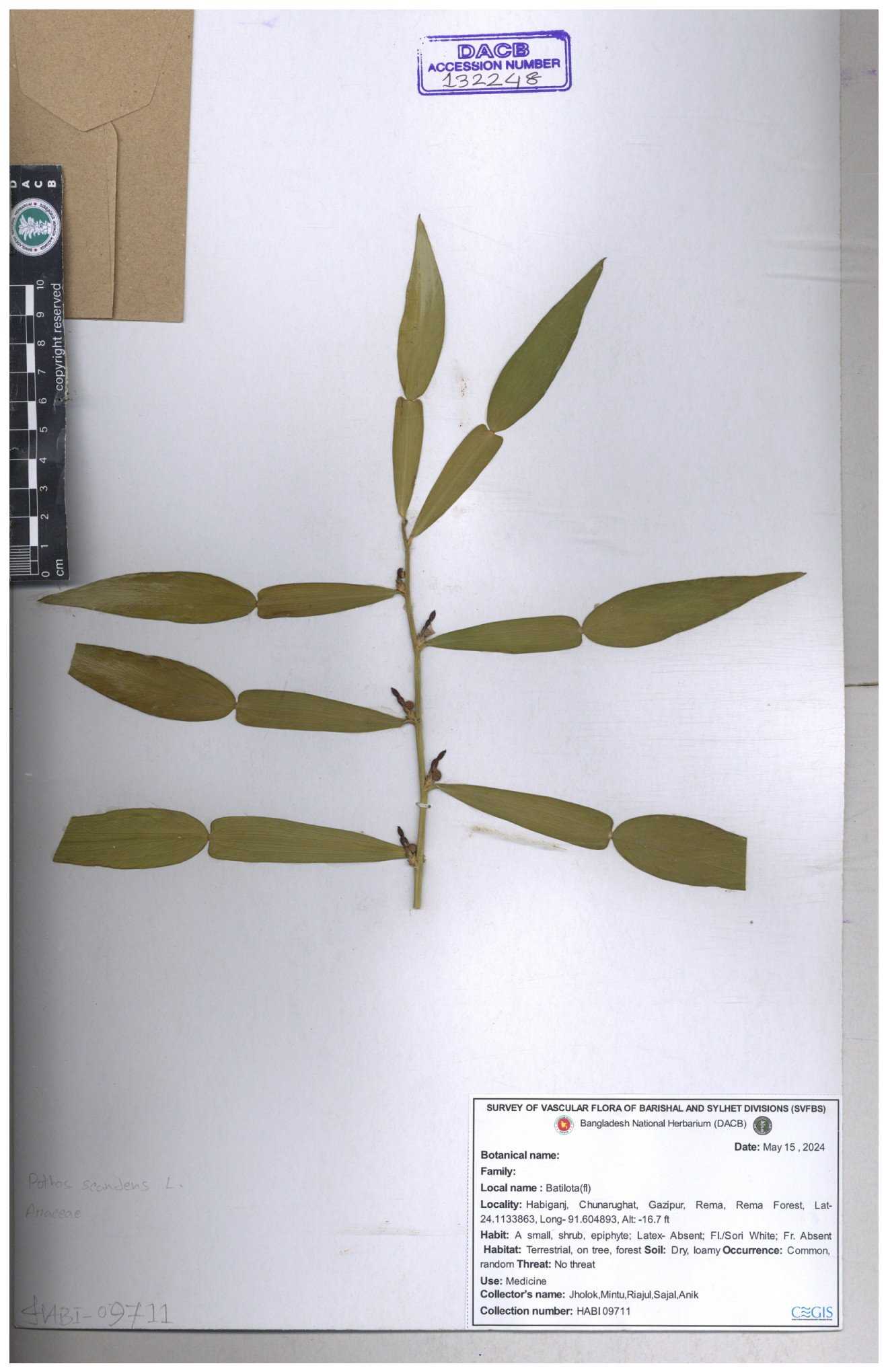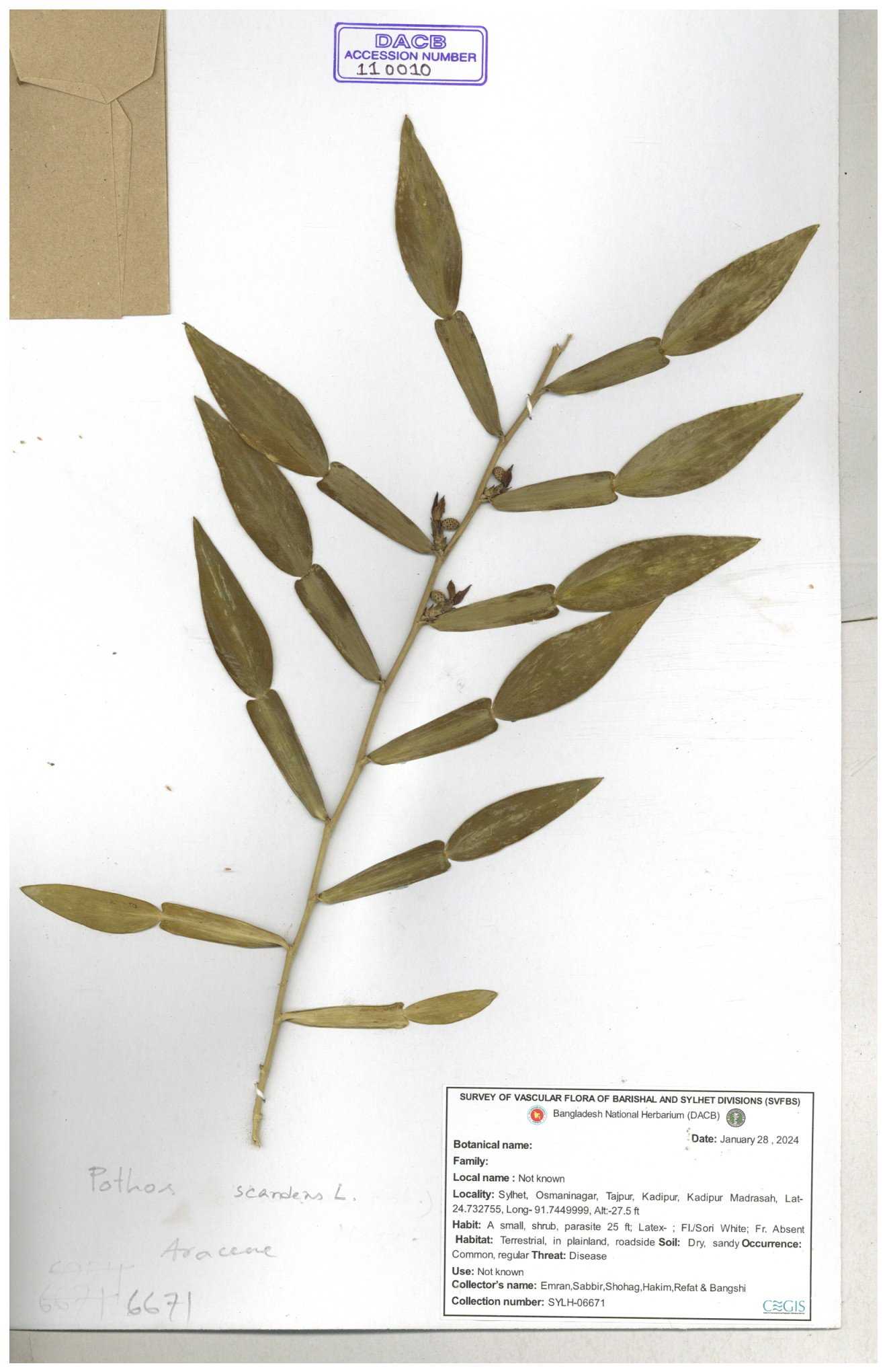 | 4351 | Araceae | Alocasia acuminata Schott | Huq, Rahman & Mia | H. 2033 06-11-1976 |
