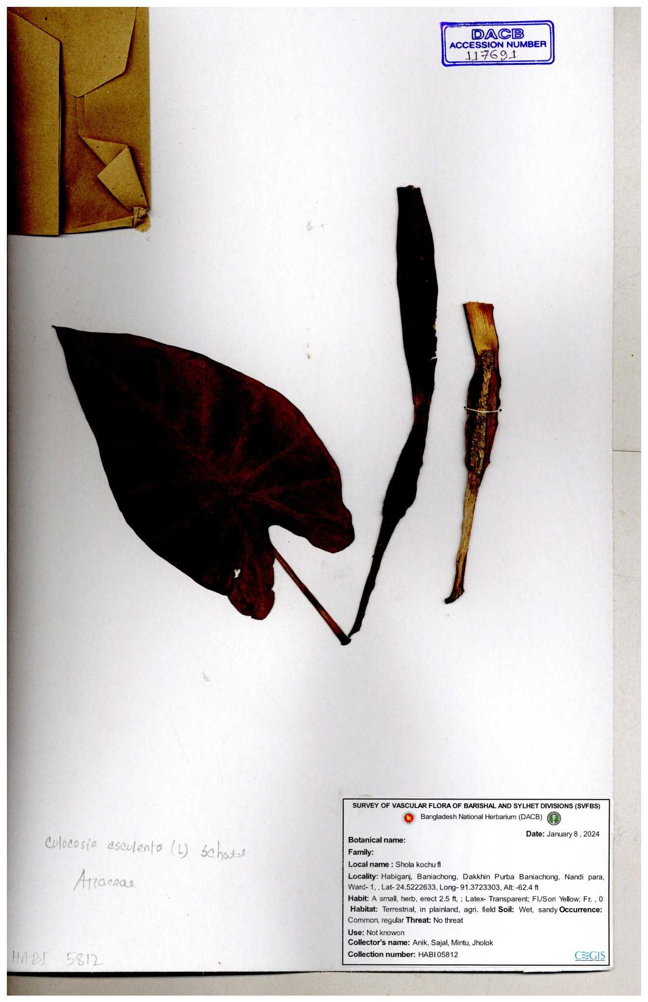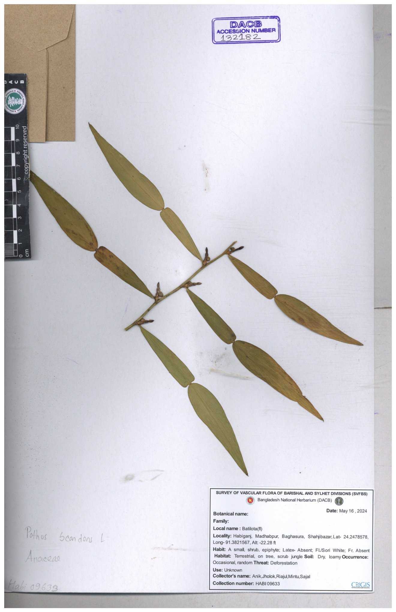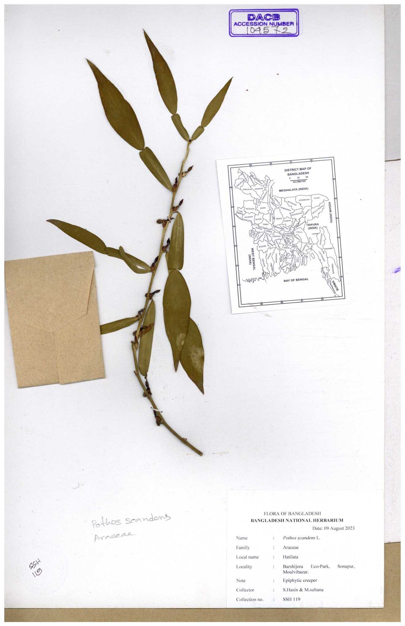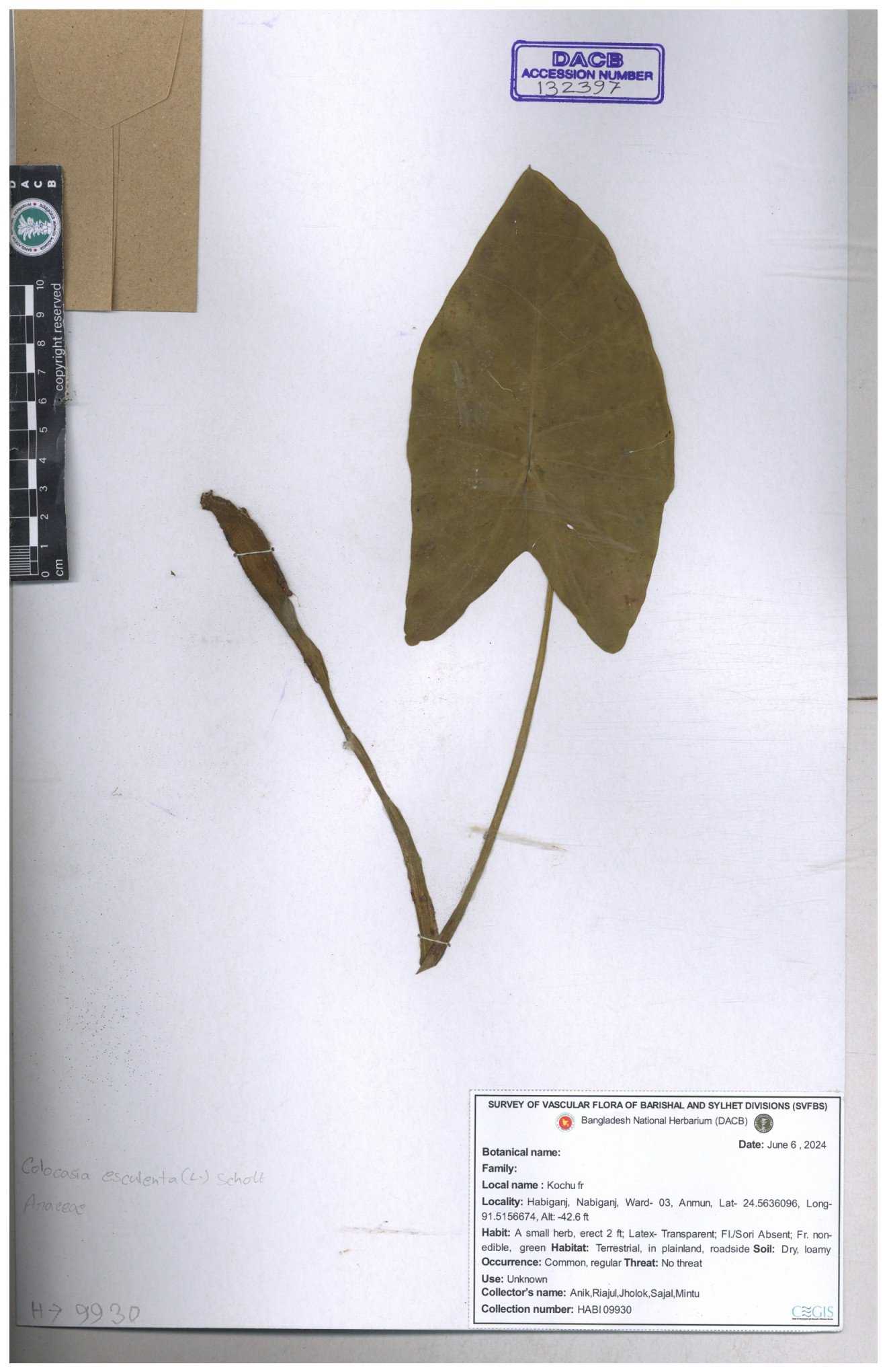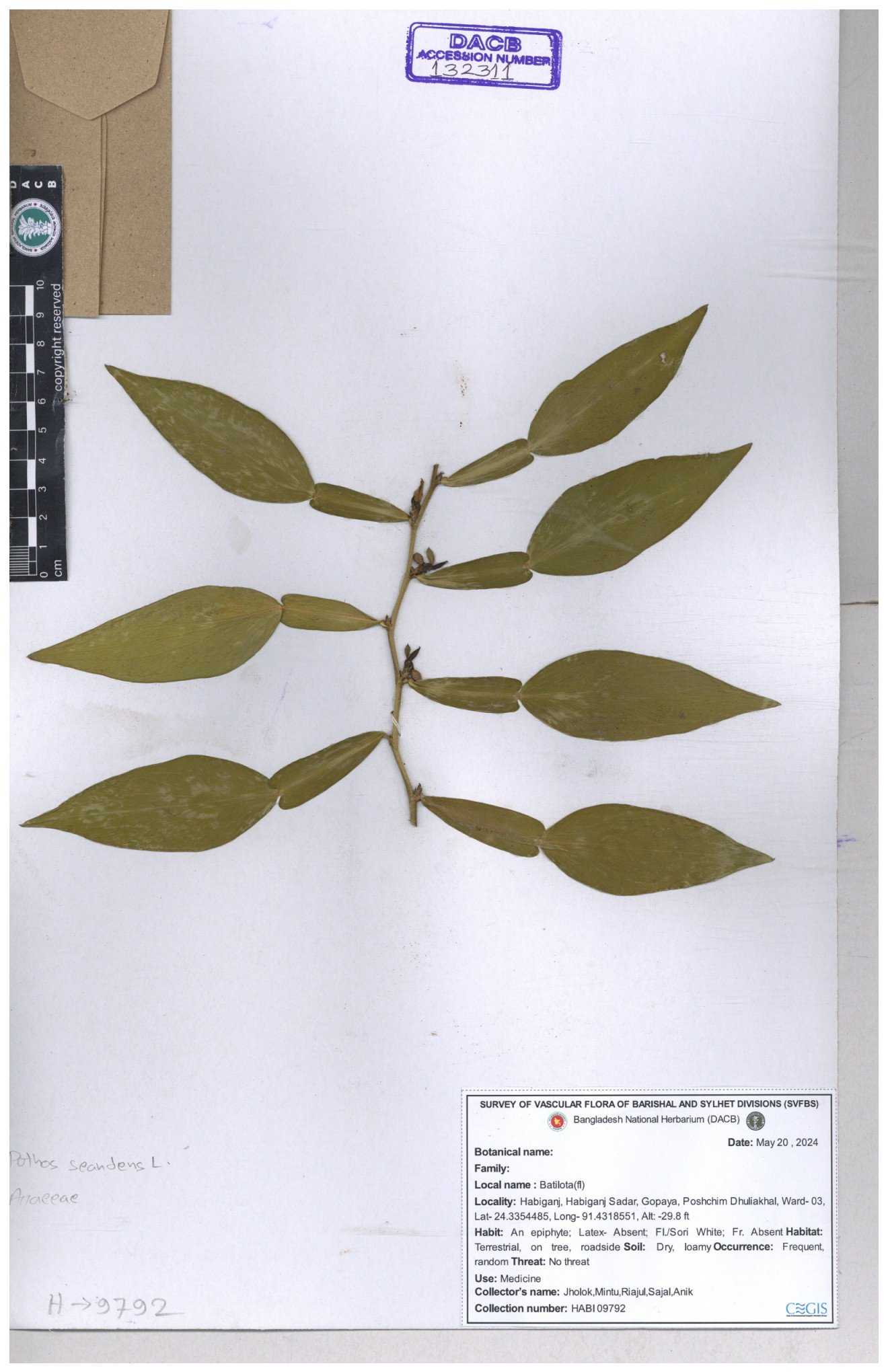 | 4351 | Araceae | Alocasia acuminata Schott | Huq, Rahman & Mia | H. 2033 06-11-1976 |