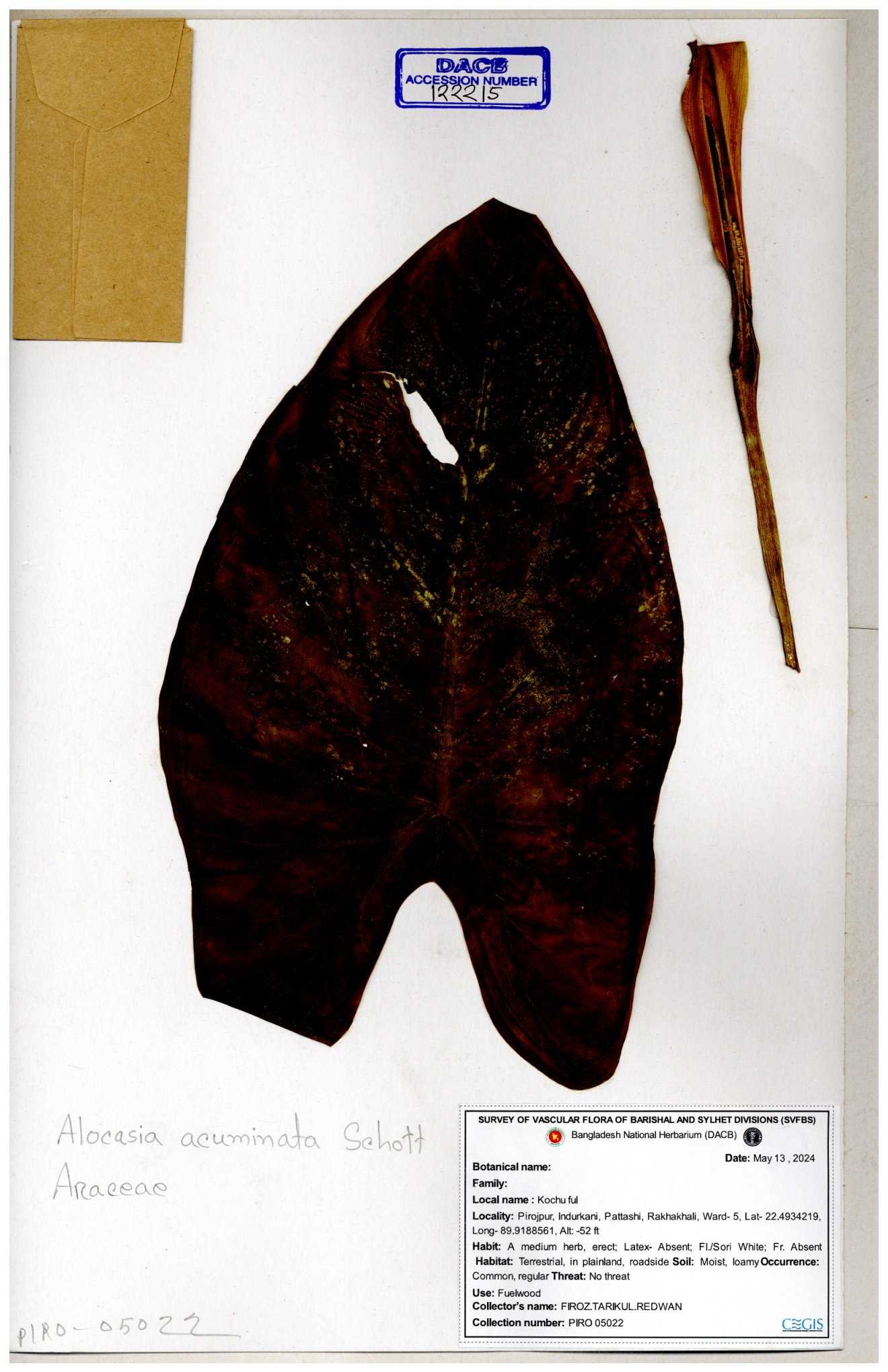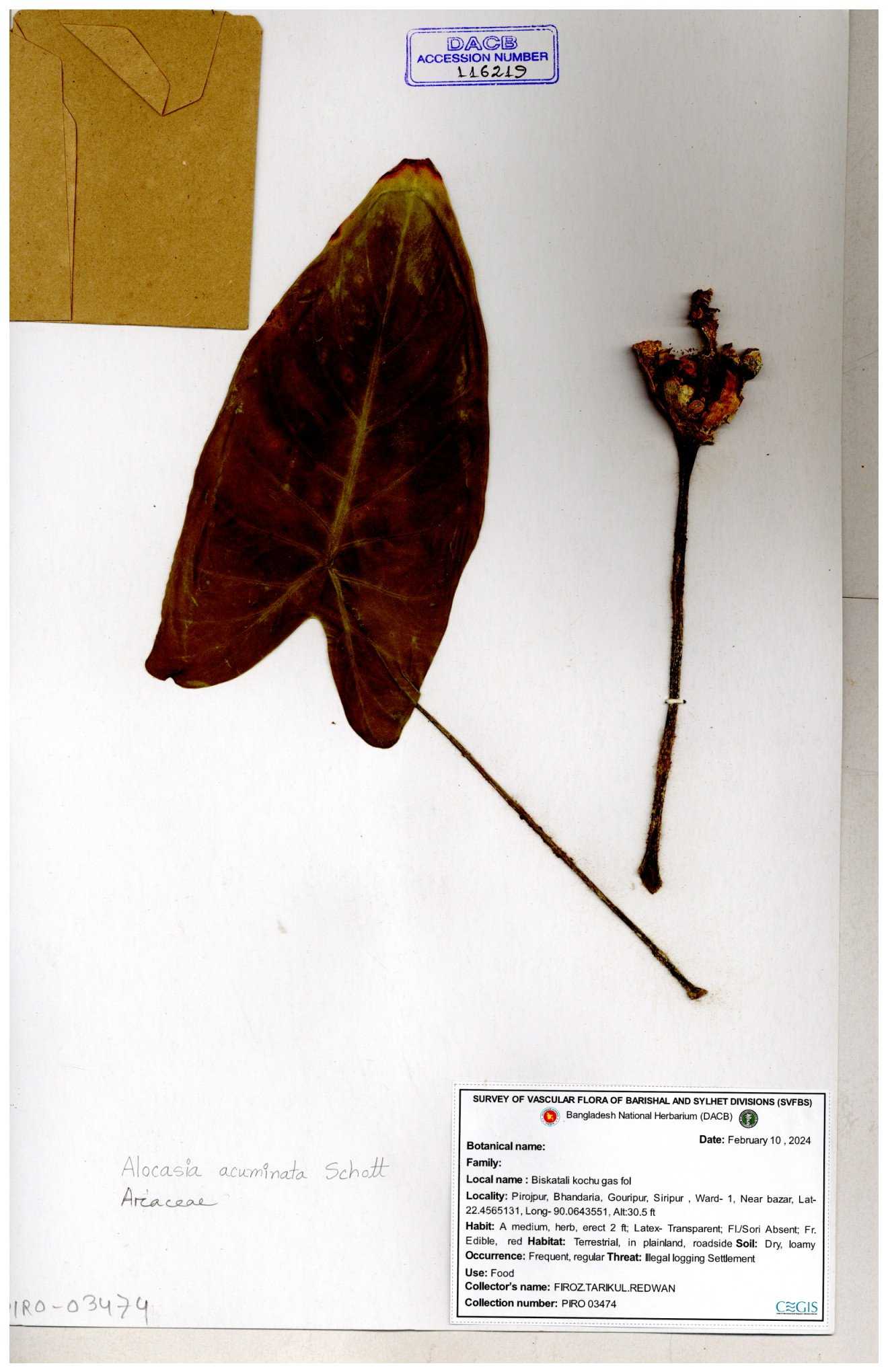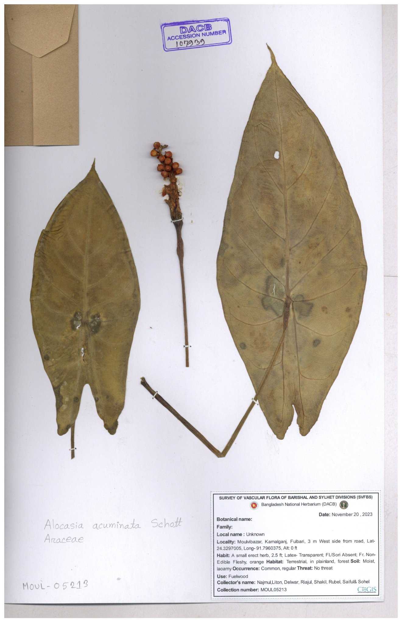 | 62441 | Araceae | Alocasia acuminata Schott | Niyamul Kabir, Zahid Hasan, Mehedi Hasan | NK-4871 30-11--0001 |
