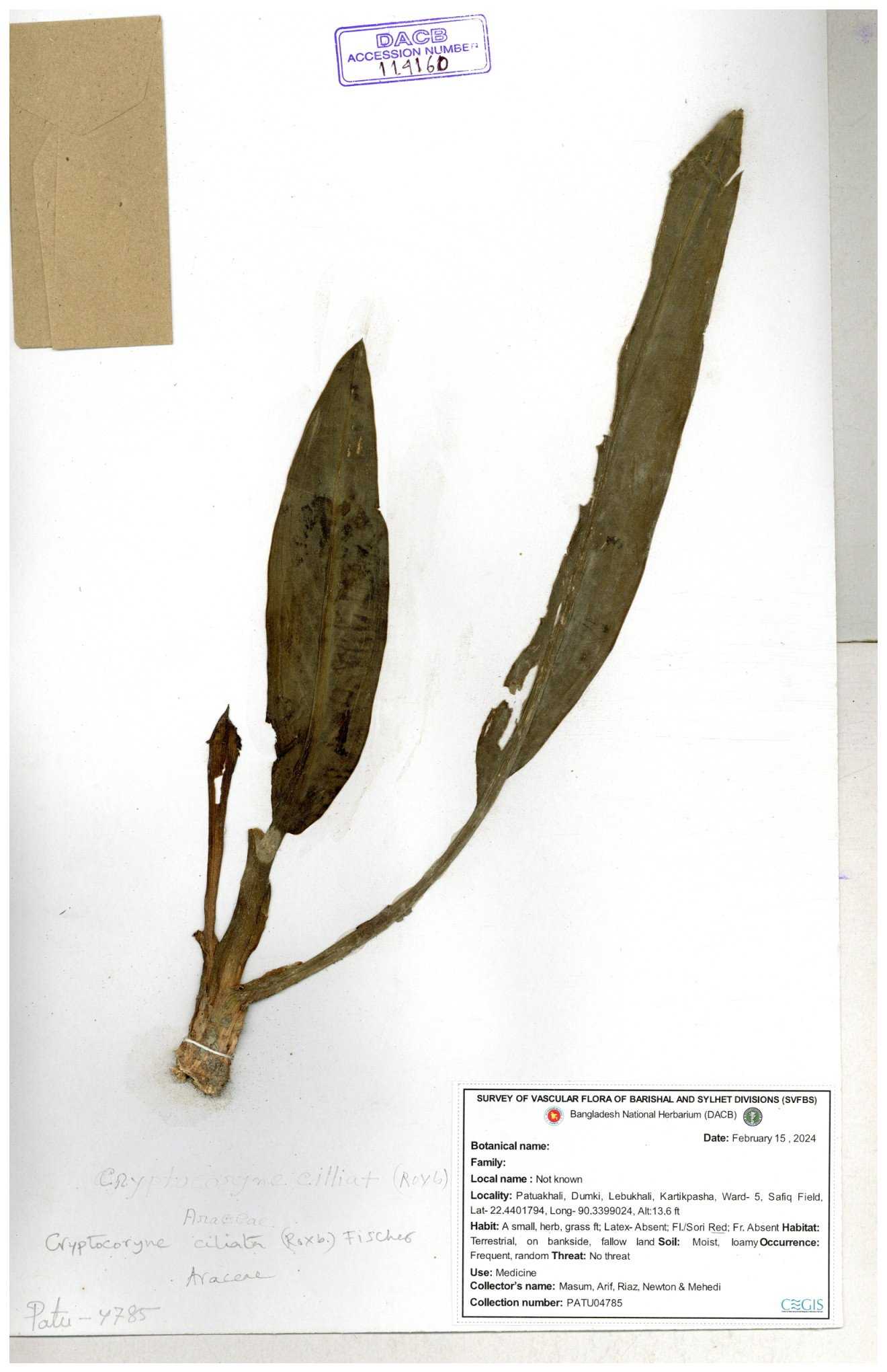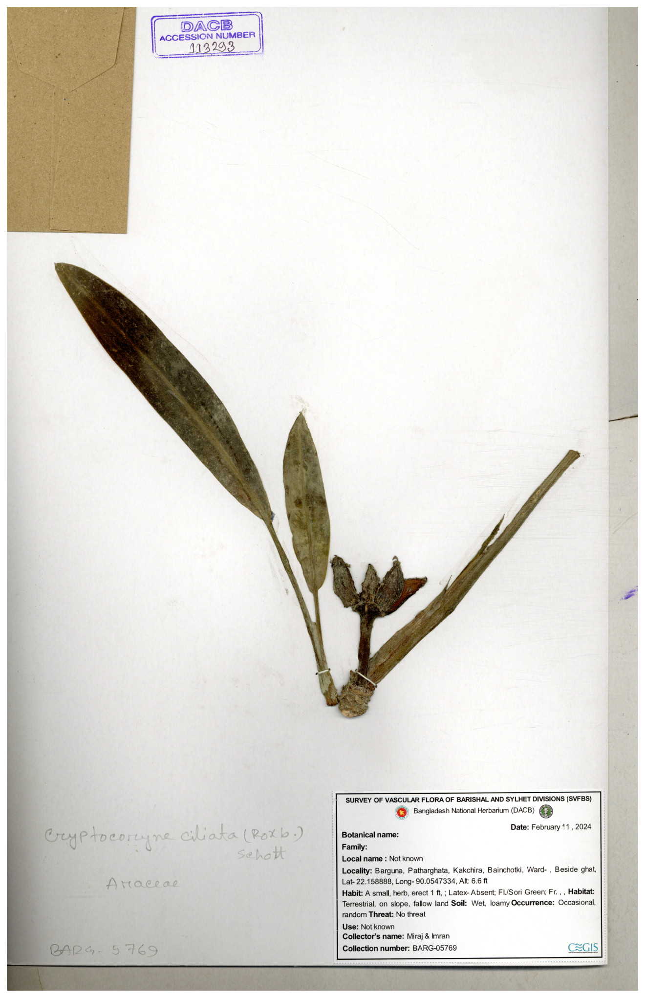 | 4436 | Araceae | Typhonium trilobatum (L.) Schott | Huq, Rahman & Mia | H. 1474 12-11-1975 |
