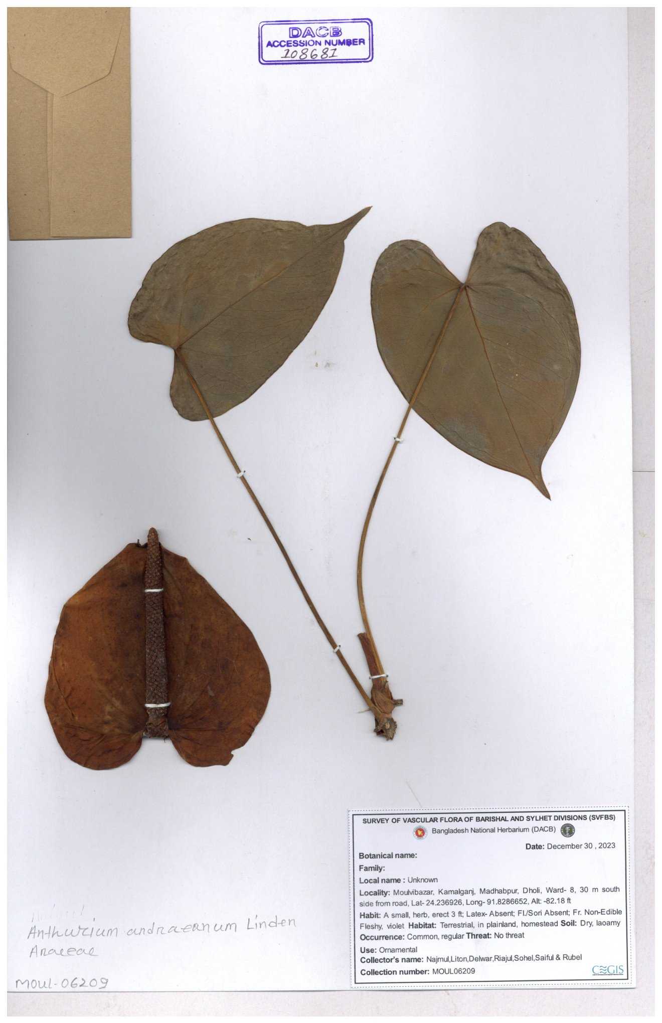 | 4334 | Araceae | Anthurium andraeanum Linden ex André | Mahbuba Halim | 804 06-03-1980 |