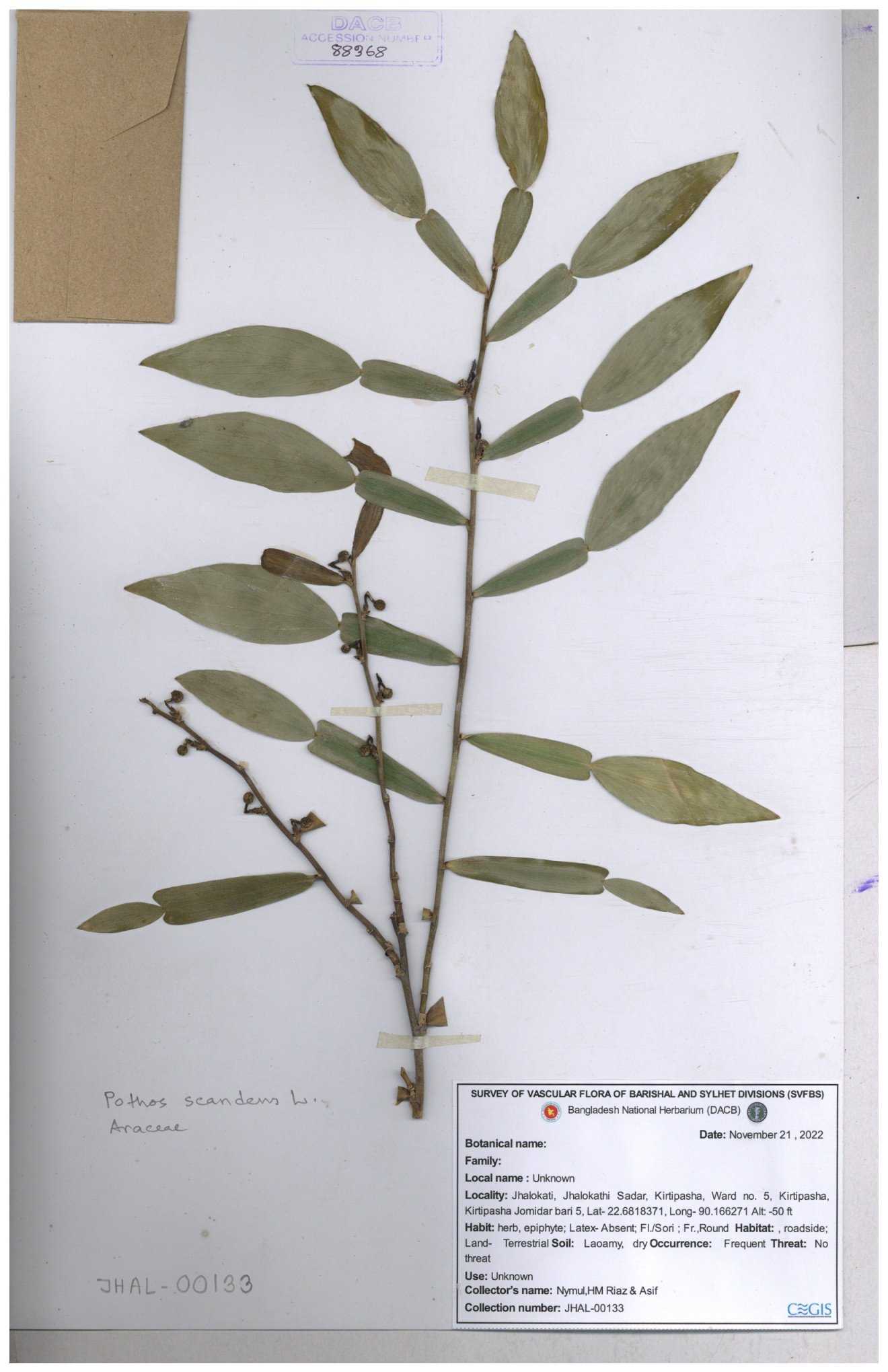 | 80835 | Araceae | Homalomena aromatica | Geoa | Dr. M. Sultana | DMS-2281 15-05-2018 |