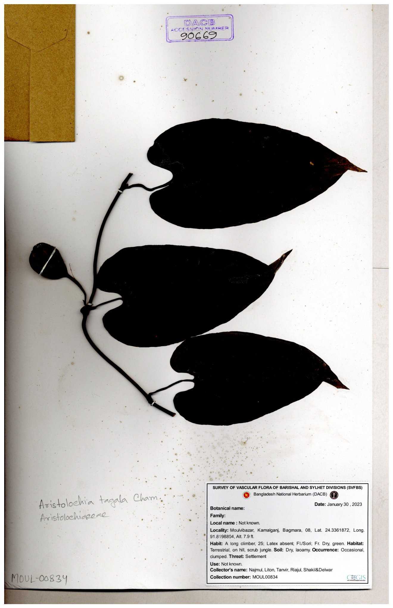 | 80840 | Aristolochiaceae | Aristolochia tagala Cham. | Bara Ishormul | Dr. M. Sultana | DMS-3759 18-06-2021 |