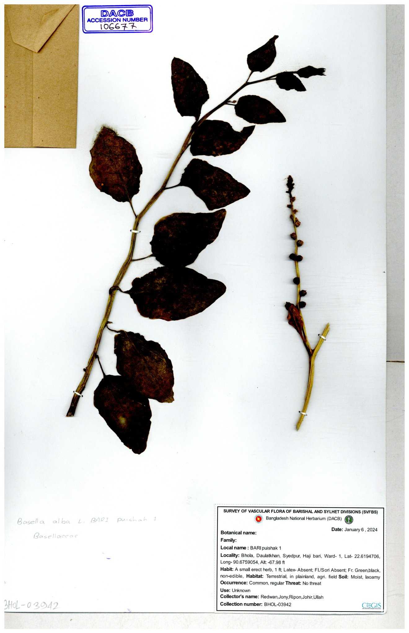 | 66426 | Basellaceae | Basella alba L. | Joyanta Chardra Roy, Kamrul Islam & Suborno Chakma | JCR-1529 26-10-2016 |