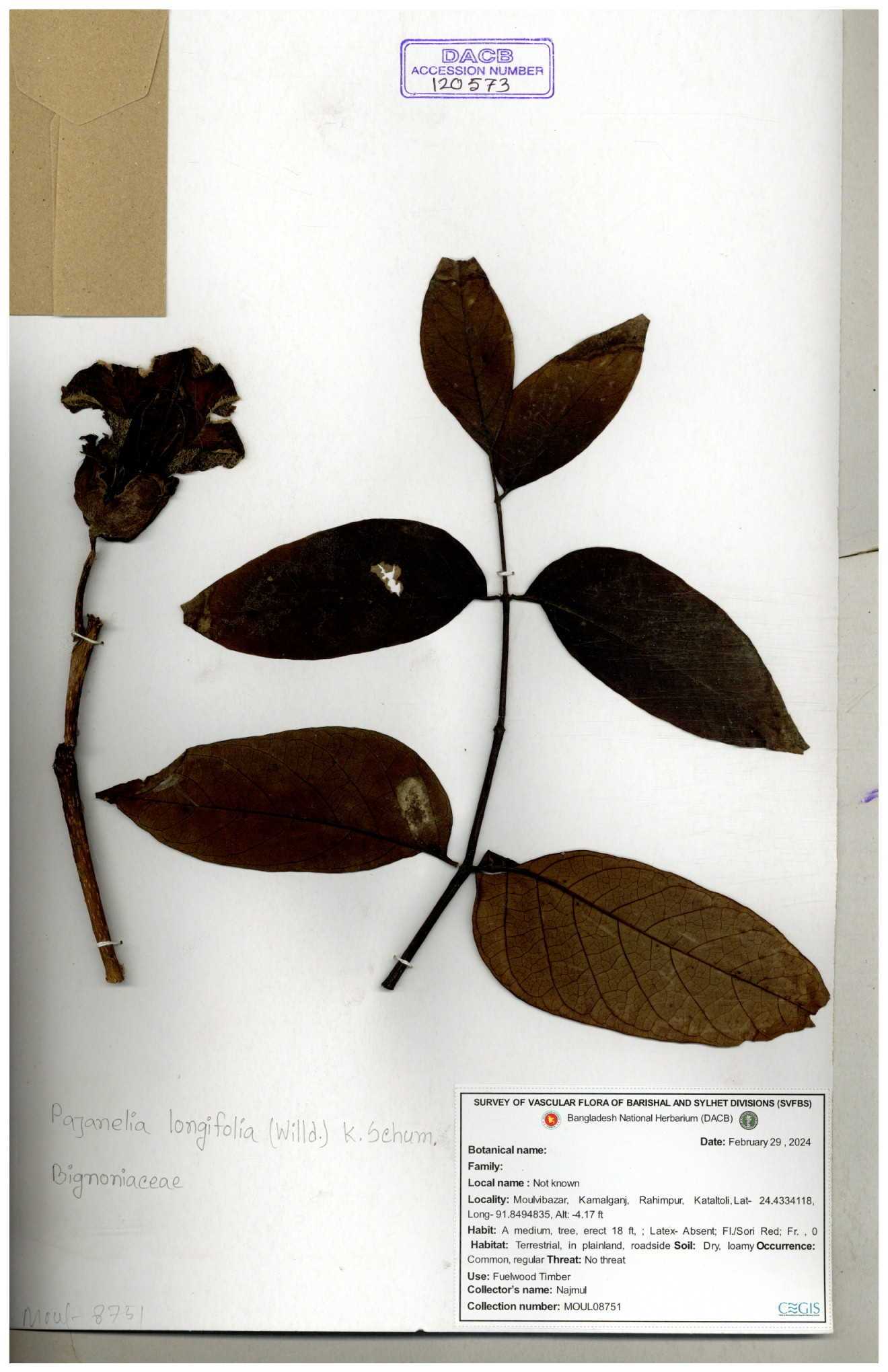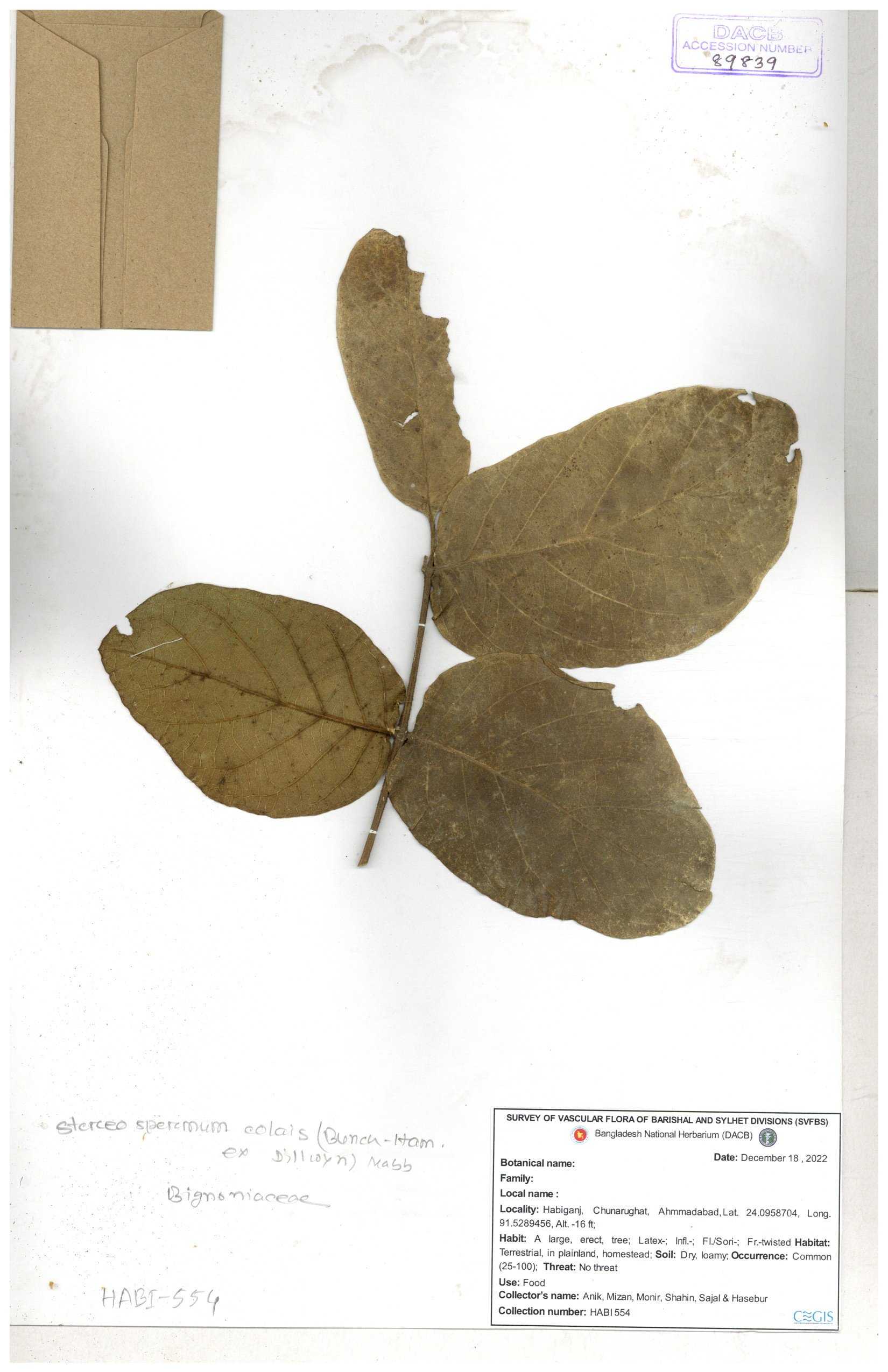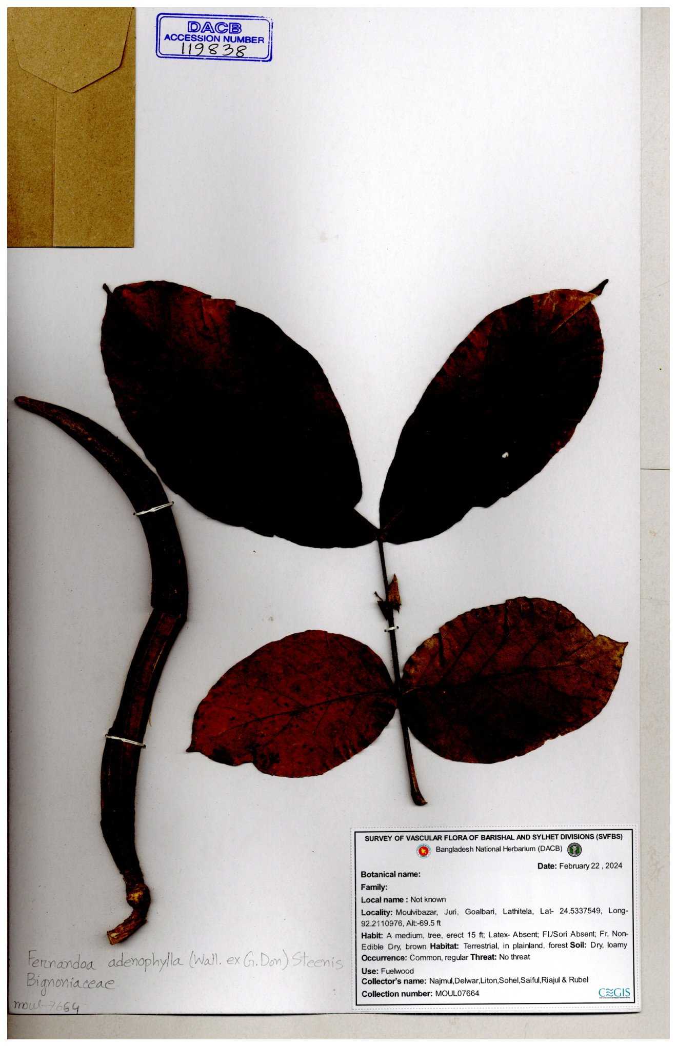 | 33427 | Bignoniaceae | Heterophragma adenophyllum Seem. ex Benth. & Hook.f | Sarder Nair Uddin | N. 2165 20-10-2003 |