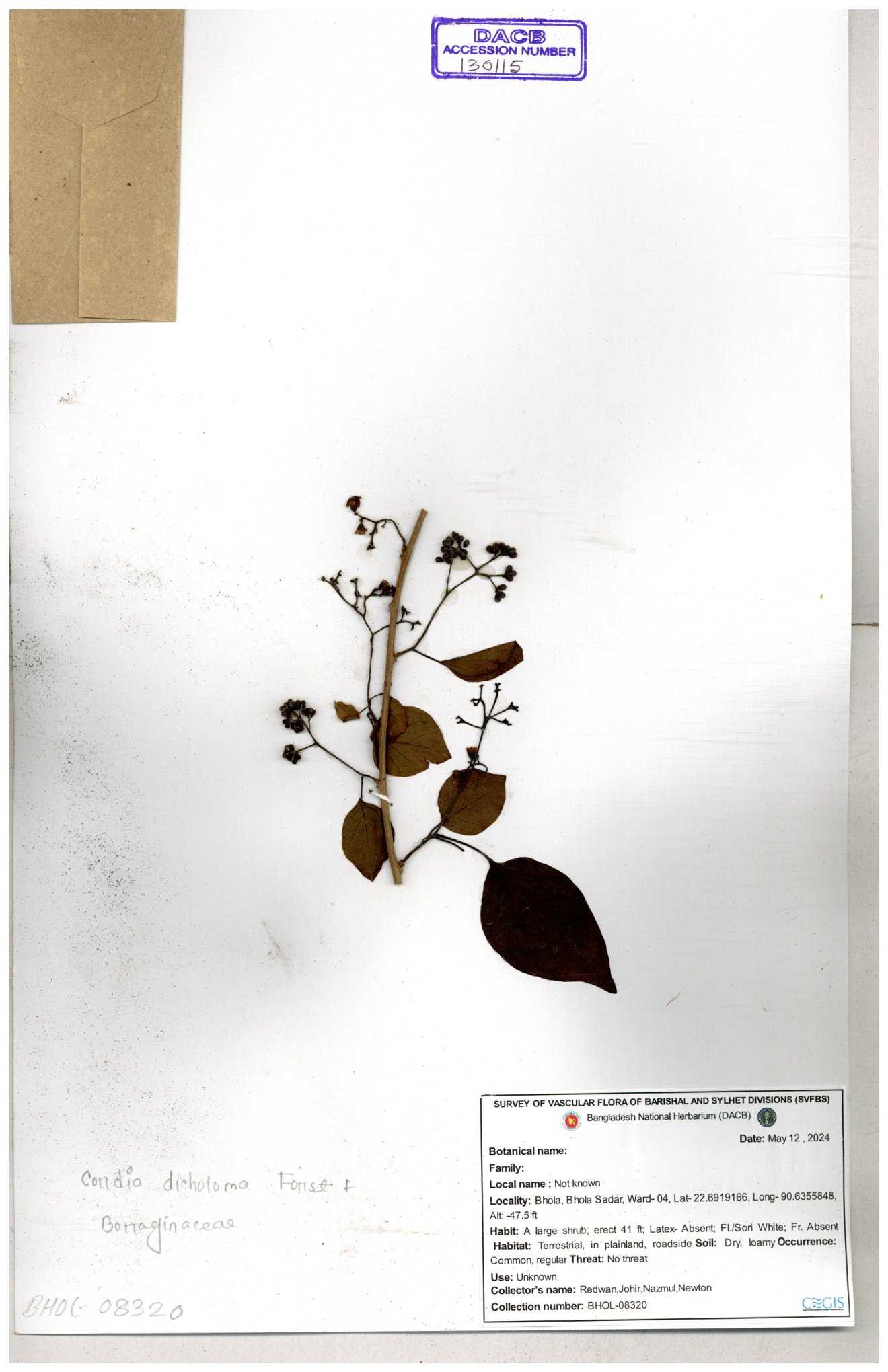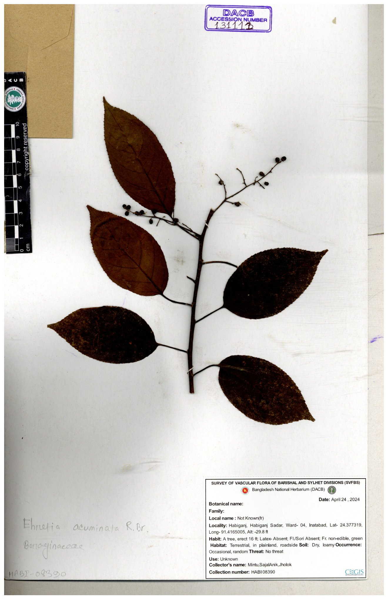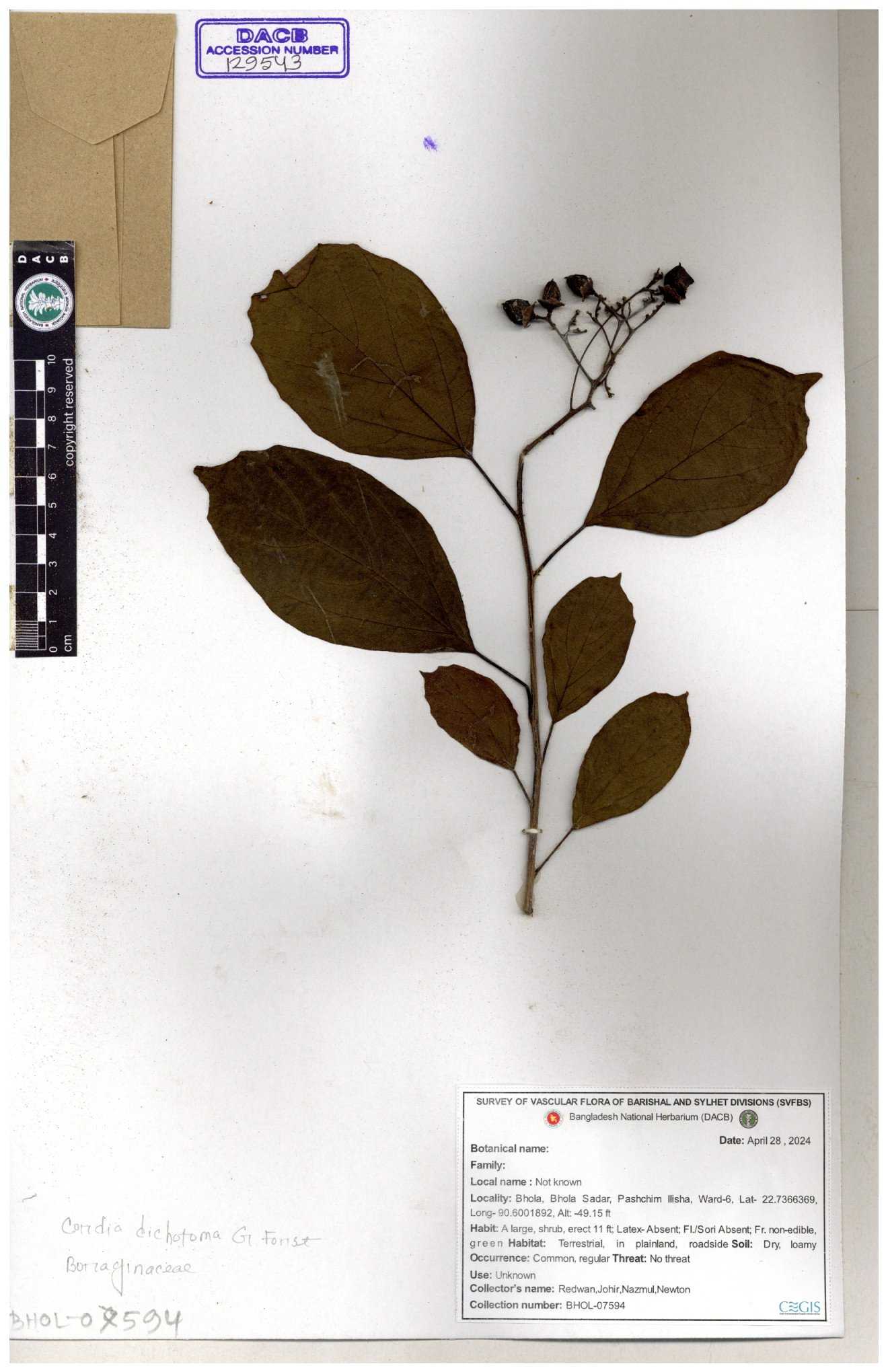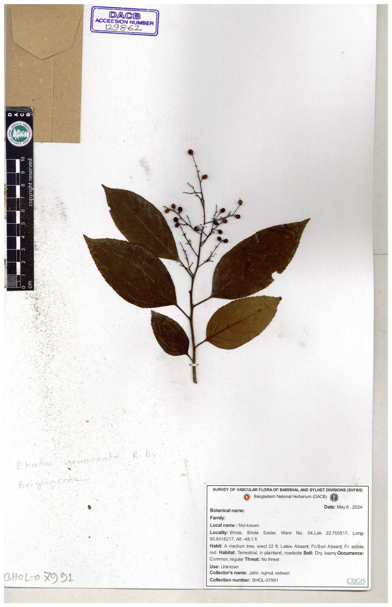 | 40159 | Boraginaceae | Cordia rerrata | B.M. Rezia Khatun | RK-5847 03-10-2008 |