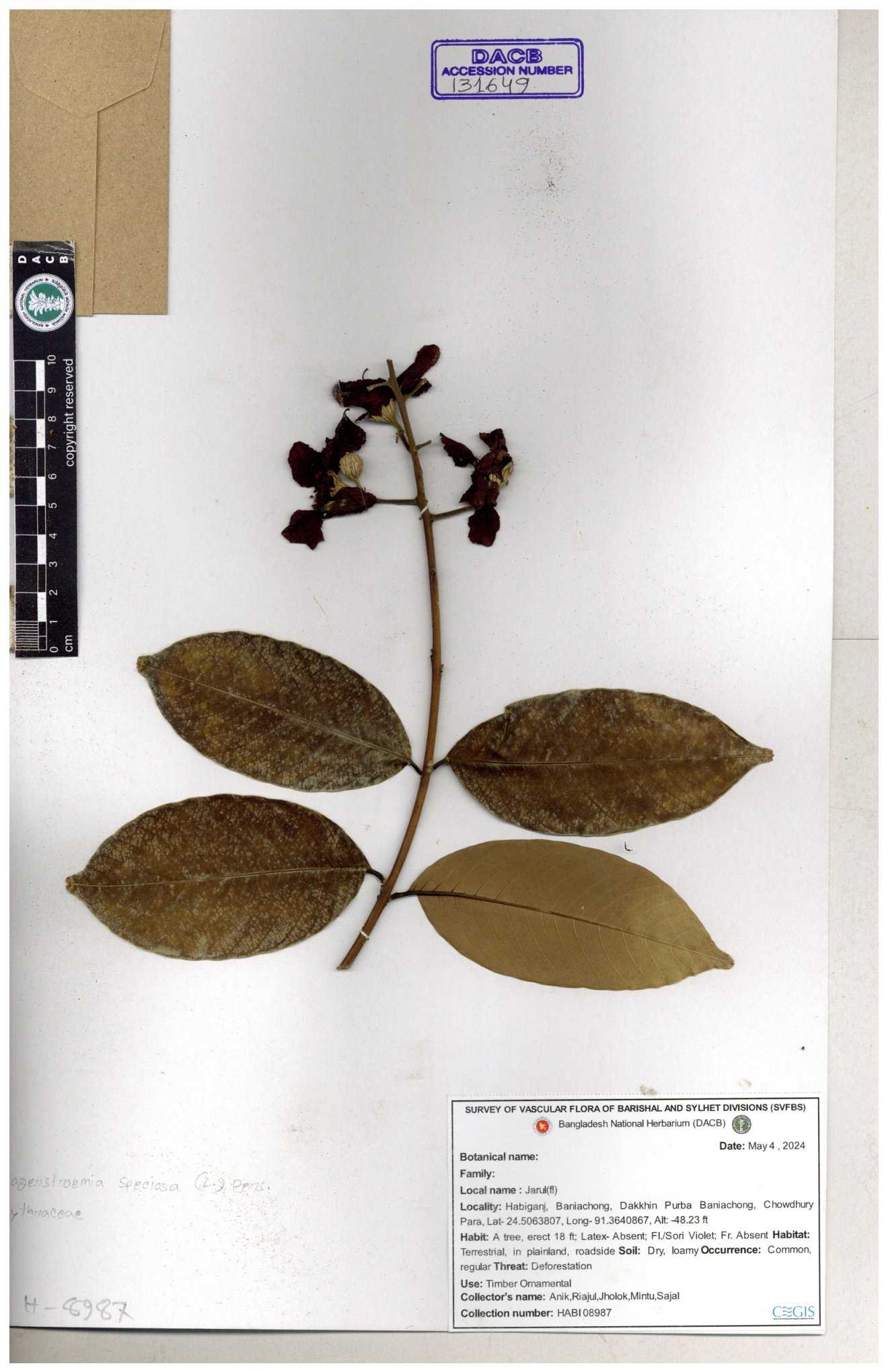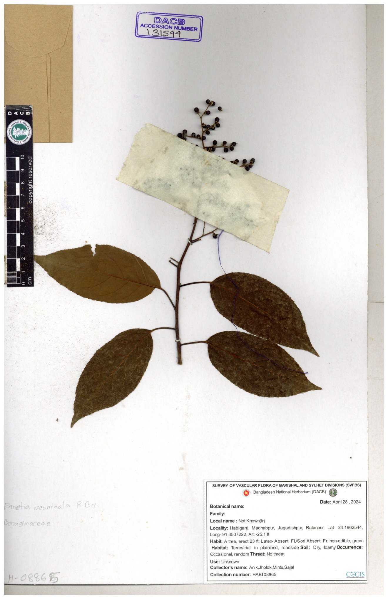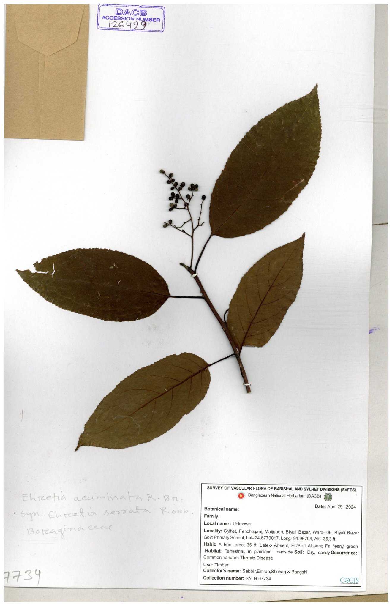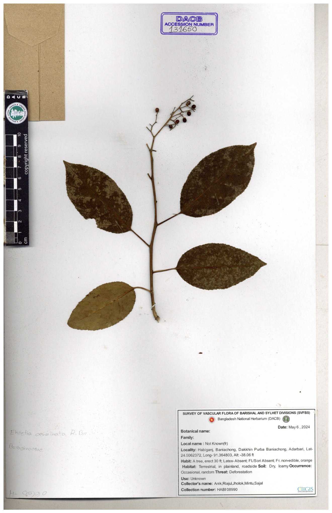 | 40159 | Boraginaceae | Cordia rerrata | B.M. Rezia Khatun | RK-5847 03-10-2008 |