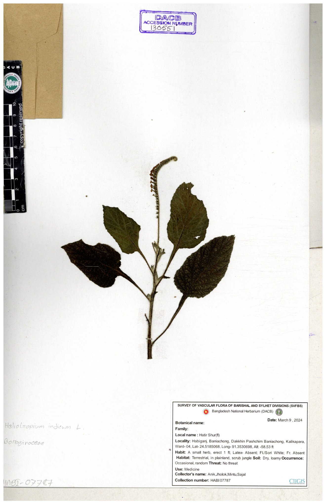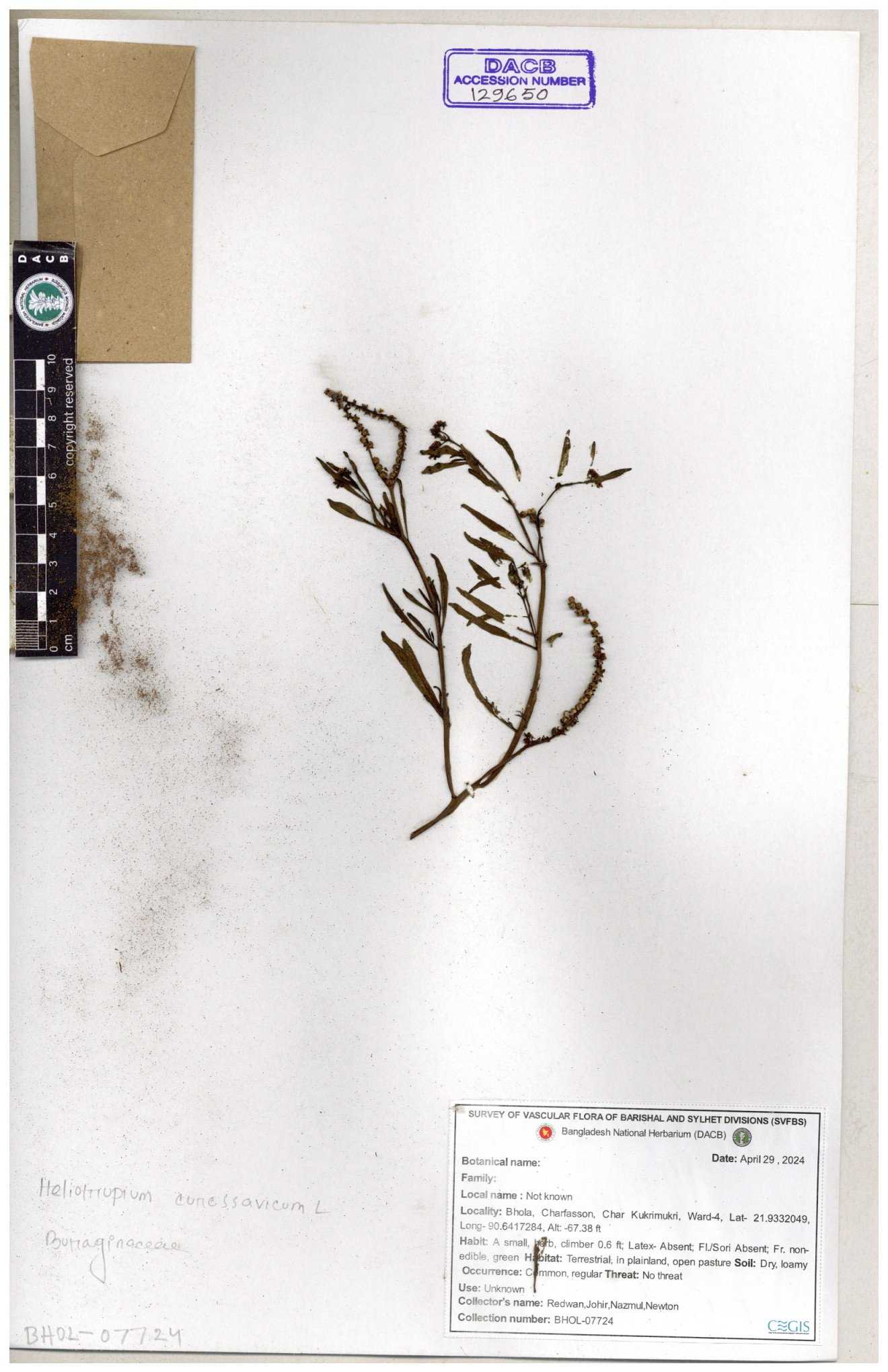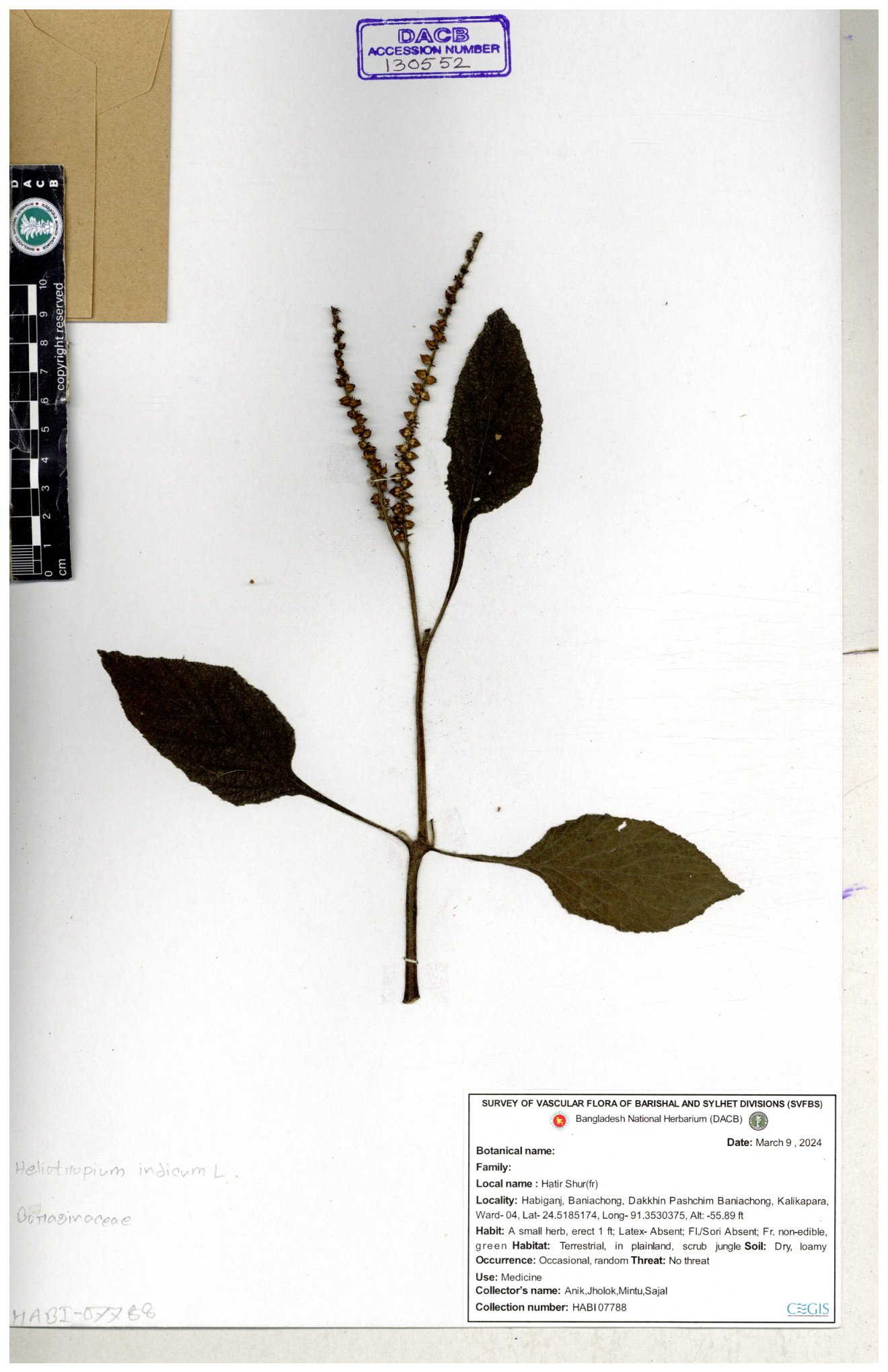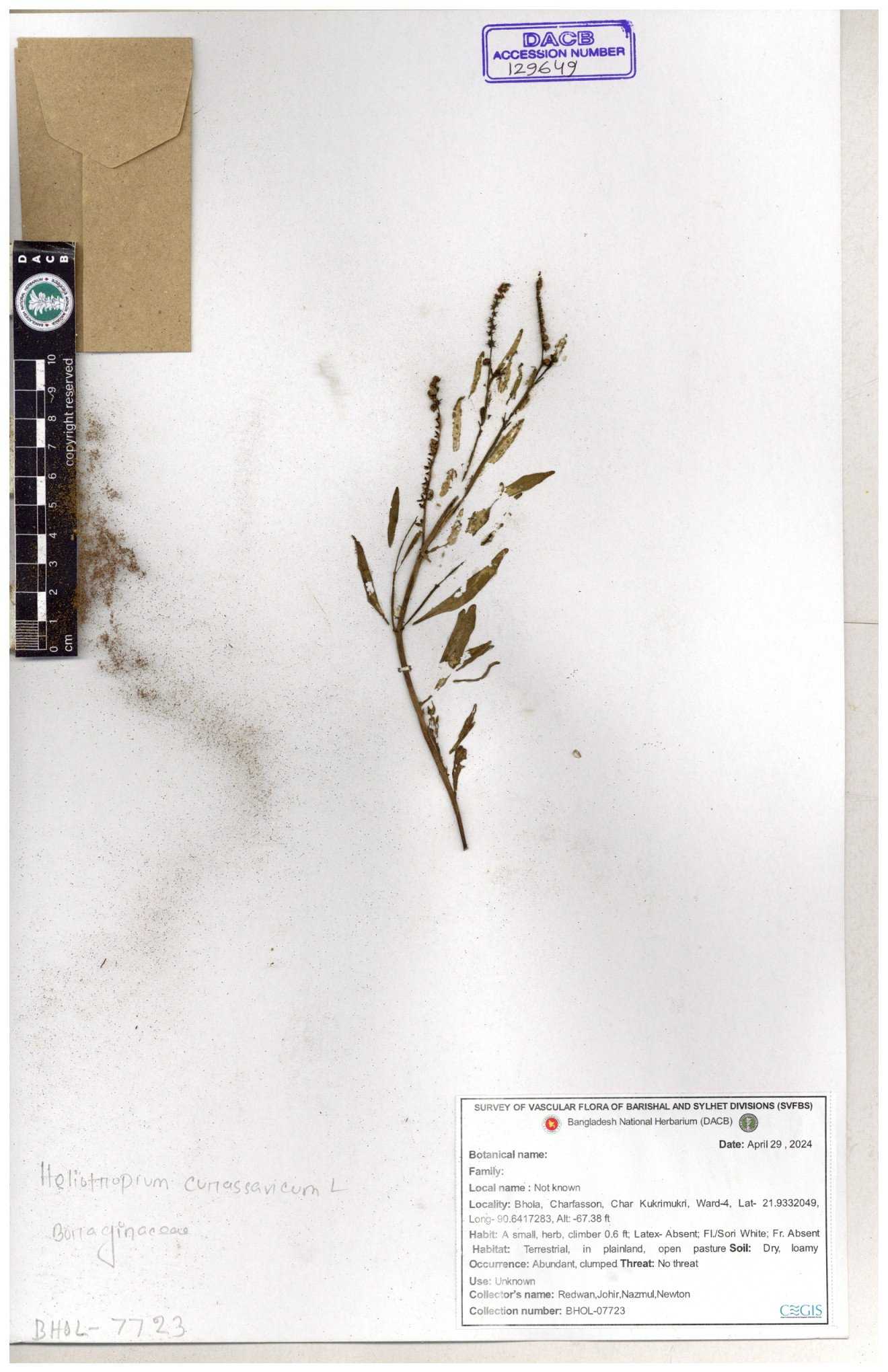 | 80894 | Boraginaceae | Heliotropium cnrassivicum L. | Dr. M. Sultana | DMS-3674 25-03-2021 |