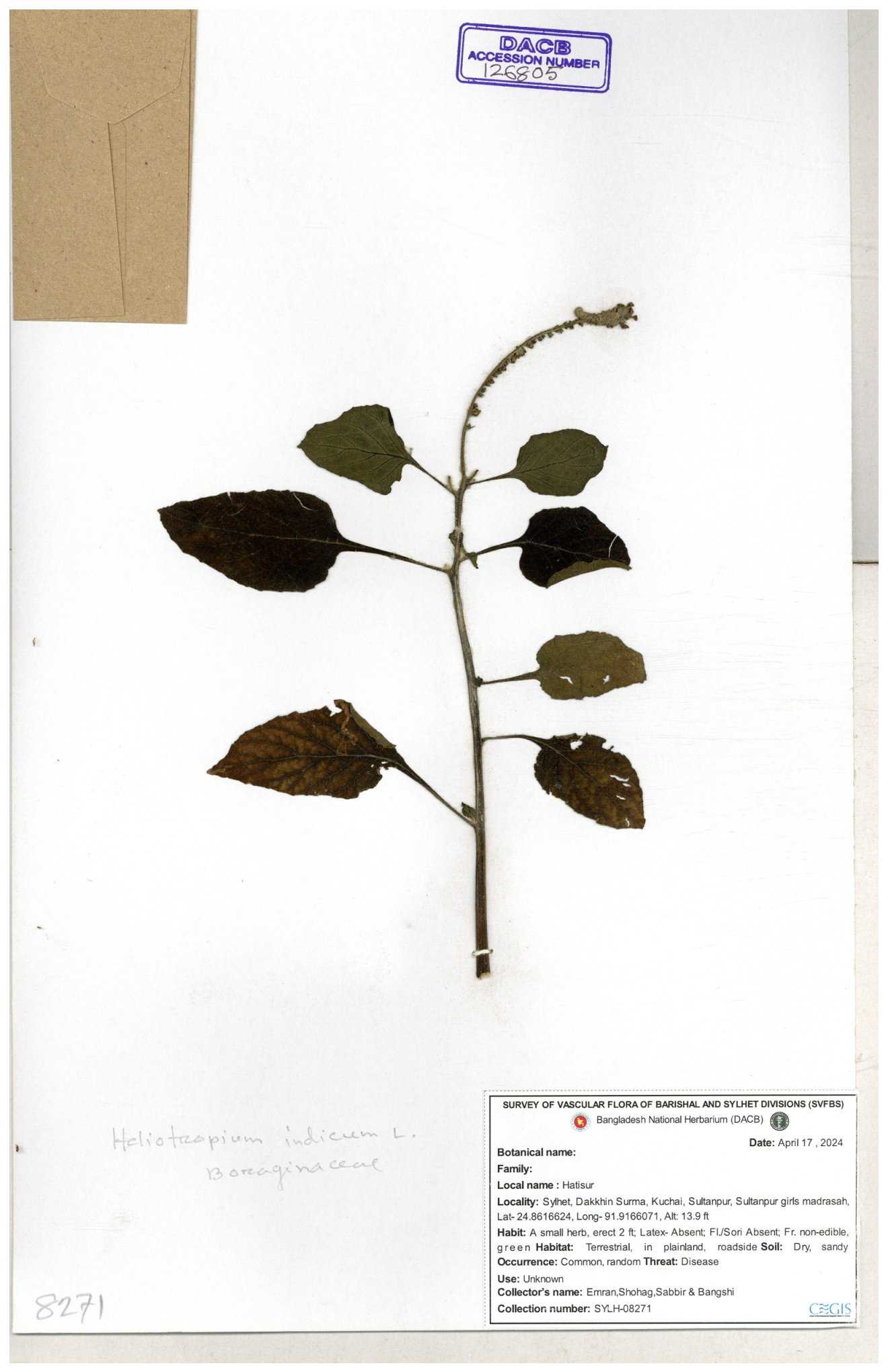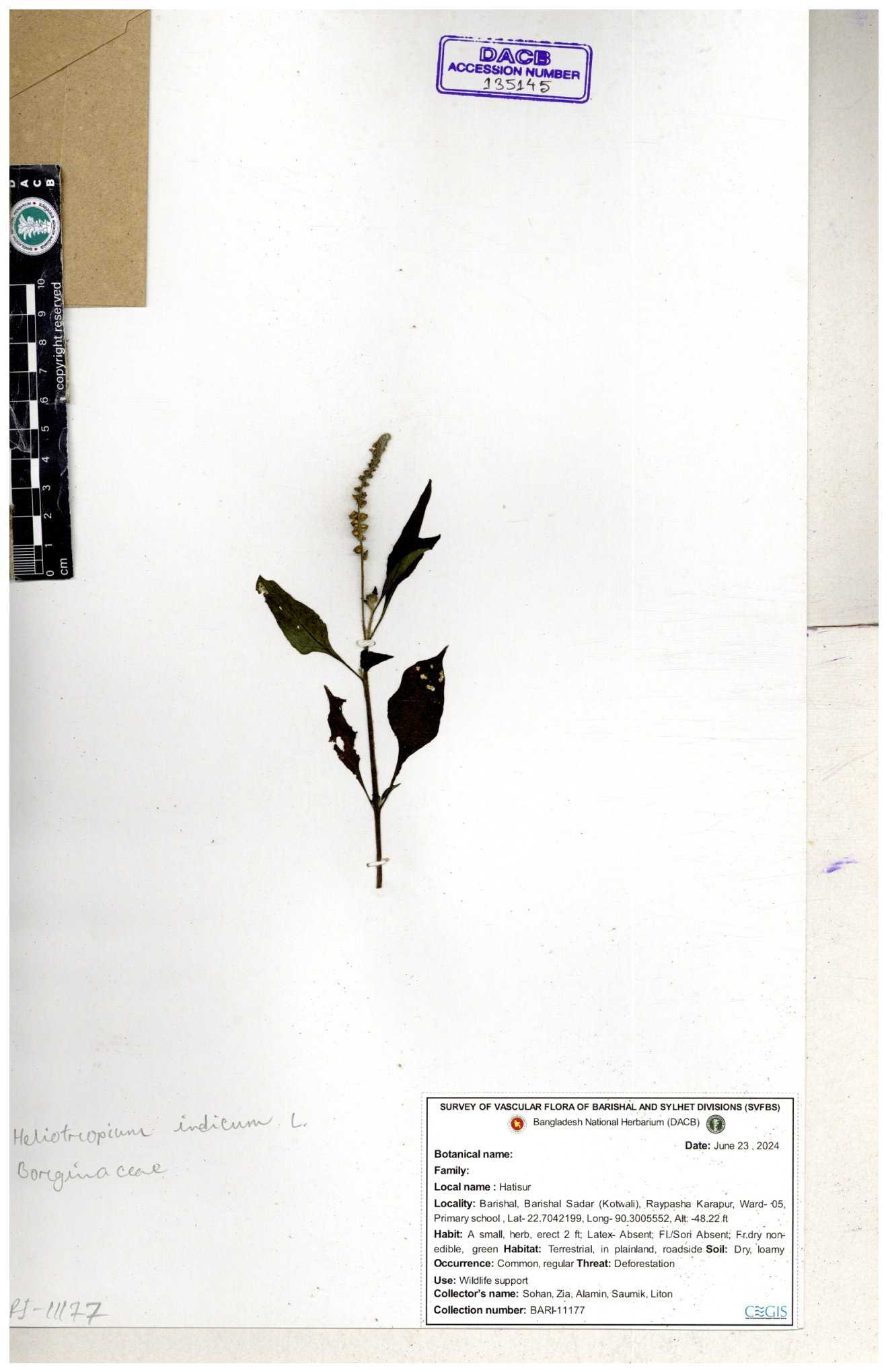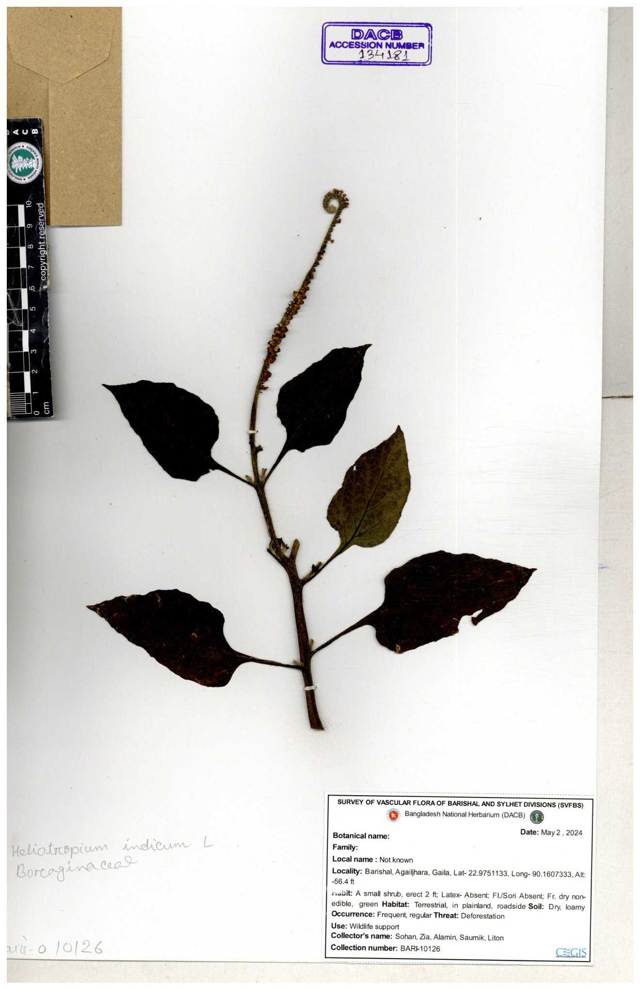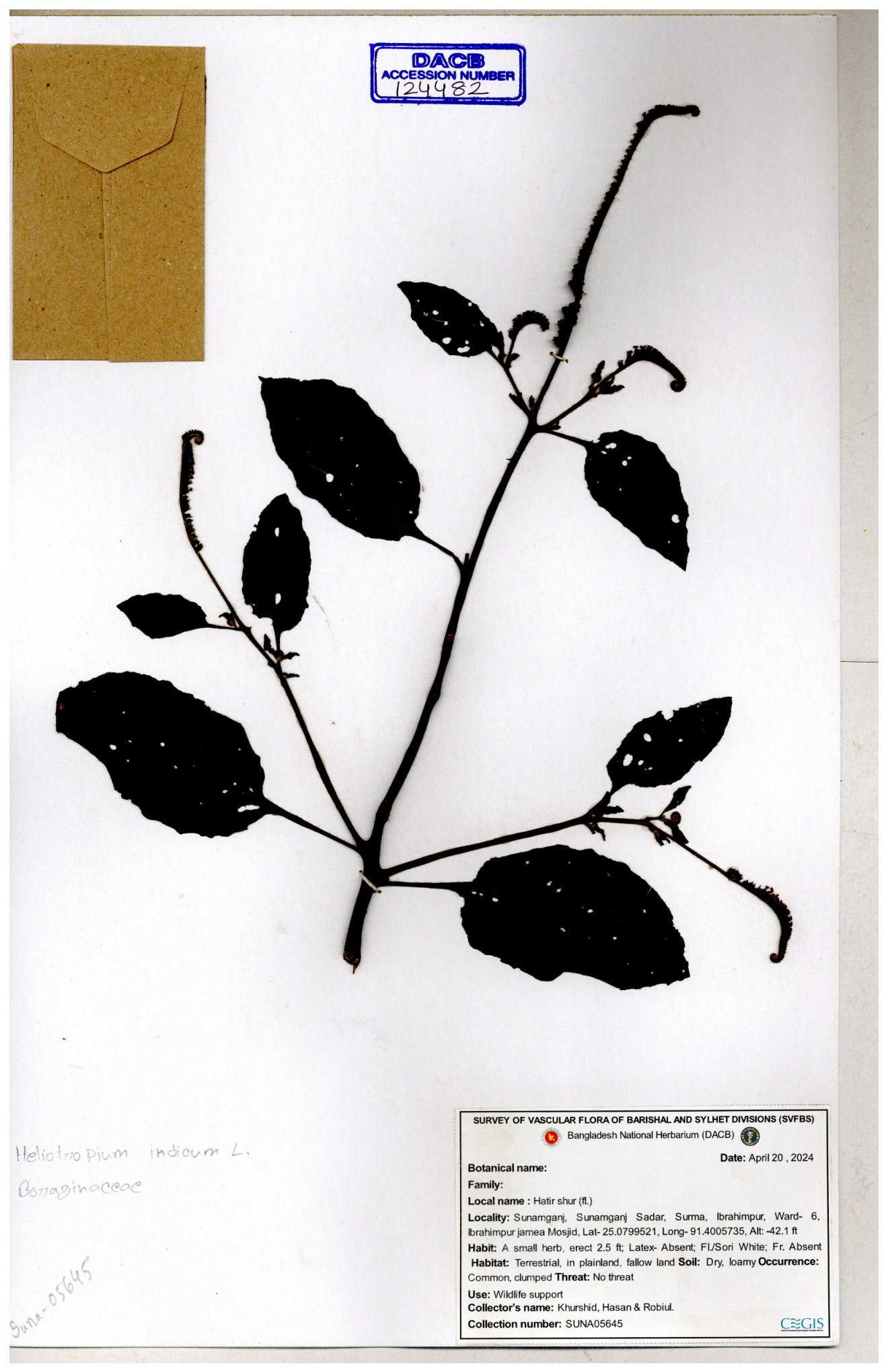 | 80894 | Boraginaceae | Heliotropium cnrassivicum L. | Dr. M. Sultana | DMS-3674 25-03-2021 |