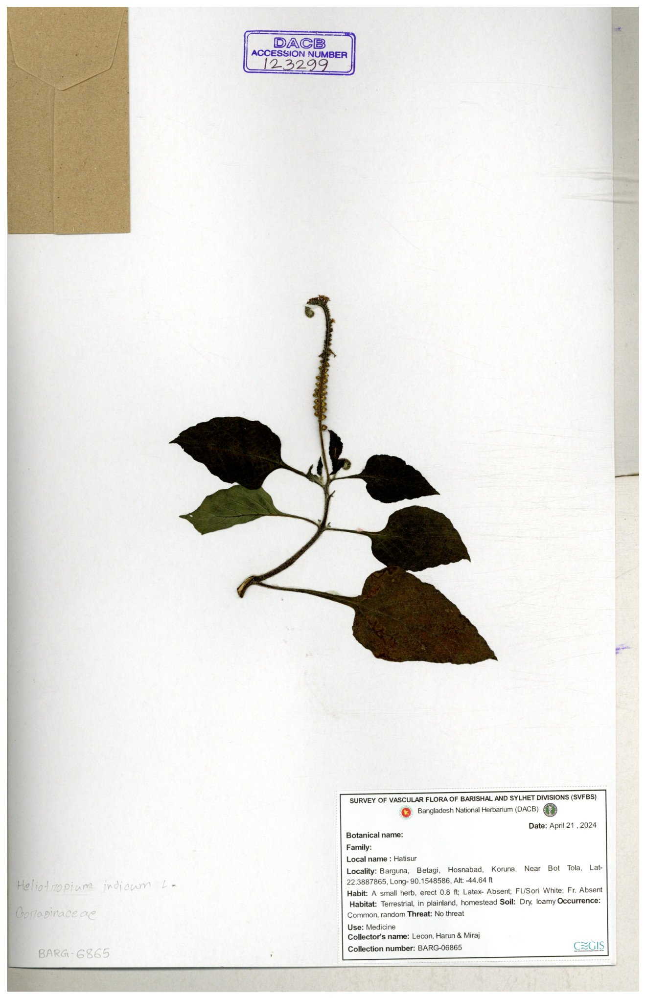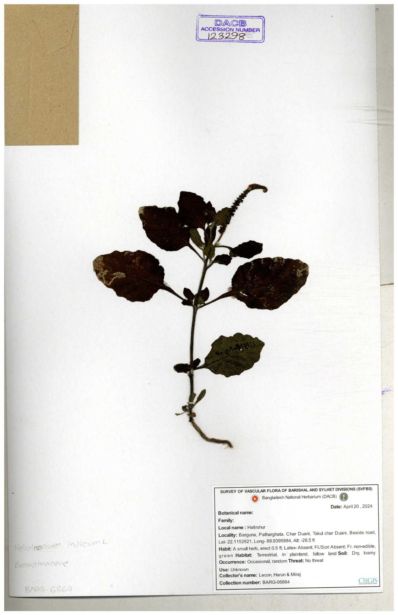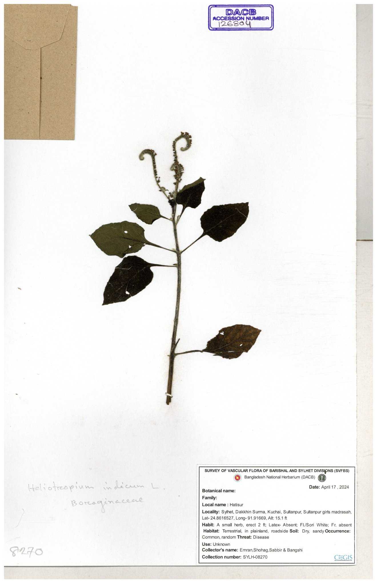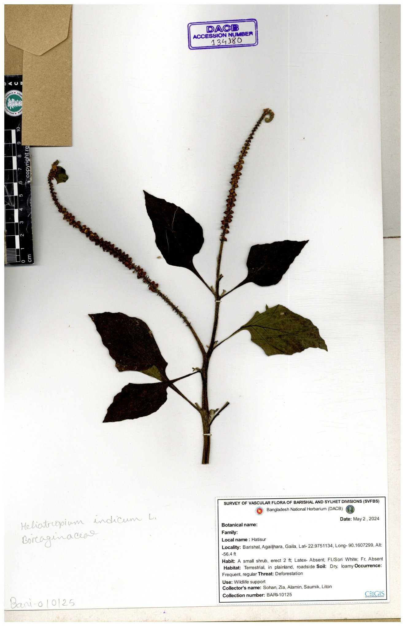 | 80894 | Boraginaceae | Heliotropium cnrassivicum L. | Dr. M. Sultana | DMS-3674 25-03-2021 |