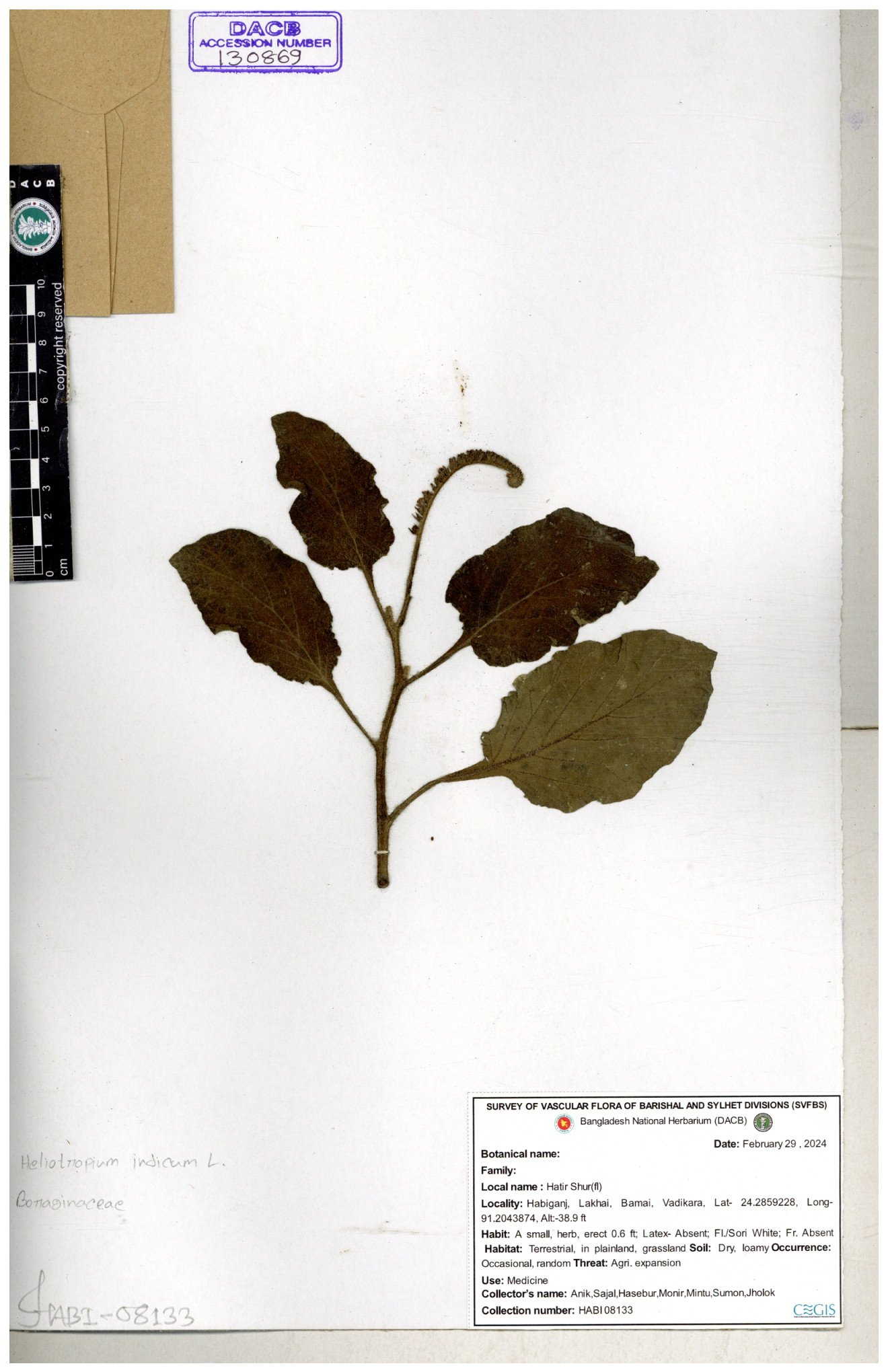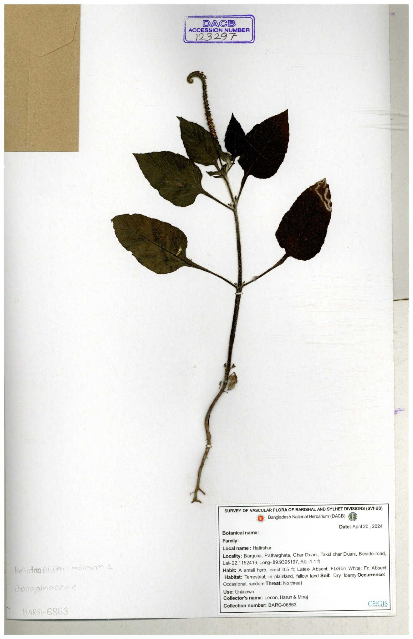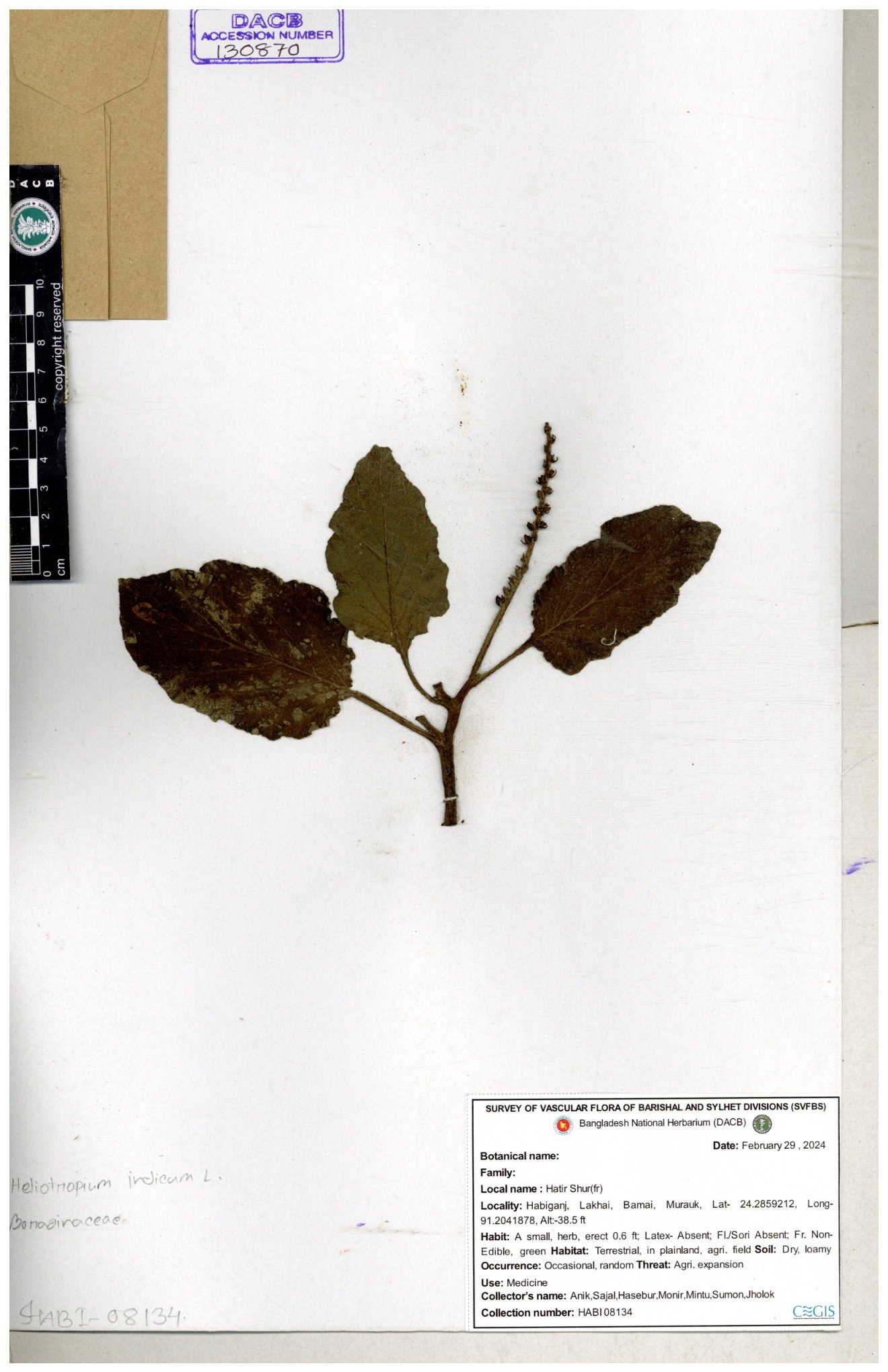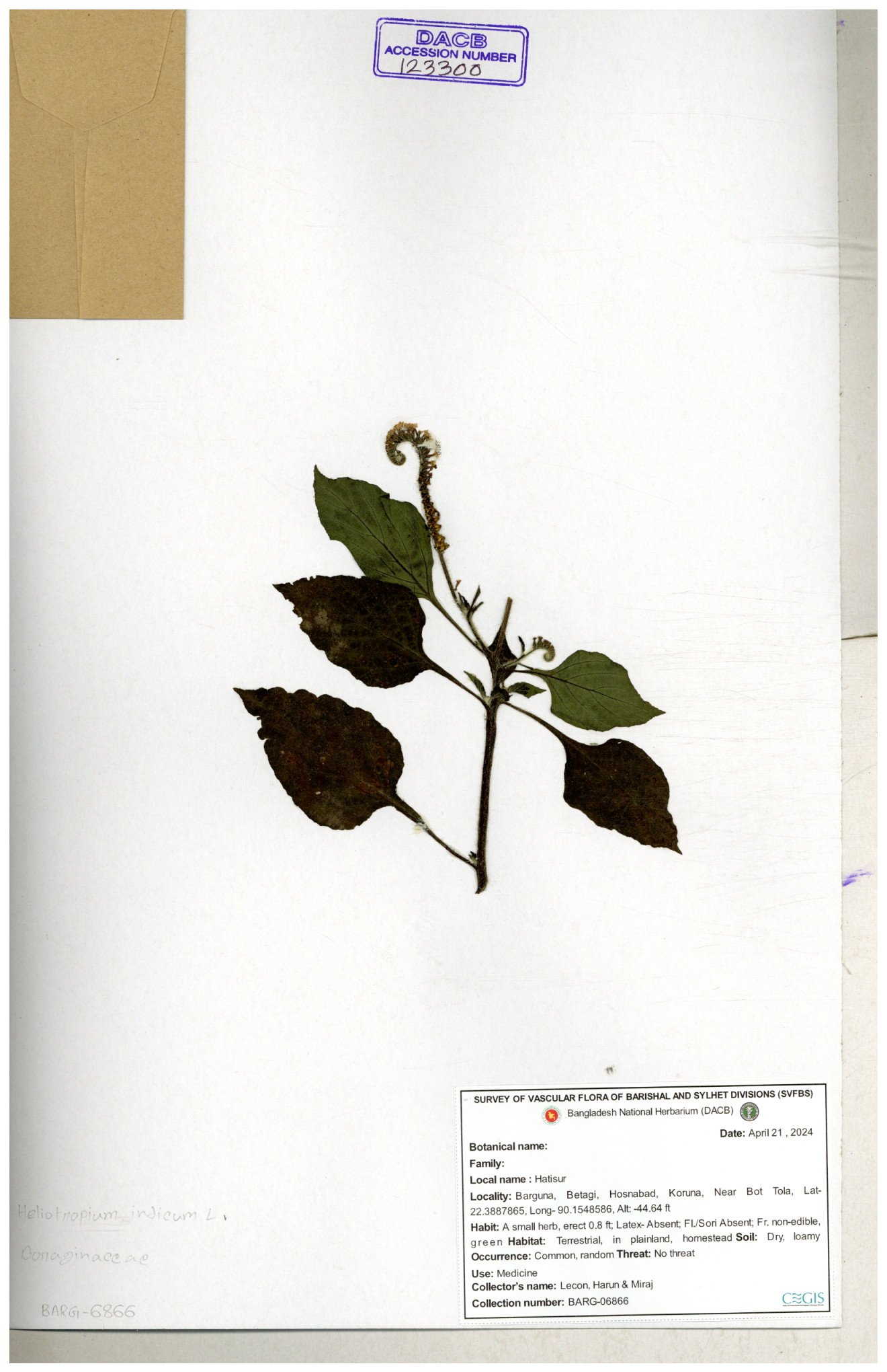 | 80894 | Boraginaceae | Heliotropium cnrassivicum L. | Dr. M. Sultana | DMS-3674 25-03-2021 |