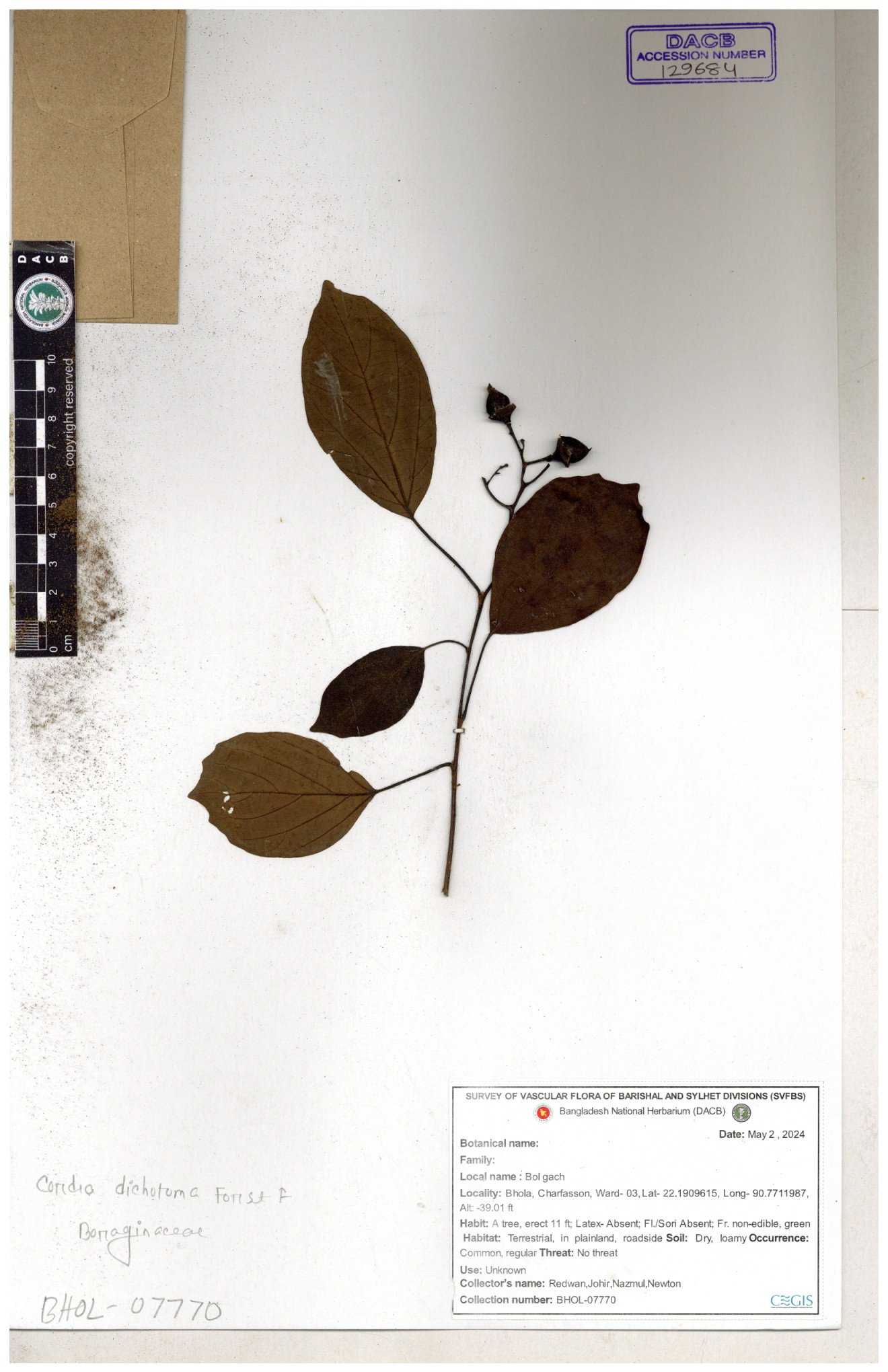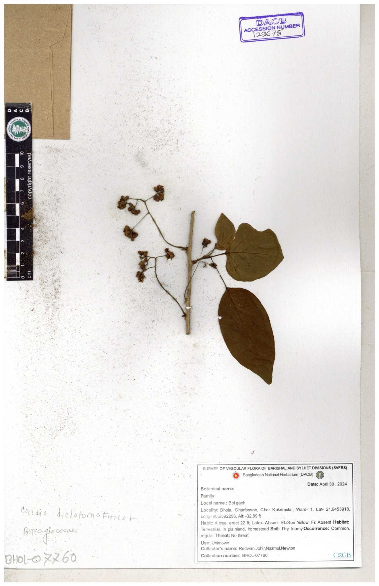 | 66350 | Boraginaceae | Cordia dichotoma G.Forst. | বহুল, বহারি | Ahmed Saqee | ASQ-221 30-11--0001 |