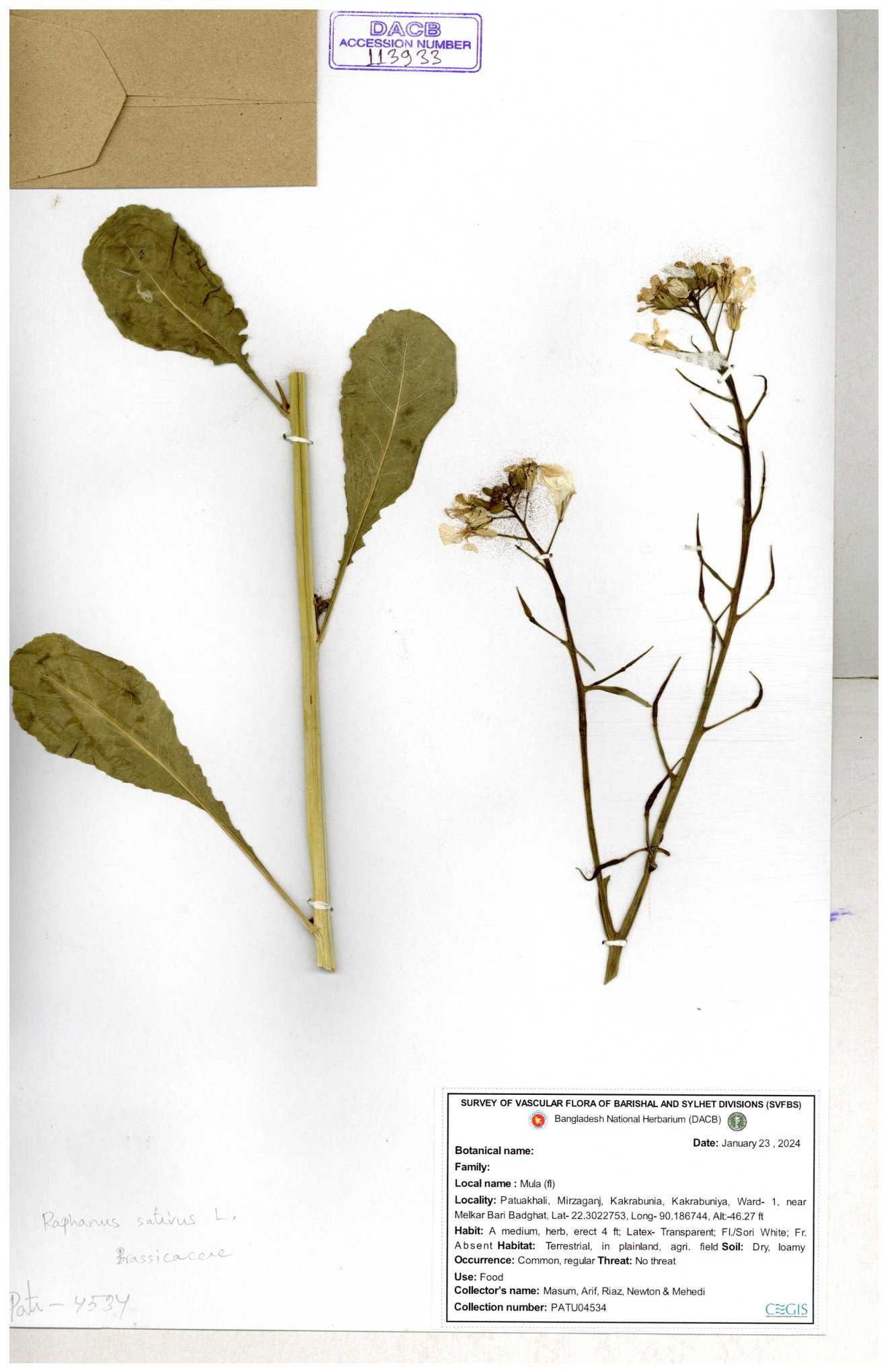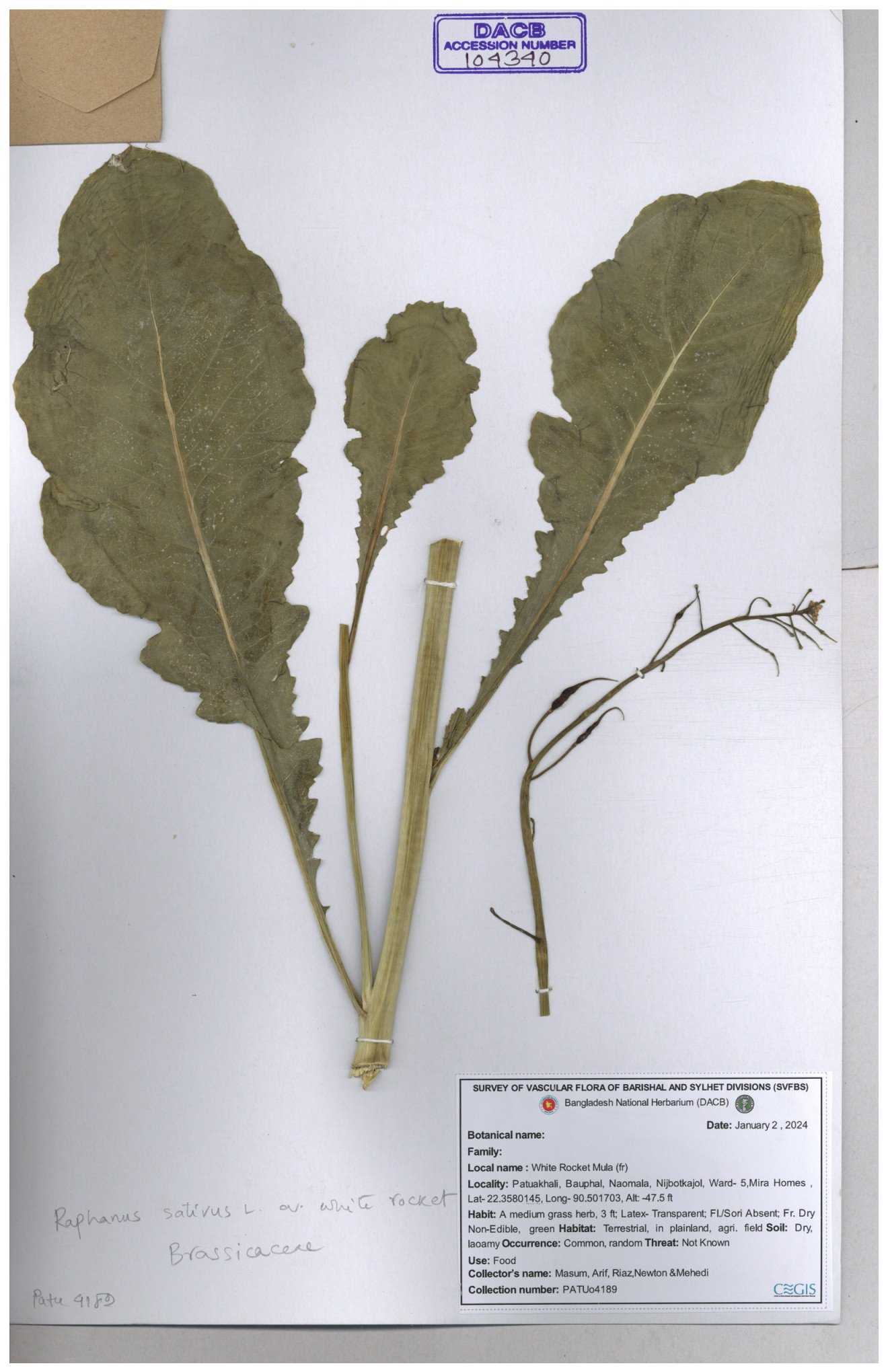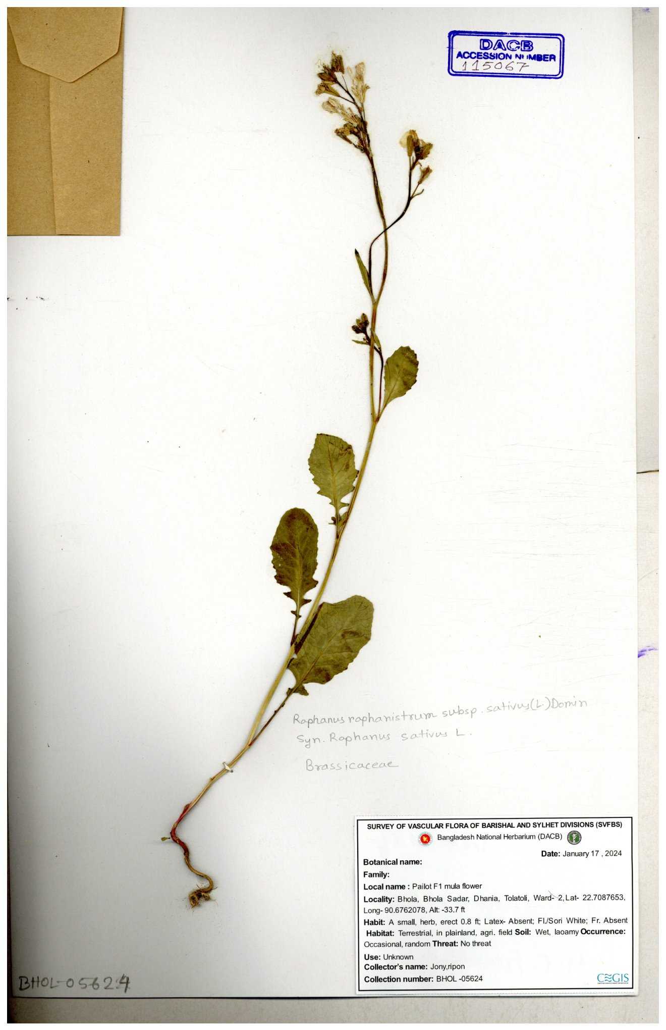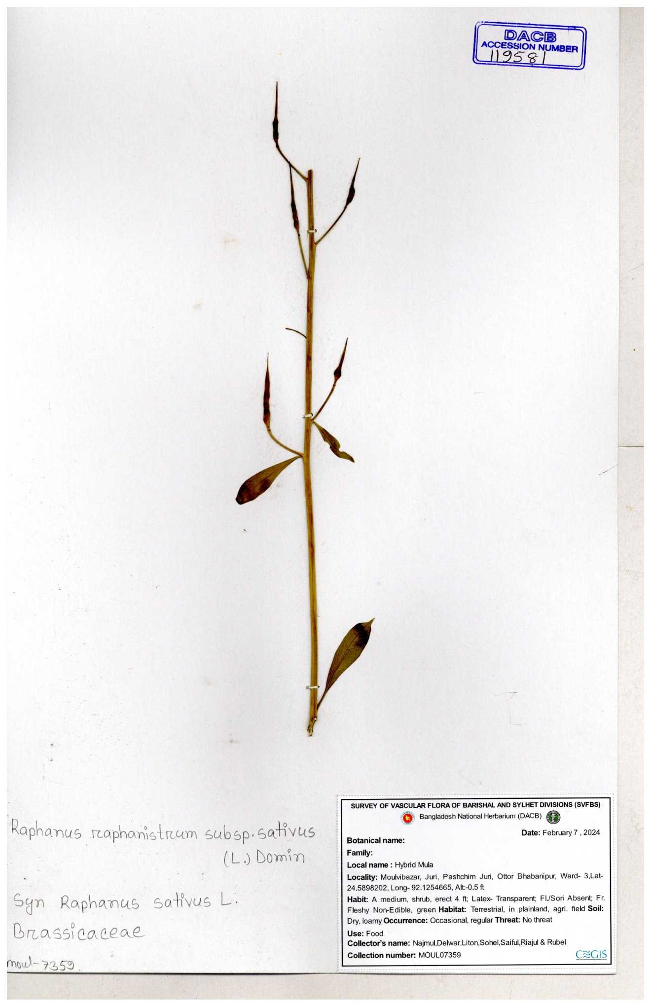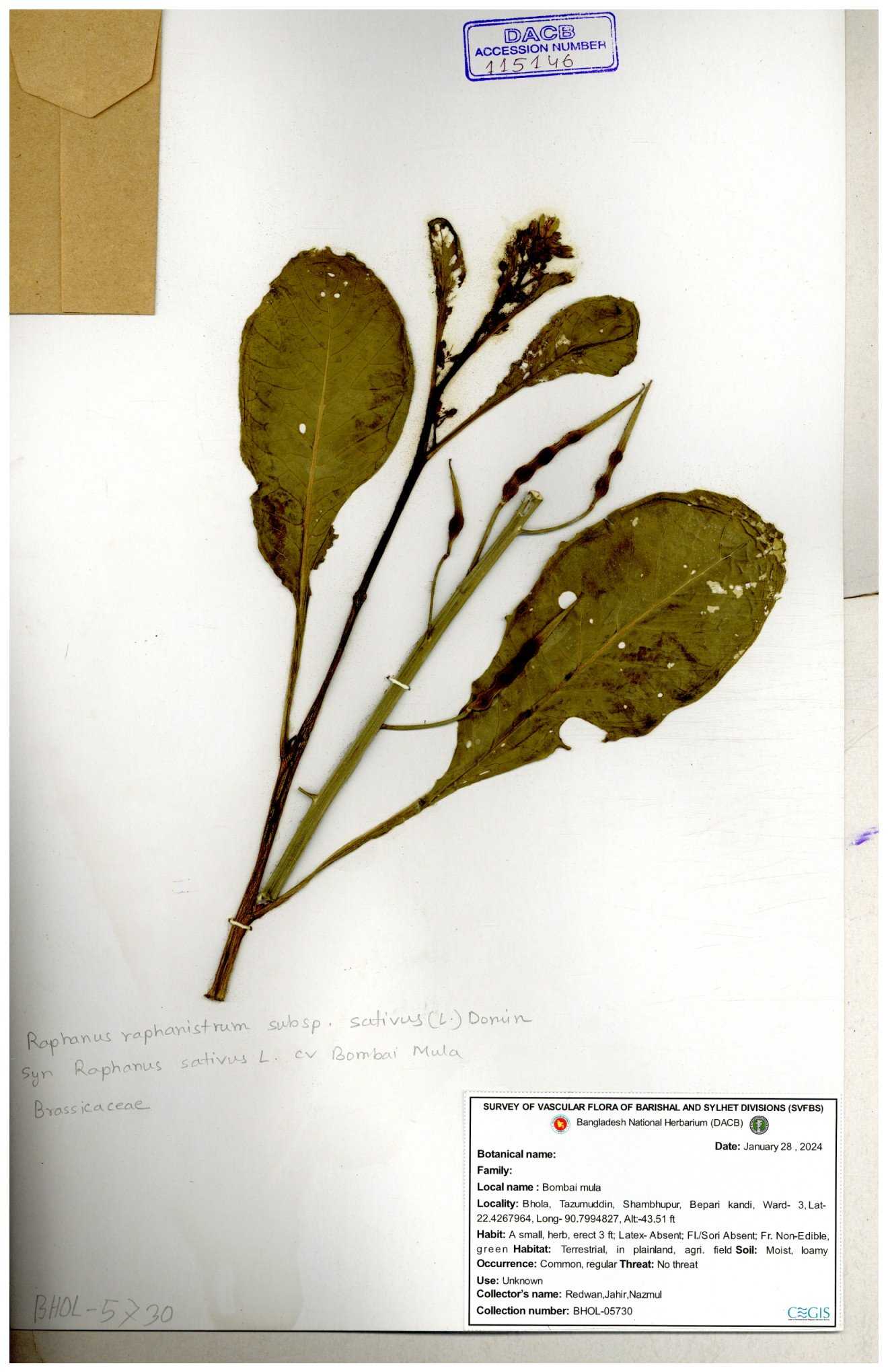 | 67352 | Brassicaceae | Raphanus sativus L. | Mula | I Hossen et al | IH-3419 17-01-2017 |