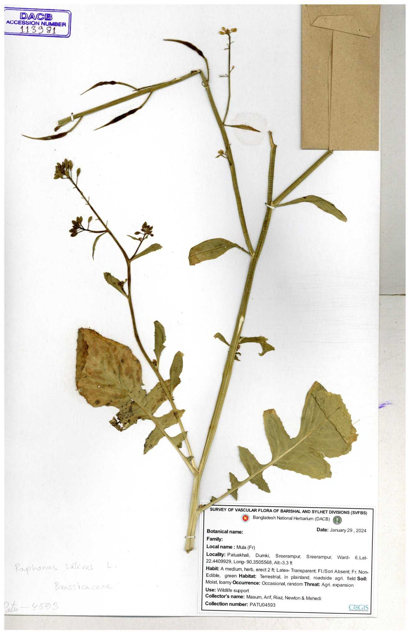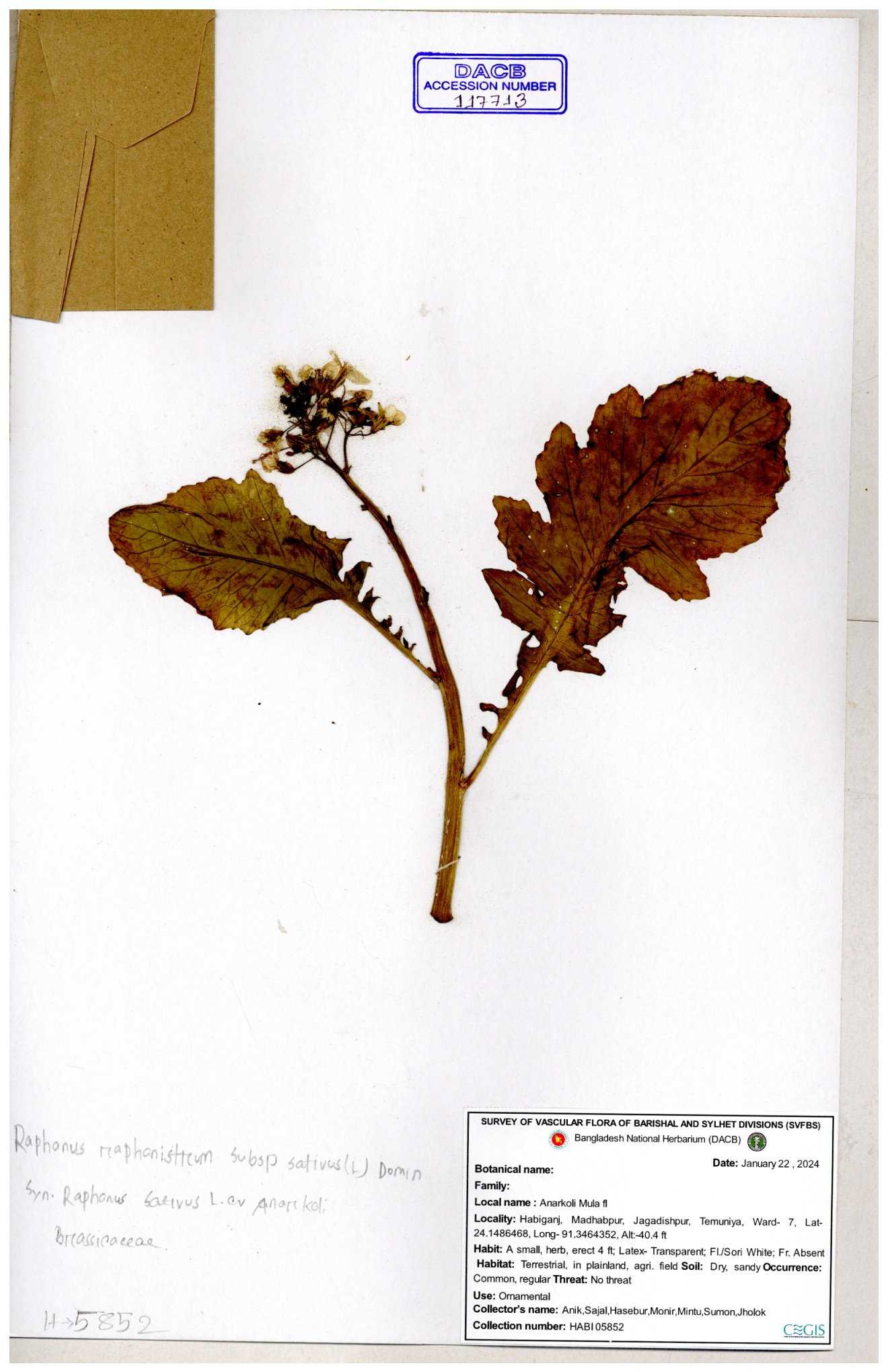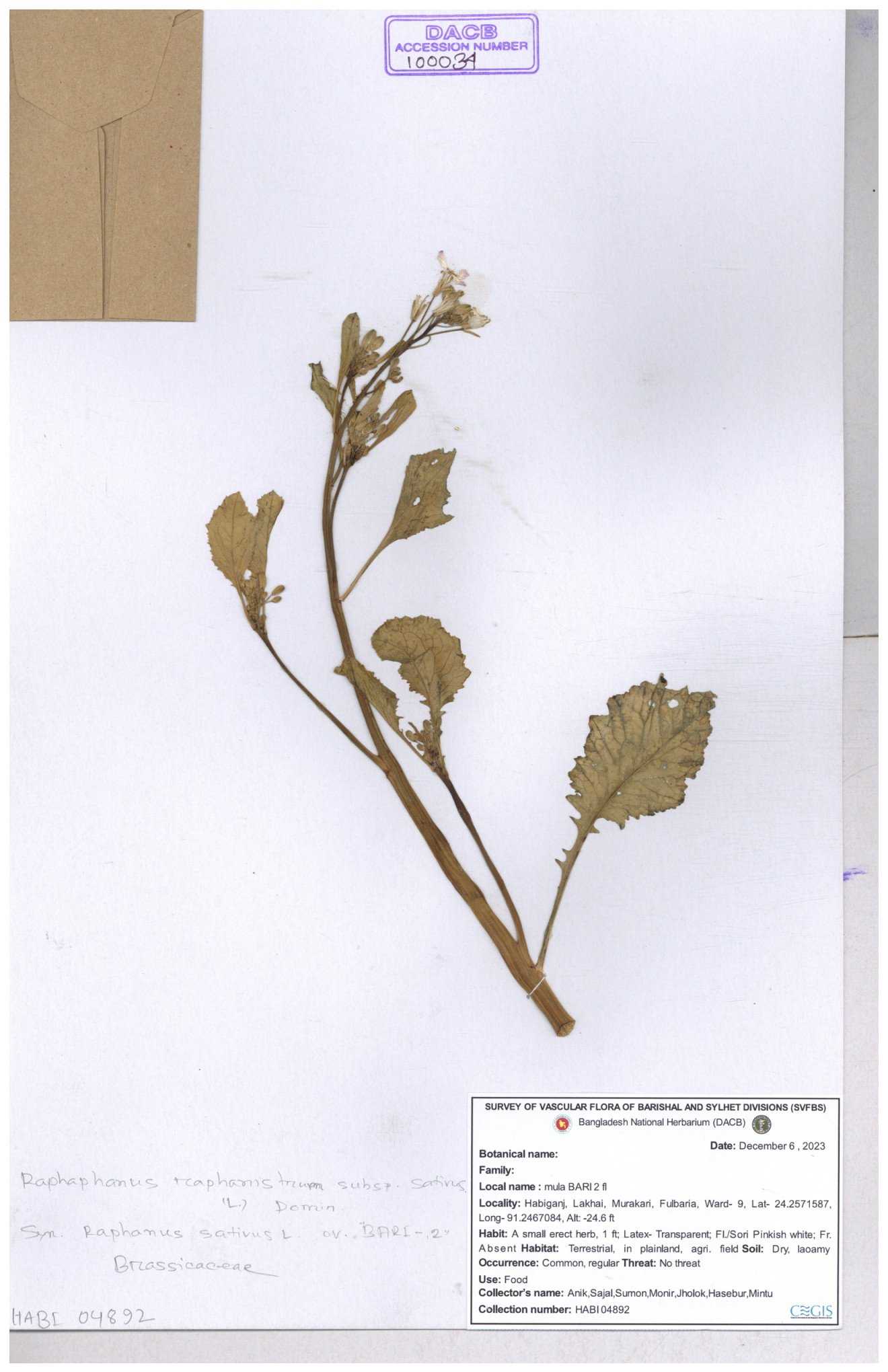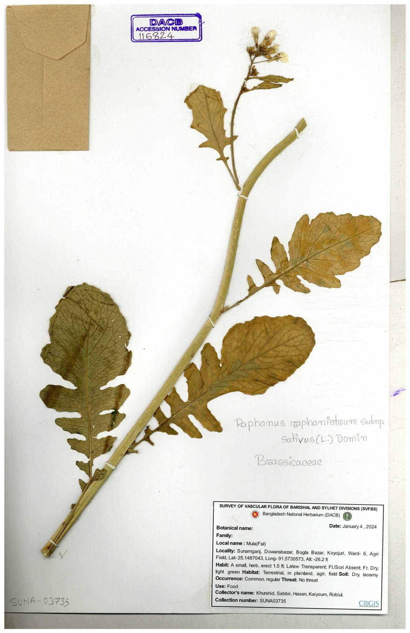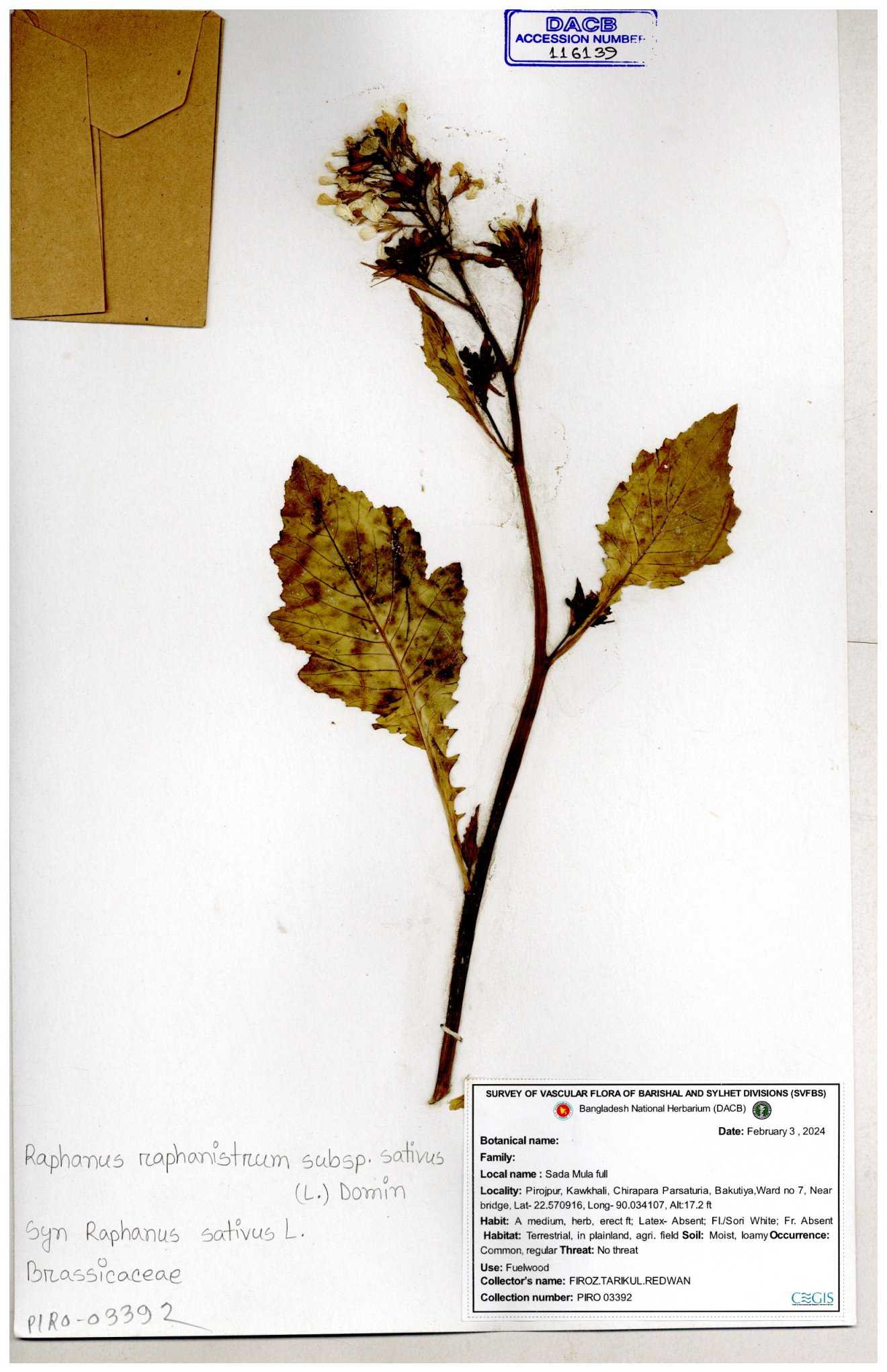| 67352 | Brassicaceae | Raphanus sativus L. | Mula | I Hossen et al | IH-3419 17-01-2017 |
