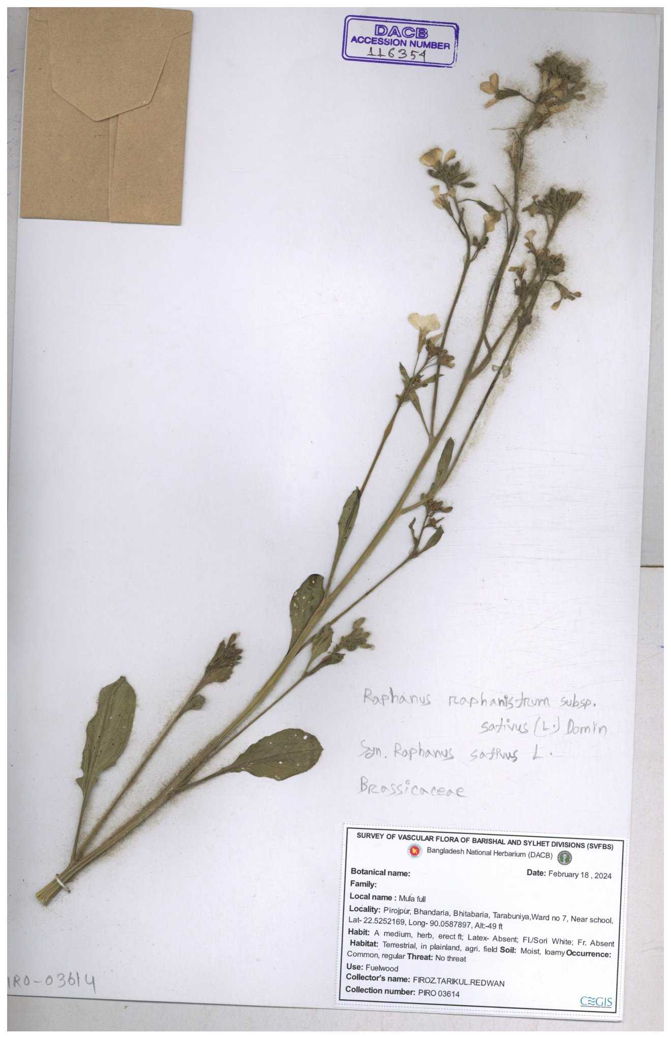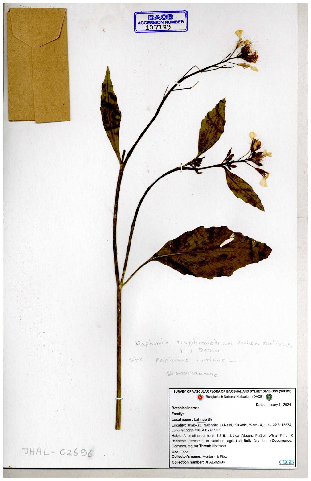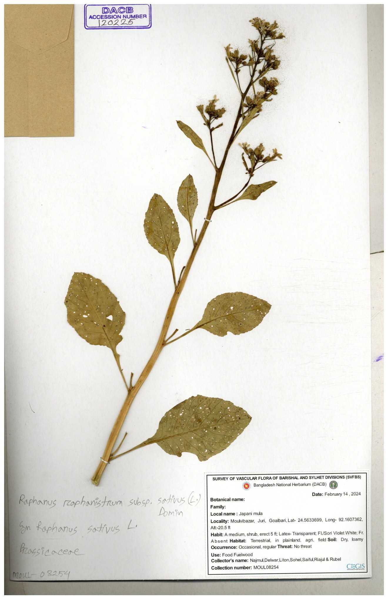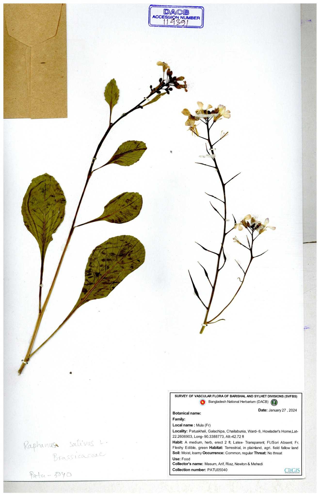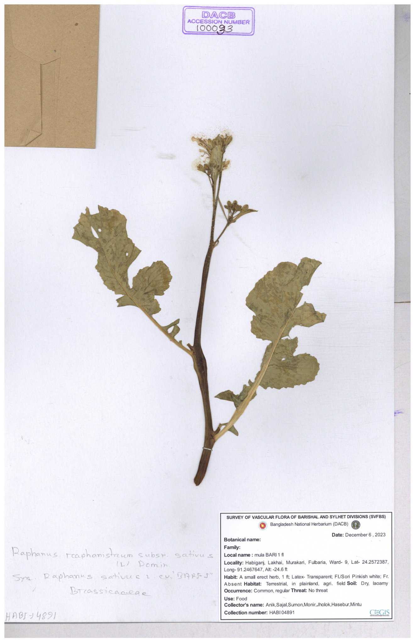 | 67352 | Brassicaceae | Raphanus sativus L. | Mula | I Hossen et al | IH-3419 17-01-2017 |