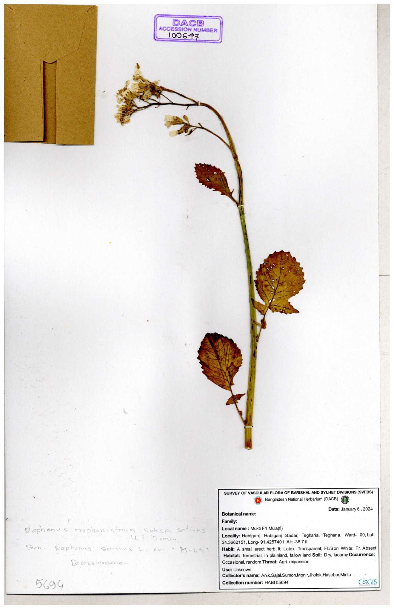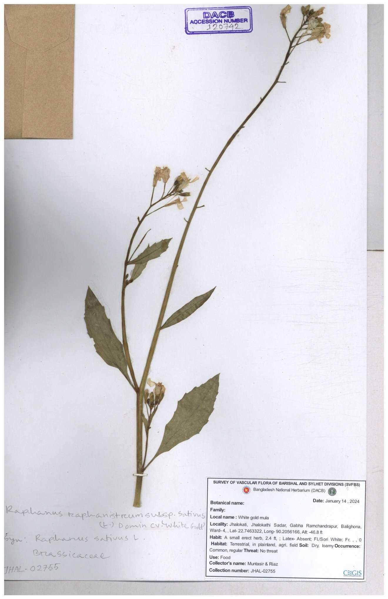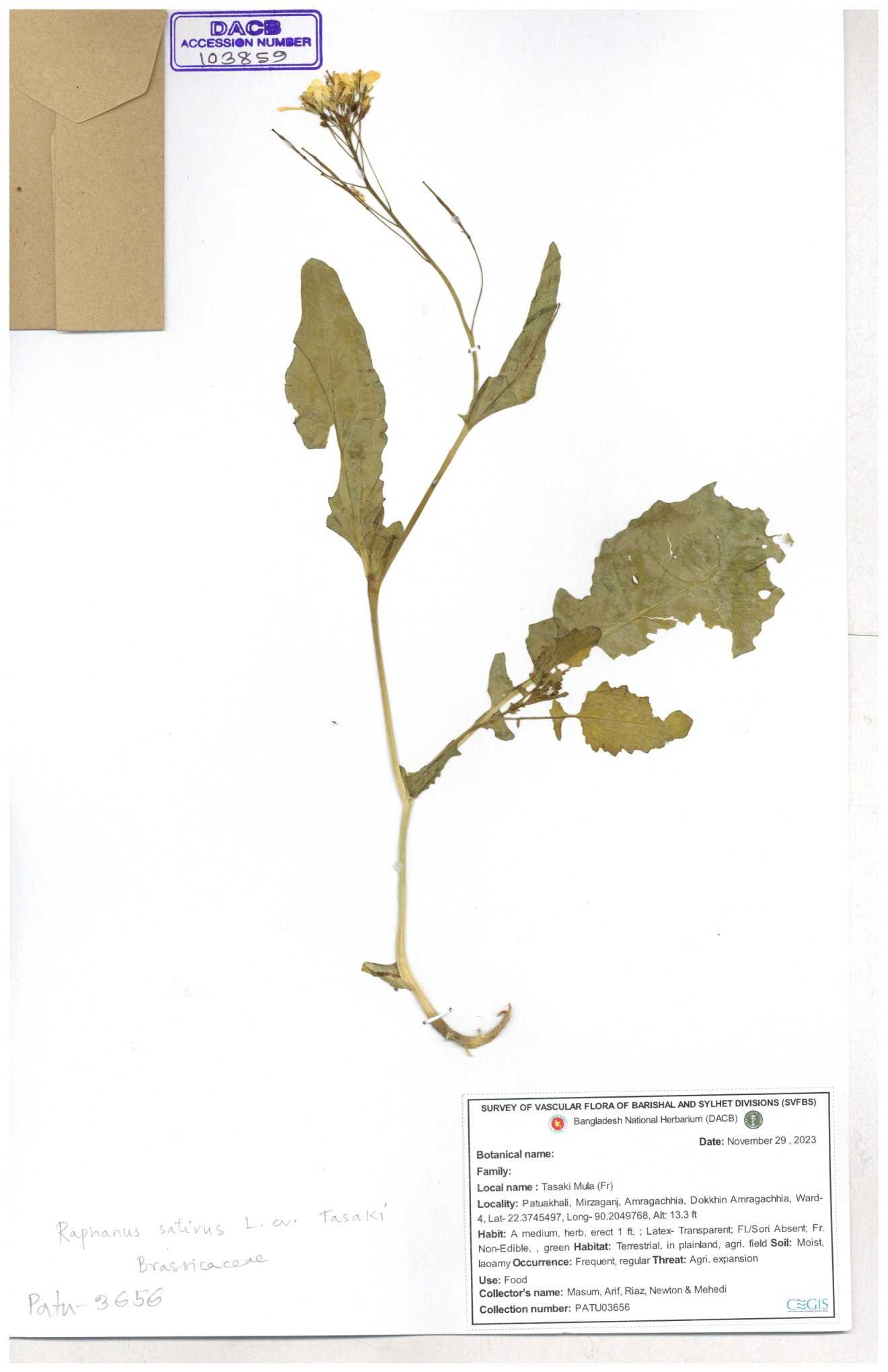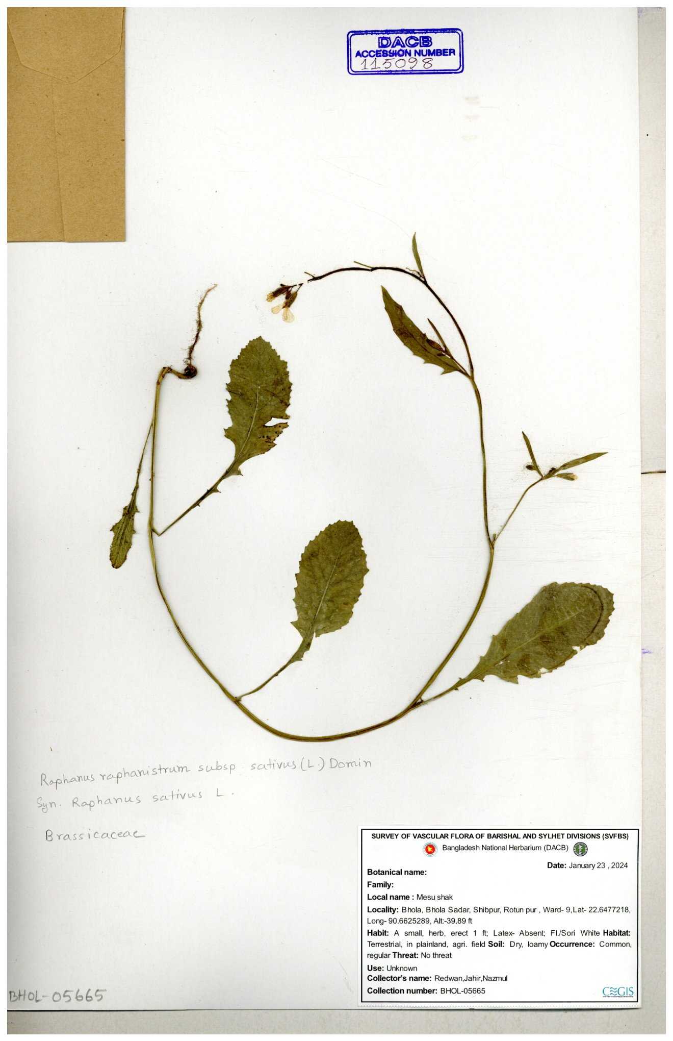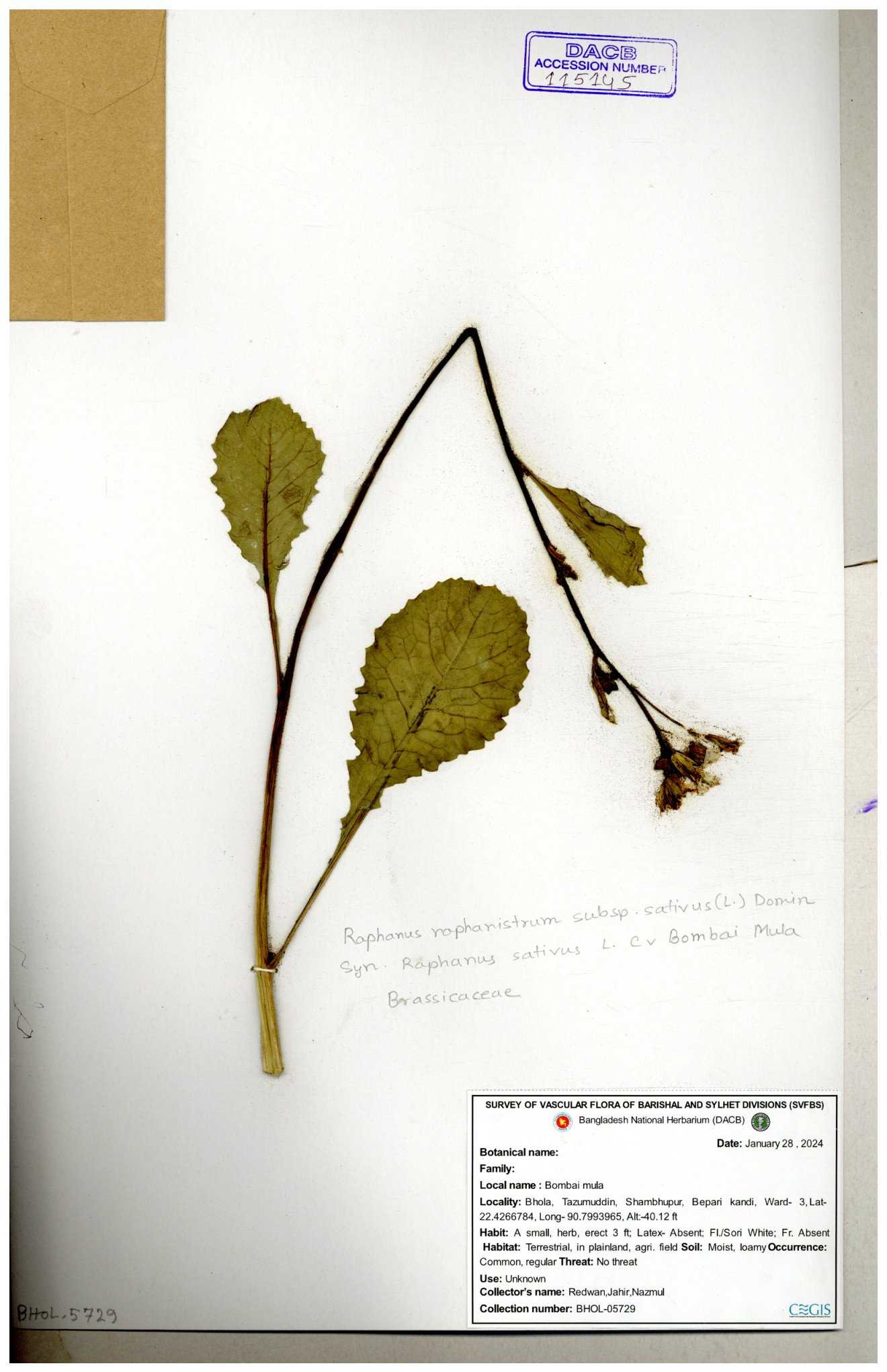 | 67352 | Brassicaceae | Raphanus sativus L. | Mula | I Hossen et al | IH-3419 17-01-2017 |
