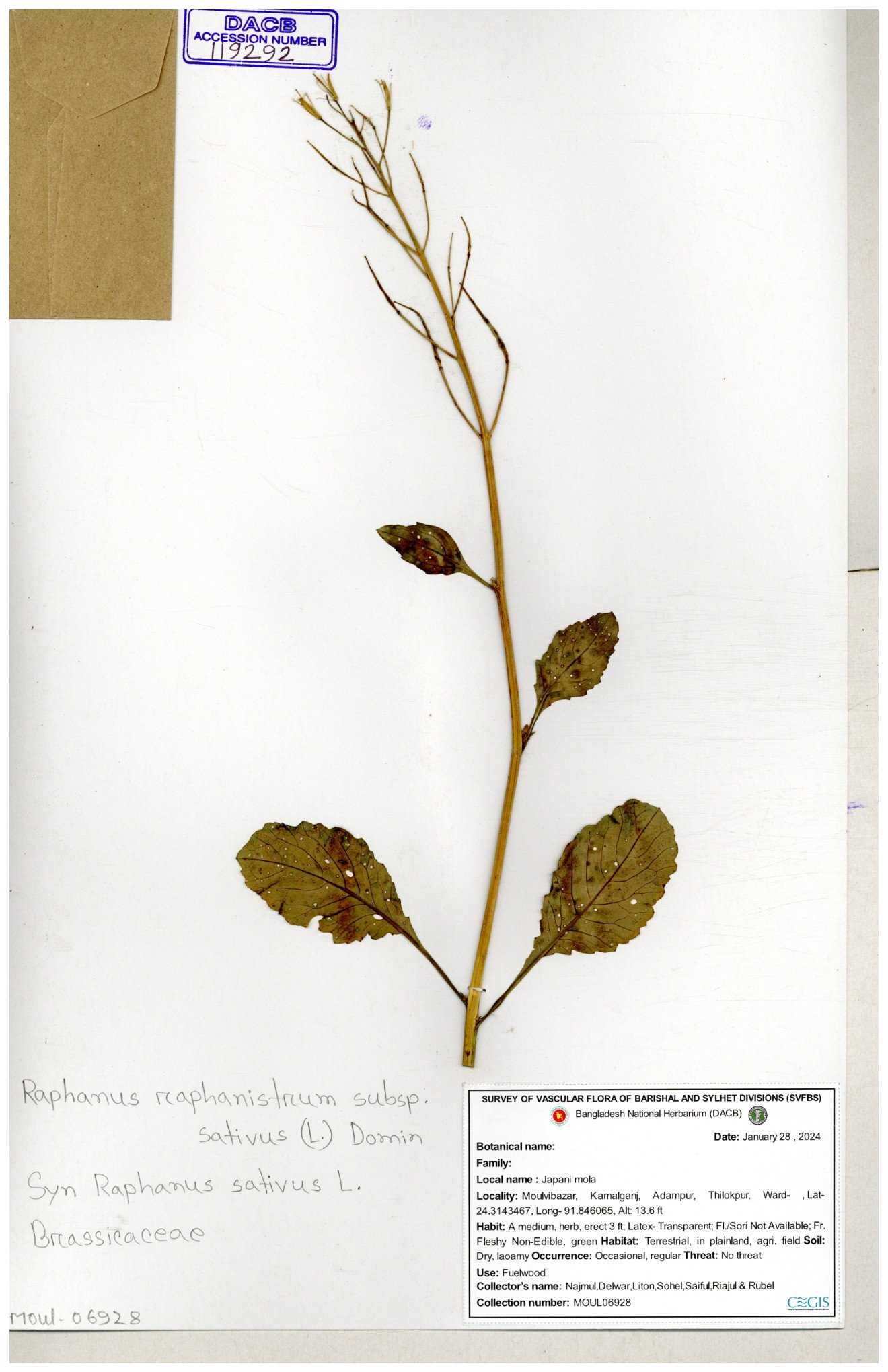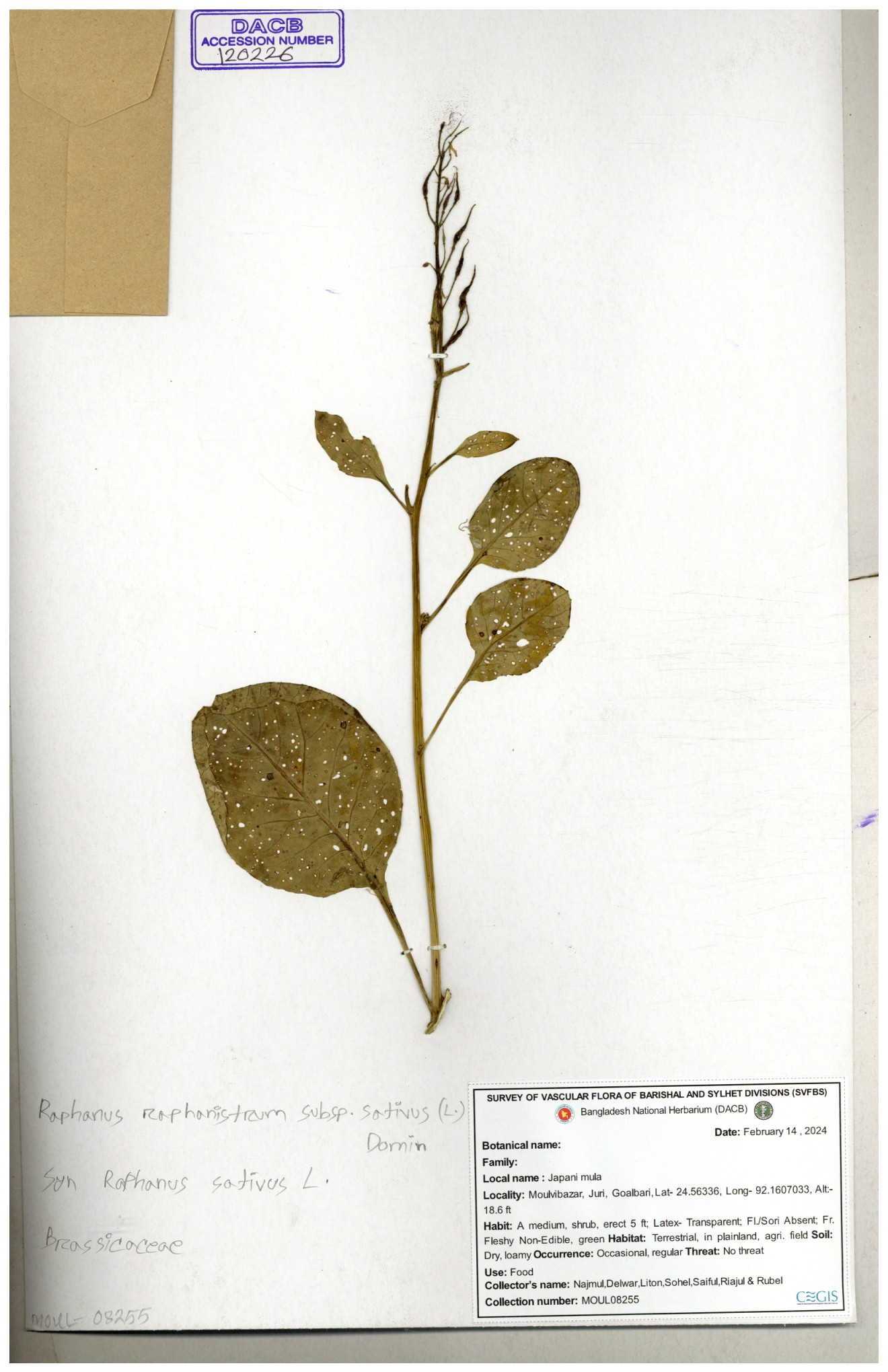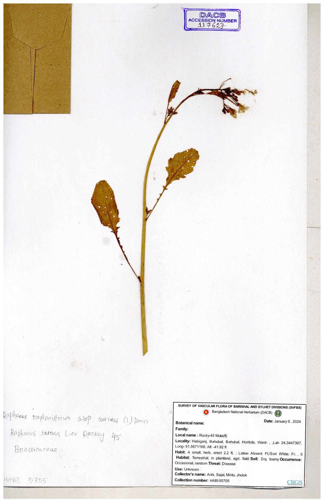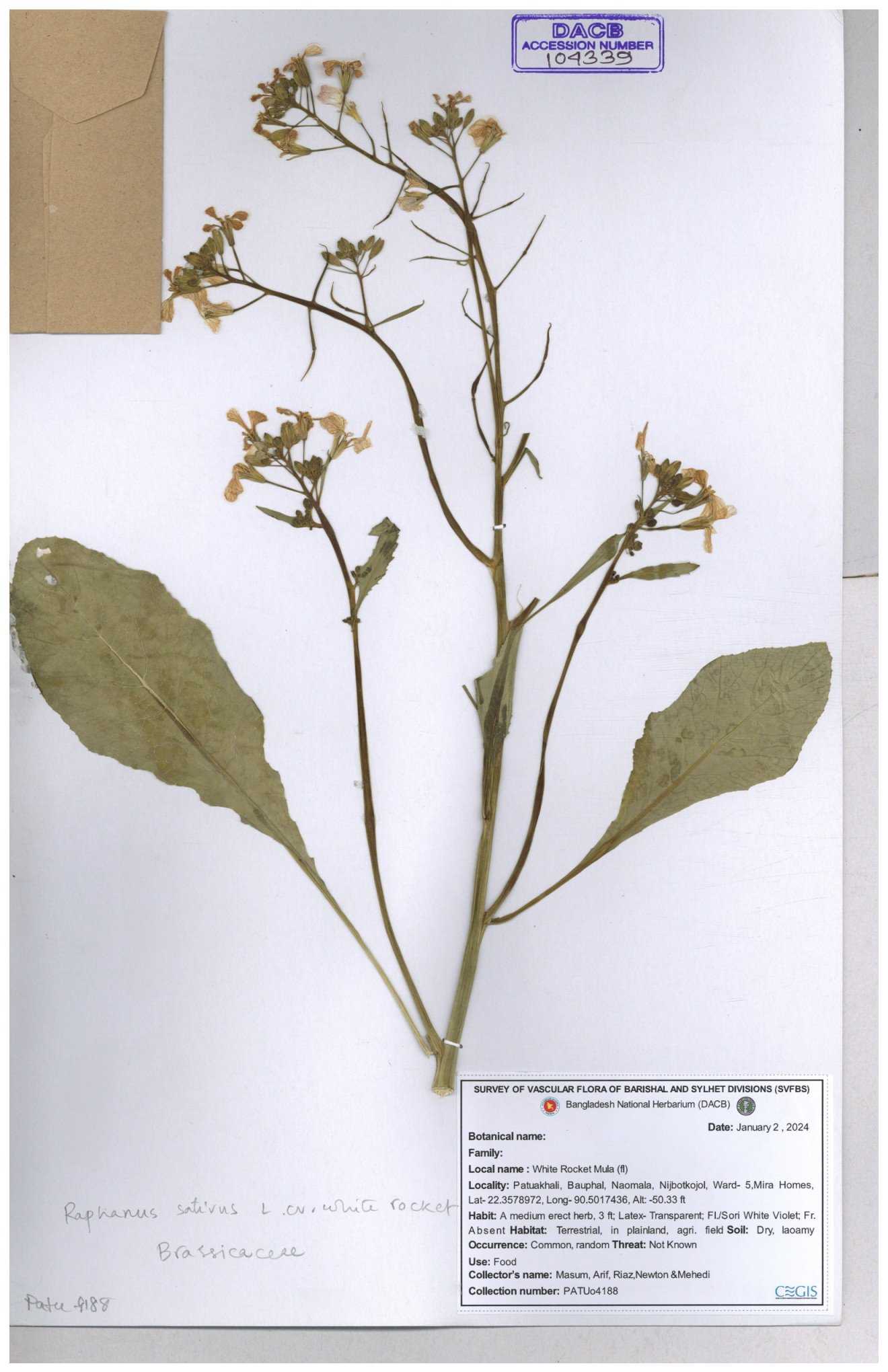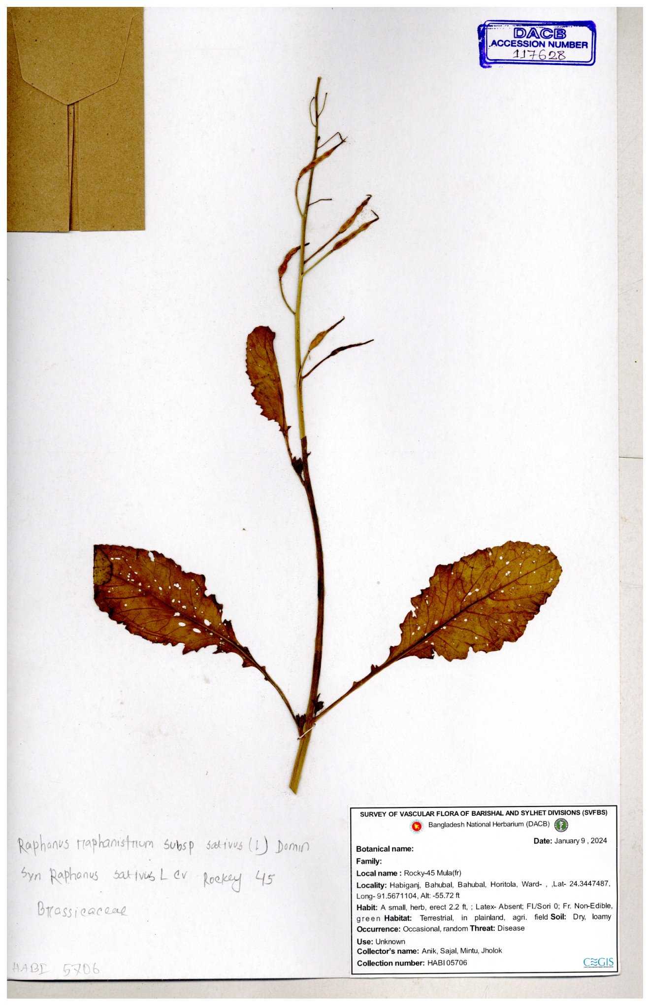 | 67352 | Brassicaceae | Raphanus sativus L. | Mula | I Hossen et al | IH-3419 17-01-2017 |