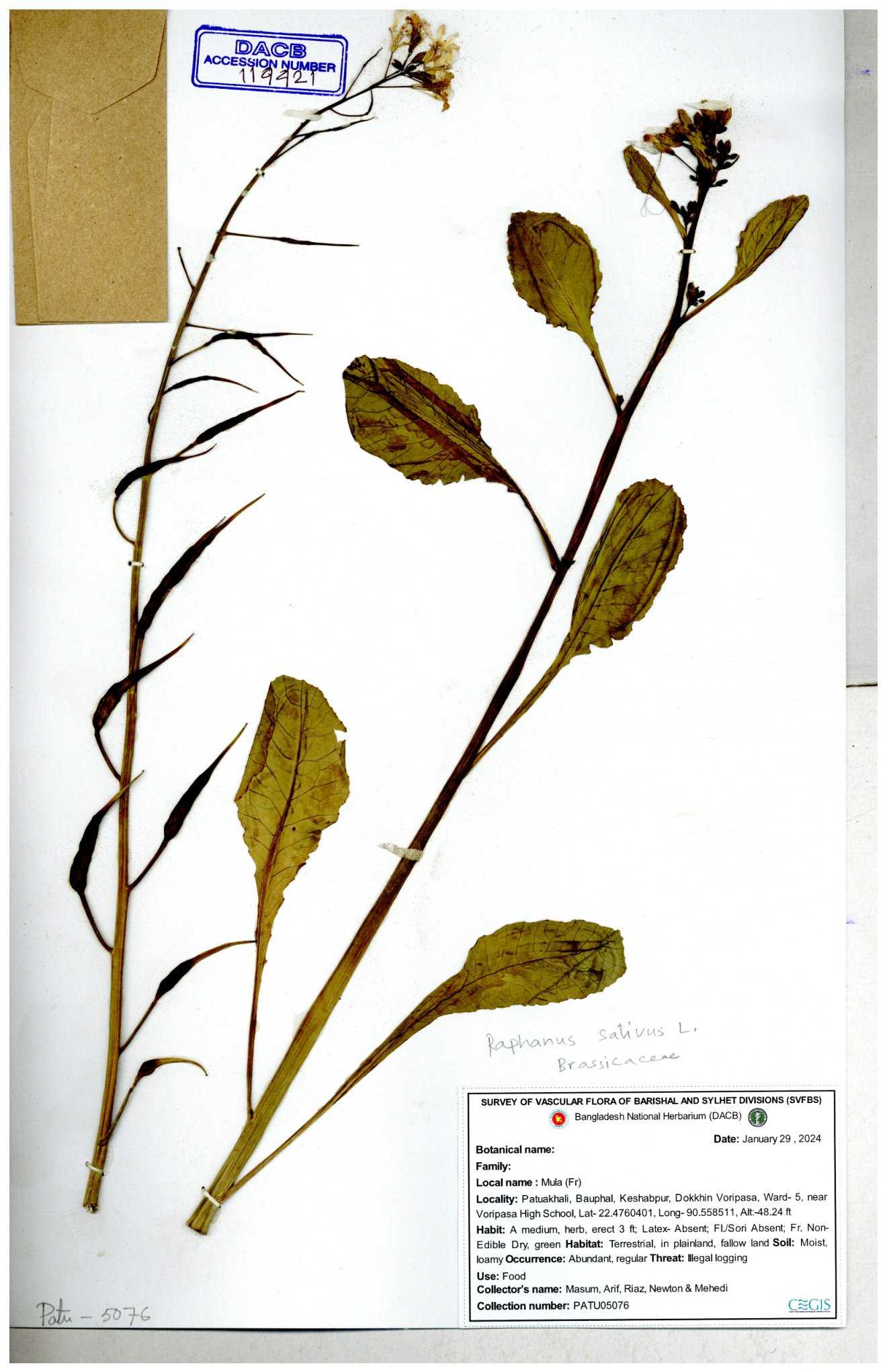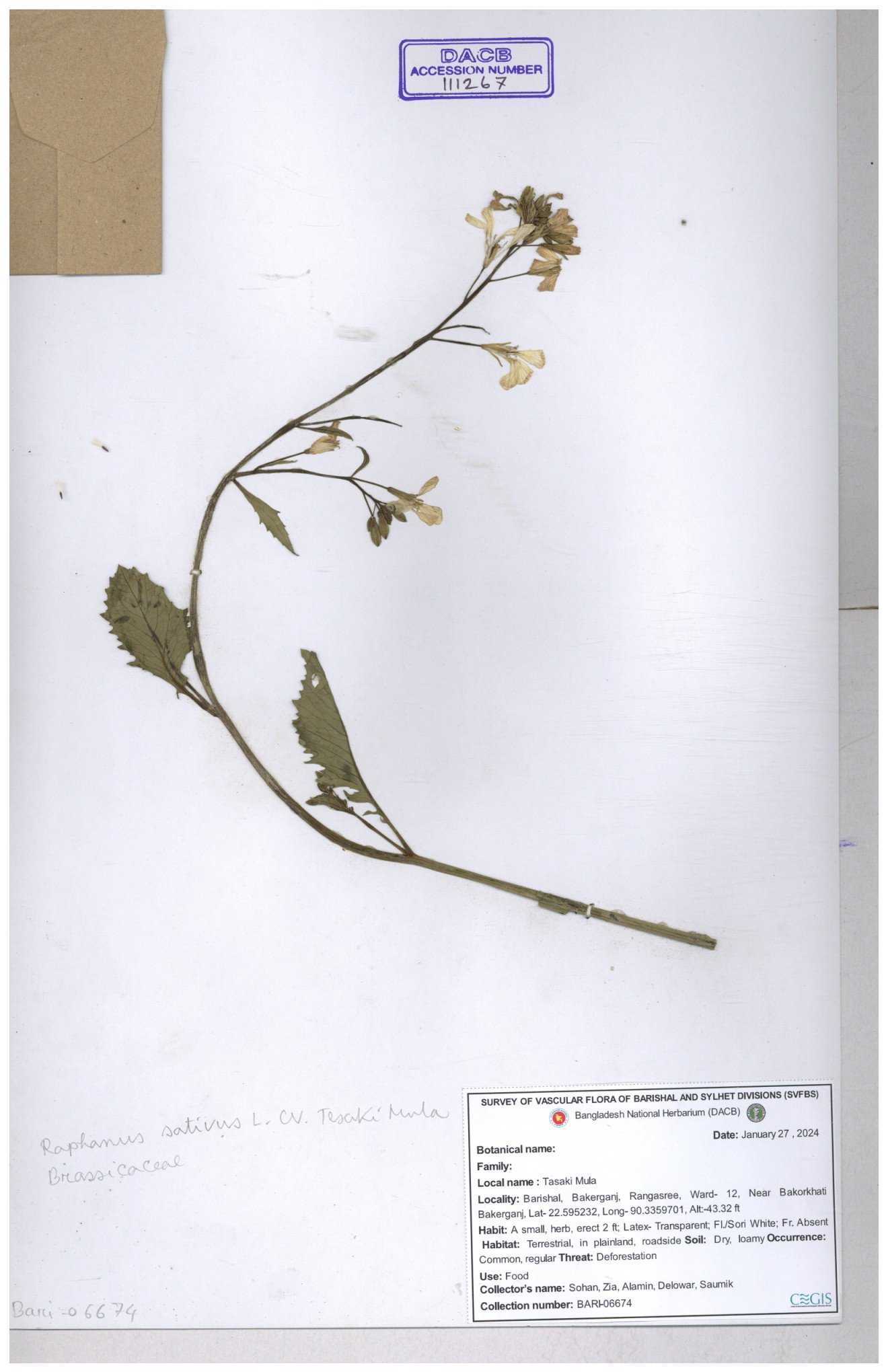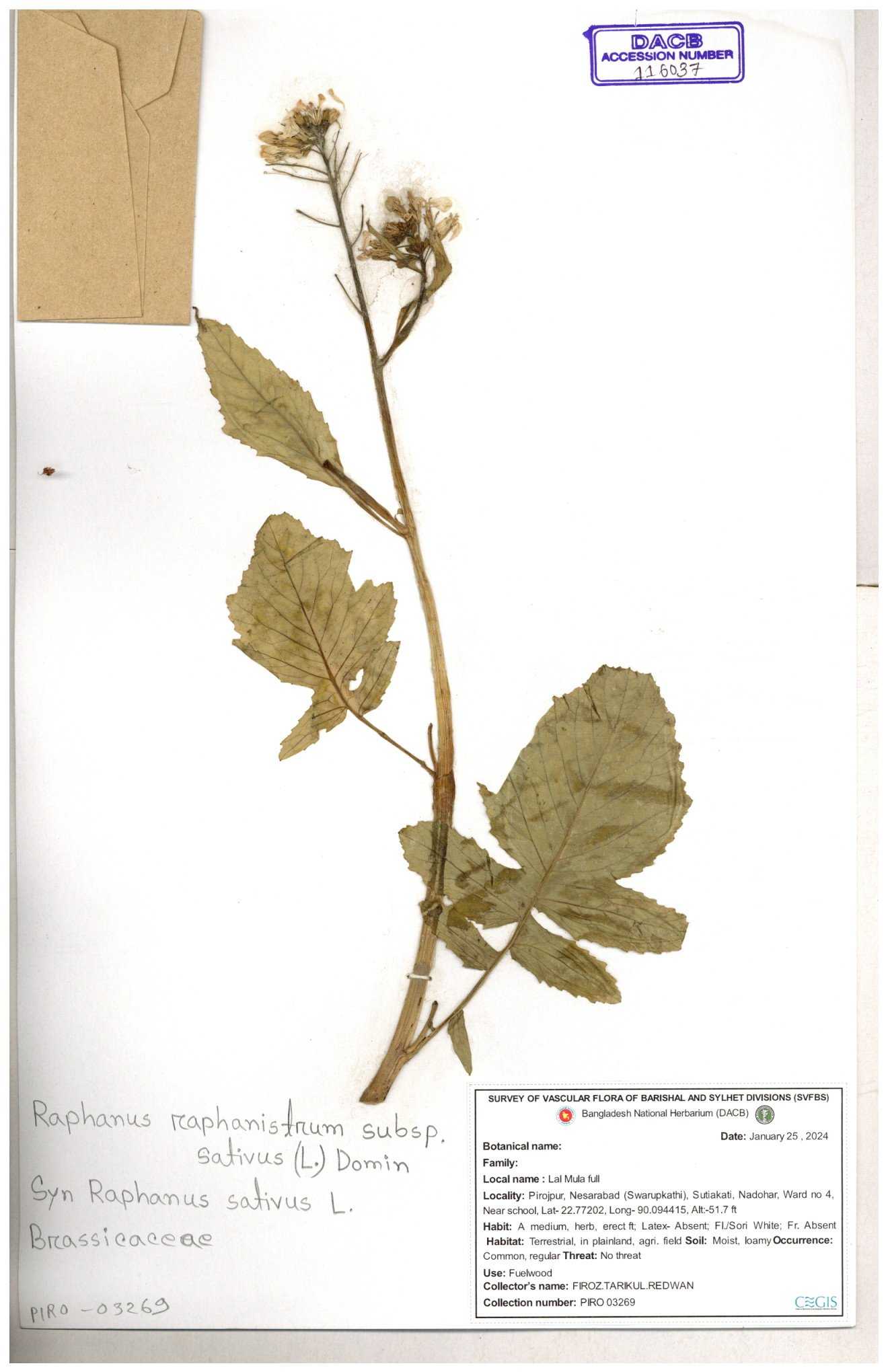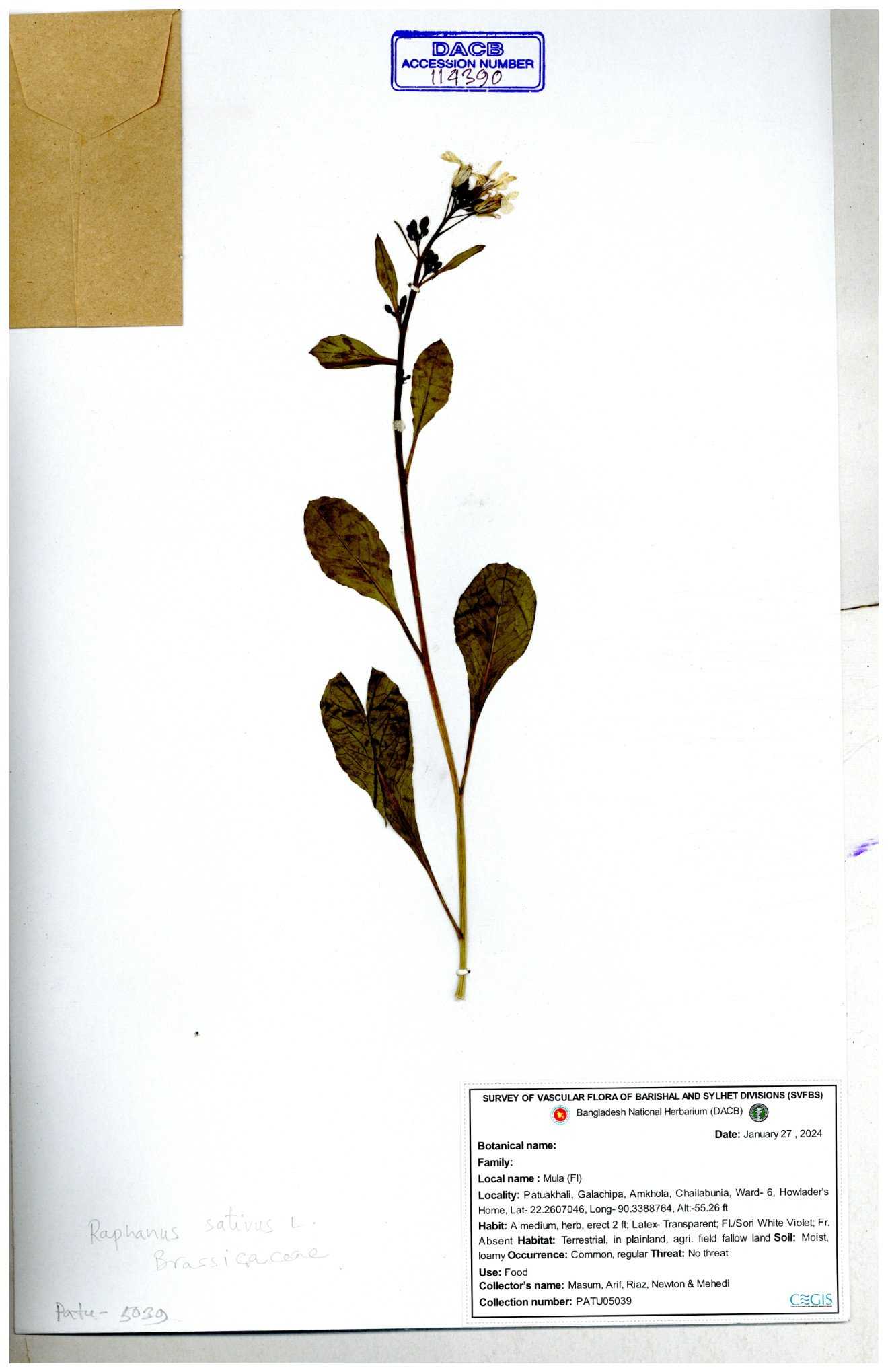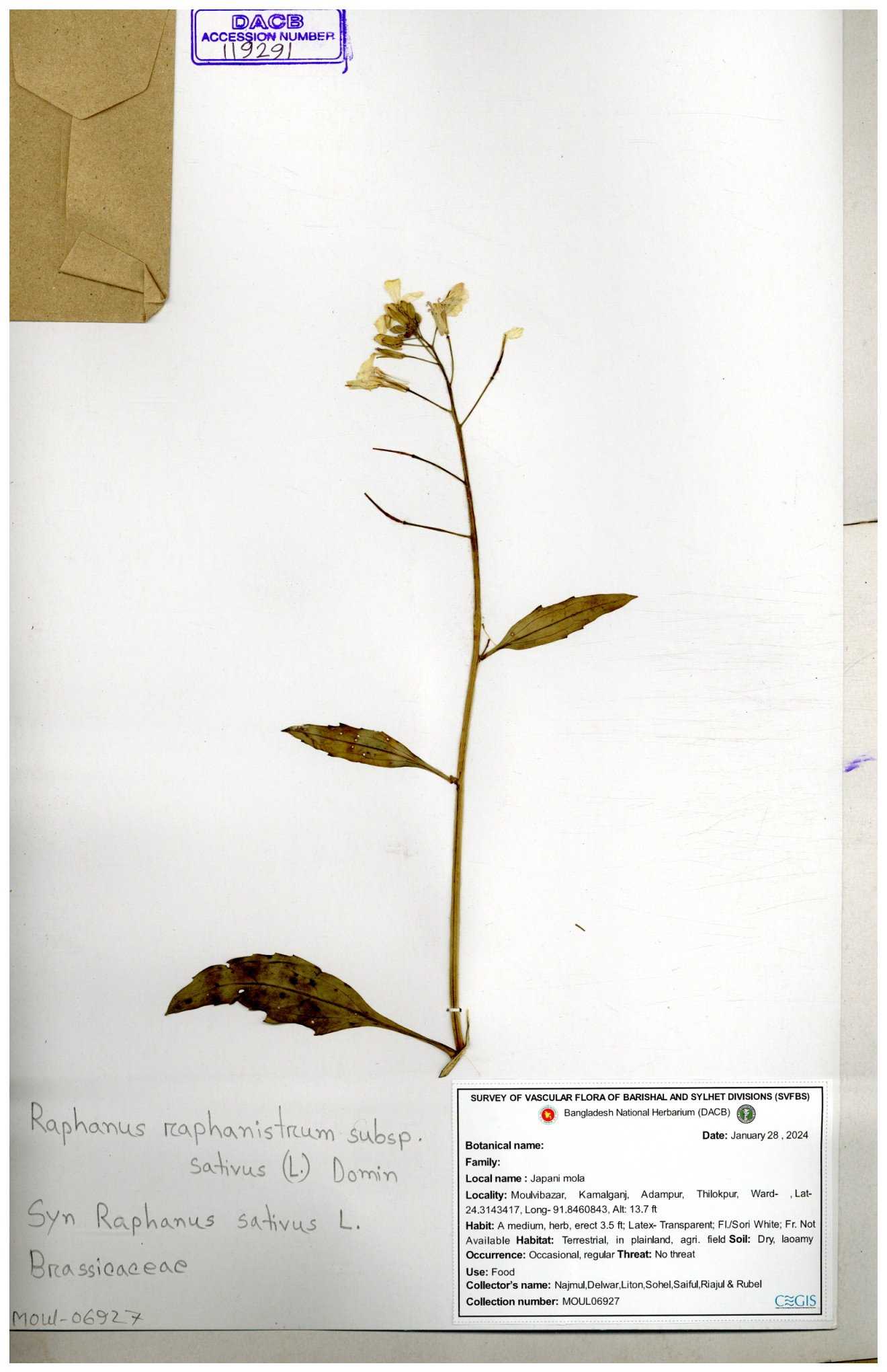 | 67352 | Brassicaceae | Raphanus sativus L. | Mula | I Hossen et al | IH-3419 17-01-2017 |
