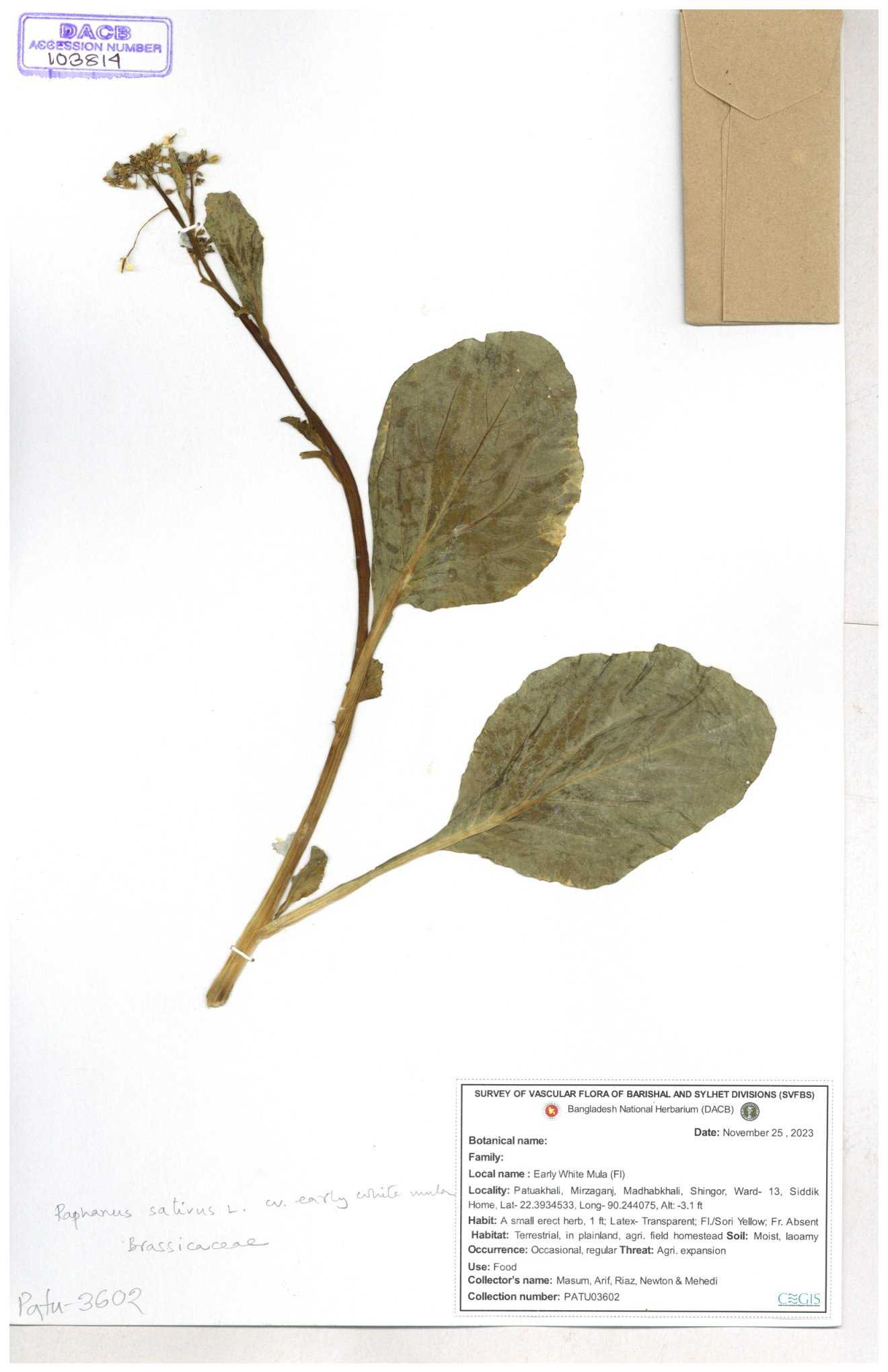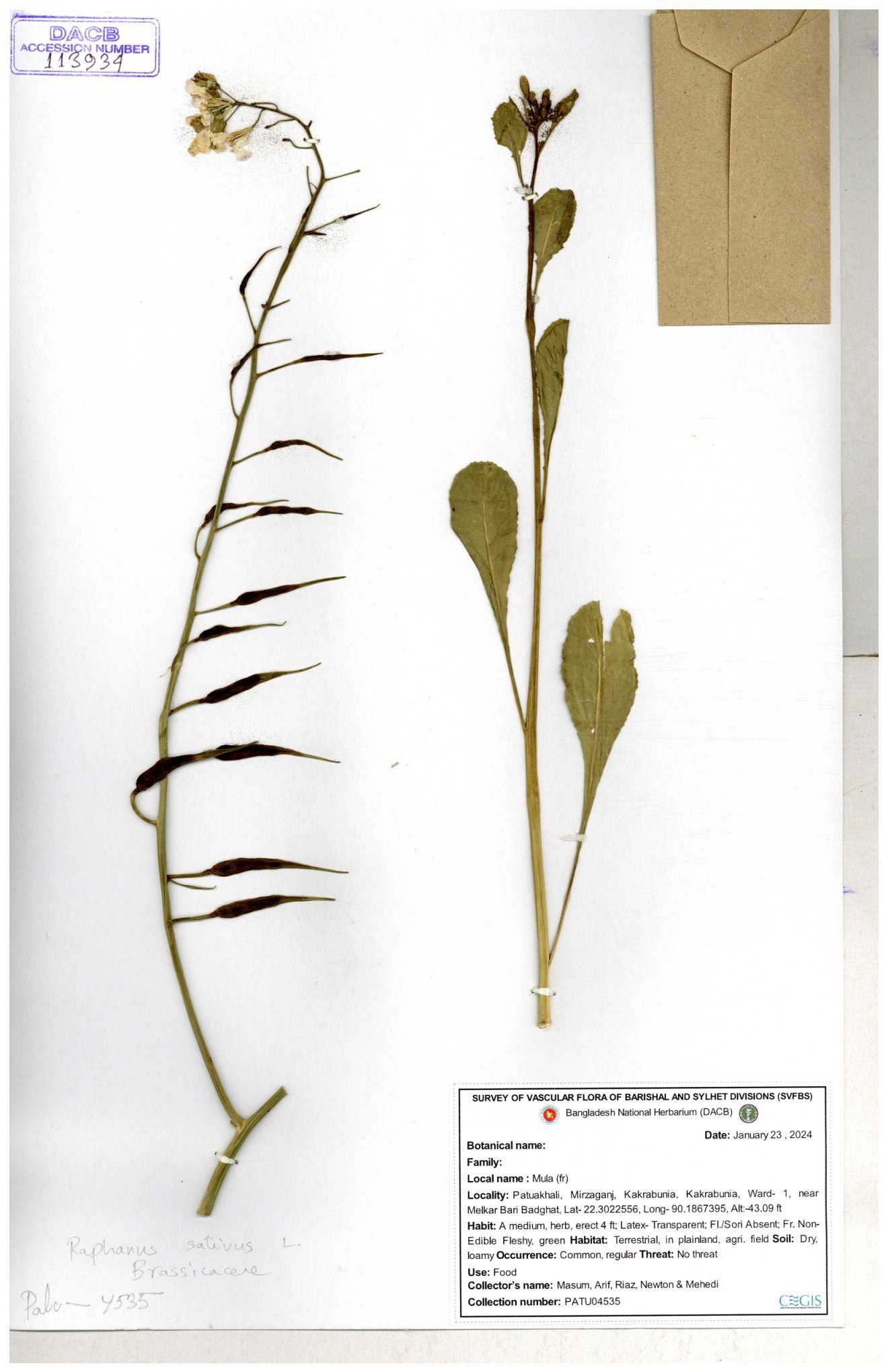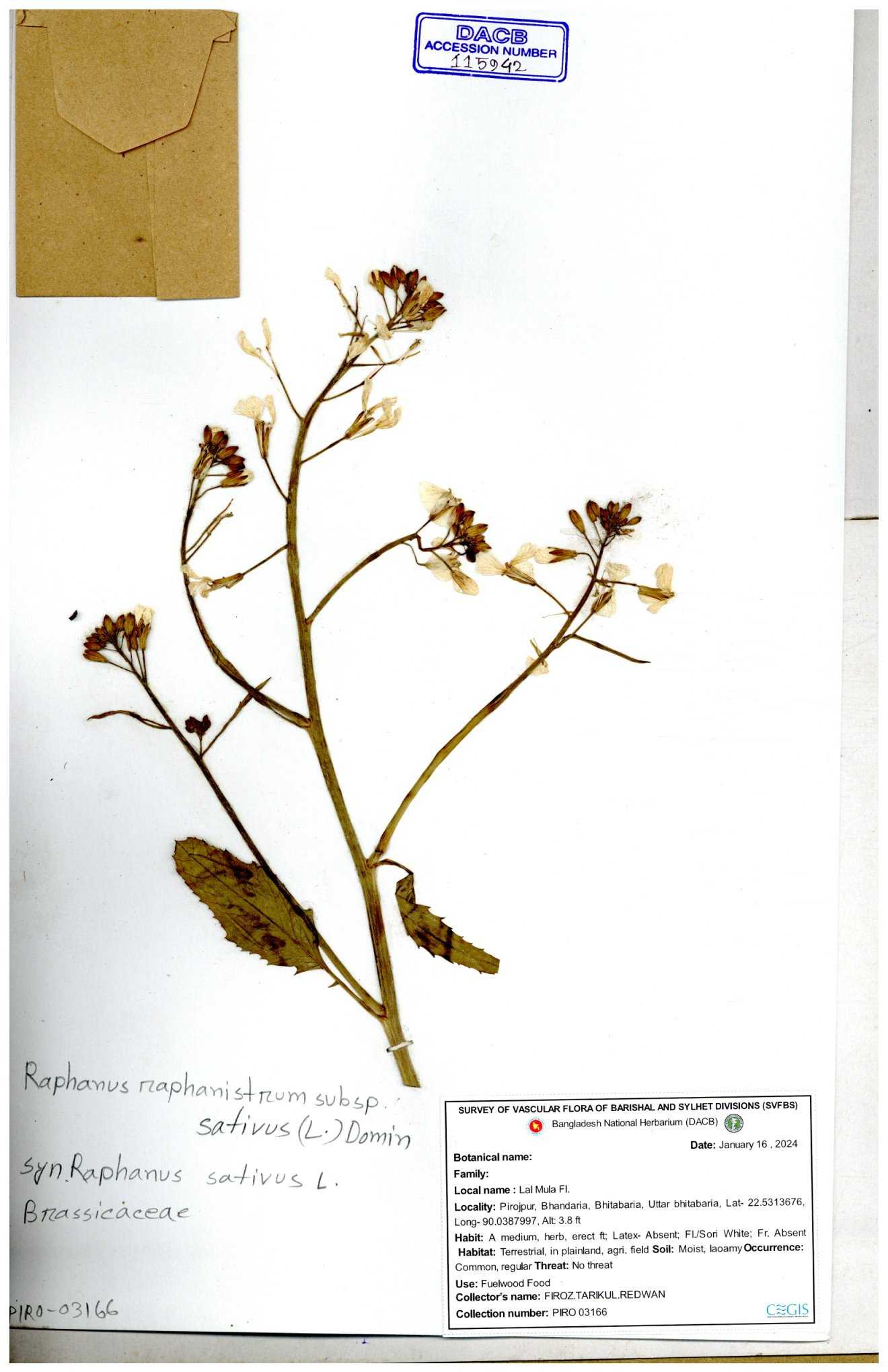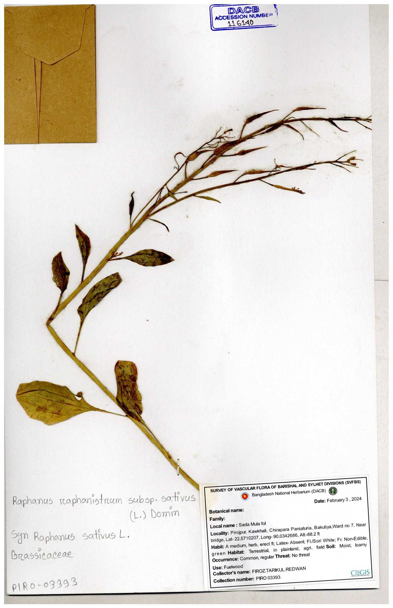 | 67352 | Brassicaceae | Raphanus sativus L. | Mula | I Hossen et al | IH-3419 17-01-2017 |
