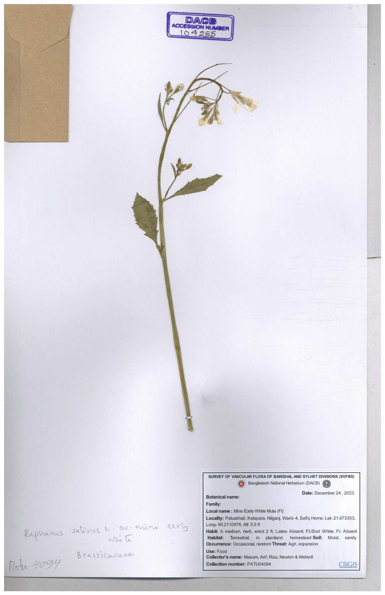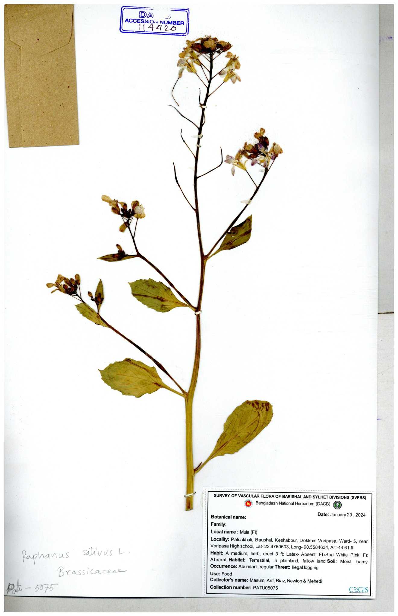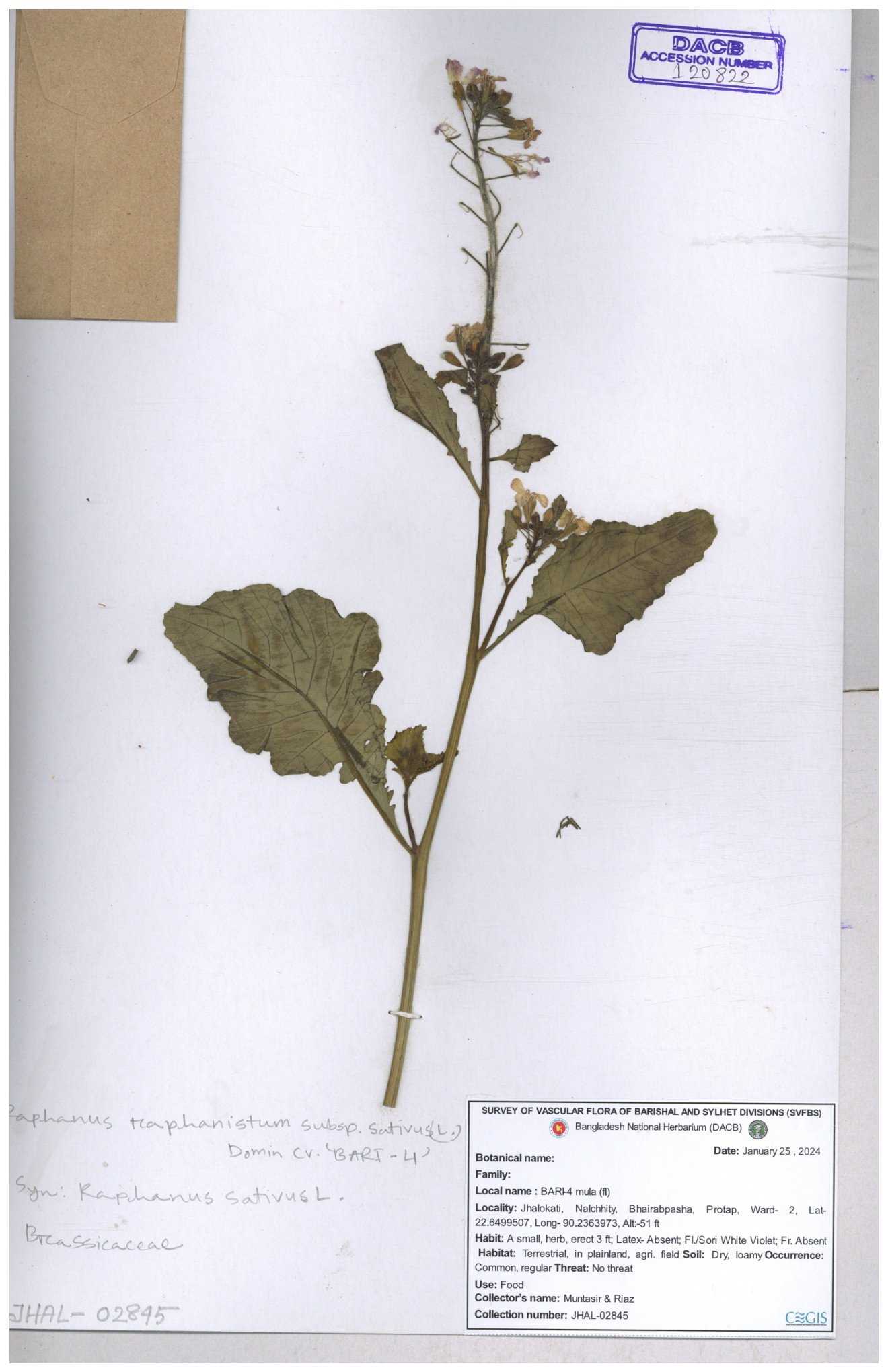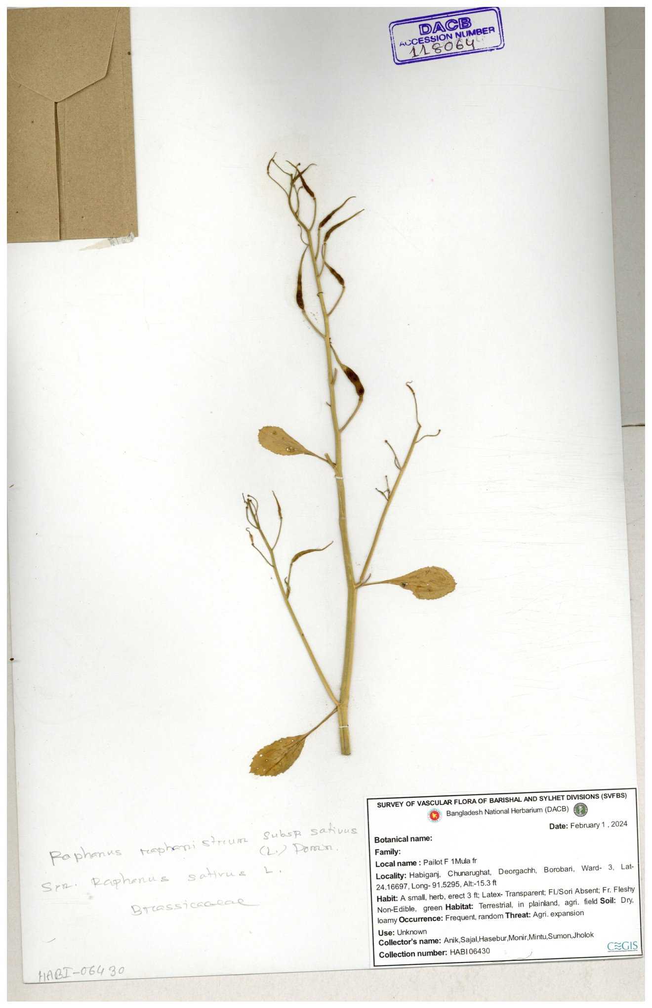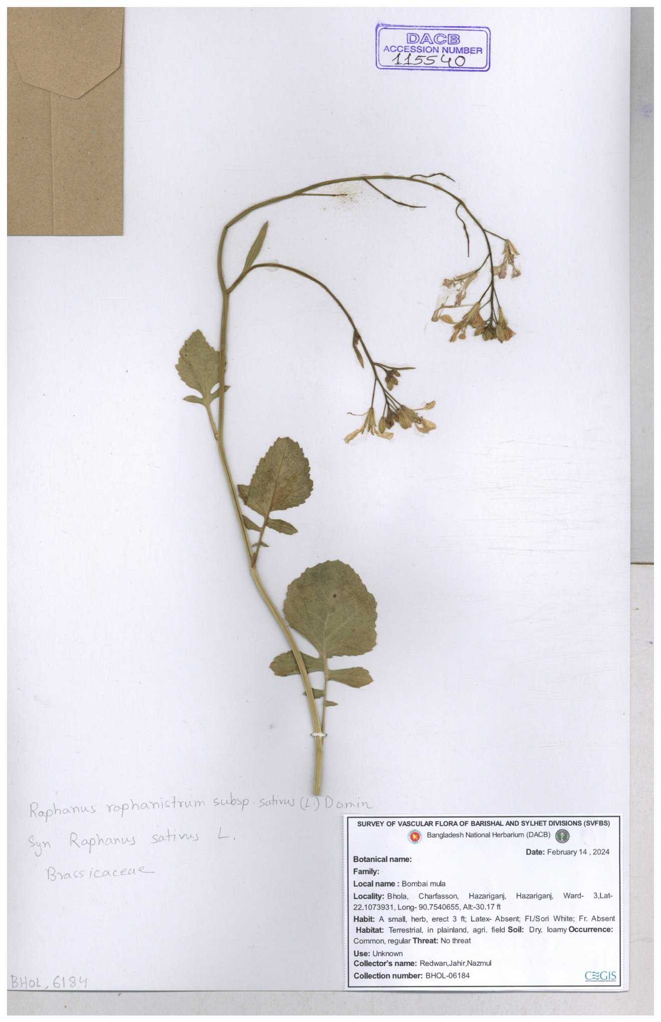 | 67352 | Brassicaceae | Raphanus sativus L. | Mula | I Hossen et al | IH-3419 17-01-2017 |