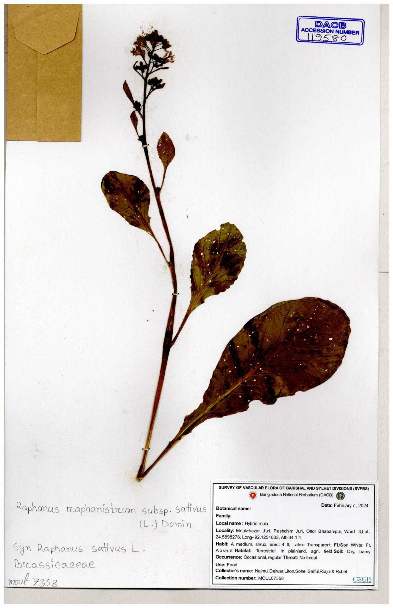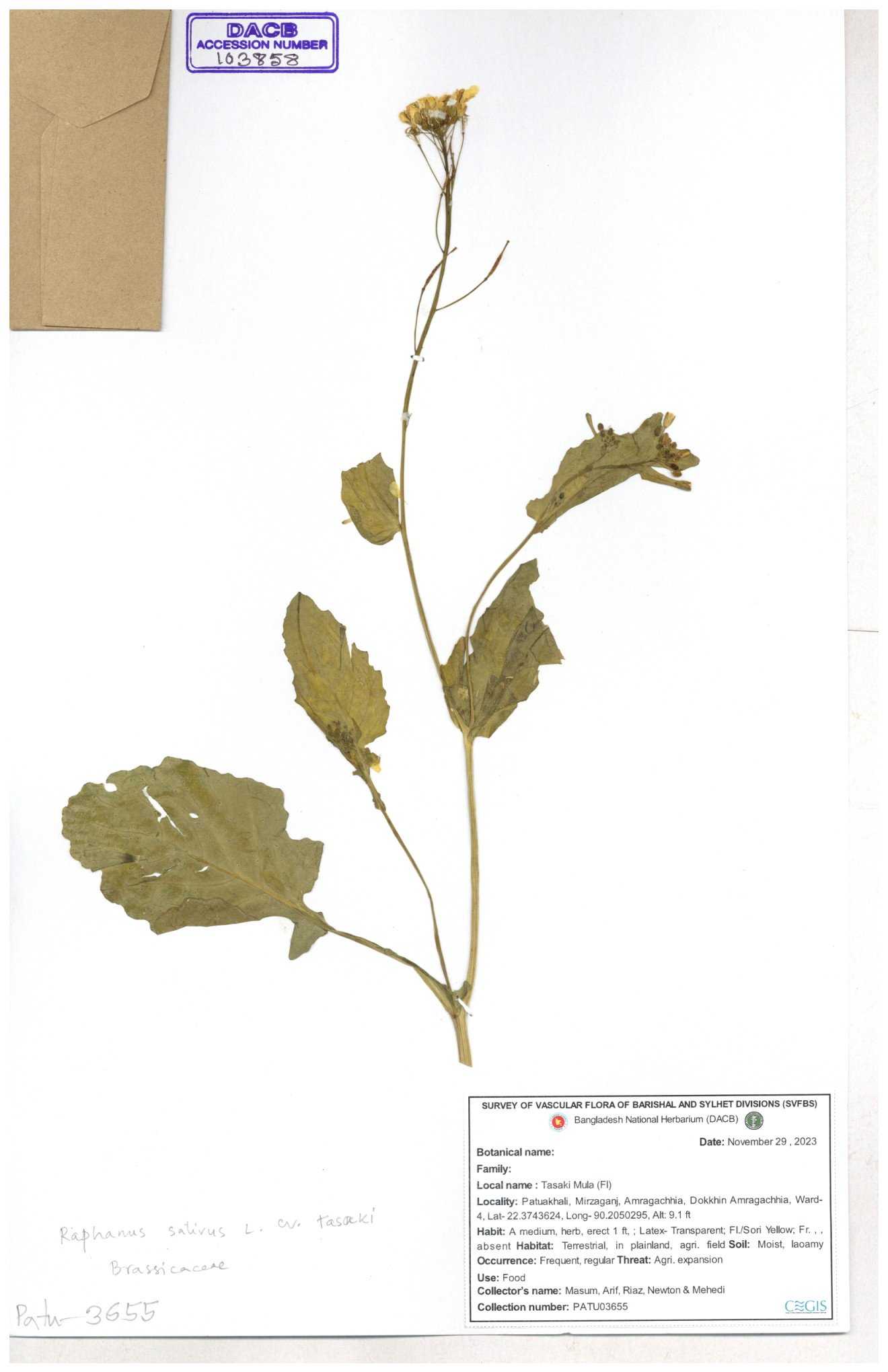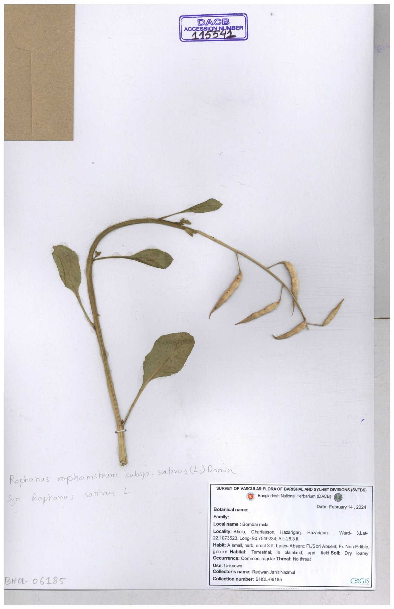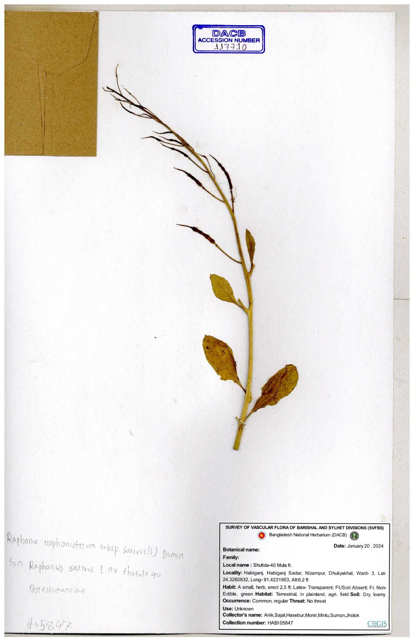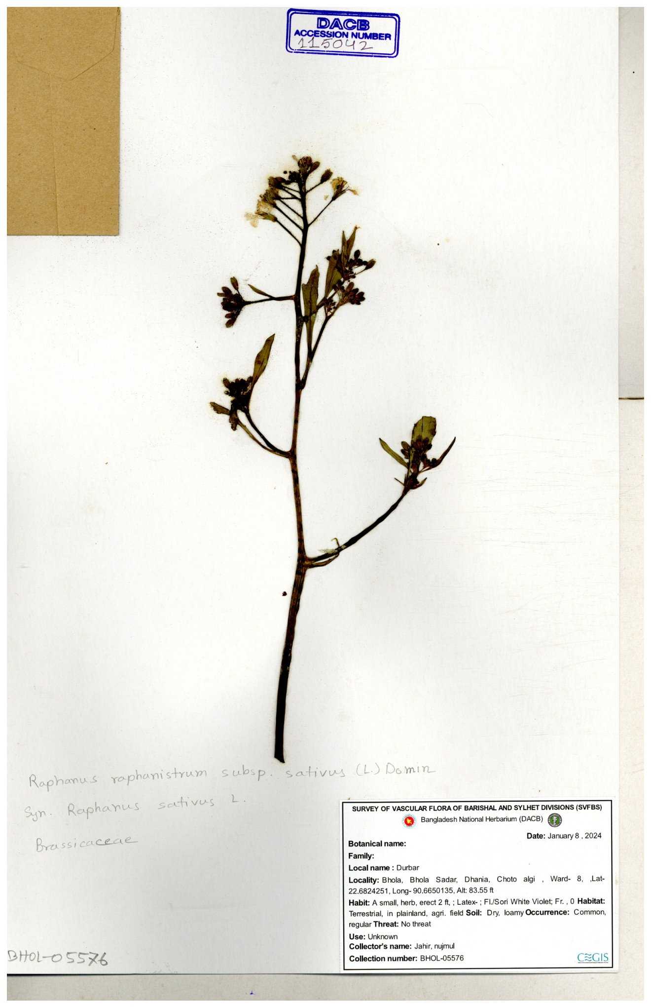 | 67352 | Brassicaceae | Raphanus sativus L. | Mula | I Hossen et al | IH-3419 17-01-2017 |