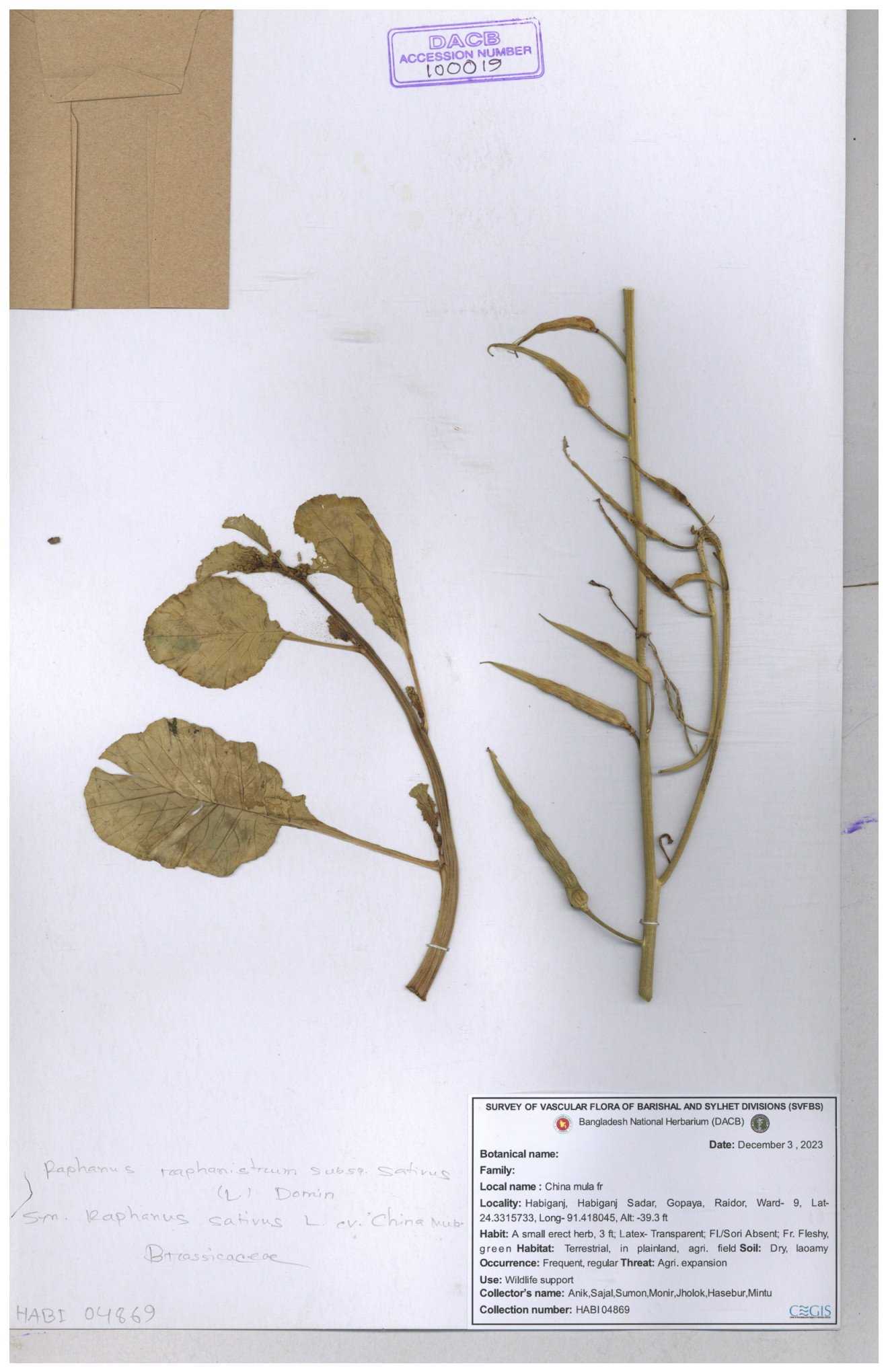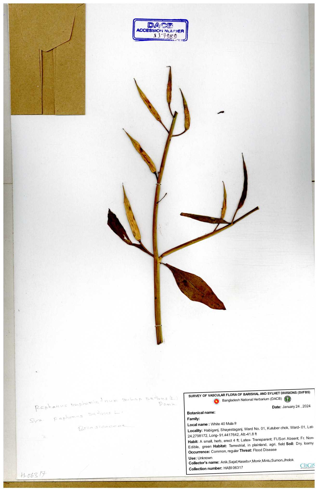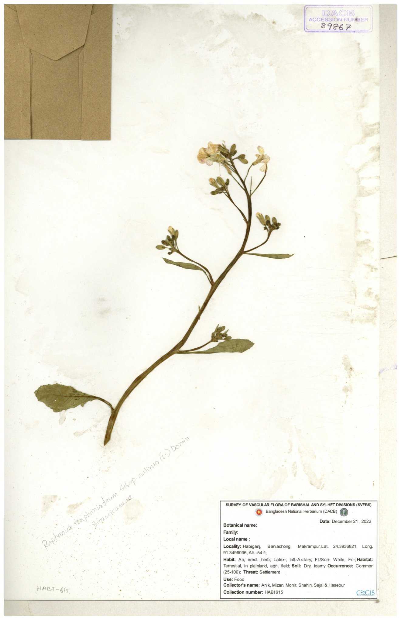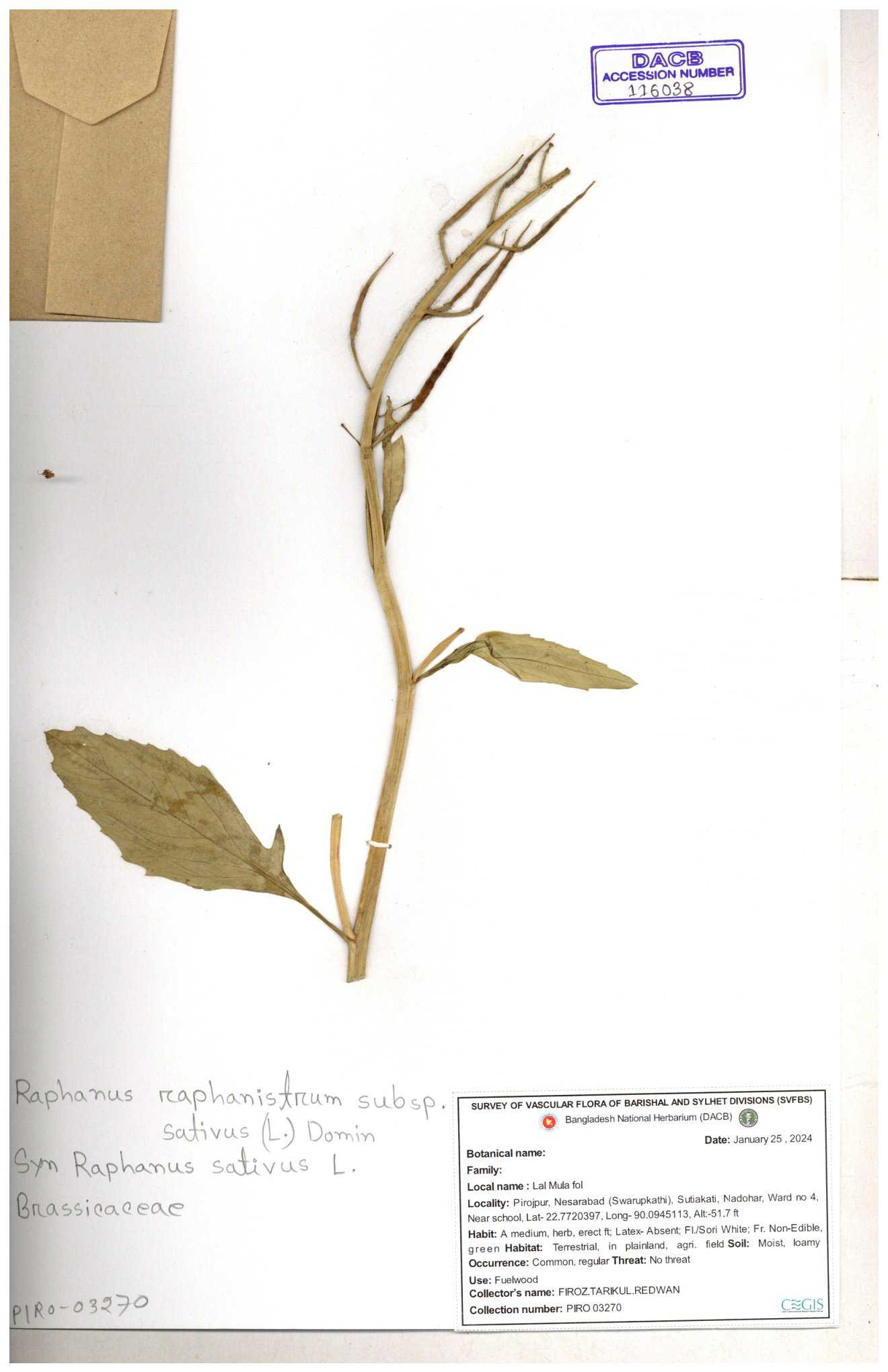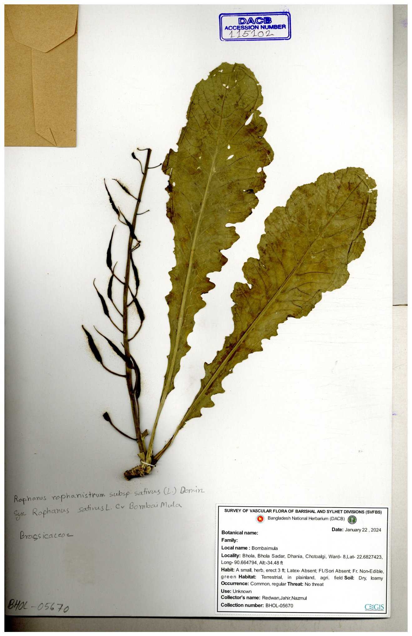 | 67352 | Brassicaceae | Raphanus sativus L. | Mula | I Hossen et al | IH-3419 17-01-2017 |